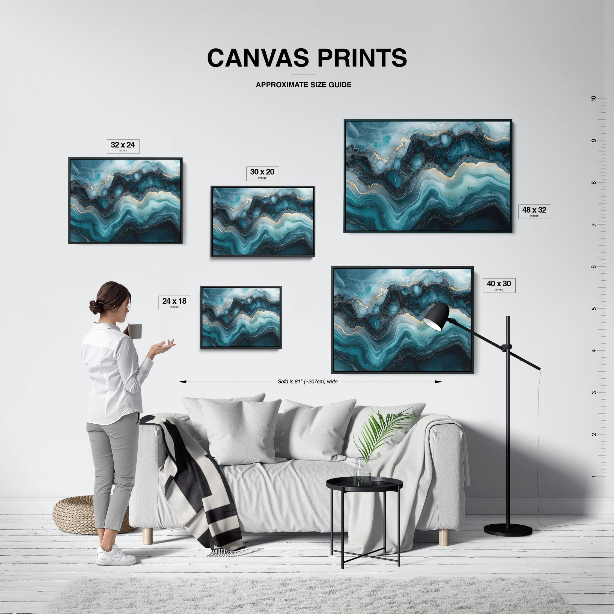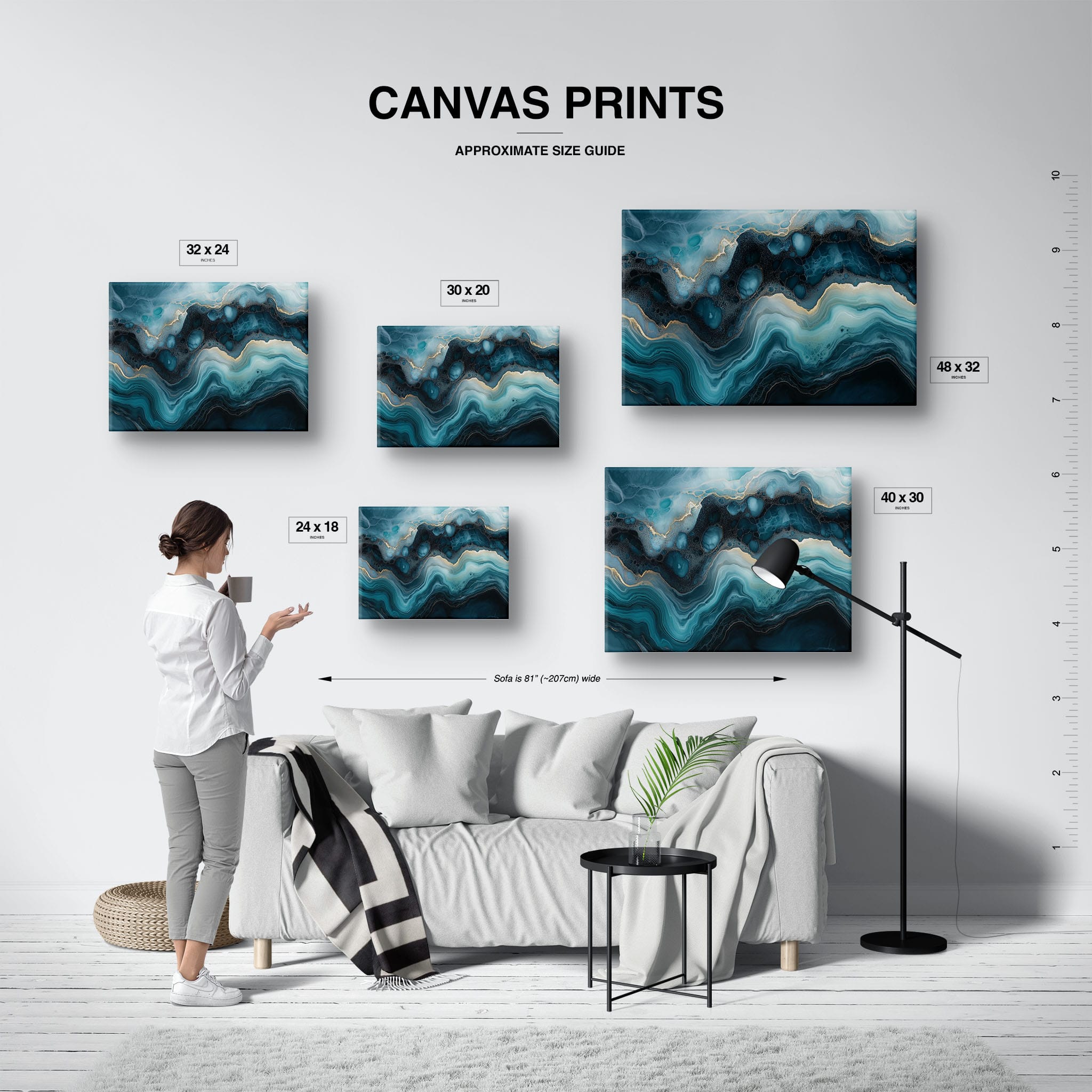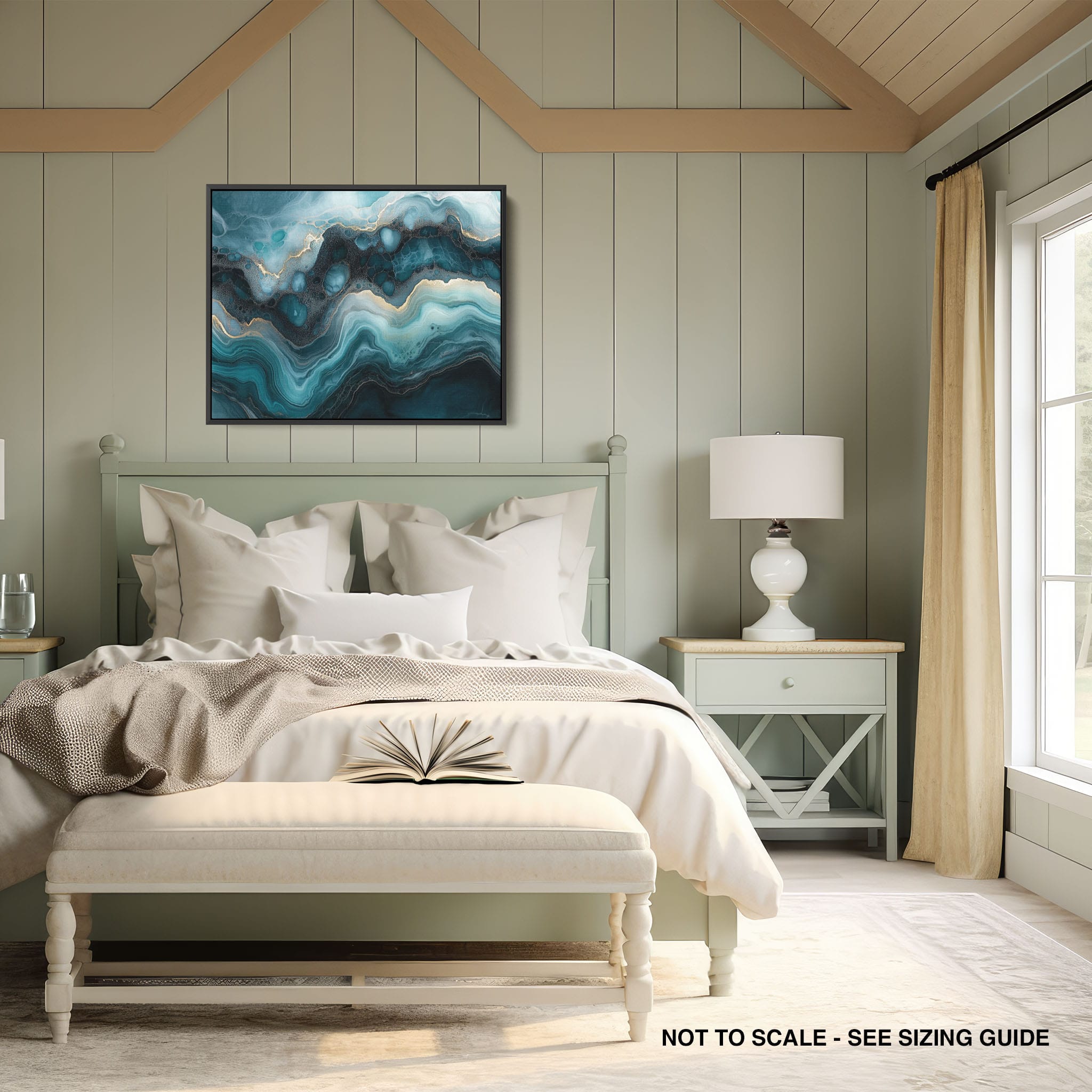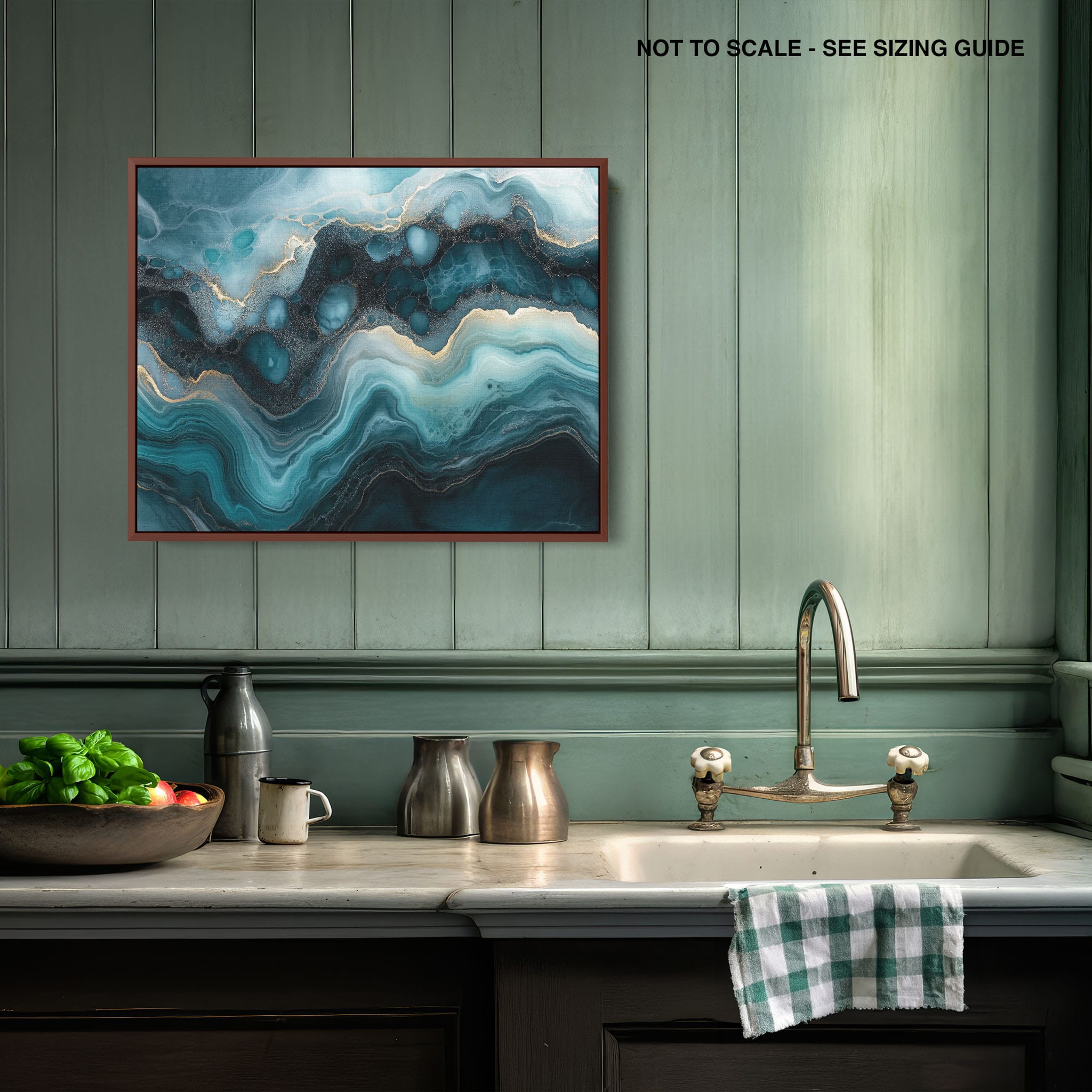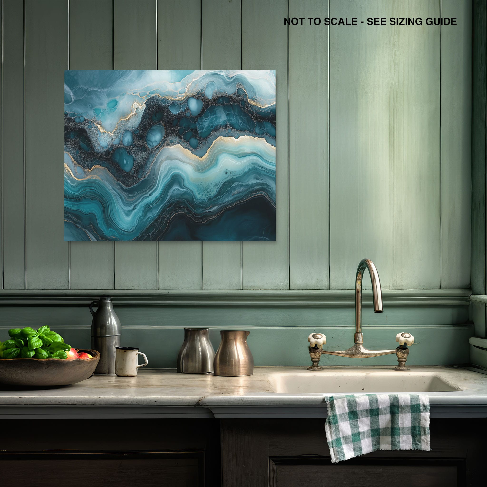 This stunning digital illustration captivates viewers with its ethereal swirls of teal and mysterious black depths, highlighted by delicate veins of gold. The artwork's intricacies evoke the sensations of diving into an undiscovered ocean or investigating the marbling of precious minerals. The cool, soothing palette makes this piece a perfect accent for spaces seeking a touch of refined tranquility. Bold yet peaceful, this work invites an introspective exploration suitable for any modern decor. Transform your room with this striking portrayal of abstract surrealism.