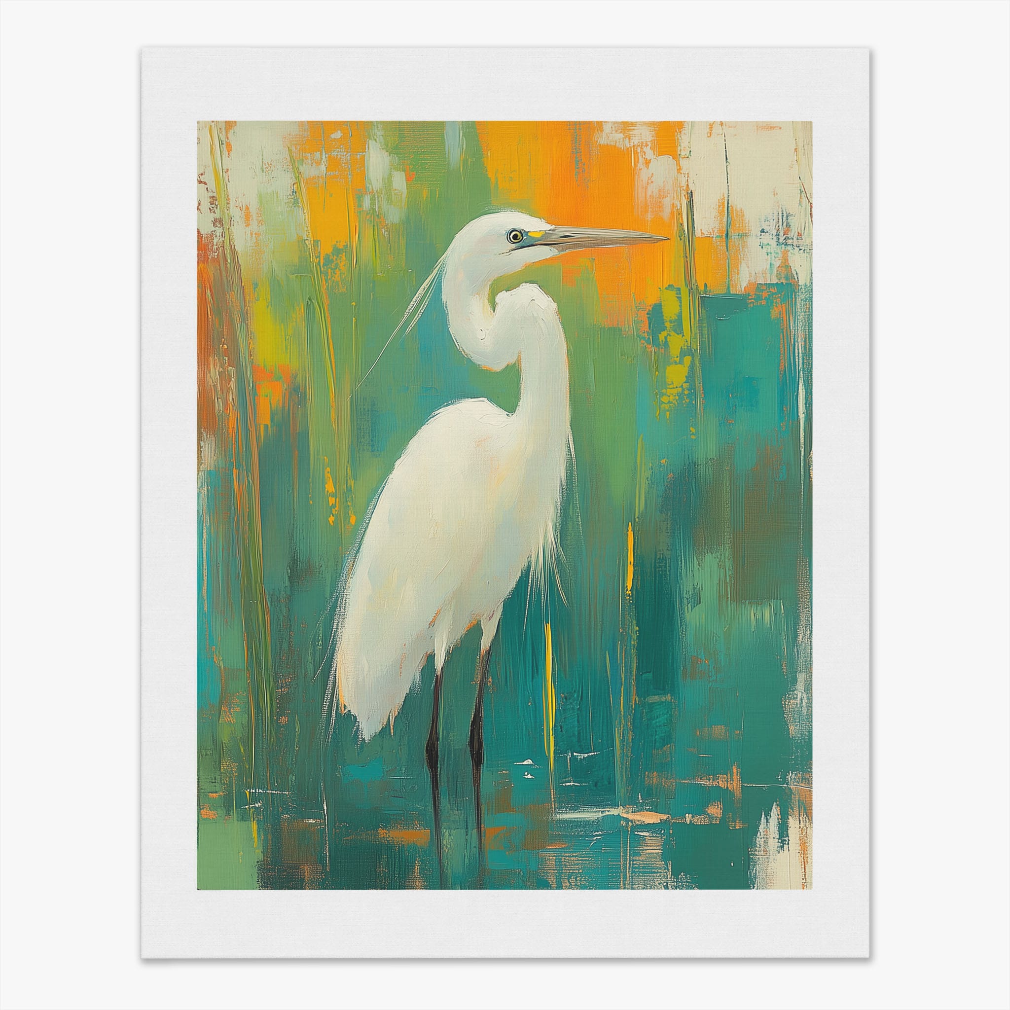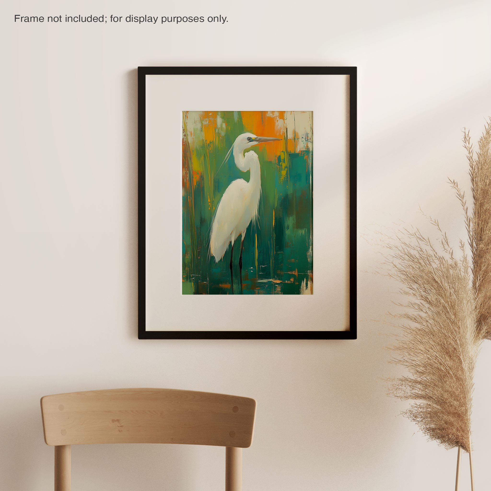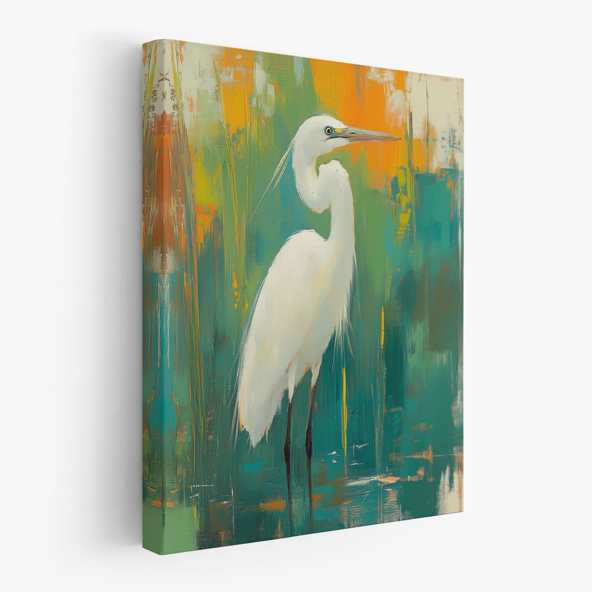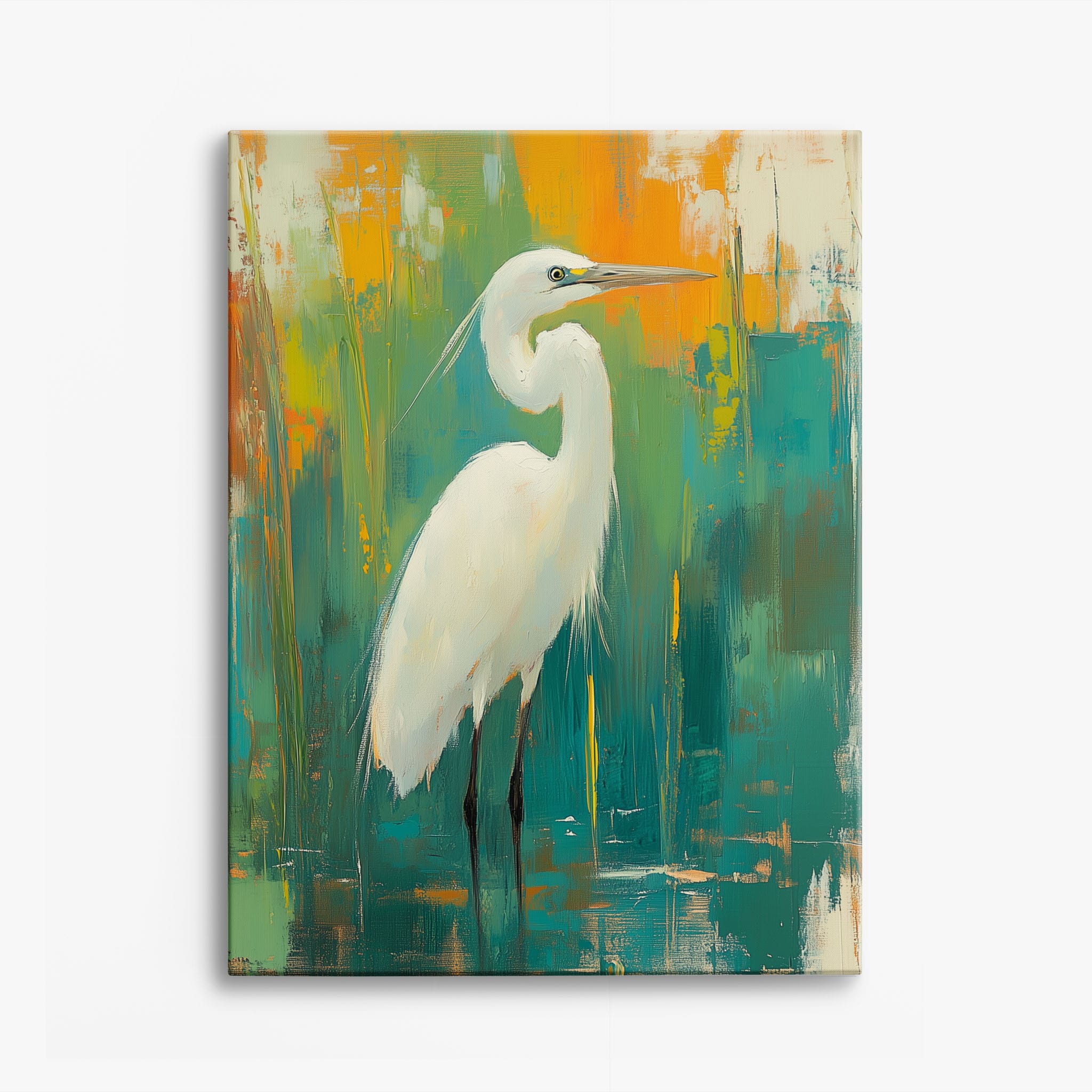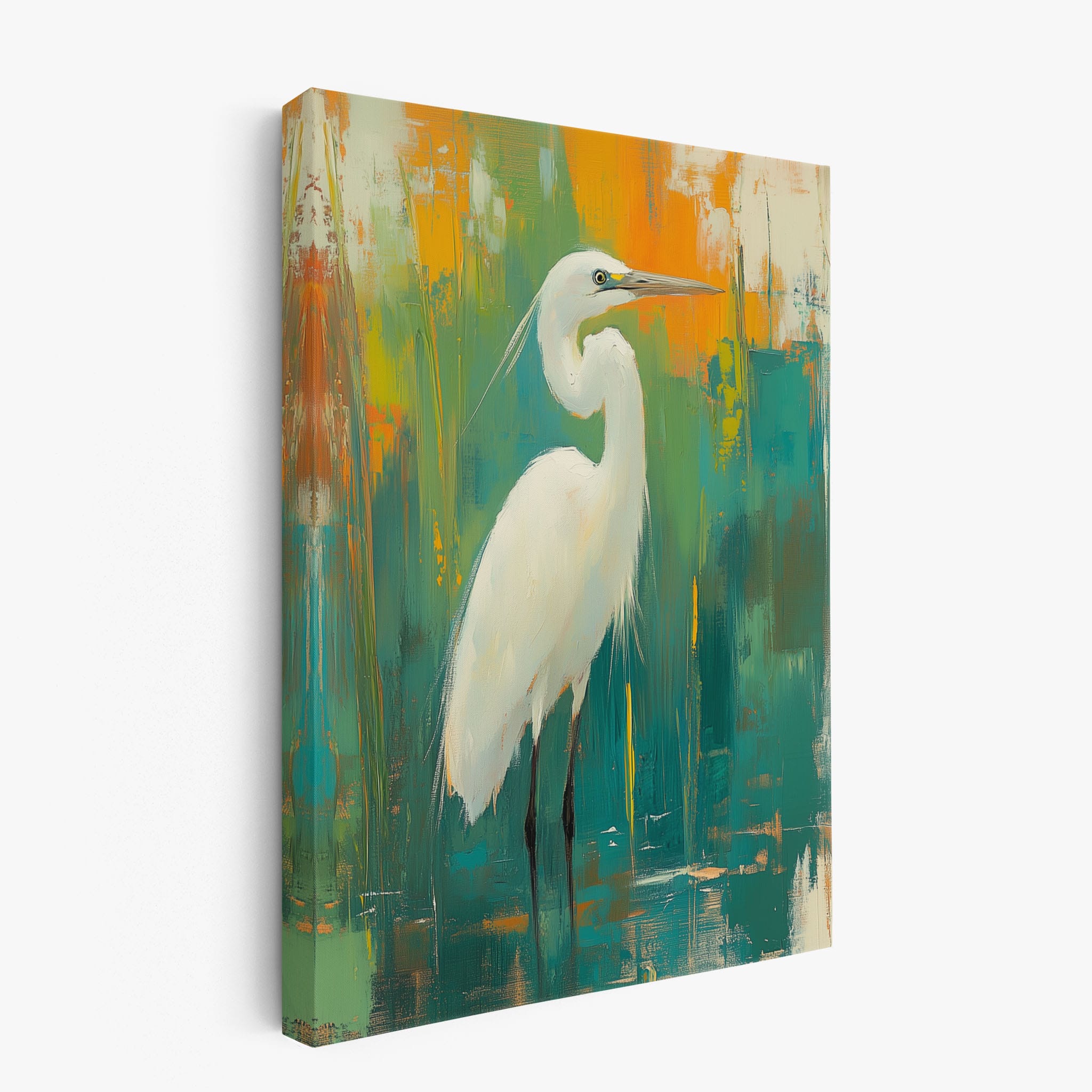 Captivating in its portrayal of a solitary egret amid a backdrop of abstract sweeps and vibrant splashes of paint, this painting vividly captures both the grace of the bird and the dynamism of the natural environment it inhabits. The earthy oranges and greens contrast sharply with the egret’s stark white feathers, highlighting its serene presence. This artwork, ideal for nature lovers and modern art aficionados, promises to bring a touch of tranquil elegance and contemporary artistic flair to any living space or gallery. Add this striking piece to your decor for a daily inspiration drawn from nature.