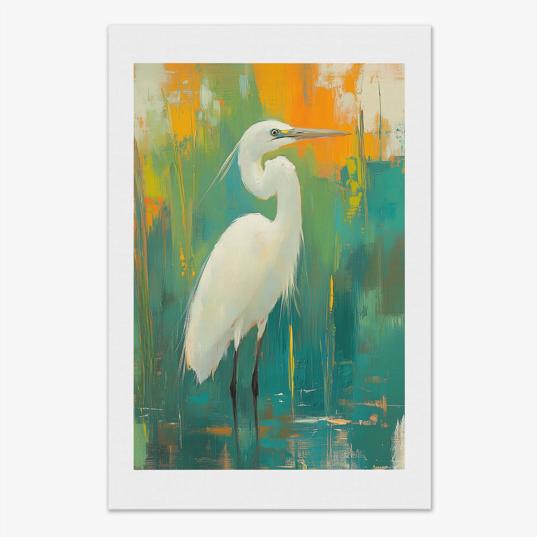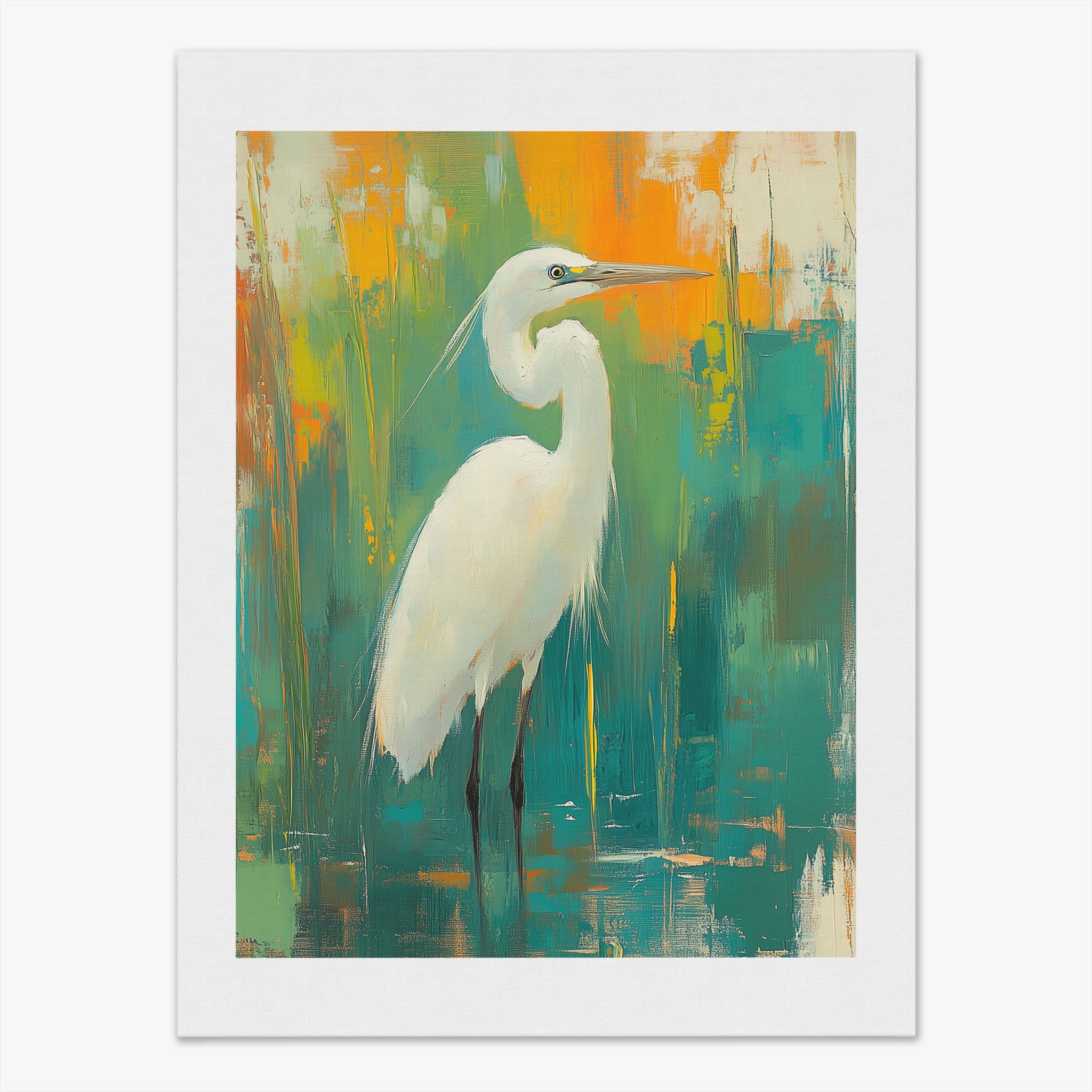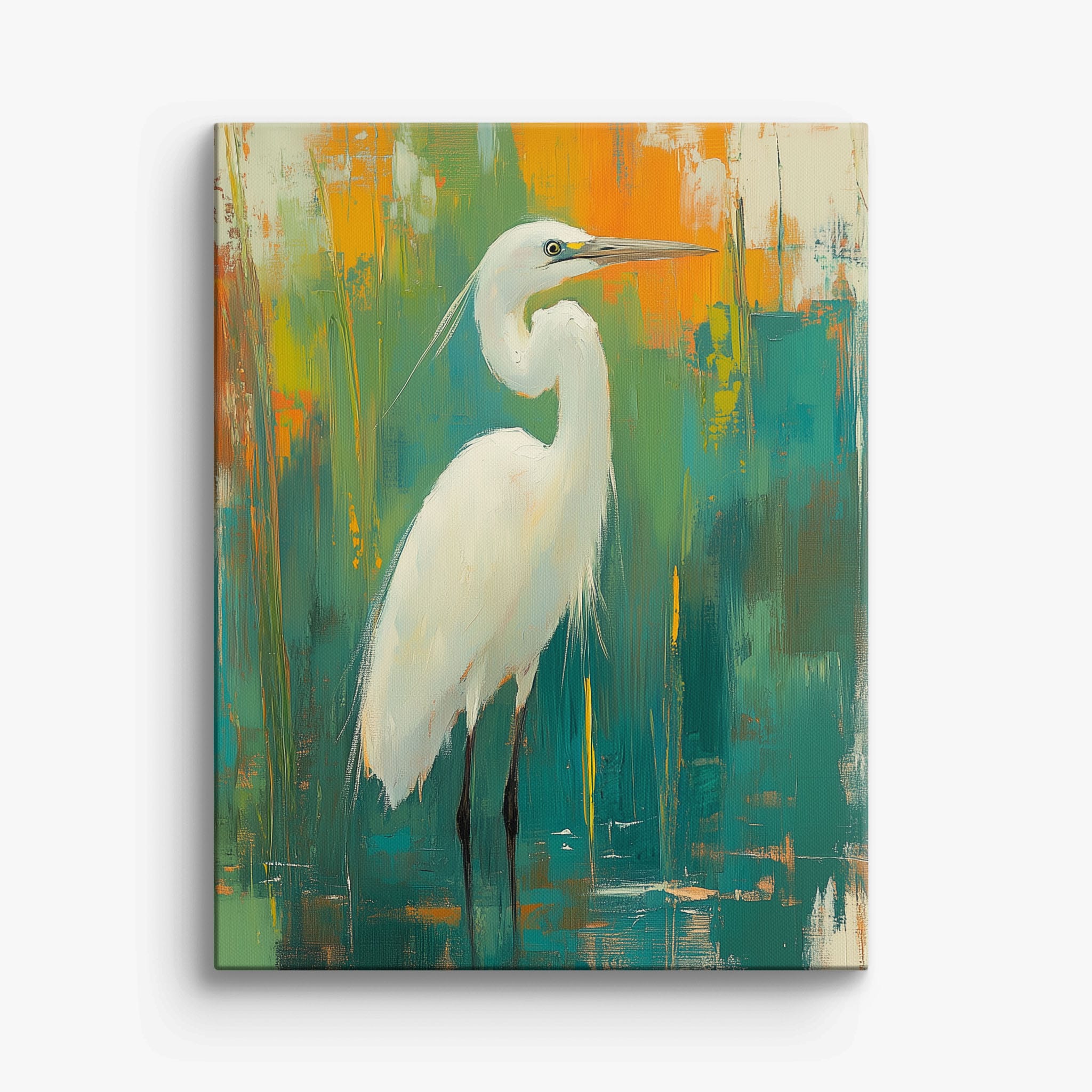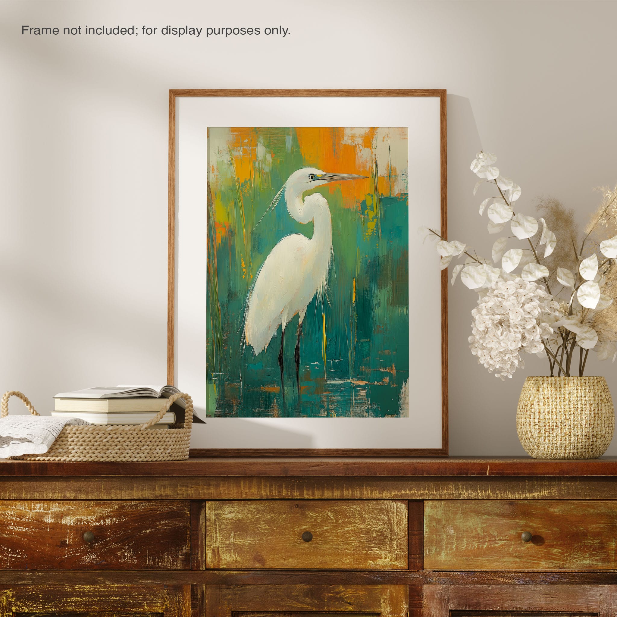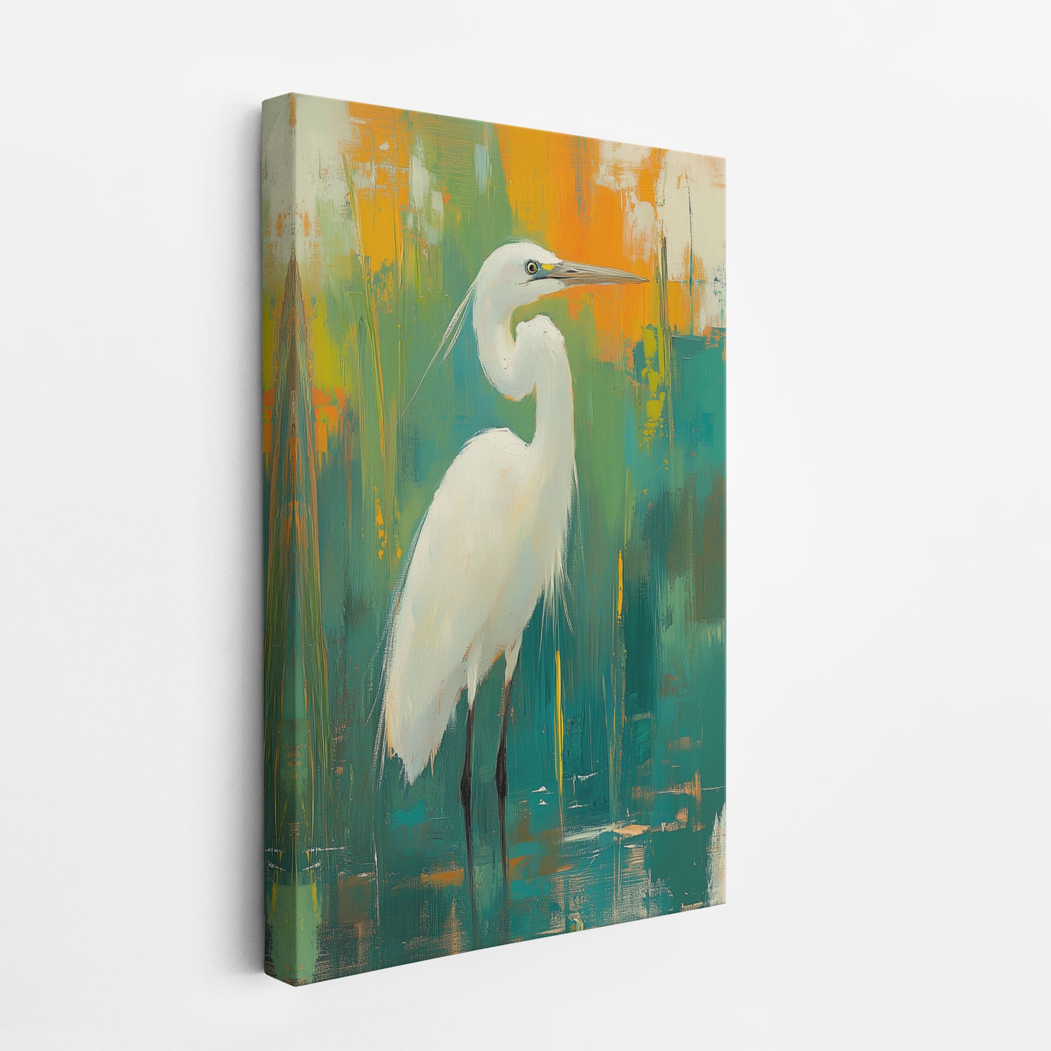 Captivating in its portrayal of a solitary egret amid a backdrop of abstract sweeps and vibrant splashes of paint, this painting vividly captures both the grace of the bird and the dynamism of the natural environment it inhabits. The earthy oranges and greens contrast sharply with the egret’s stark white feathers, highlighting its serene presence. This artwork, ideal for nature lovers and modern art aficionados, promises to bring a touch of tranquil elegance and contemporary artistic flair to any living space or gallery. Add this striking piece to your decor for a daily inspiration drawn from nature.