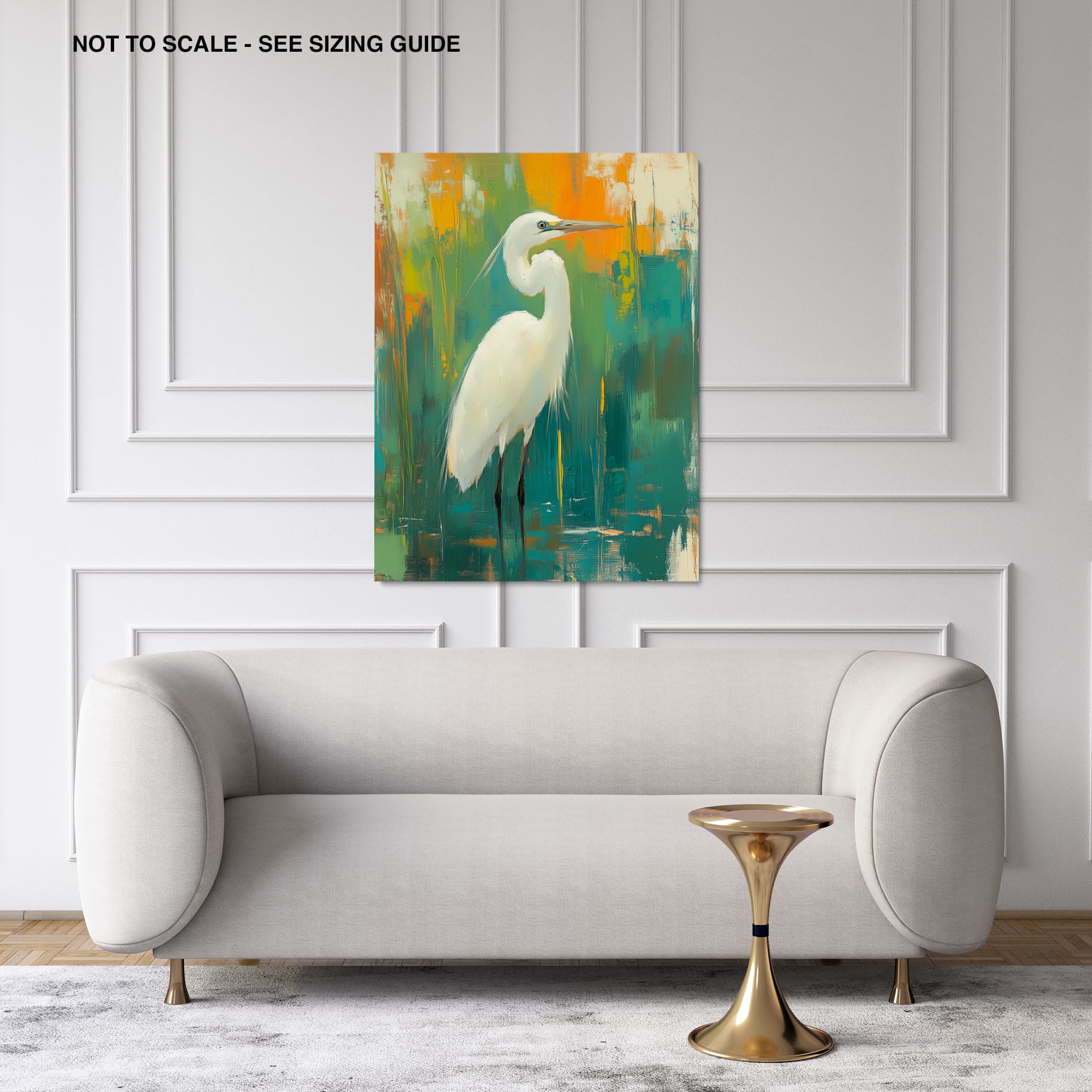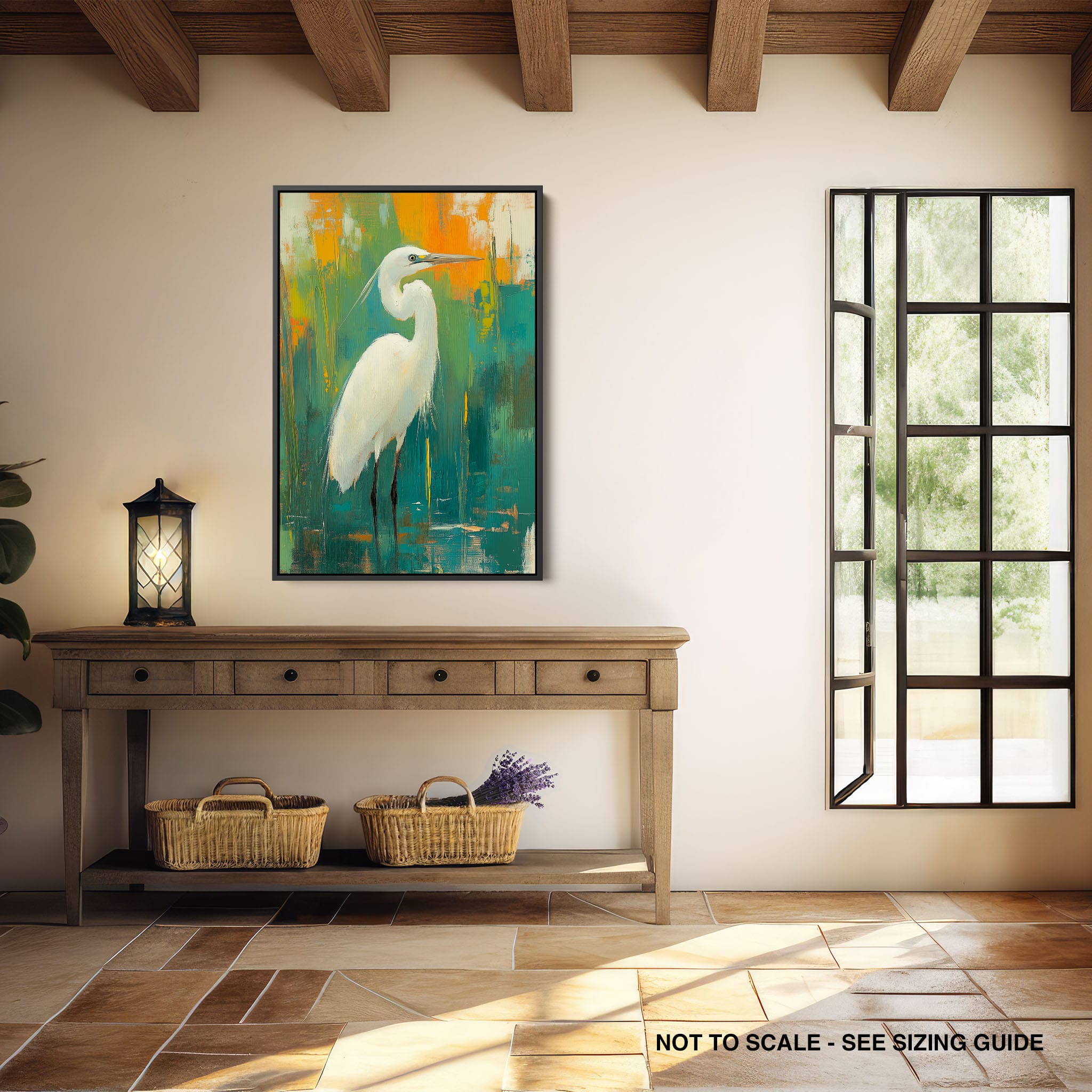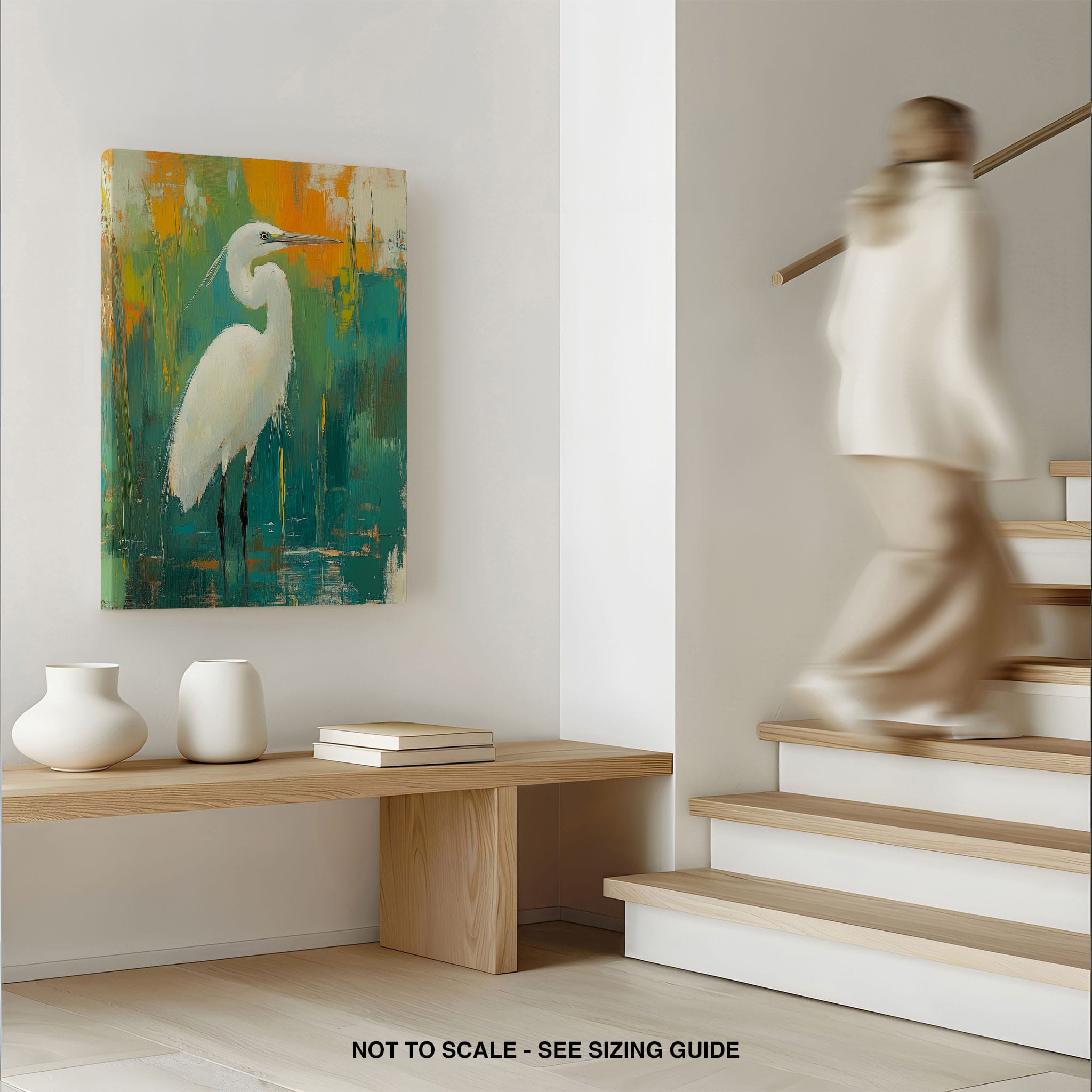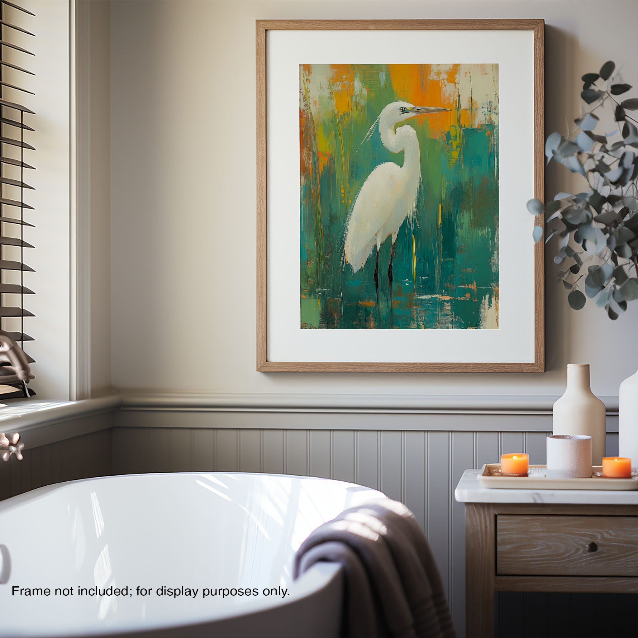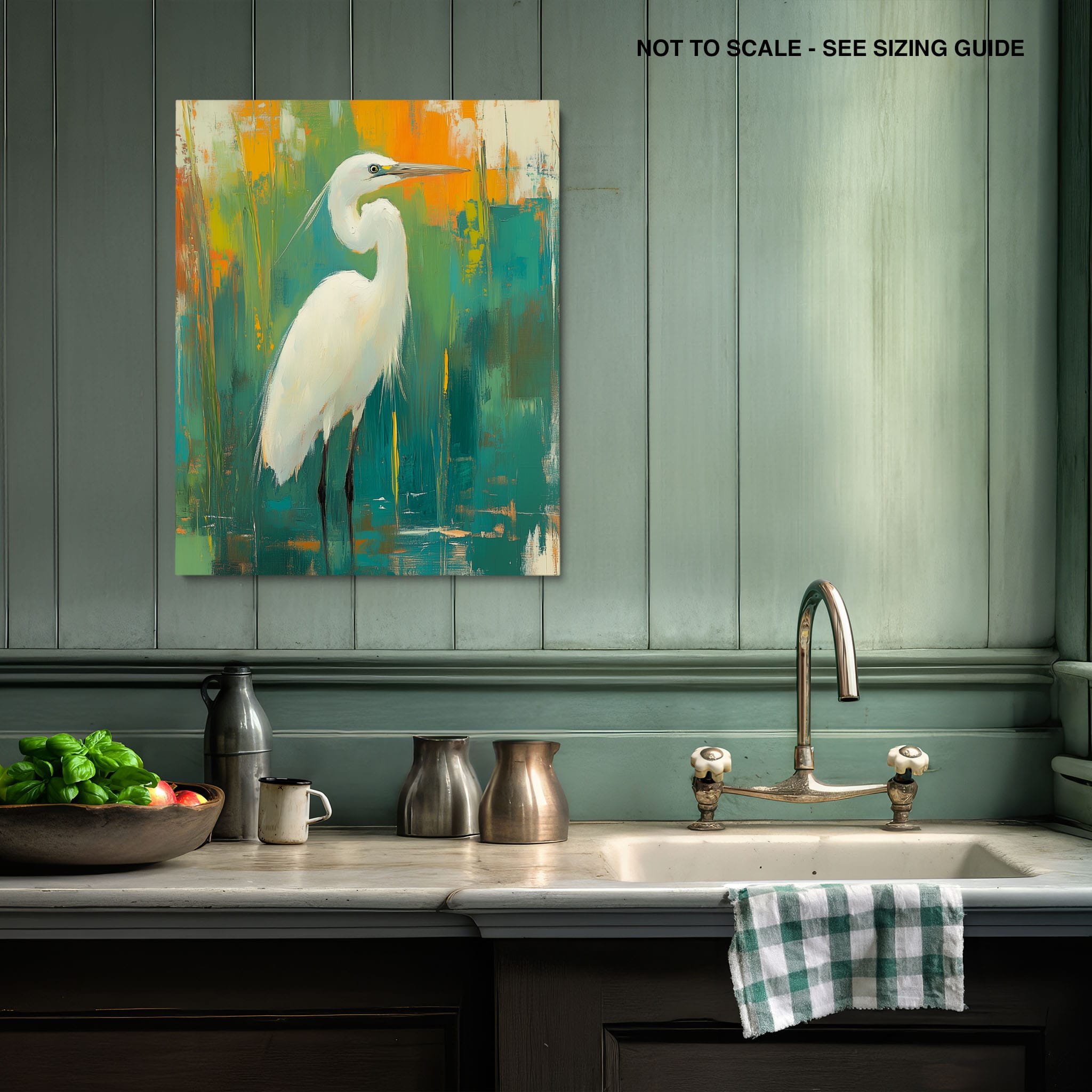 Captivating in its portrayal of a solitary egret amid a backdrop of abstract sweeps and vibrant splashes of paint, this painting vividly captures both the grace of the bird and the dynamism of the natural environment it inhabits. The earthy oranges and greens contrast sharply with the egret’s stark white feathers, highlighting its serene presence. This artwork, ideal for nature lovers and modern art aficionados, promises to bring a touch of tranquil elegance and contemporary artistic flair to any living space or gallery. Add this striking piece to your decor for a daily inspiration drawn from nature.