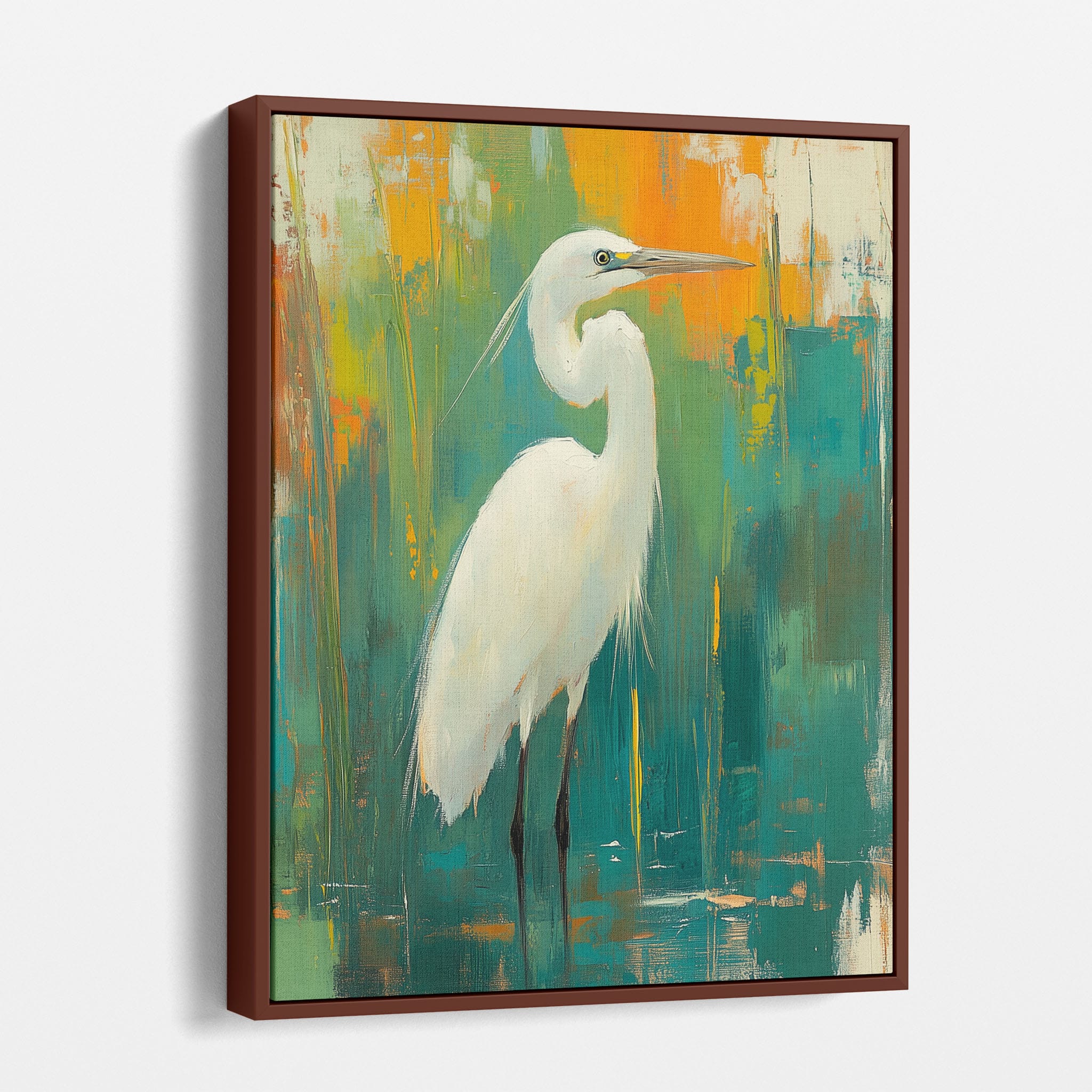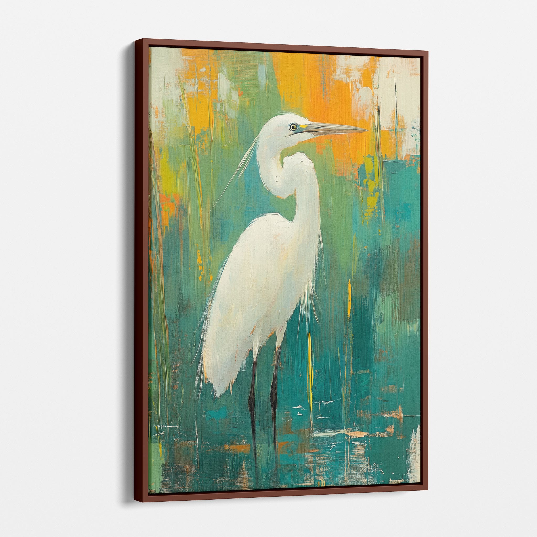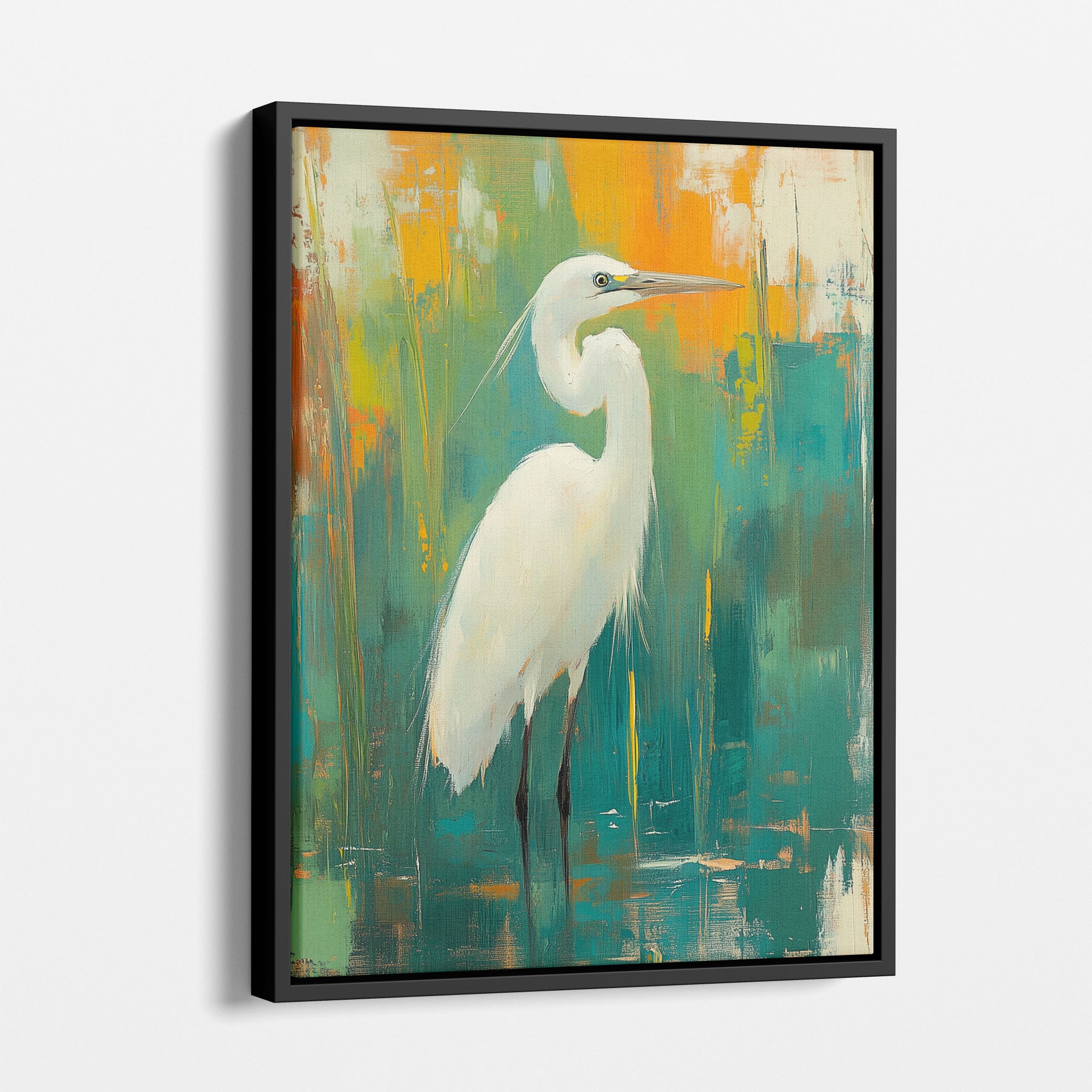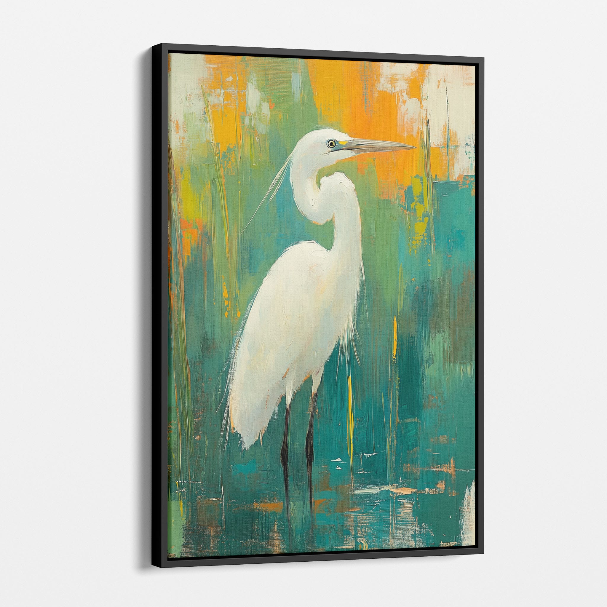 Captivating in its portrayal of a solitary egret amid a backdrop of abstract sweeps and vibrant splashes of paint, this painting vividly captures both the grace of the bird and the dynamism of the natural environment it inhabits. The earthy oranges and greens contrast sharply with the egret’s stark white feathers, highlighting its serene presence. This artwork, ideal for nature lovers and modern art aficionados, promises to bring a touch of tranquil elegance and contemporary artistic flair to any living space or gallery. Add this striking piece to your decor for a daily inspiration drawn from nature.