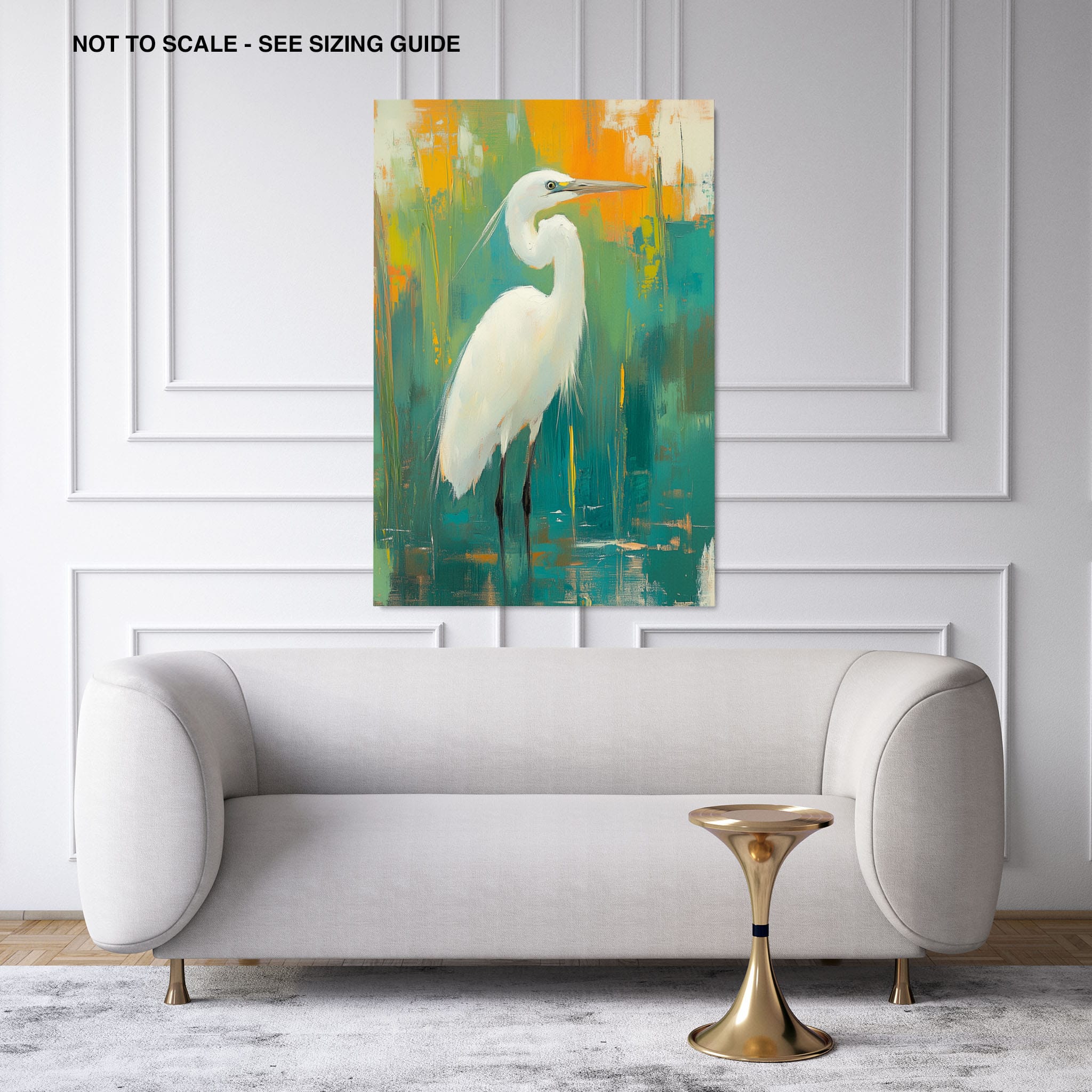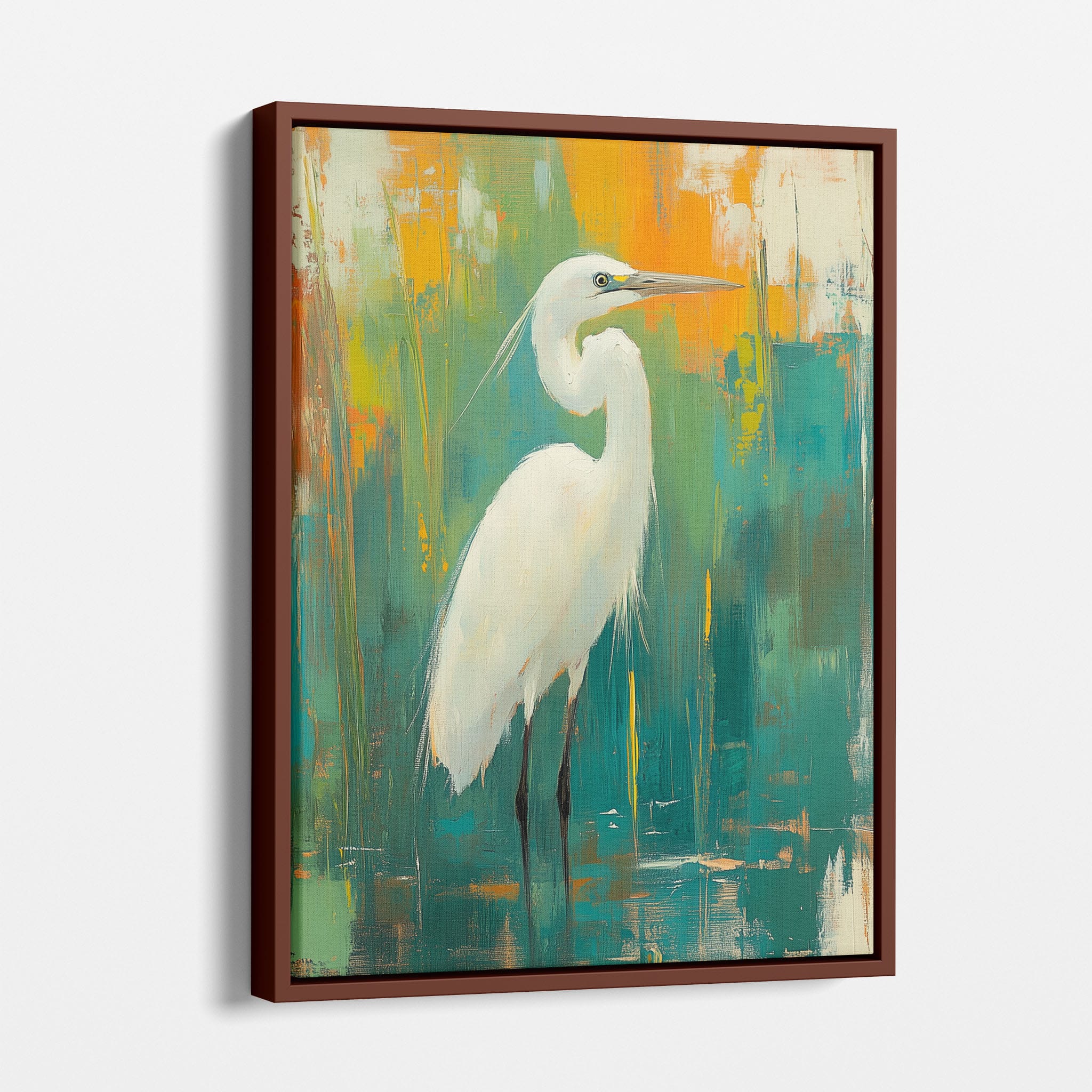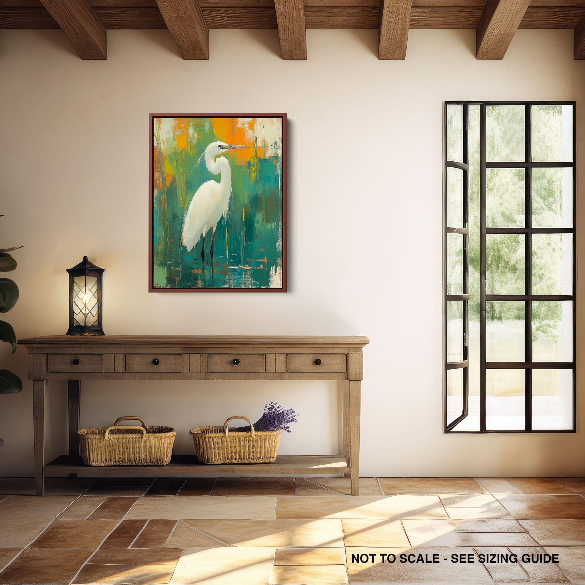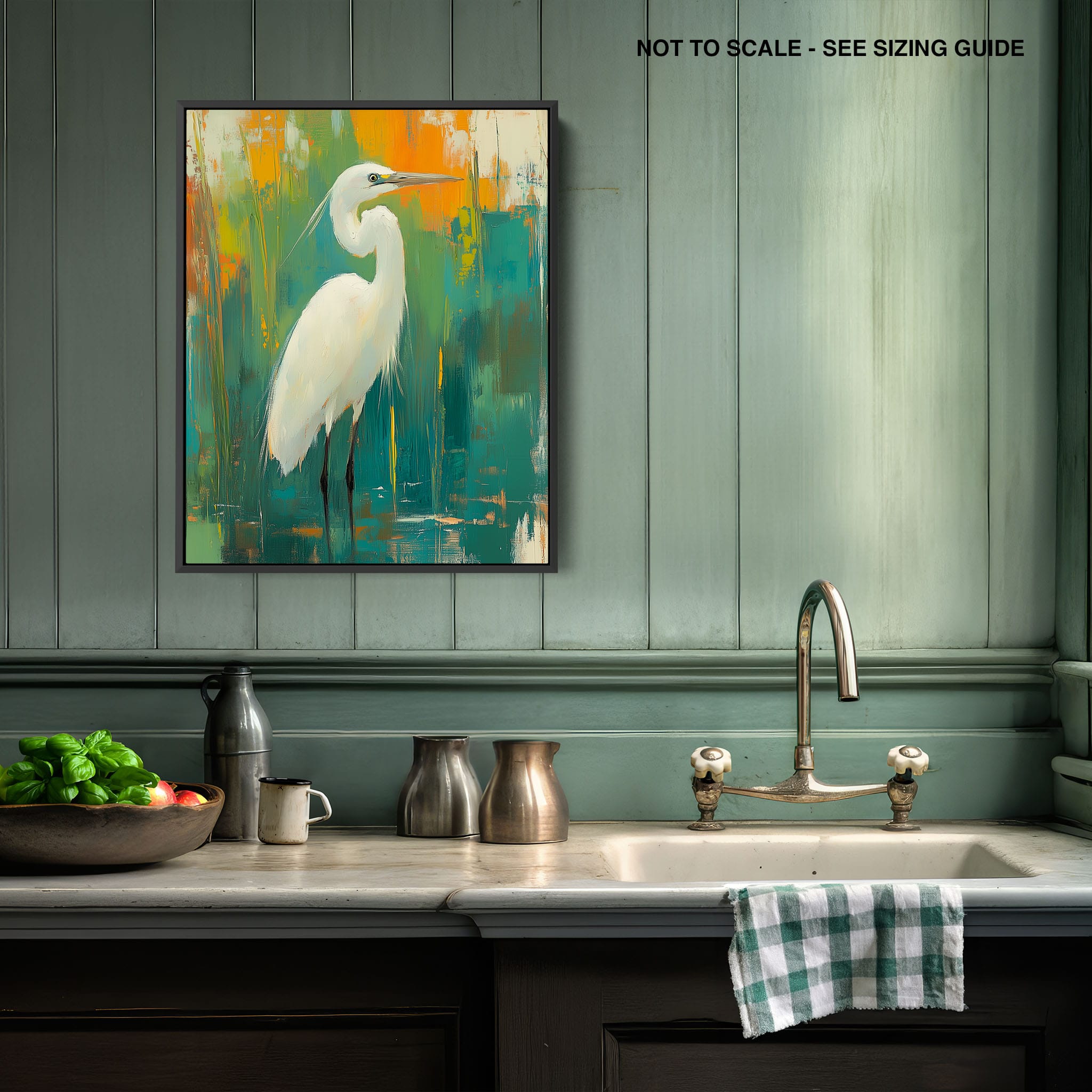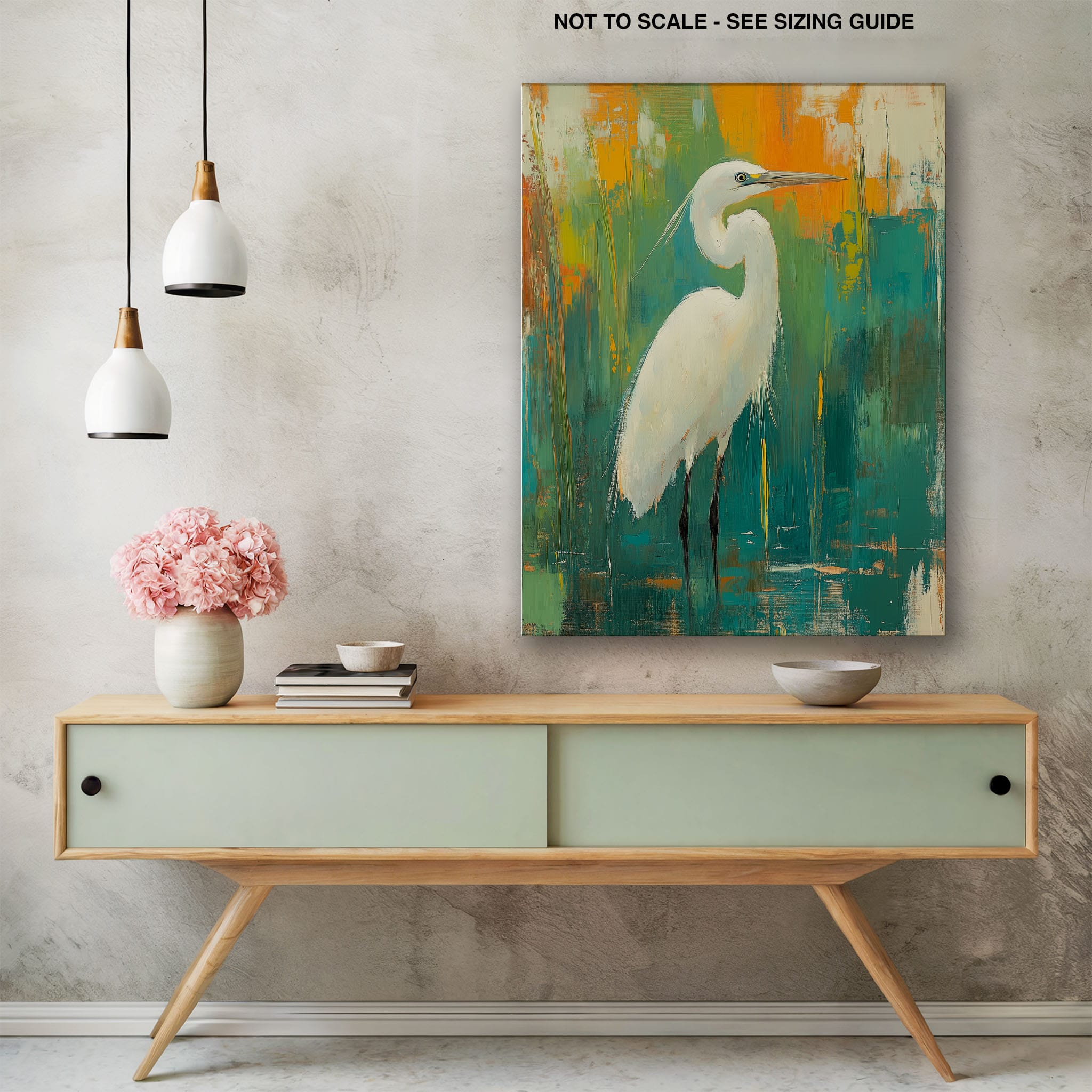 Captivating in its portrayal of a solitary egret amid a backdrop of abstract sweeps and vibrant splashes of paint, this painting vividly captures both the grace of the bird and the dynamism of the natural environment it inhabits. The earthy oranges and greens contrast sharply with the egret’s stark white feathers, highlighting its serene presence. This artwork, ideal for nature lovers and modern art aficionados, promises to bring a touch of tranquil elegance and contemporary artistic flair to any living space or gallery. Add this striking piece to your decor for a daily inspiration drawn from nature.