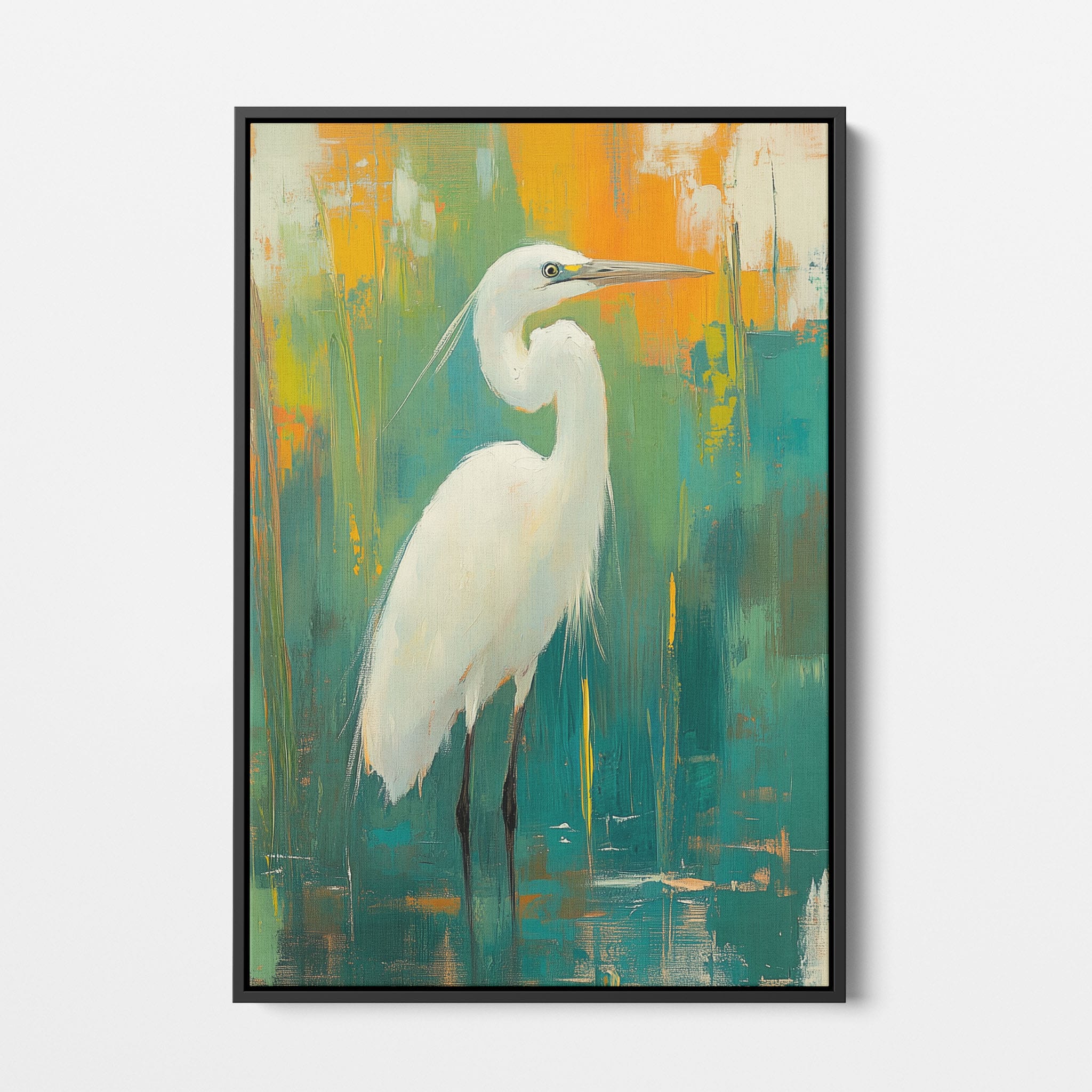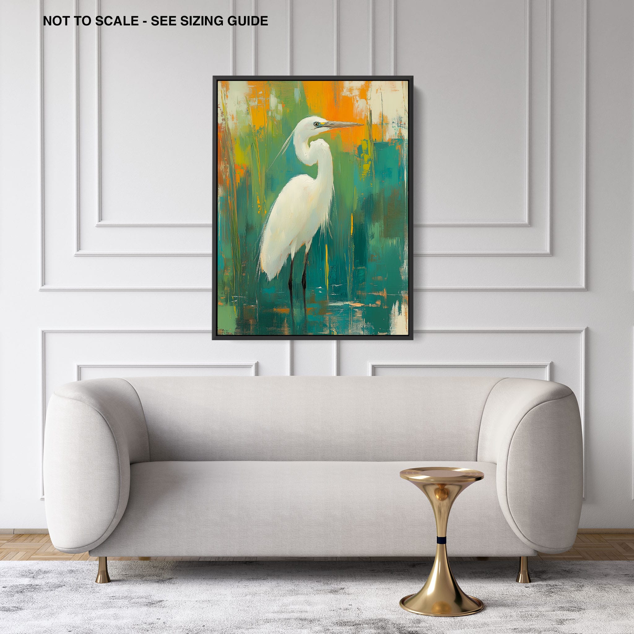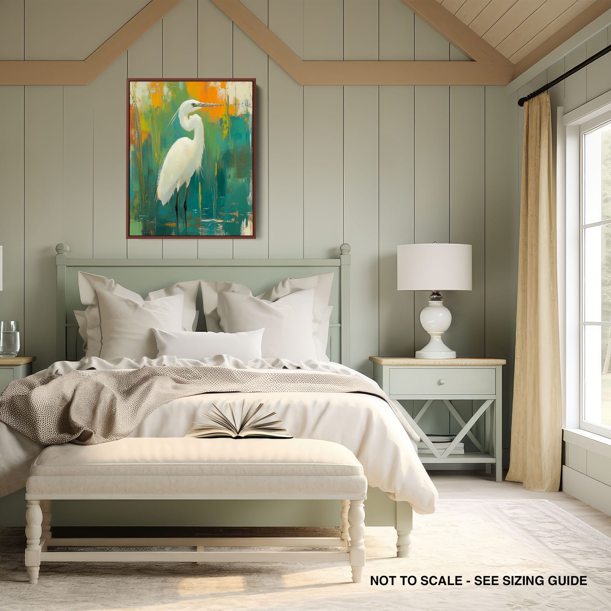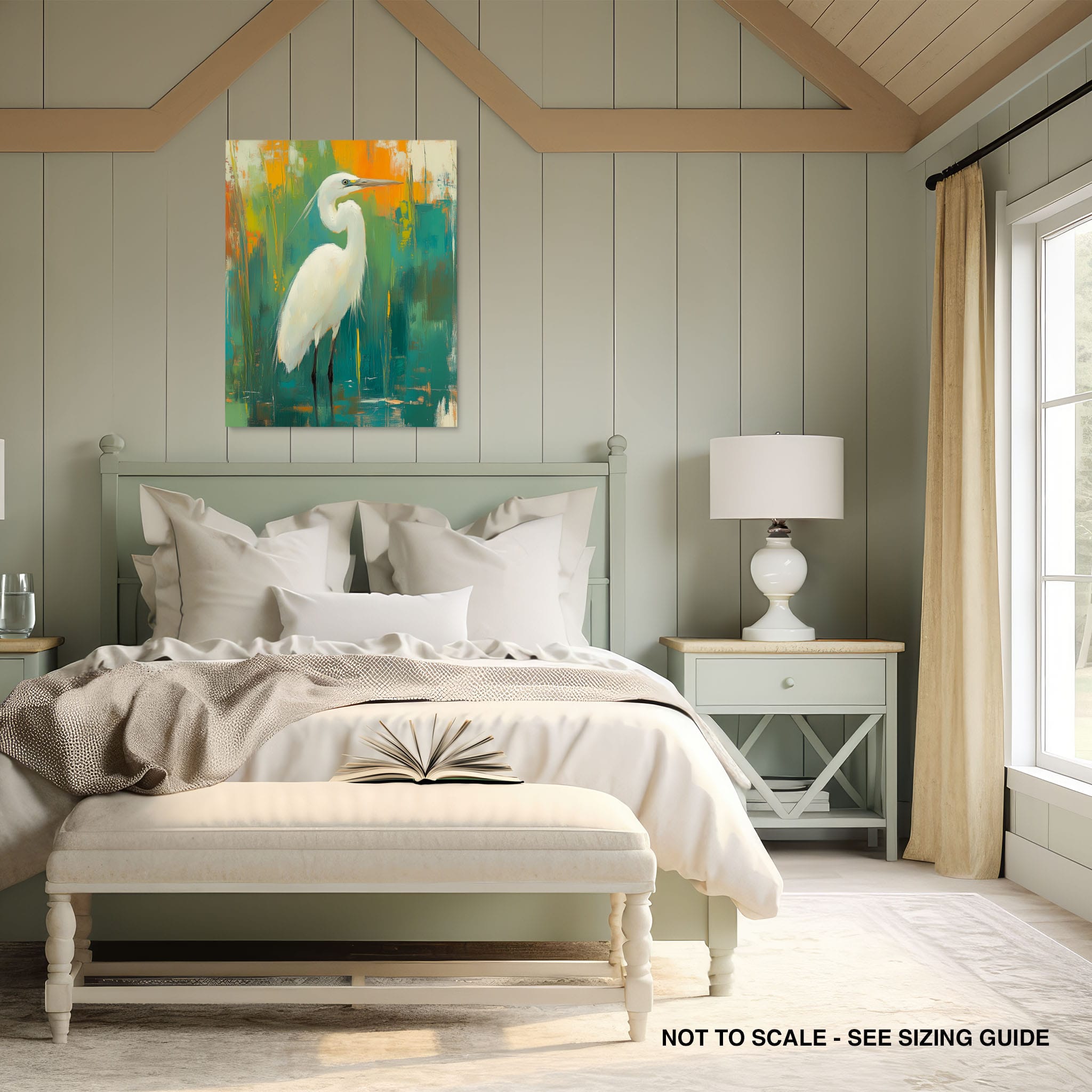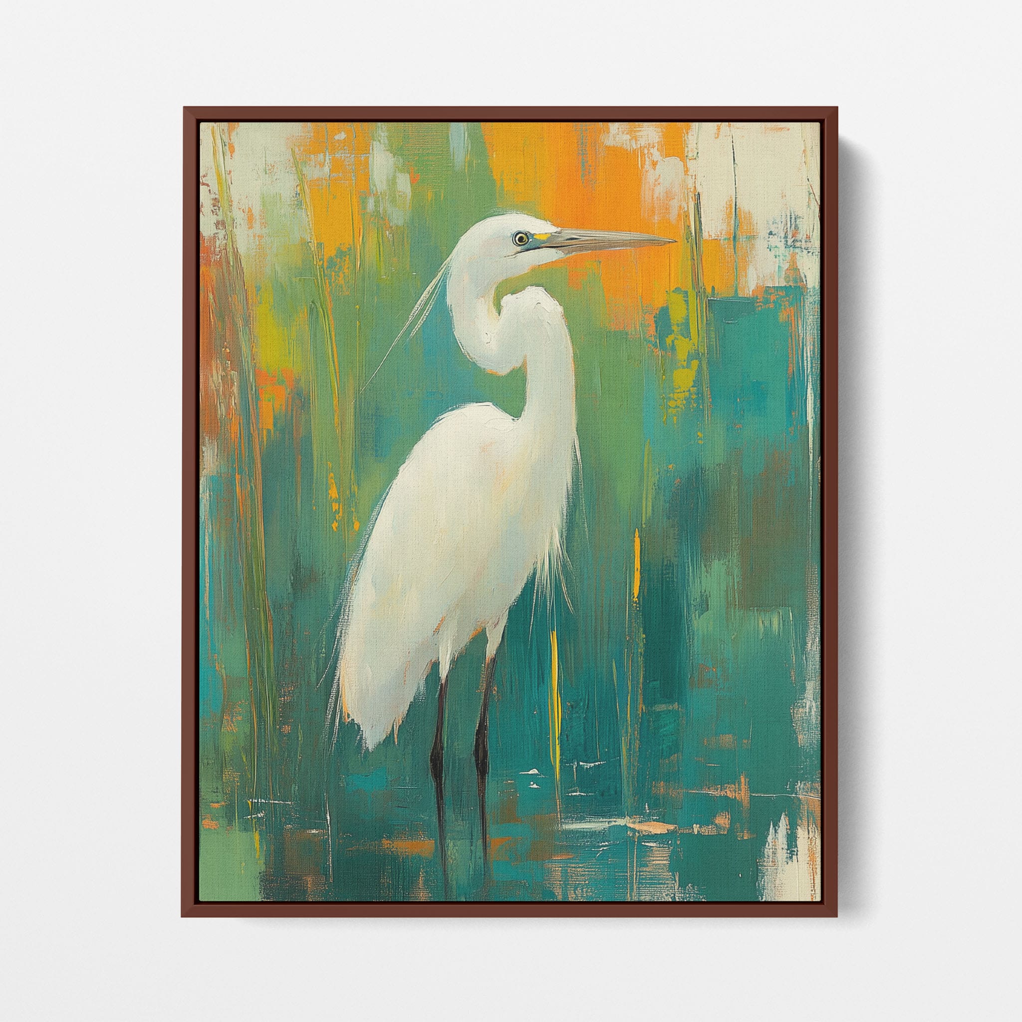 Captivating in its portrayal of a solitary egret amid a backdrop of abstract sweeps and vibrant splashes of paint, this painting vividly captures both the grace of the bird and the dynamism of the natural environment it inhabits. The earthy oranges and greens contrast sharply with the egret’s stark white feathers, highlighting its serene presence. This artwork, ideal for nature lovers and modern art aficionados, promises to bring a touch of tranquil elegance and contemporary artistic flair to any living space or gallery. Add this striking piece to your decor for a daily inspiration drawn from nature.