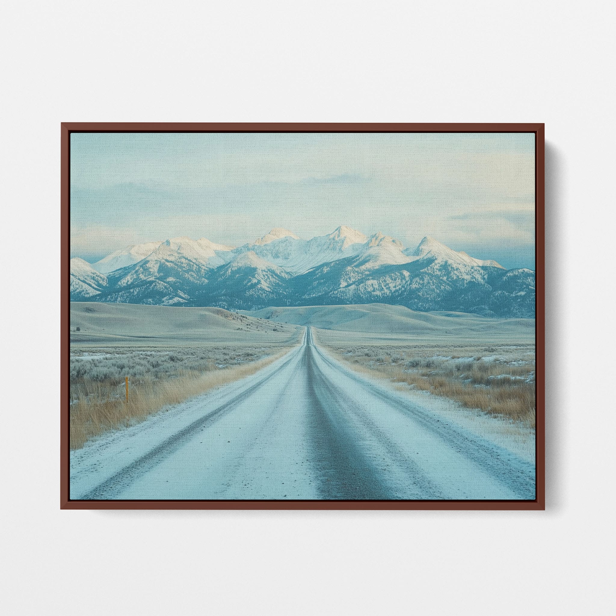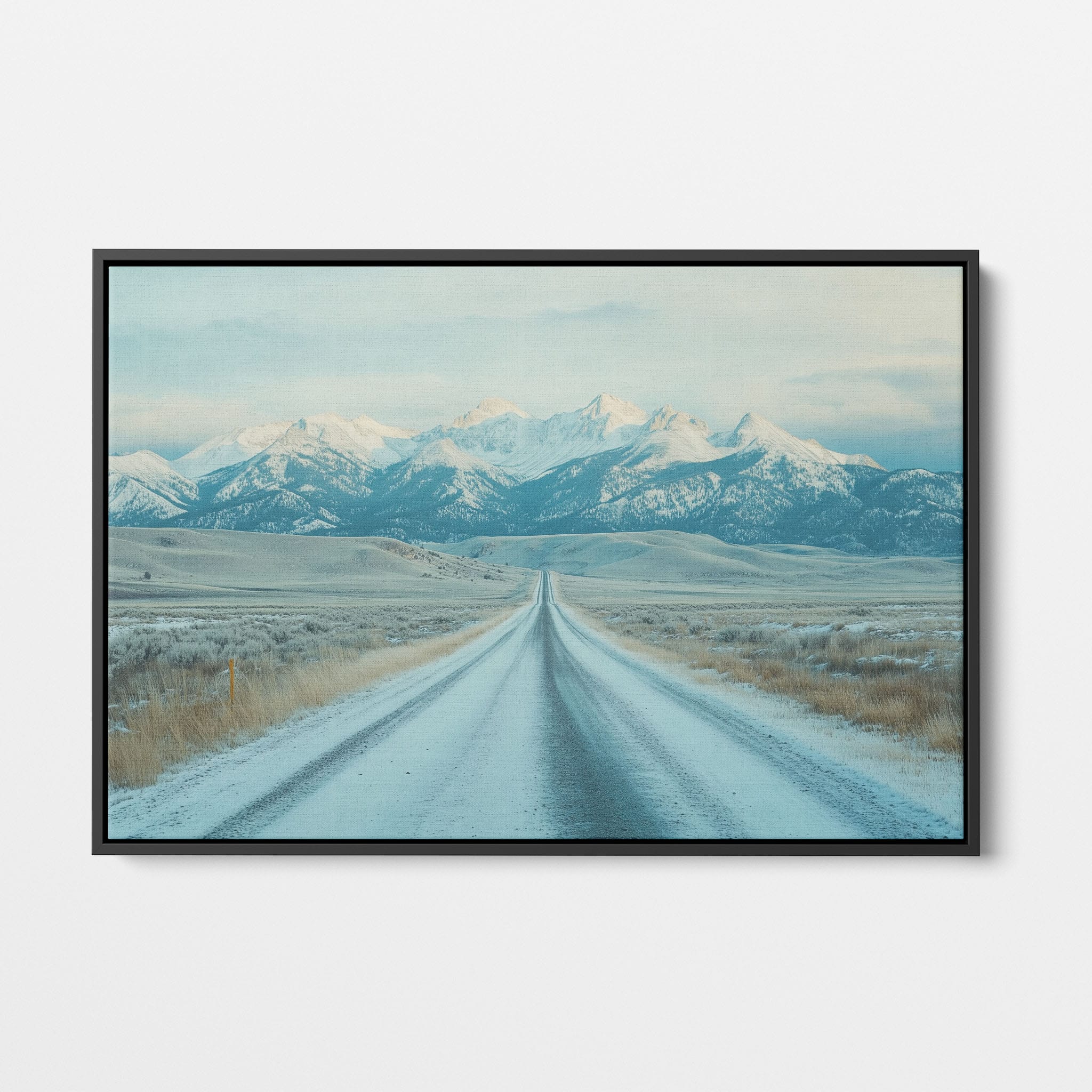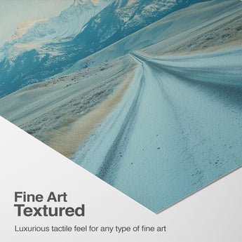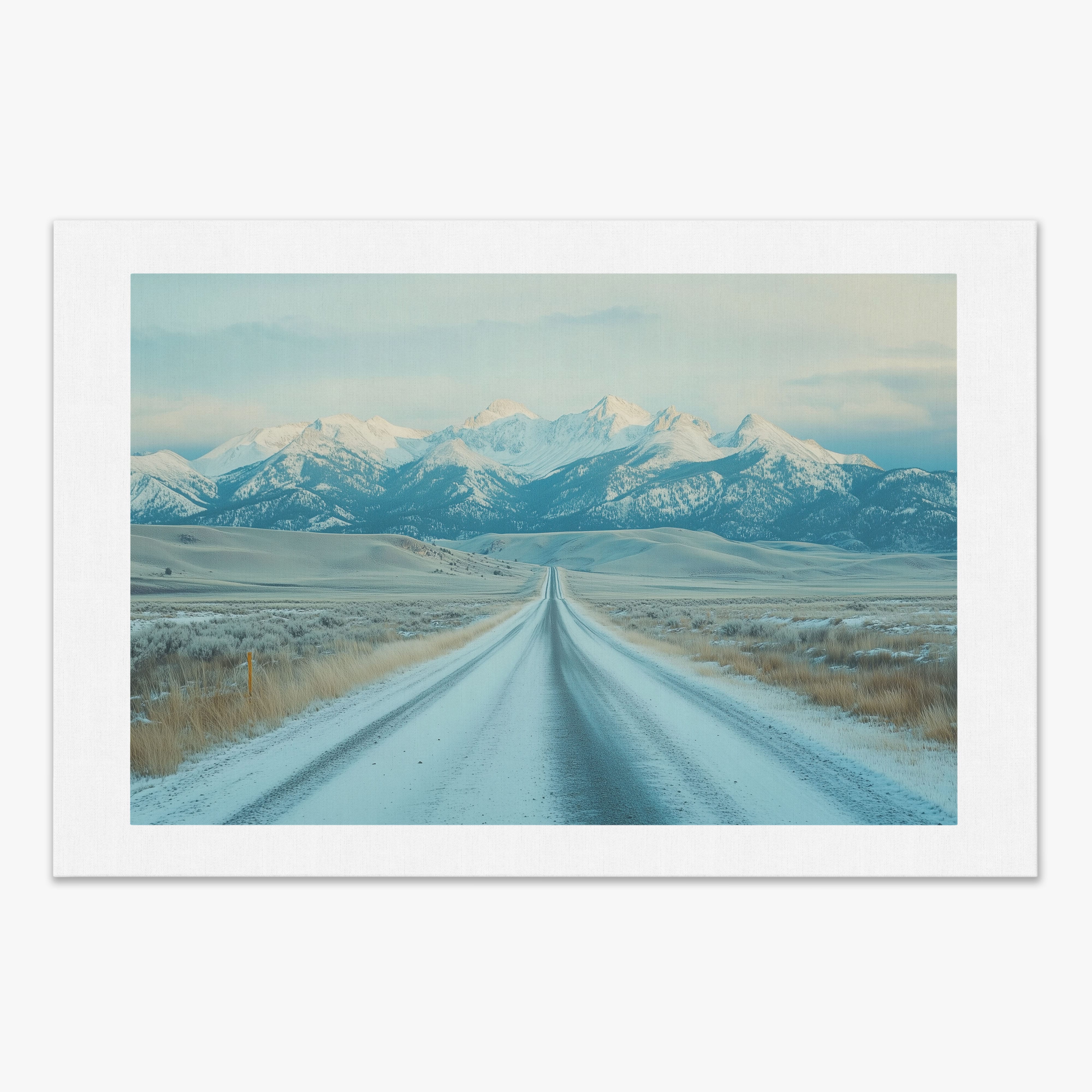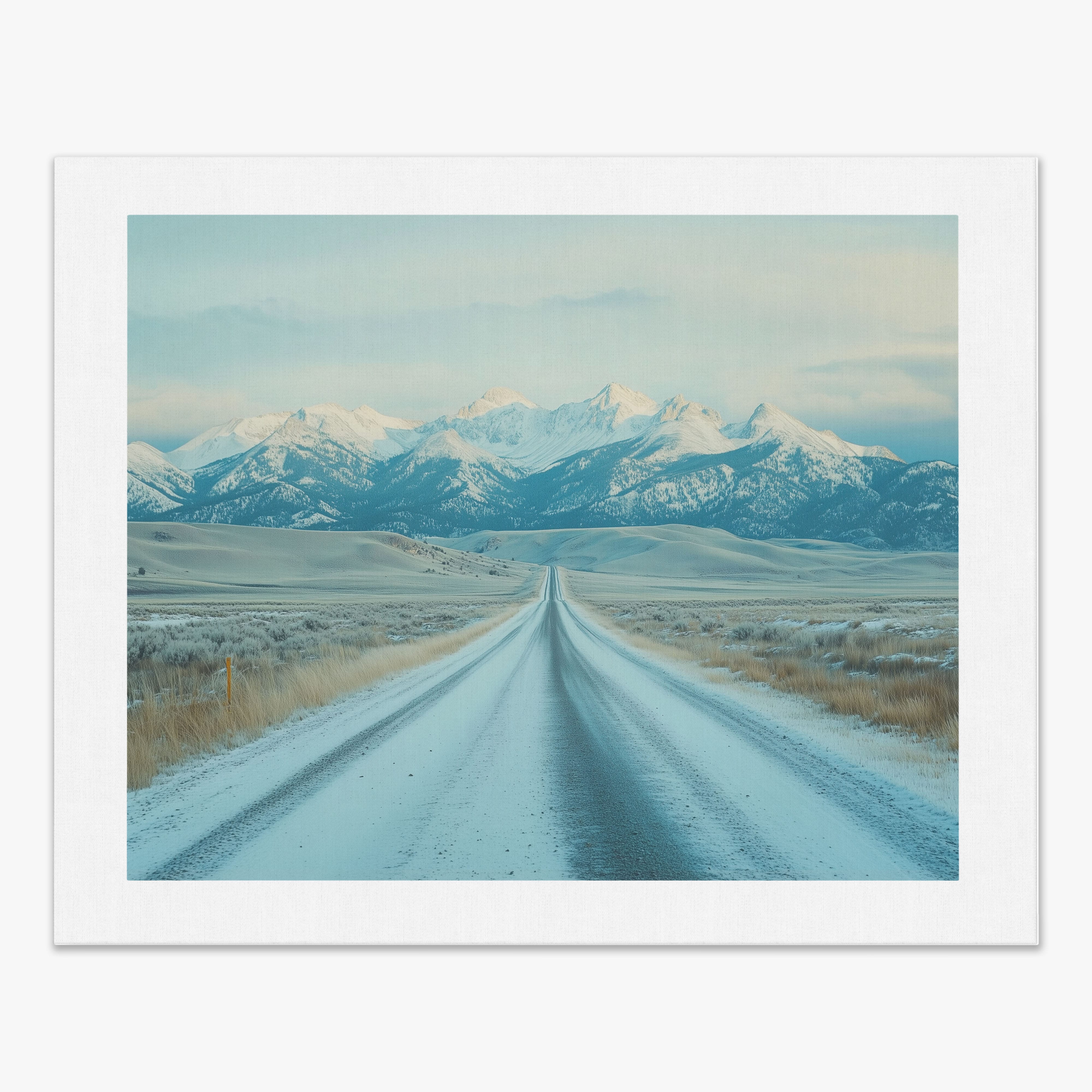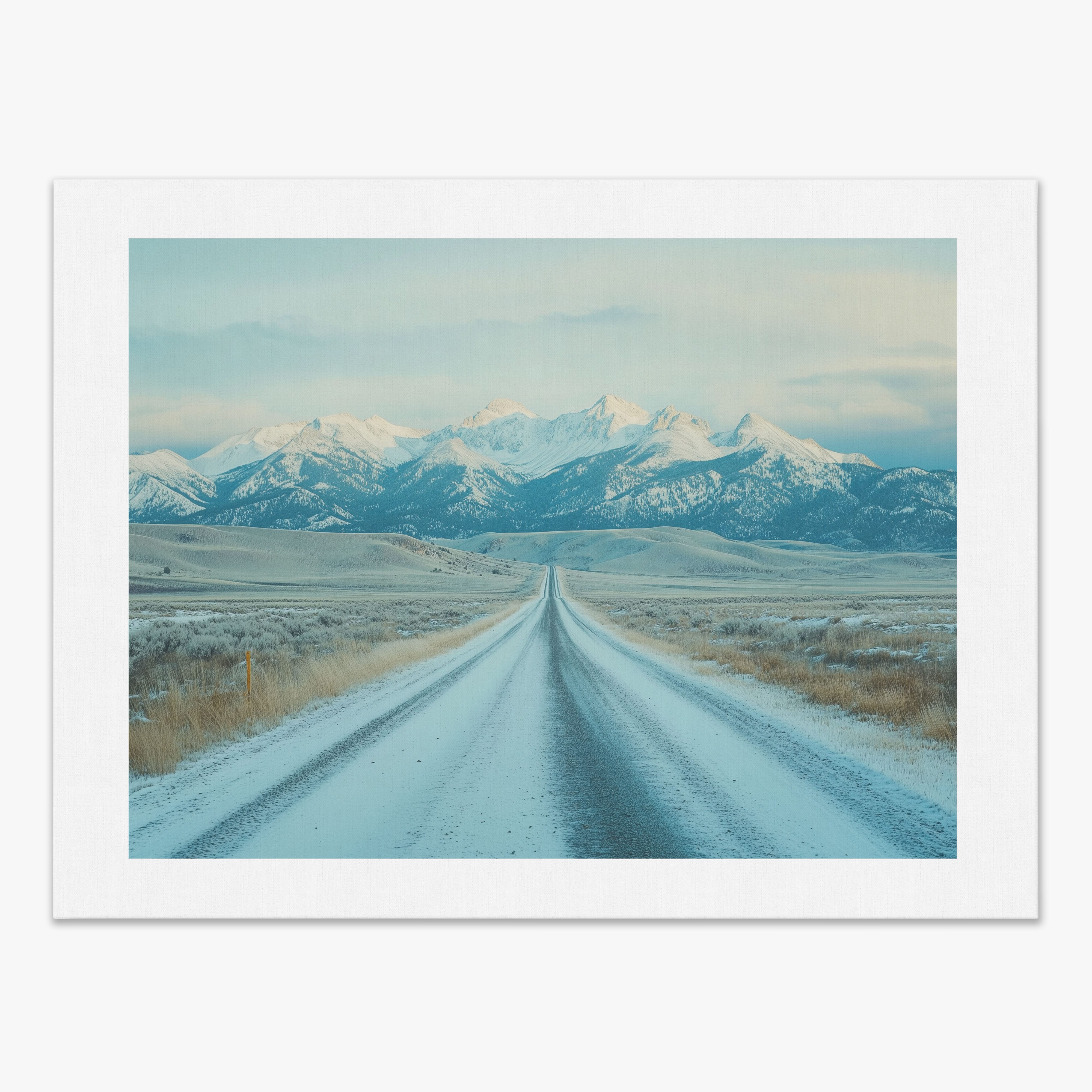 This captivating piece of digital photography captures a serene winter scene, showcasing an endless road that leads to majestic, snowy mountains. The cool blues and whites blend seamlessly, emphasizing the quiet beauty of the landscape. With minimalist elements highlighting vast open spaces and snow-covered terrain, this artwork beckons the viewer to experience the tranquility of winter. Perfect for those who appreciate landscape and minimalist art styles, this print will bring a touch of peaceful wilderness into your home or office.