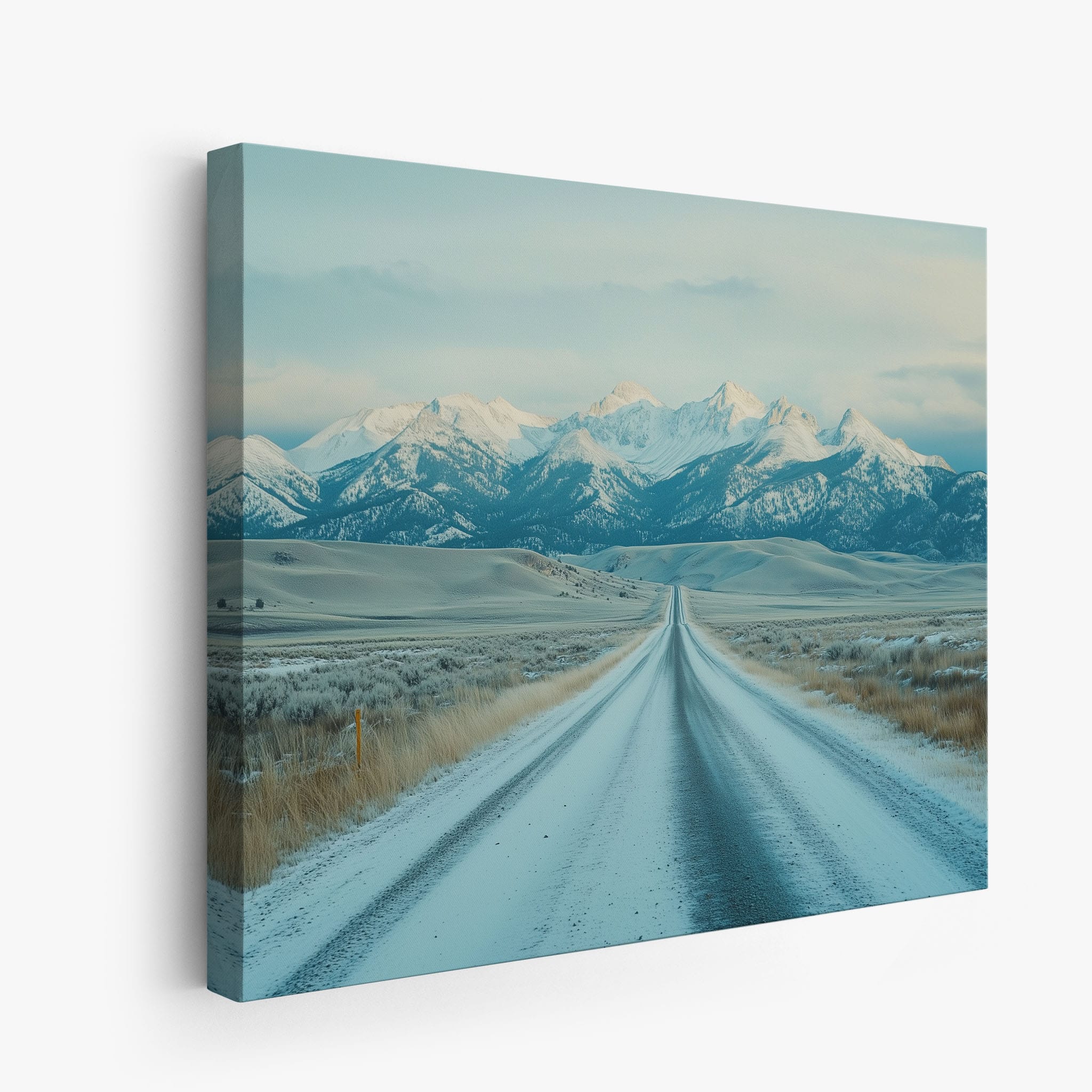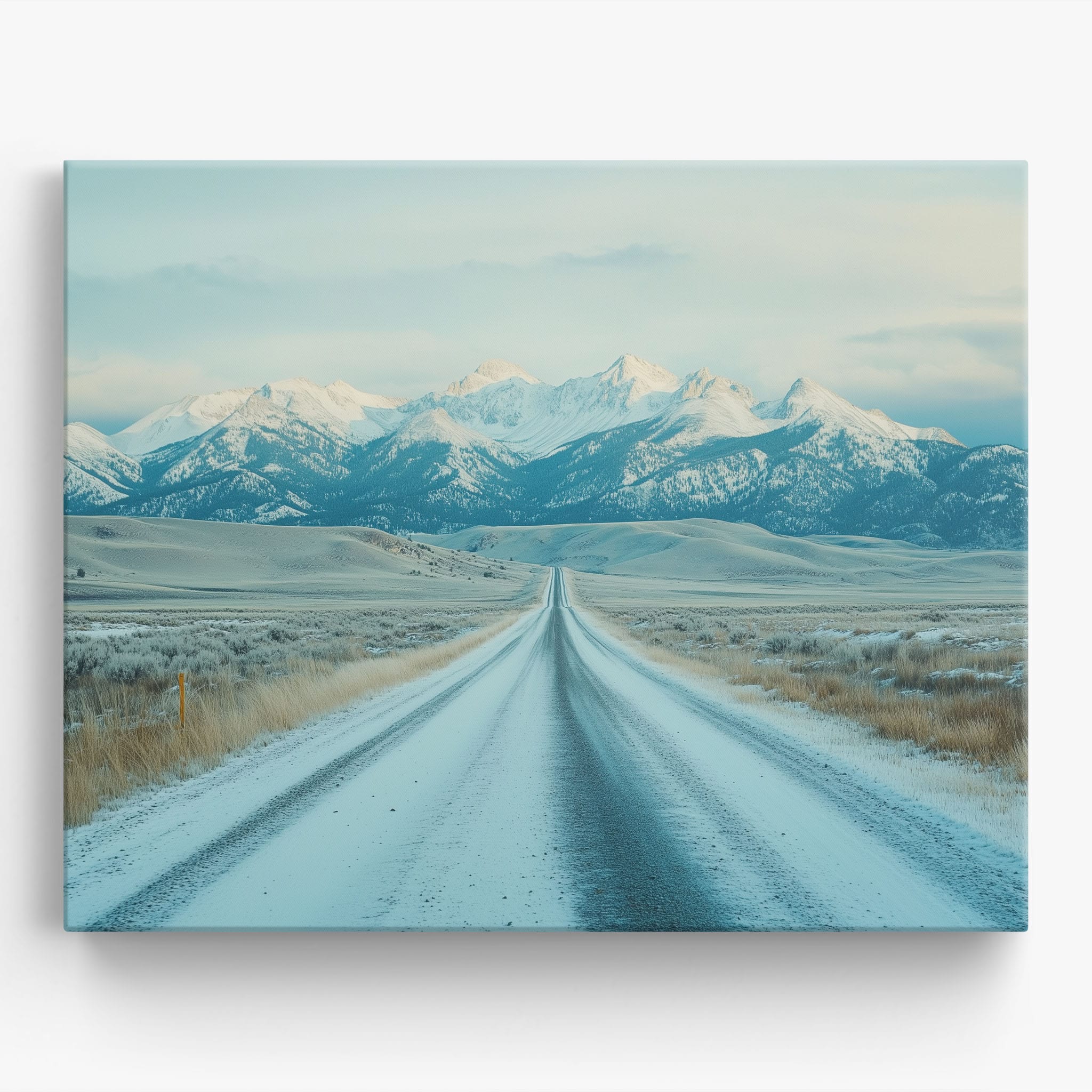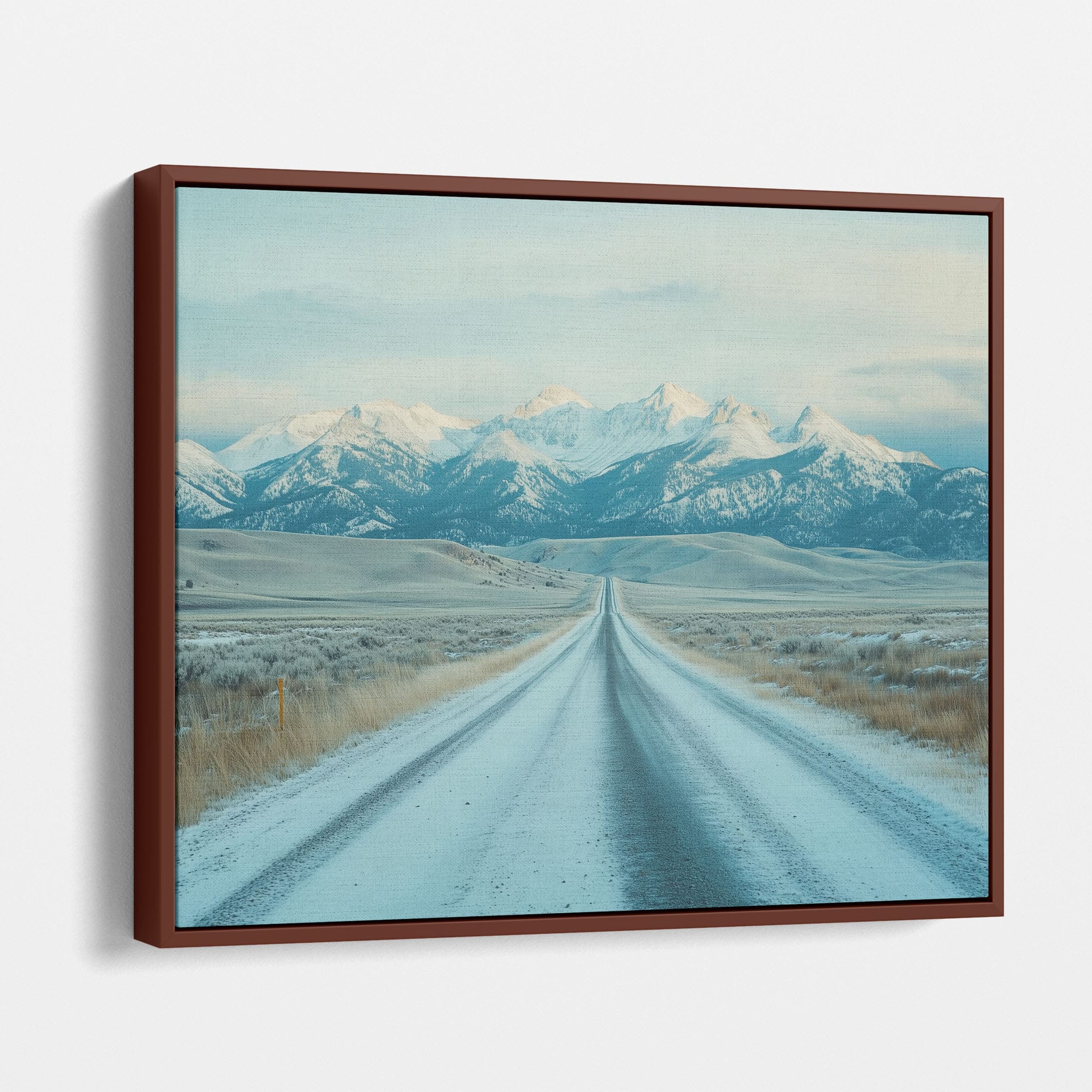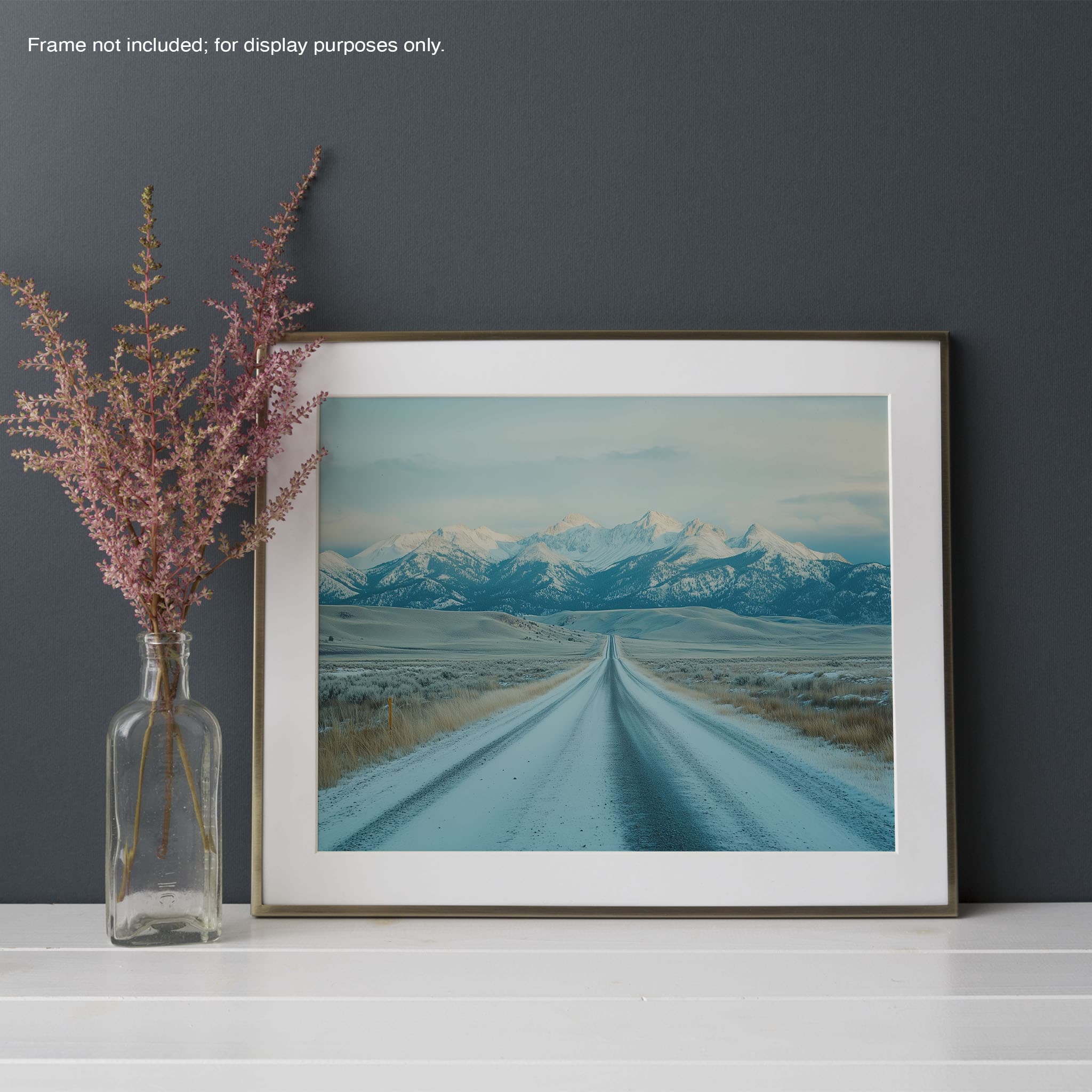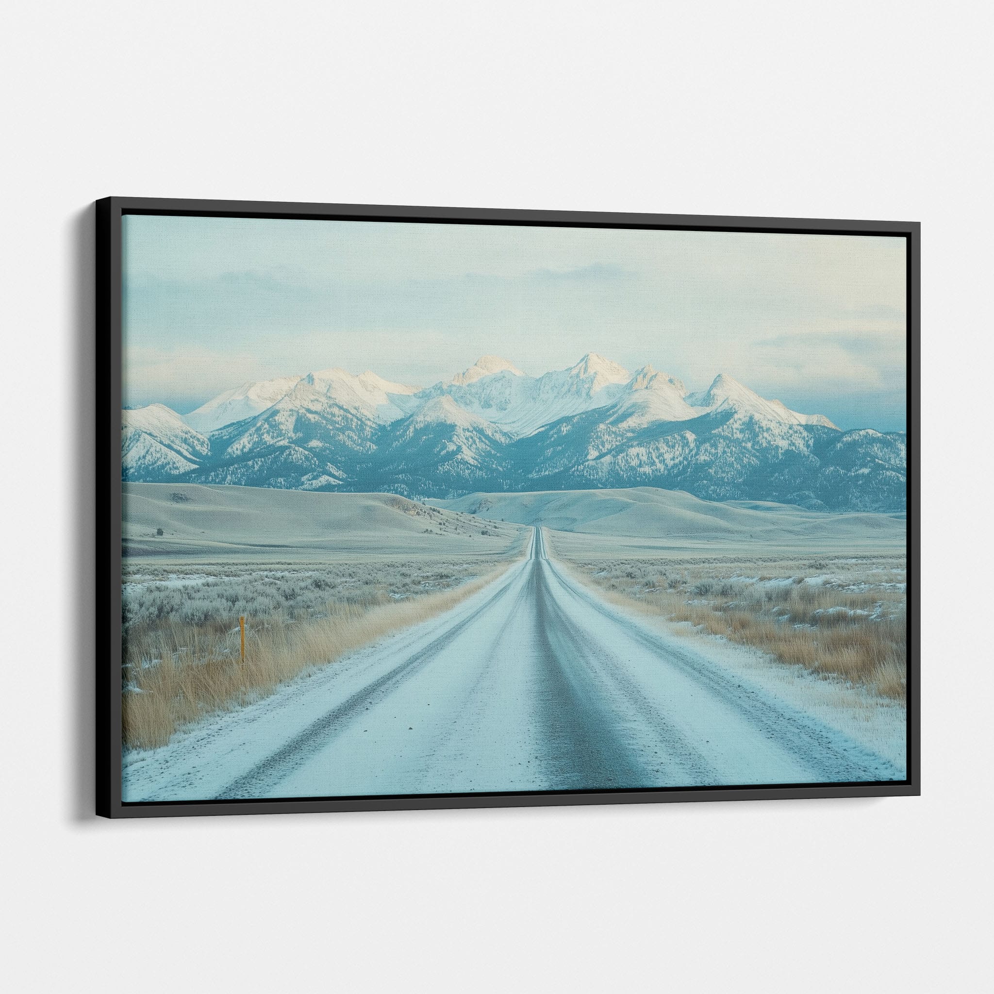 This captivating piece of digital photography captures a serene winter scene, showcasing an endless road that leads to majestic, snowy mountains. The cool blues and whites blend seamlessly, emphasizing the quiet beauty of the landscape. With minimalist elements highlighting vast open spaces and snow-covered terrain, this artwork beckons the viewer to experience the tranquility of winter. Perfect for those who appreciate landscape and minimalist art styles, this print will bring a touch of peaceful wilderness into your home or office.