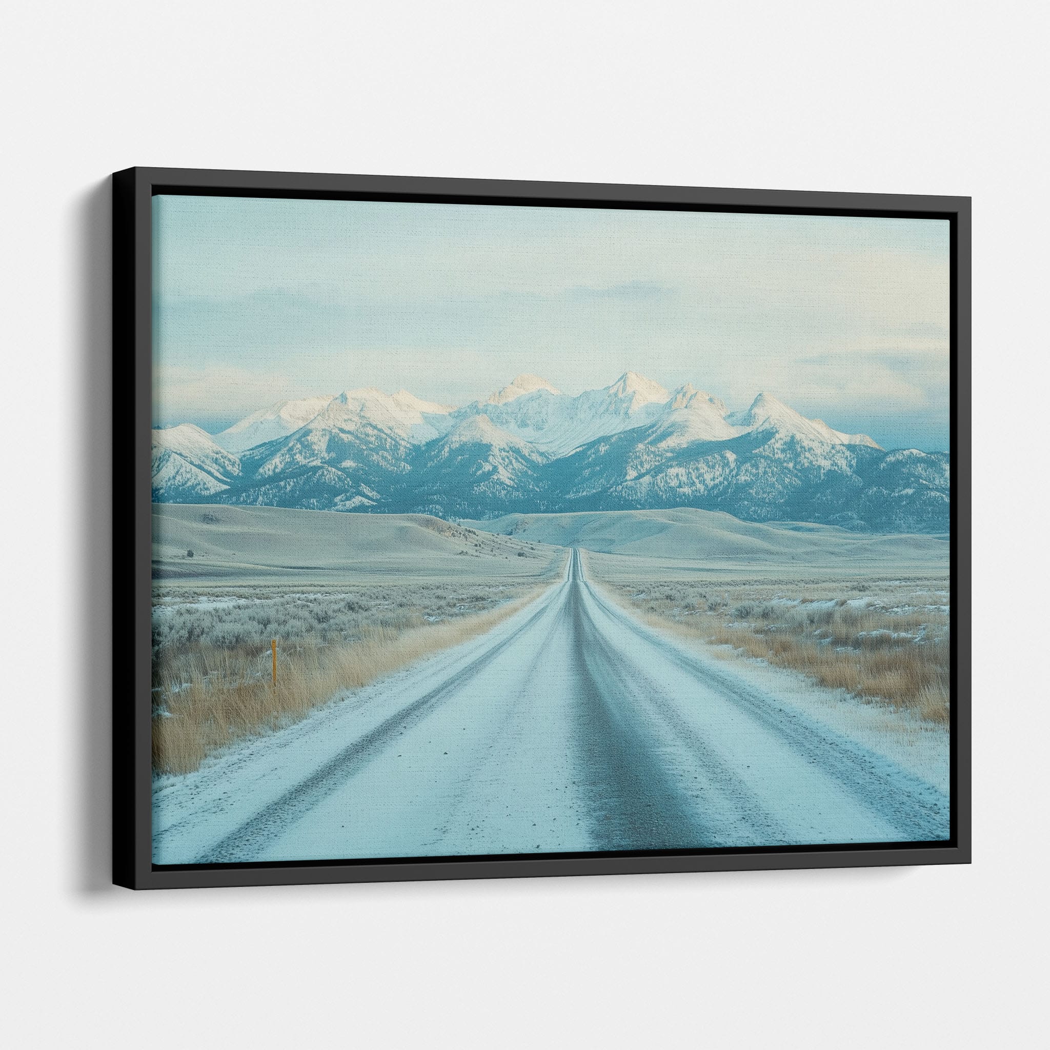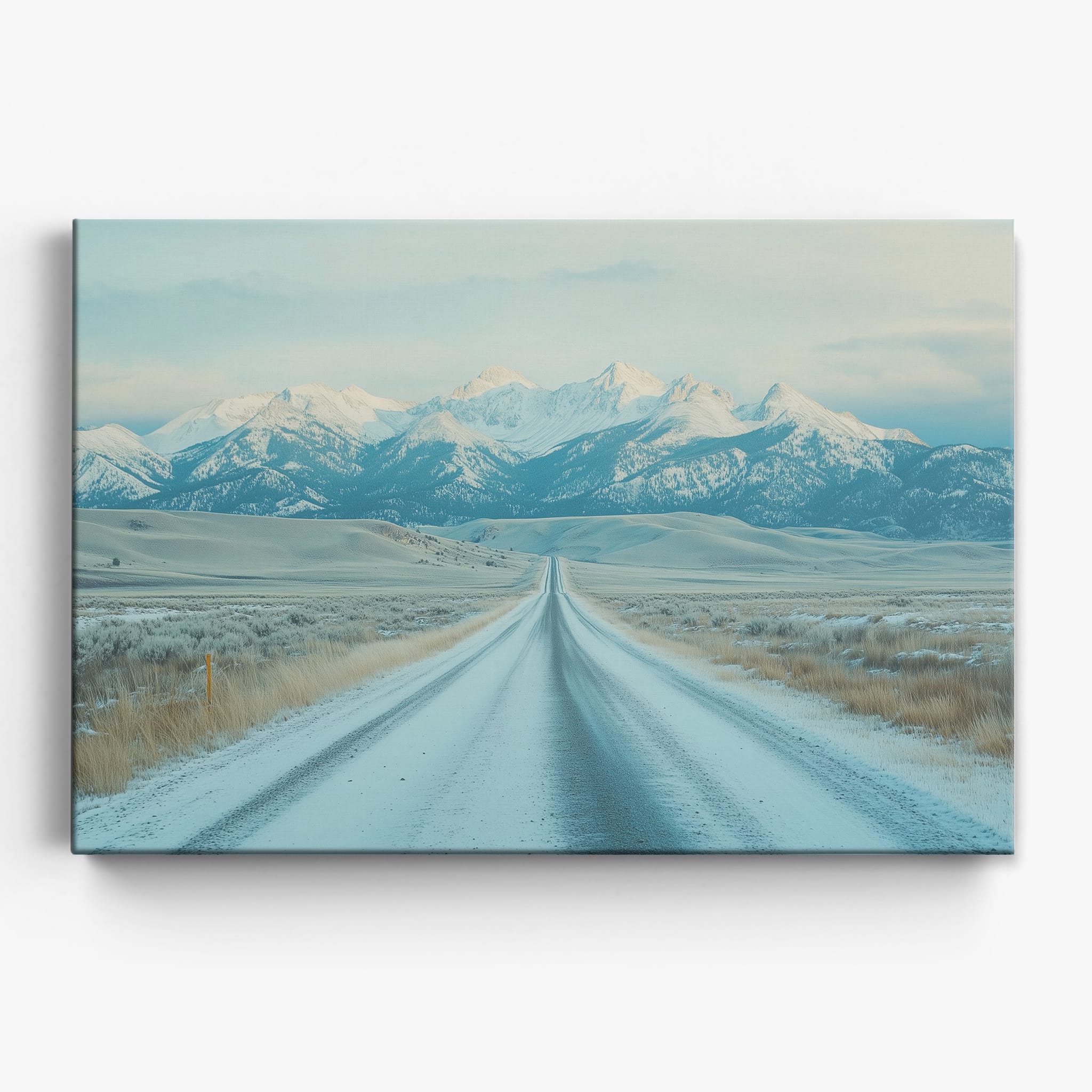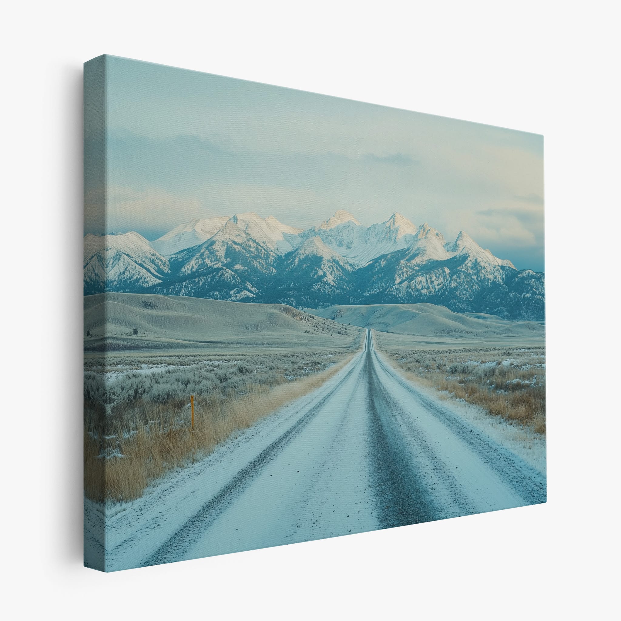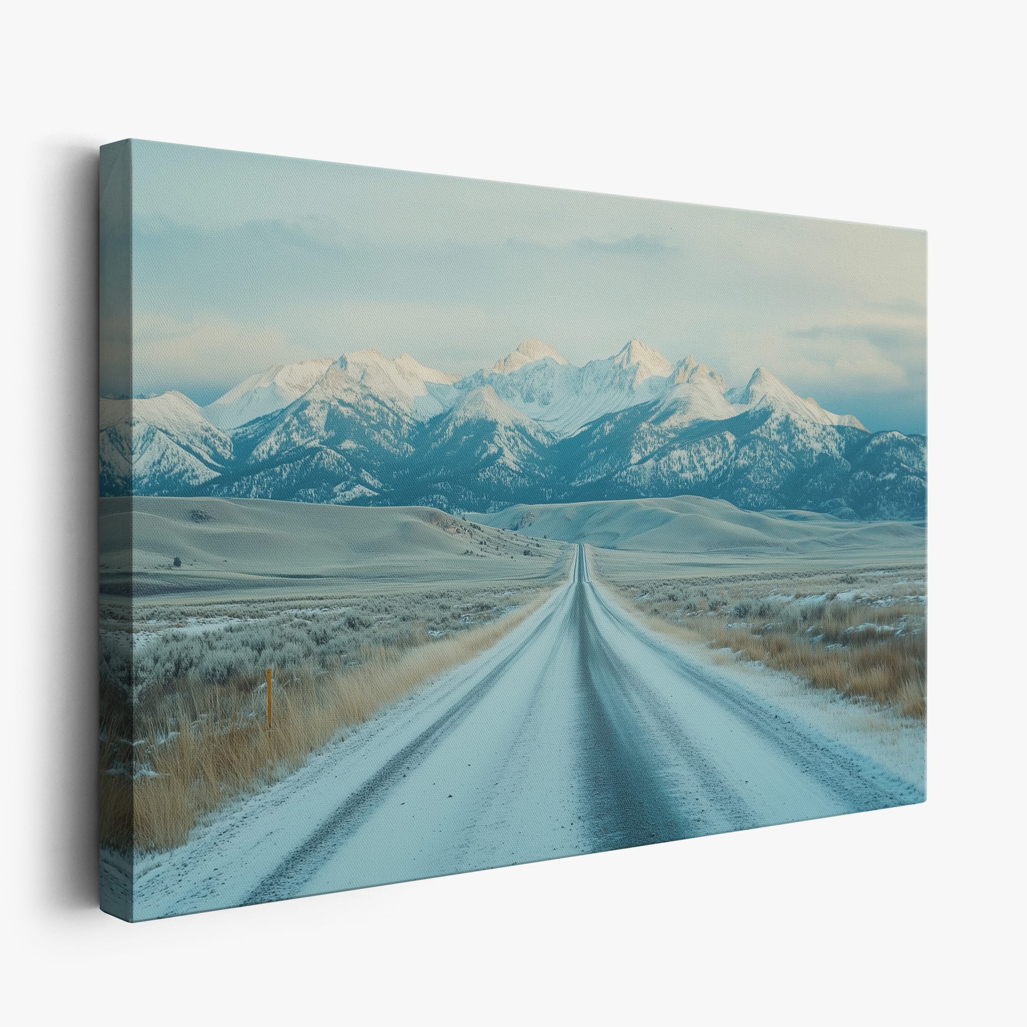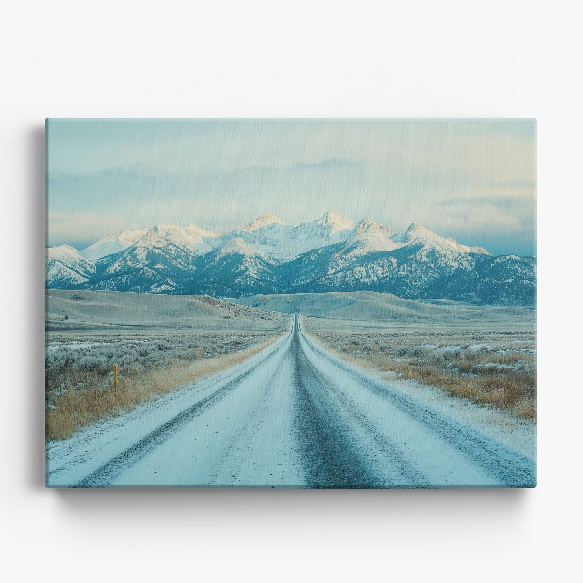 This captivating piece of digital photography captures a serene winter scene, showcasing an endless road that leads to majestic, snowy mountains. The cool blues and whites blend seamlessly, emphasizing the quiet beauty of the landscape. With minimalist elements highlighting vast open spaces and snow-covered terrain, this artwork beckons the viewer to experience the tranquility of winter. Perfect for those who appreciate landscape and minimalist art styles, this print will bring a touch of peaceful wilderness into your home or office.