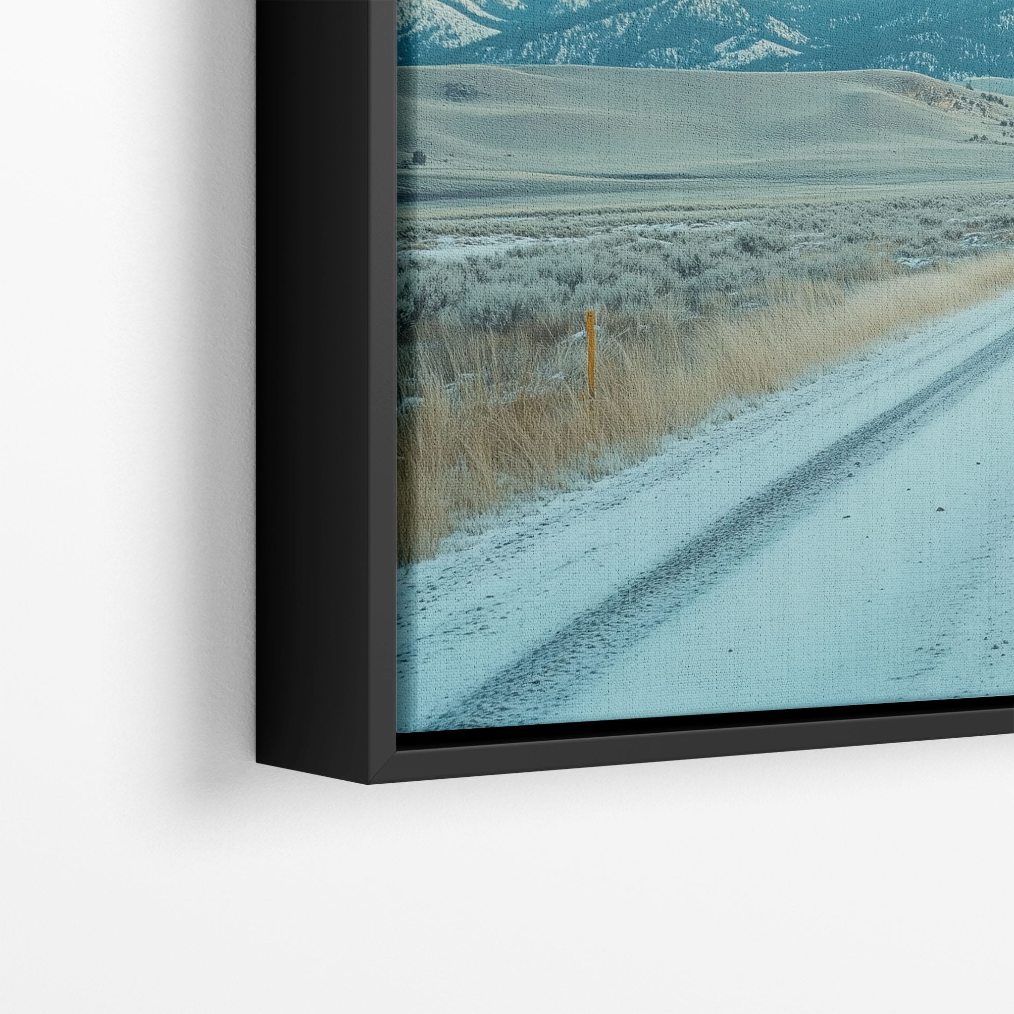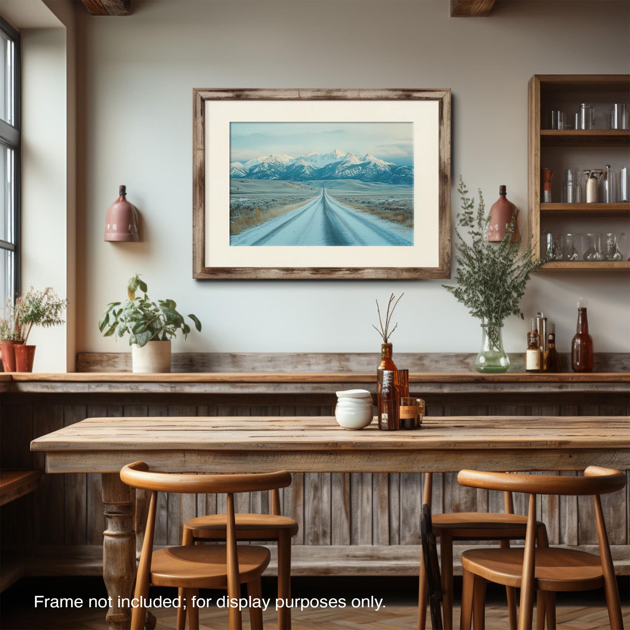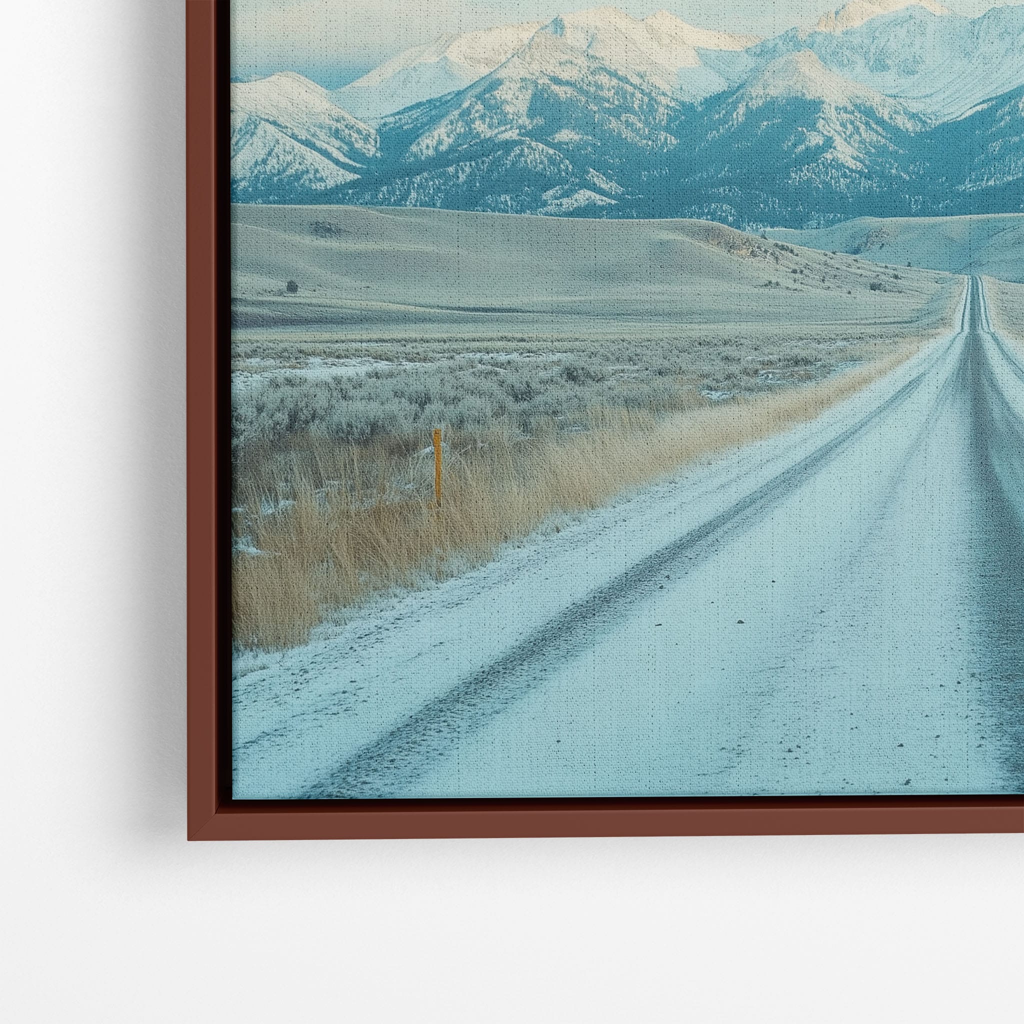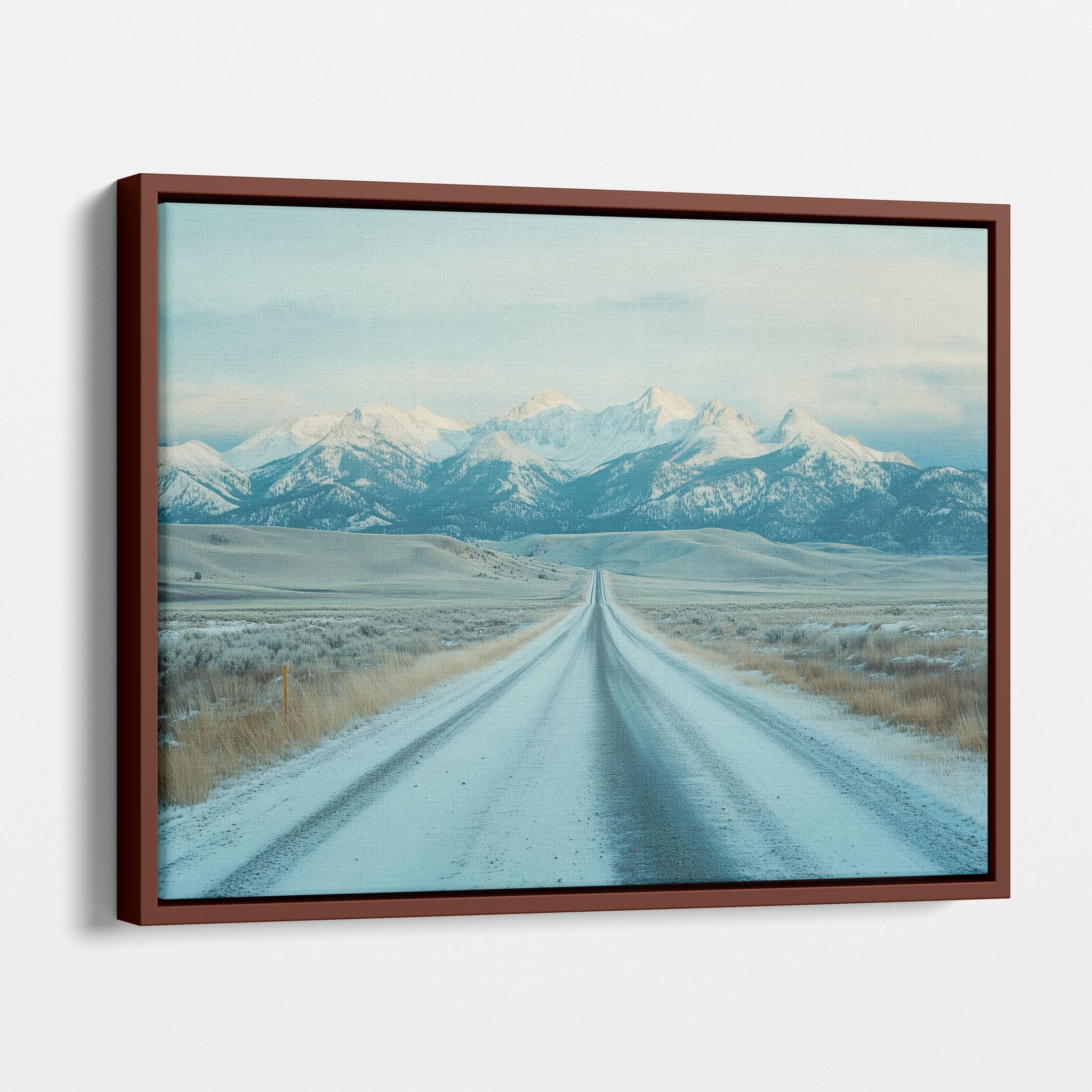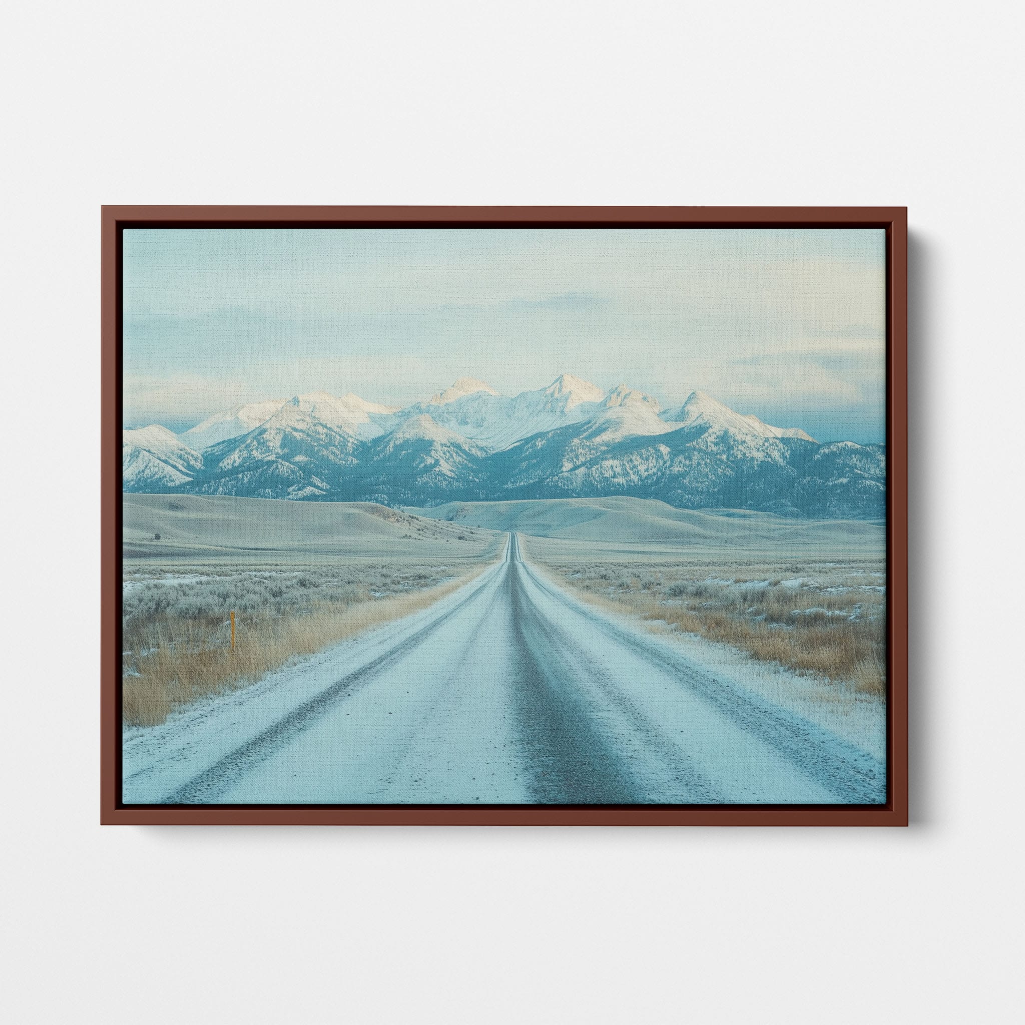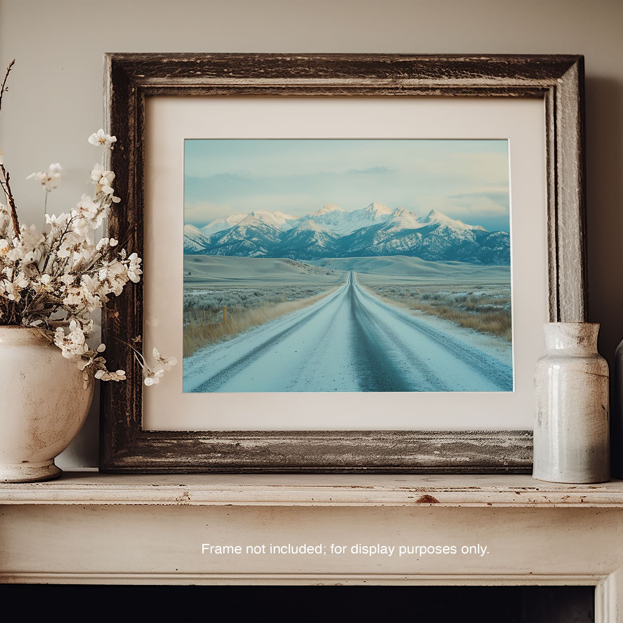 This captivating piece of digital photography captures a serene winter scene, showcasing an endless road that leads to majestic, snowy mountains. The cool blues and whites blend seamlessly, emphasizing the quiet beauty of the landscape. With minimalist elements highlighting vast open spaces and snow-covered terrain, this artwork beckons the viewer to experience the tranquility of winter. Perfect for those who appreciate landscape and minimalist art styles, this print will bring a touch of peaceful wilderness into your home or office.