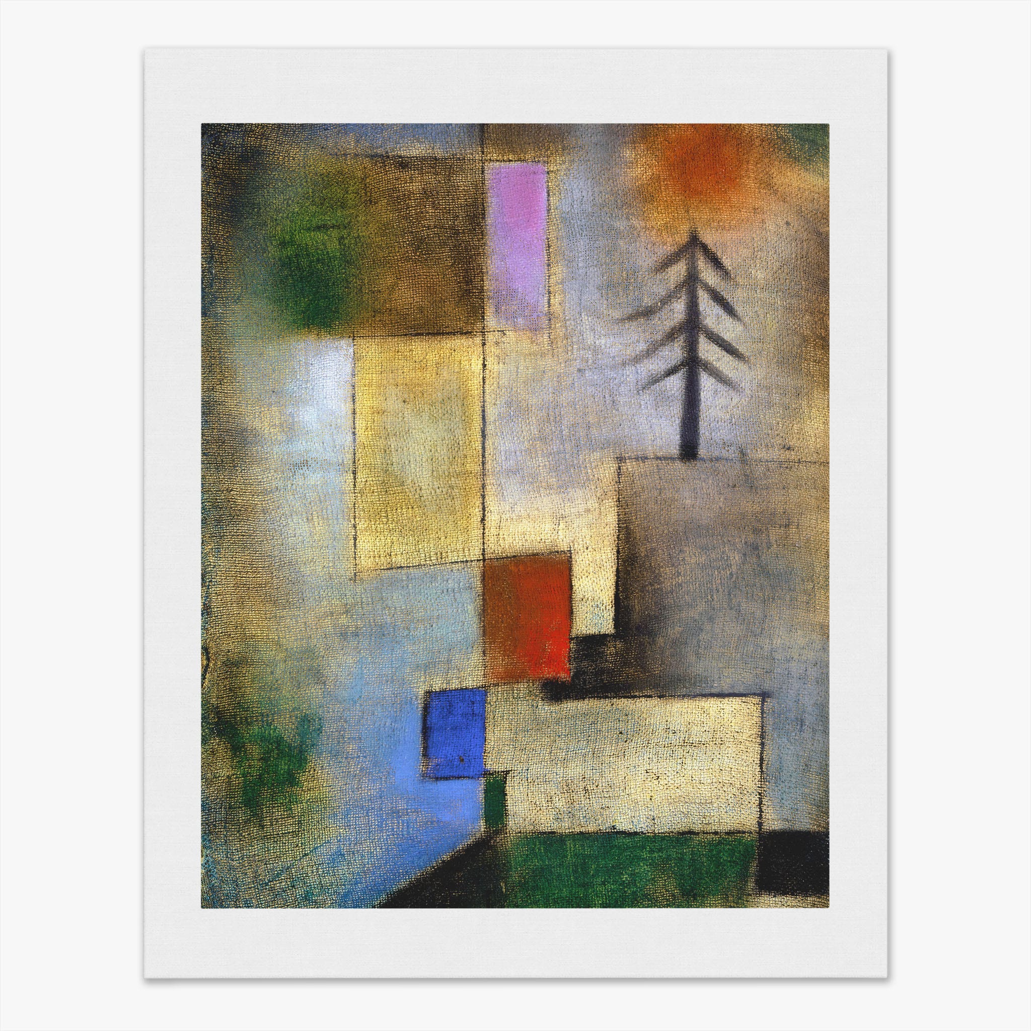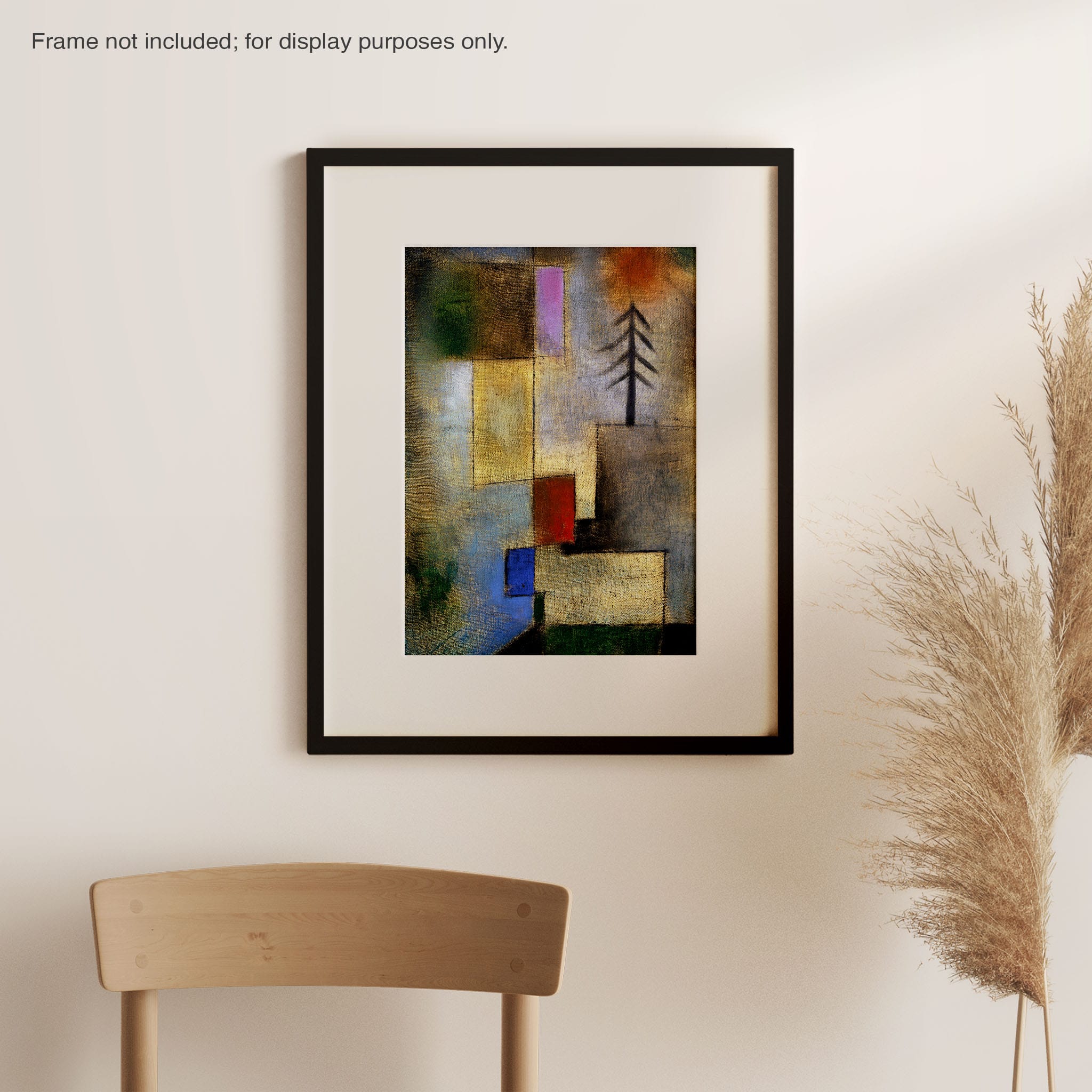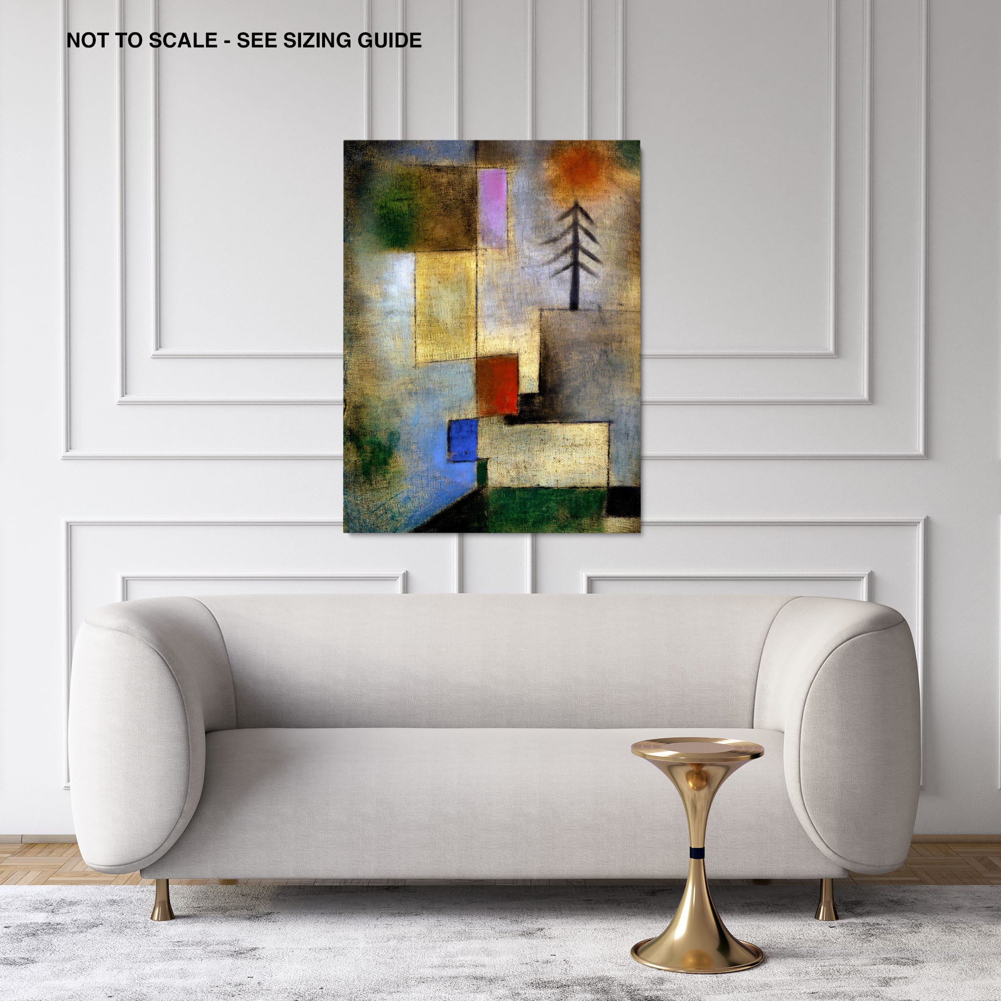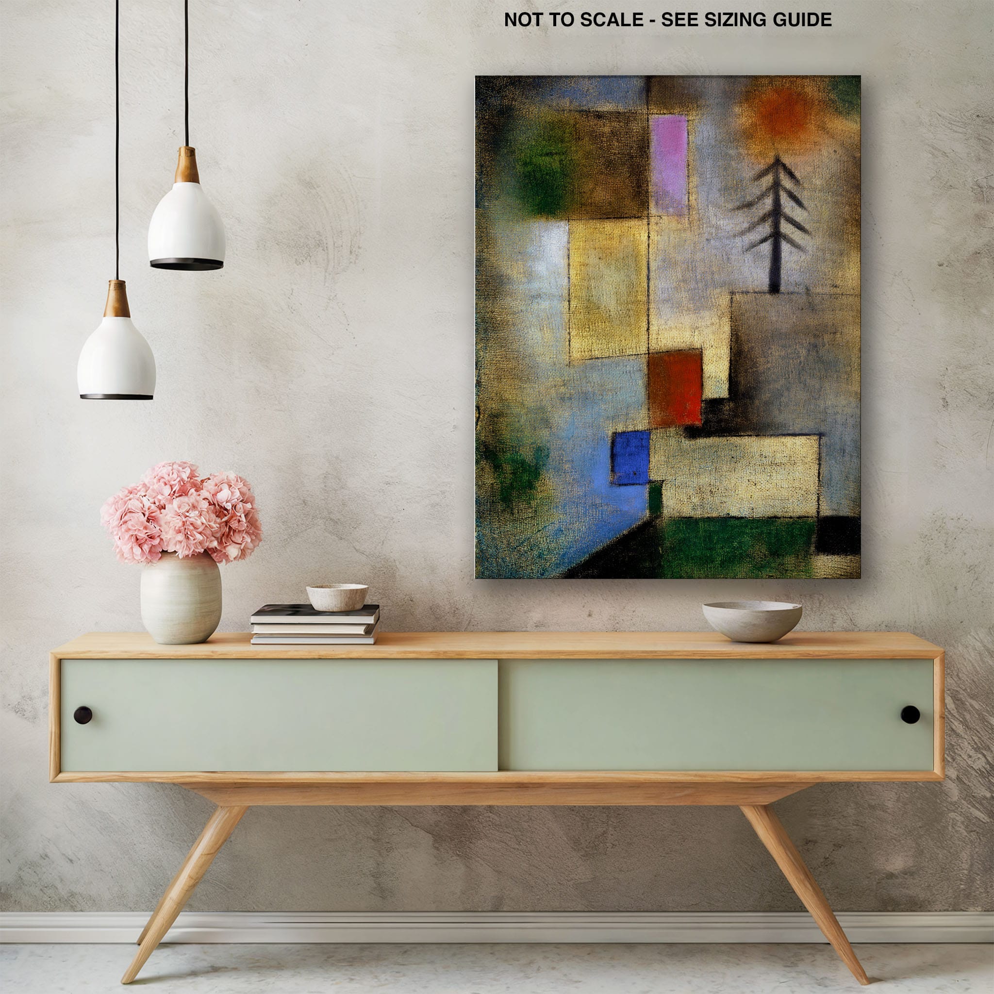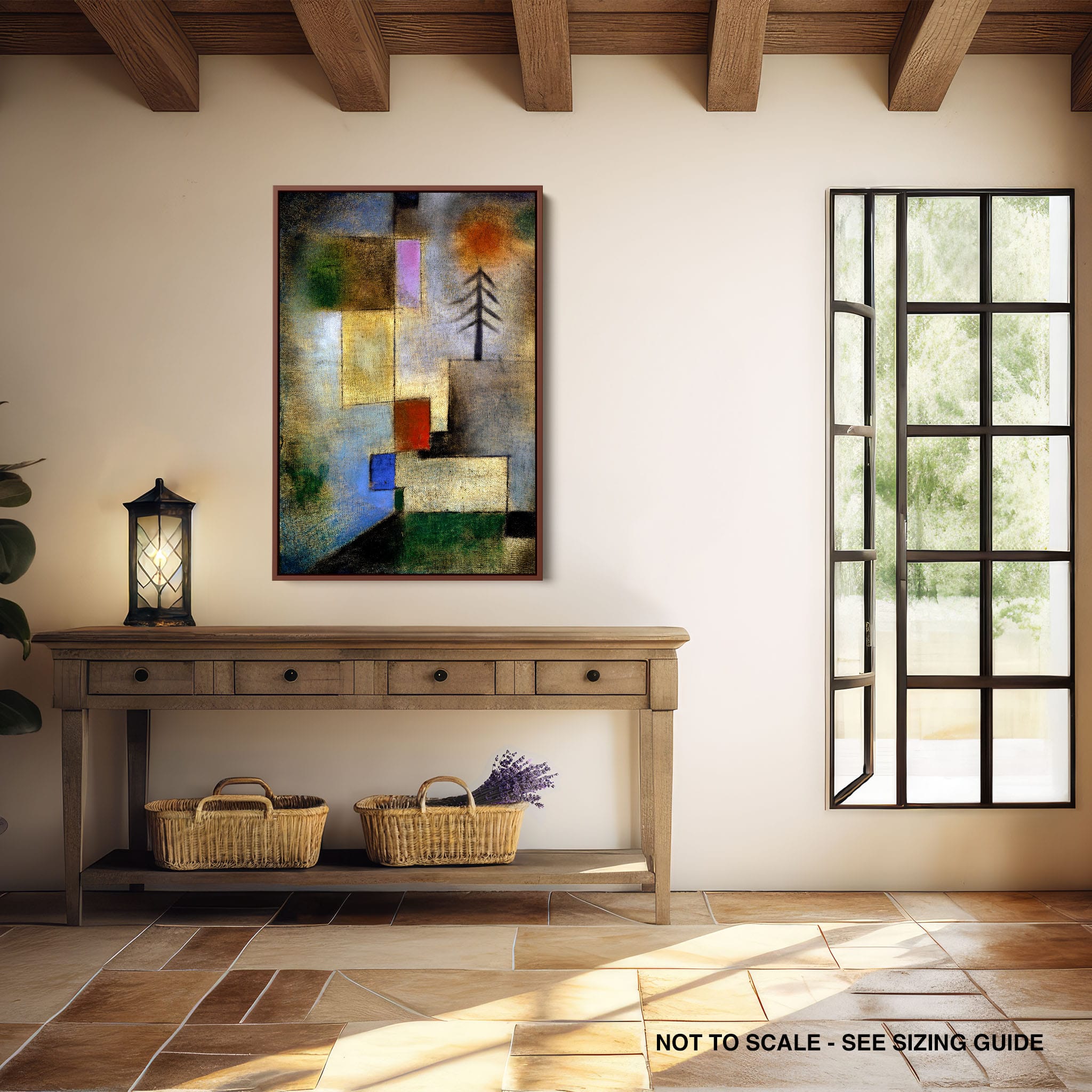 This artwork is titled "Small Fir Picture" by Paul Klee, painted in 1922. A slender fir tree stands silhouetted against a soft, dreamlike backdrop of diffused light and layered blocks. The composition interlocks warm ochres, violets, blues, and forest greens, rendered with a hazy, textured quality that merges geometry with atmosphere. The sun, a glowing orange orb, radiates subtly from the upper corner, adding warmth to the ethereal space. Klee’s precise arrangement of shapes evokes architectural forms, while the tree introduces a symbolic natural element. This fine art reproduction, made from a high-resolution image of the original, provides a serene yet structured presence ideal for modern and abstract art admirers.