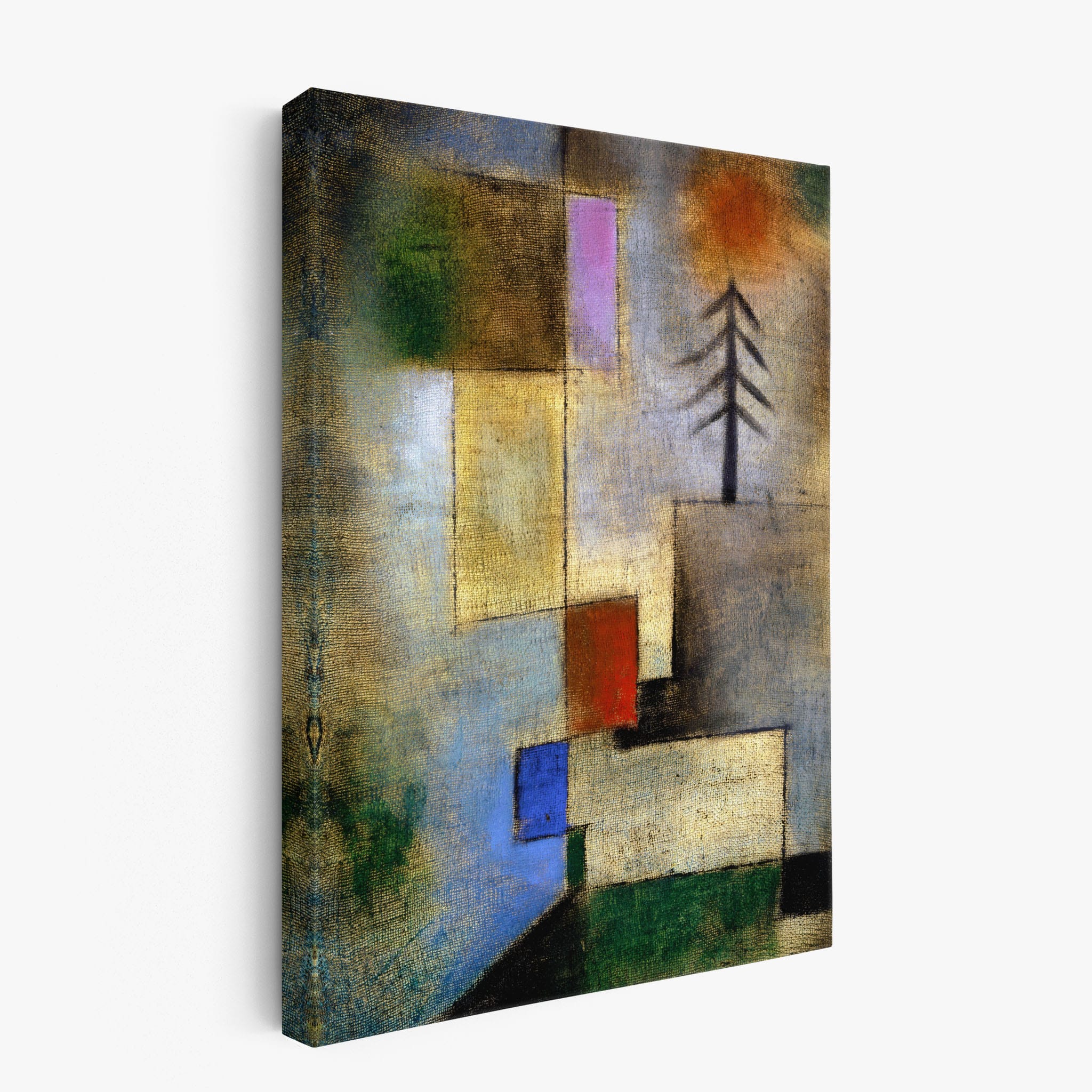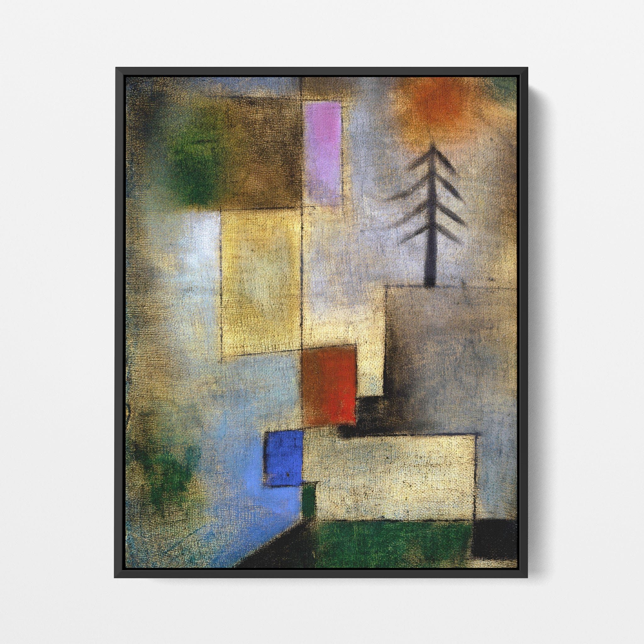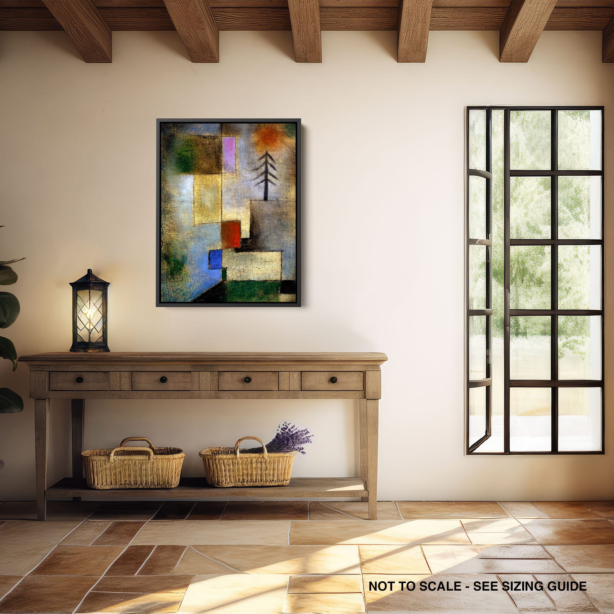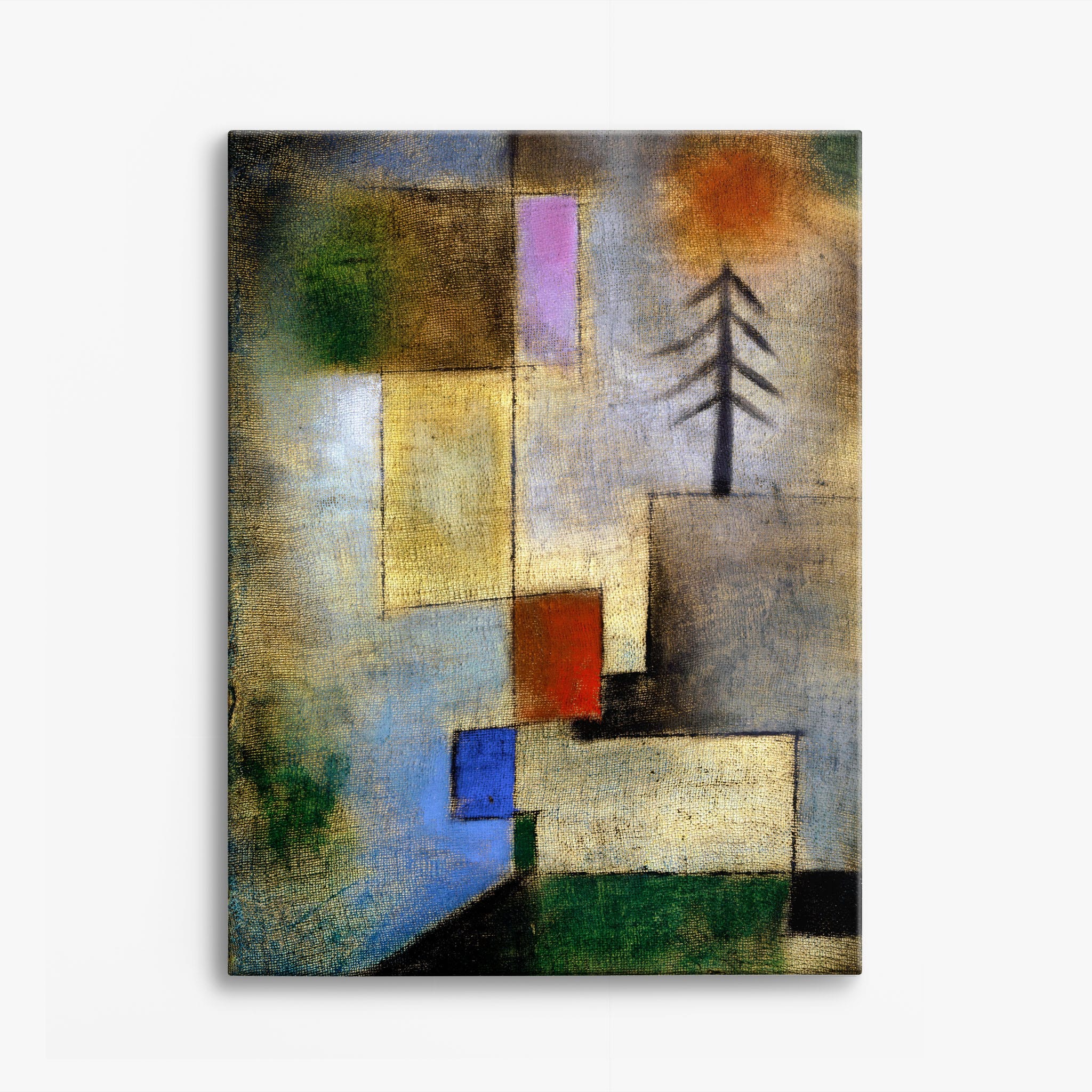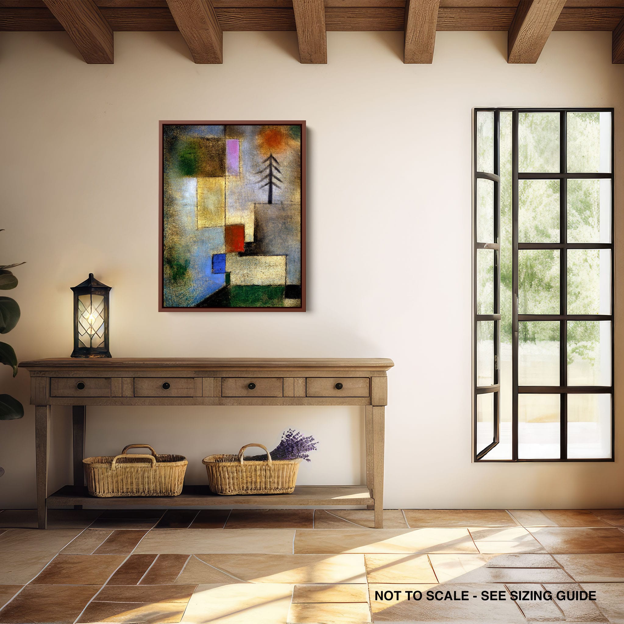 This artwork is titled "Small Fir Picture" by Paul Klee, painted in 1922. A slender fir tree stands silhouetted against a soft, dreamlike backdrop of diffused light and layered blocks. The composition interlocks warm ochres, violets, blues, and forest greens, rendered with a hazy, textured quality that merges geometry with atmosphere. The sun, a glowing orange orb, radiates subtly from the upper corner, adding warmth to the ethereal space. Klee’s precise arrangement of shapes evokes architectural forms, while the tree introduces a symbolic natural element. This fine art reproduction, made from a high-resolution image of the original, provides a serene yet structured presence ideal for modern and abstract art admirers.