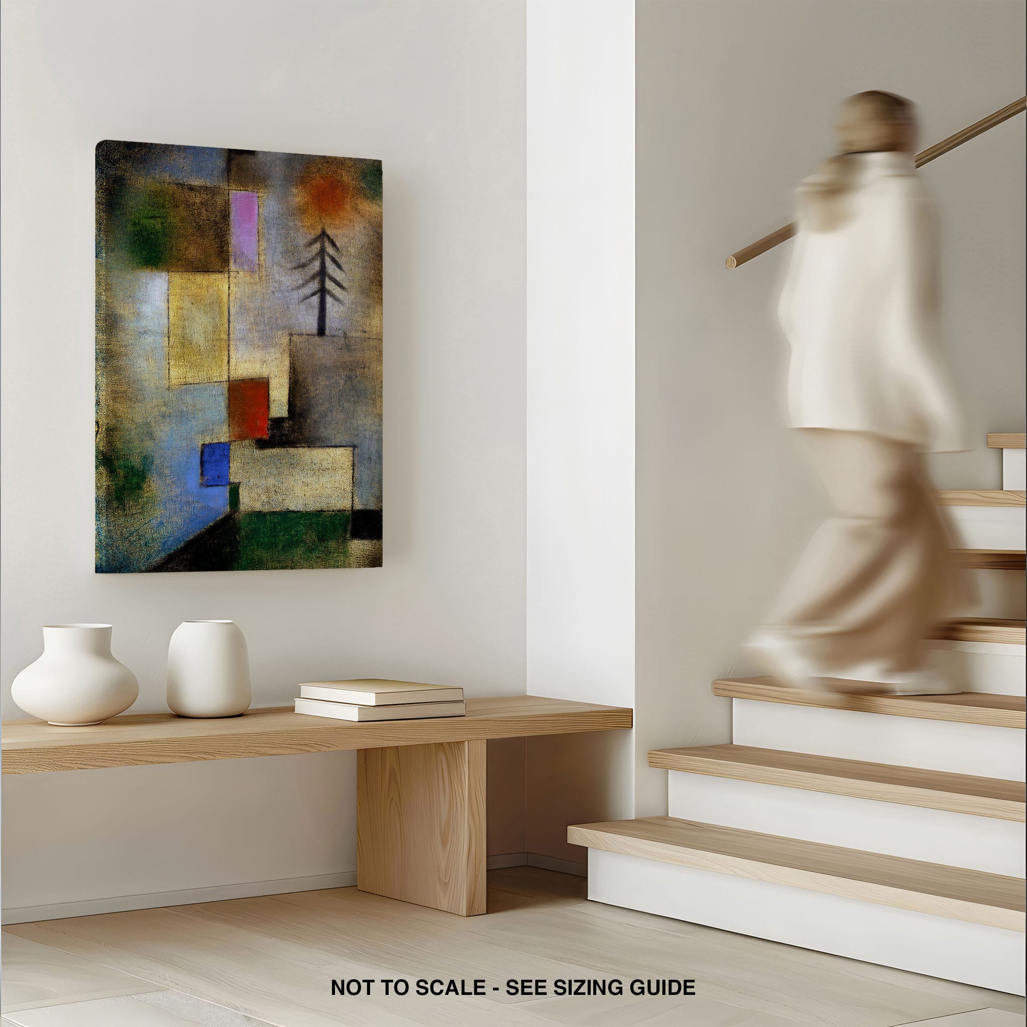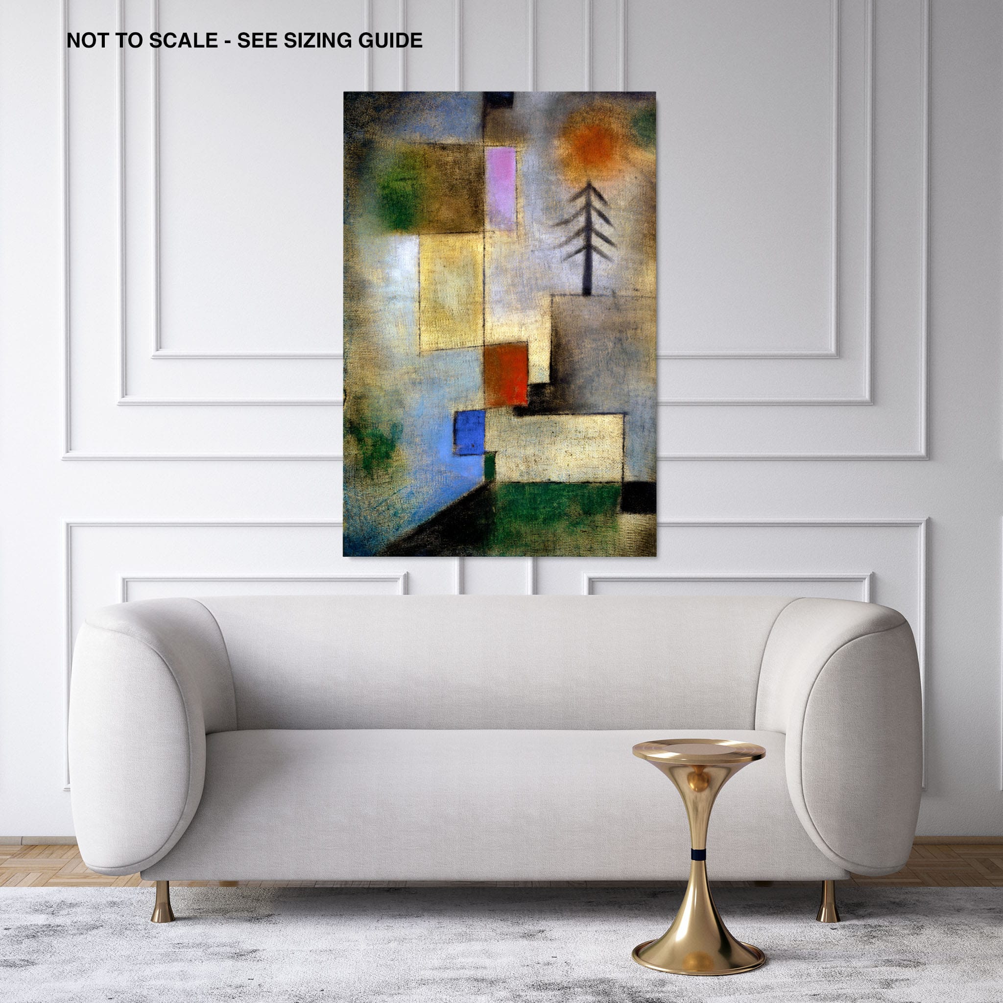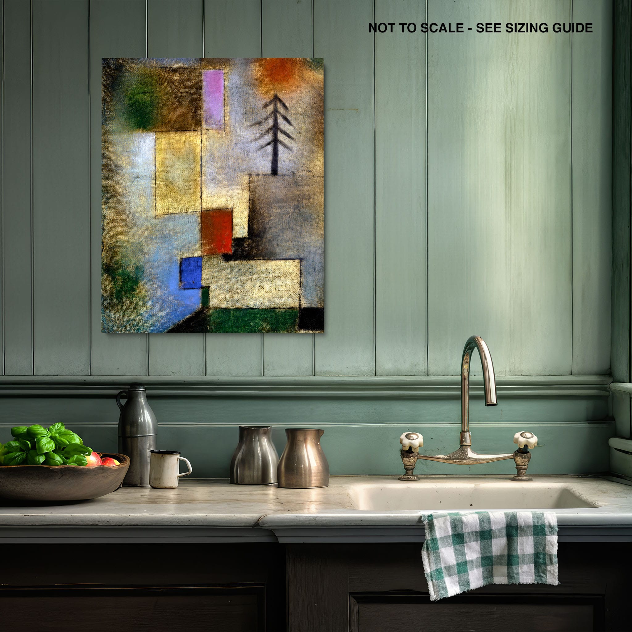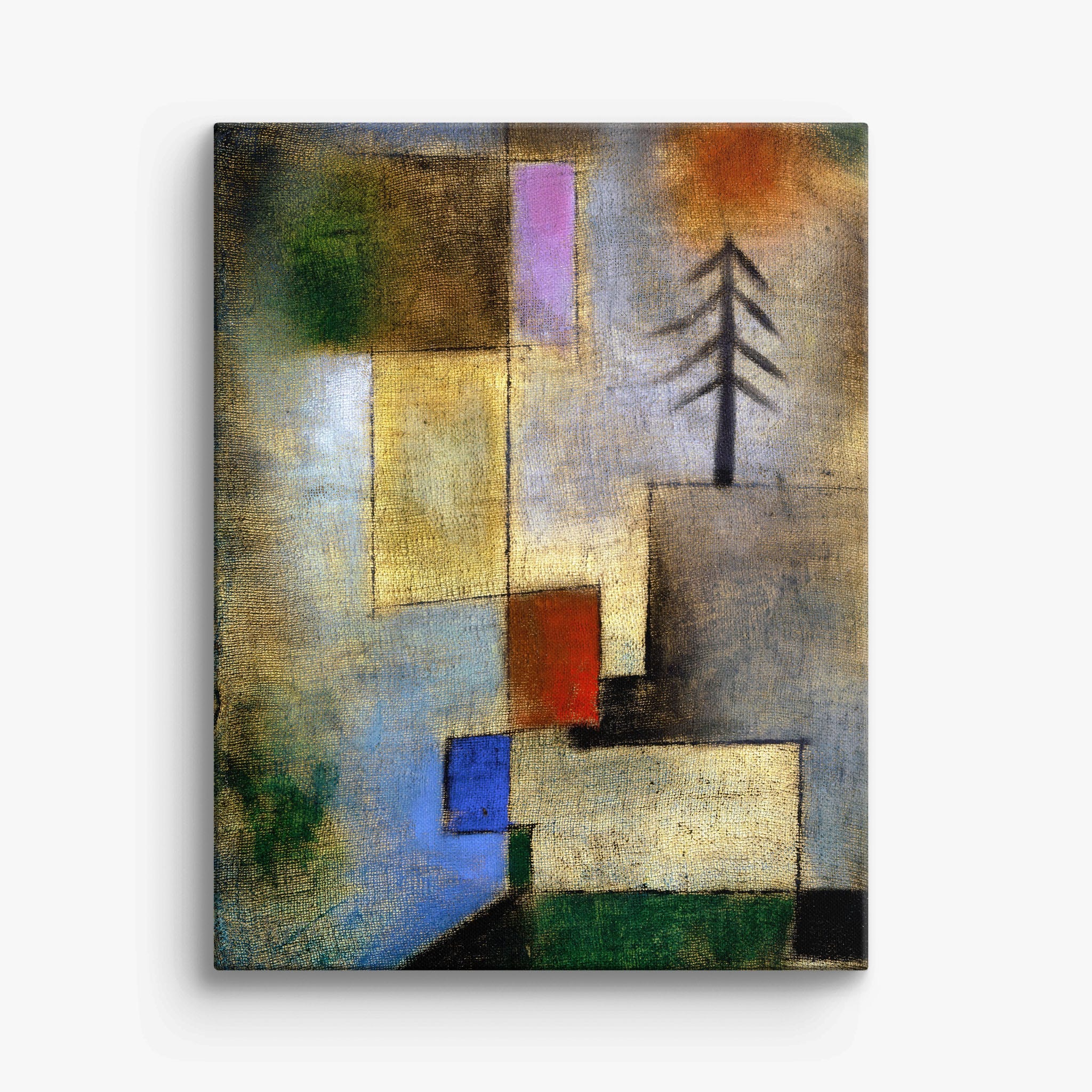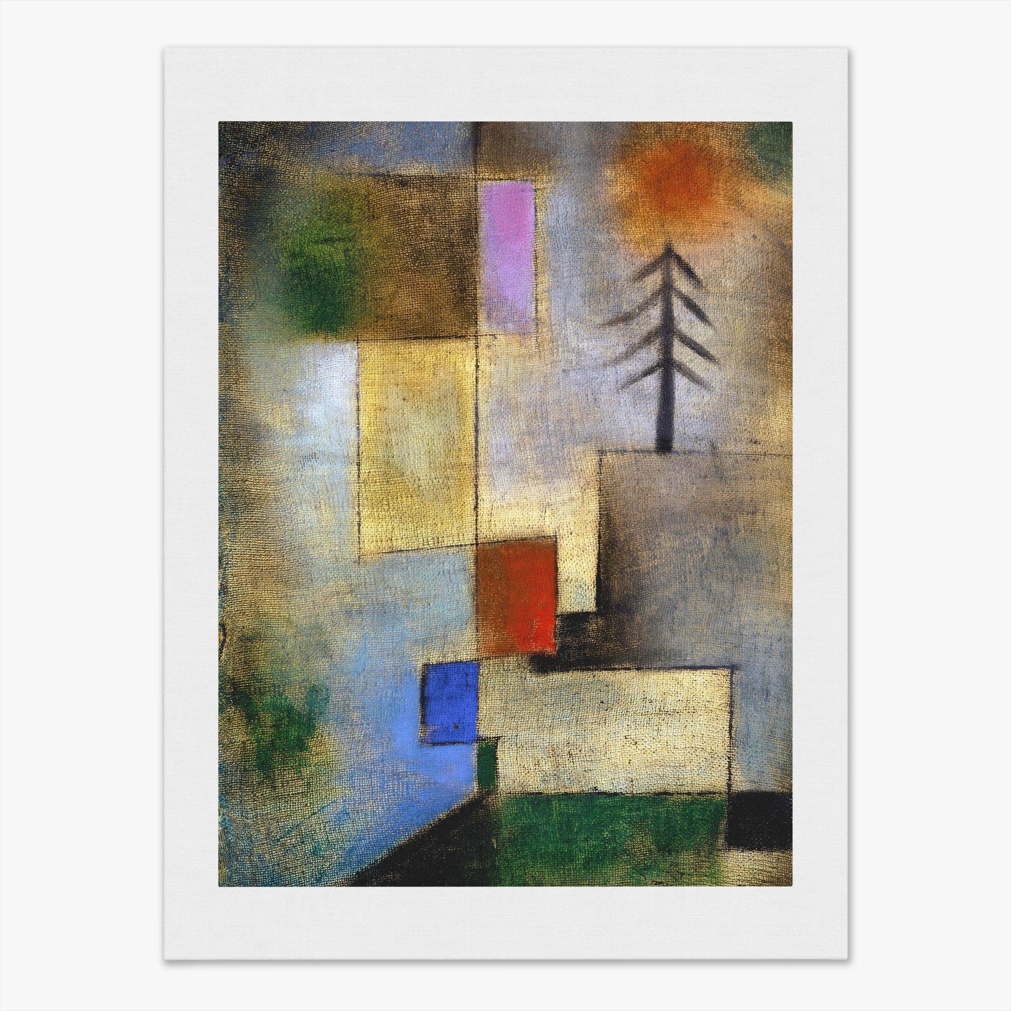 This artwork is titled "Small Fir Picture" by Paul Klee, painted in 1922. A slender fir tree stands silhouetted against a soft, dreamlike backdrop of diffused light and layered blocks. The composition interlocks warm ochres, violets, blues, and forest greens, rendered with a hazy, textured quality that merges geometry with atmosphere. The sun, a glowing orange orb, radiates subtly from the upper corner, adding warmth to the ethereal space. Klee’s precise arrangement of shapes evokes architectural forms, while the tree introduces a symbolic natural element. This fine art reproduction, made from a high-resolution image of the original, provides a serene yet structured presence ideal for modern and abstract art admirers.