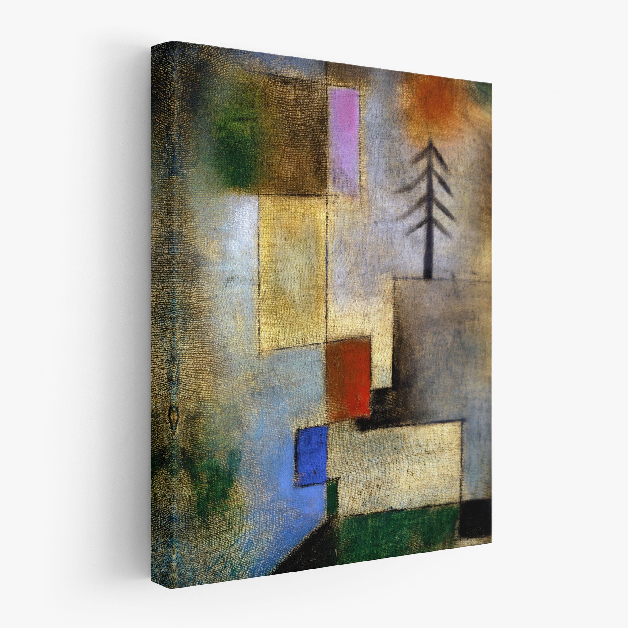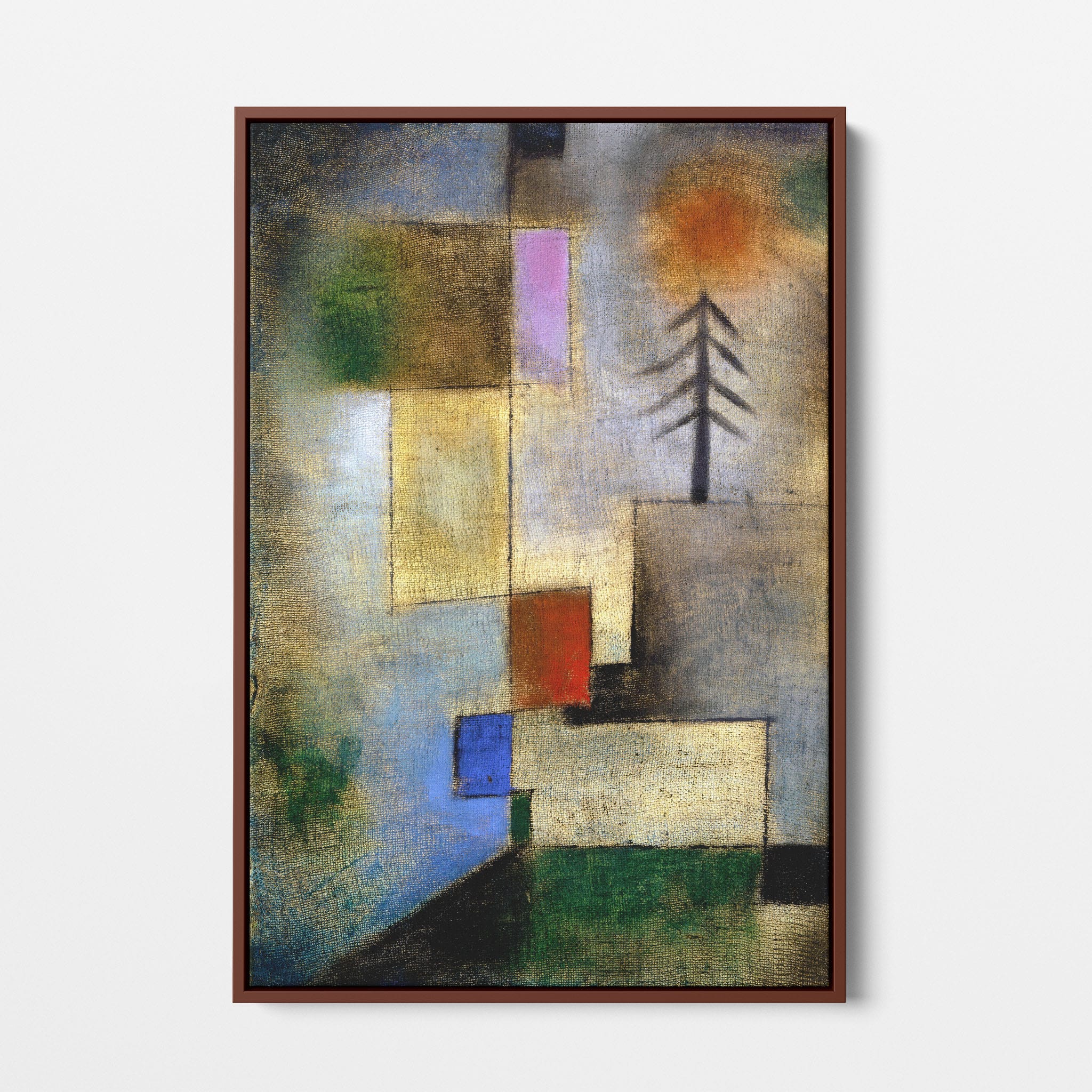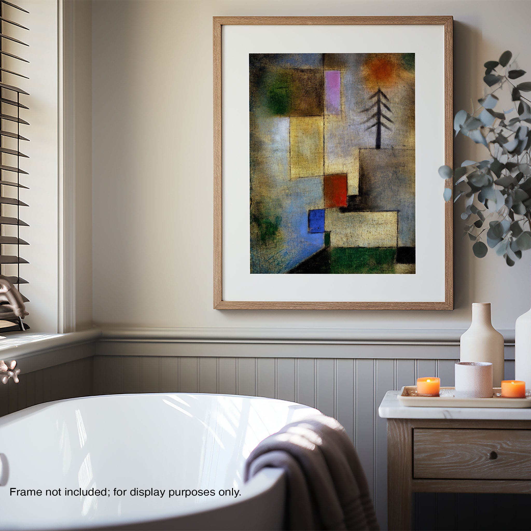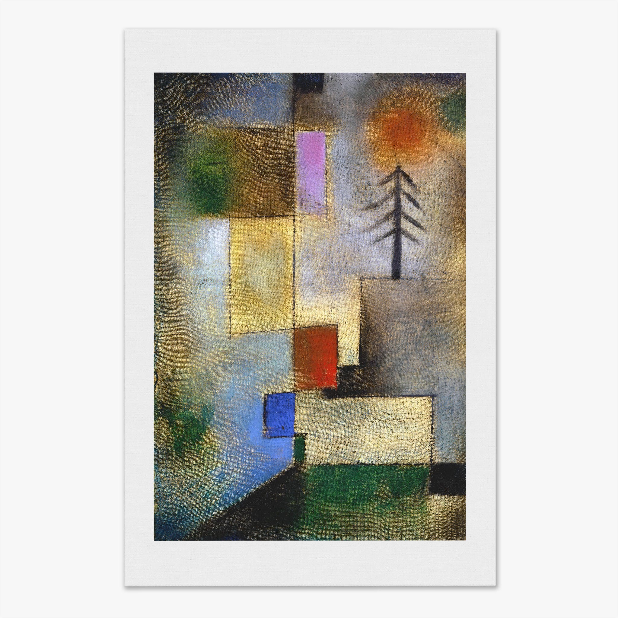 This artwork is titled "Small Fir Picture" by Paul Klee, painted in 1922. A slender fir tree stands silhouetted against a soft, dreamlike backdrop of diffused light and layered blocks. The composition interlocks warm ochres, violets, blues, and forest greens, rendered with a hazy, textured quality that merges geometry with atmosphere. The sun, a glowing orange orb, radiates subtly from the upper corner, adding warmth to the ethereal space. Klee’s precise arrangement of shapes evokes architectural forms, while the tree introduces a symbolic natural element. This fine art reproduction, made from a high-resolution image of the original, provides a serene yet structured presence ideal for modern and abstract art admirers.