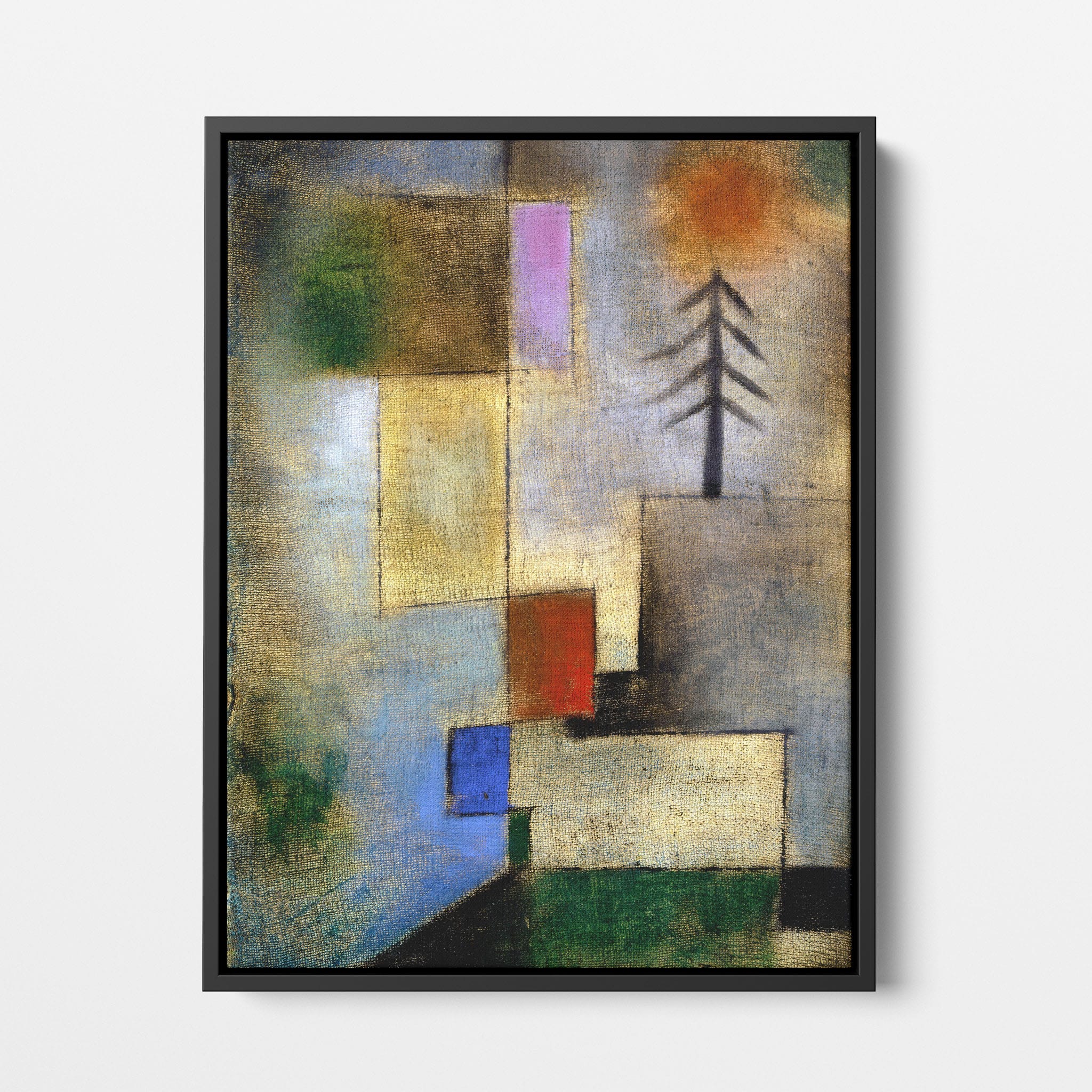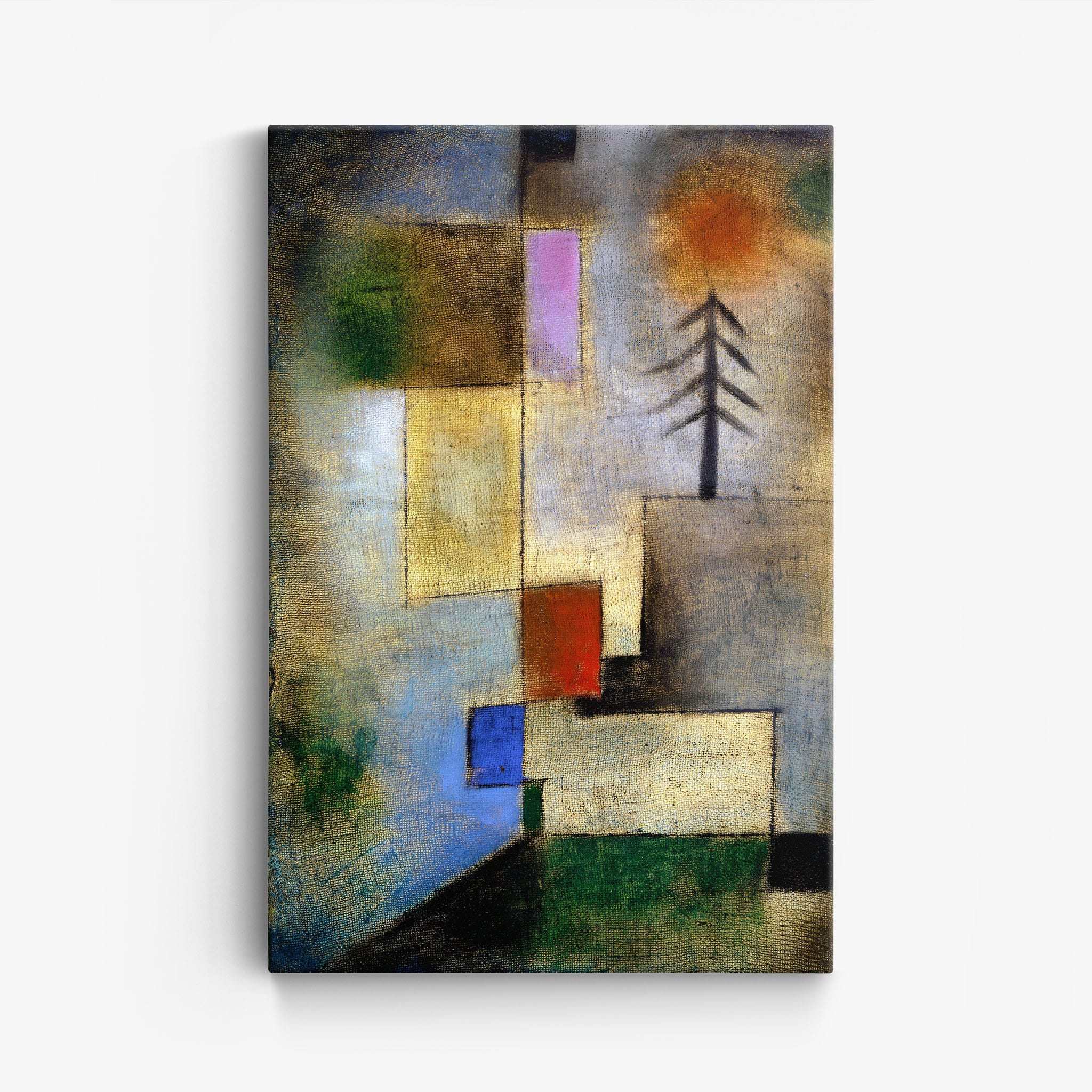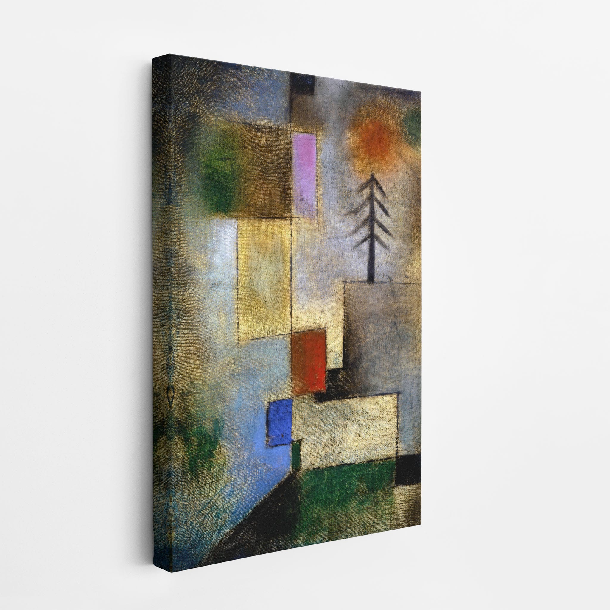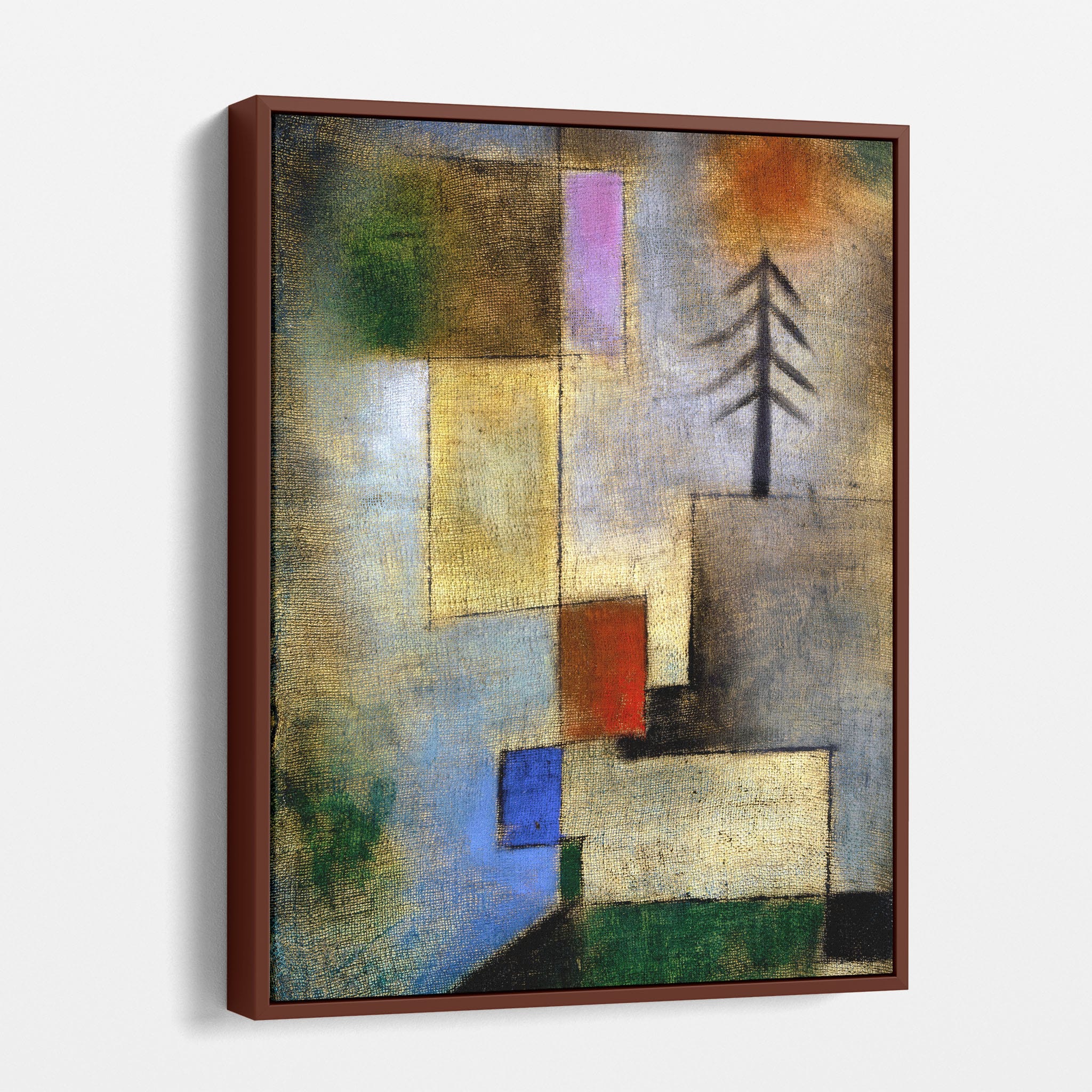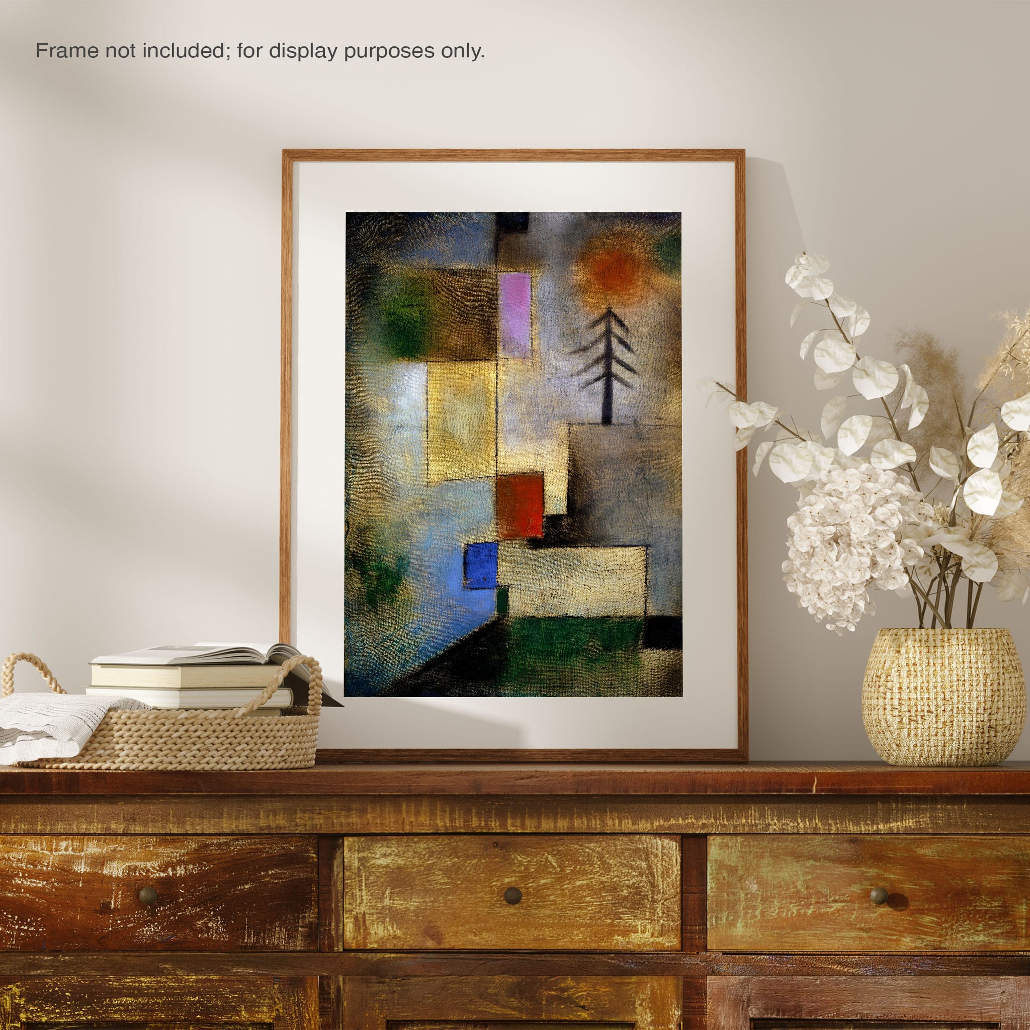 This artwork is titled "Small Fir Picture" by Paul Klee, painted in 1922. A slender fir tree stands silhouetted against a soft, dreamlike backdrop of diffused light and layered blocks. The composition interlocks warm ochres, violets, blues, and forest greens, rendered with a hazy, textured quality that merges geometry with atmosphere. The sun, a glowing orange orb, radiates subtly from the upper corner, adding warmth to the ethereal space. Klee’s precise arrangement of shapes evokes architectural forms, while the tree introduces a symbolic natural element. This fine art reproduction, made from a high-resolution image of the original, provides a serene yet structured presence ideal for modern and abstract art admirers.