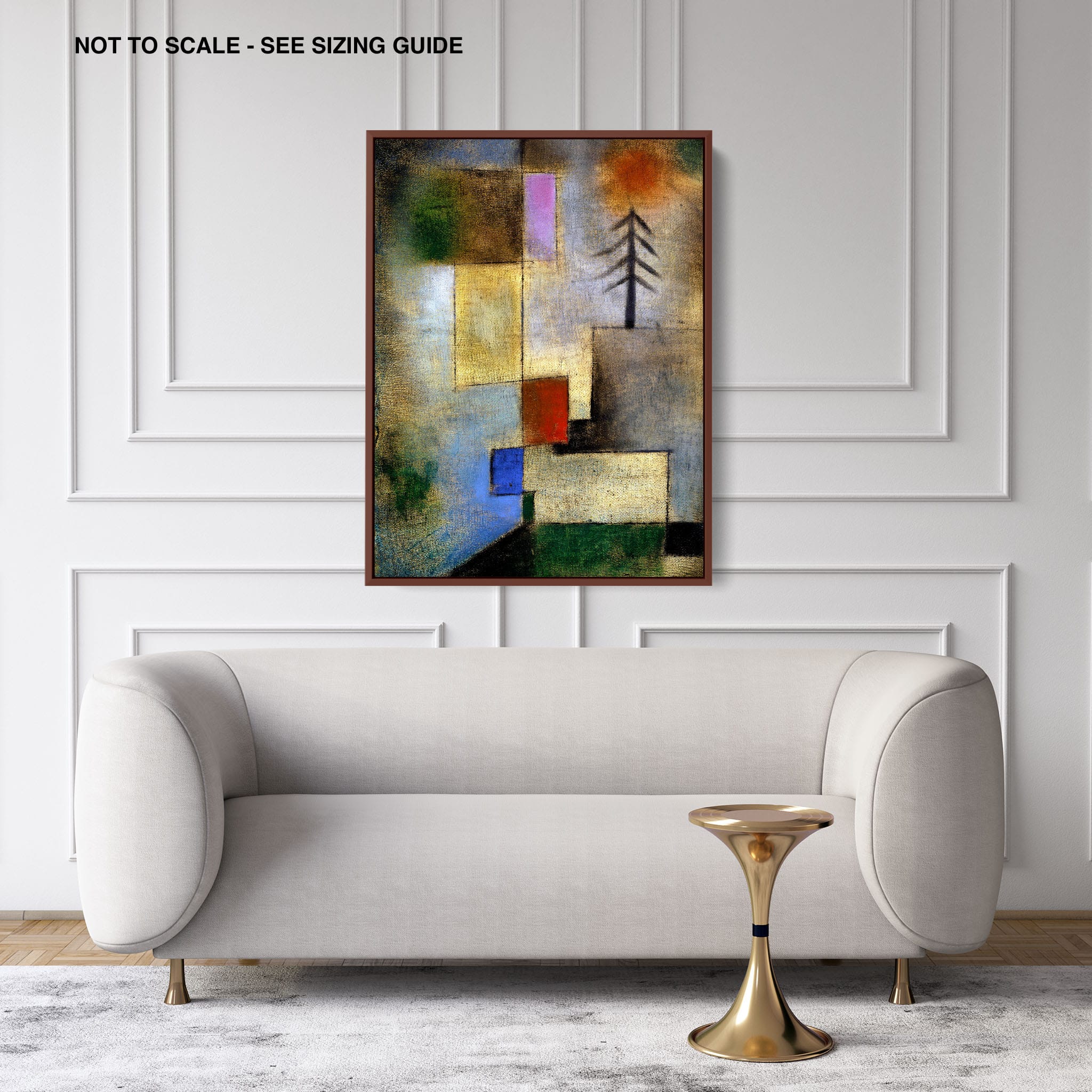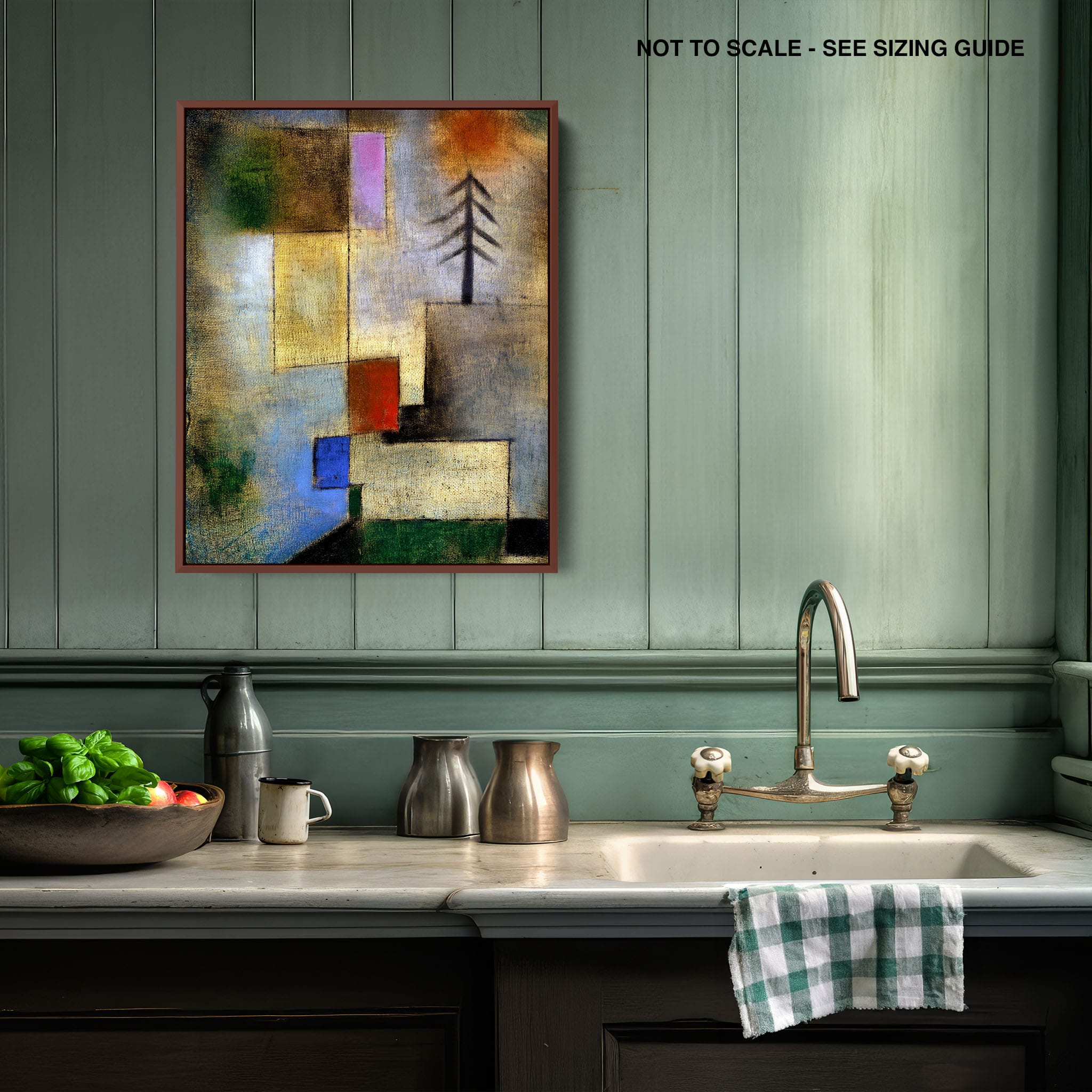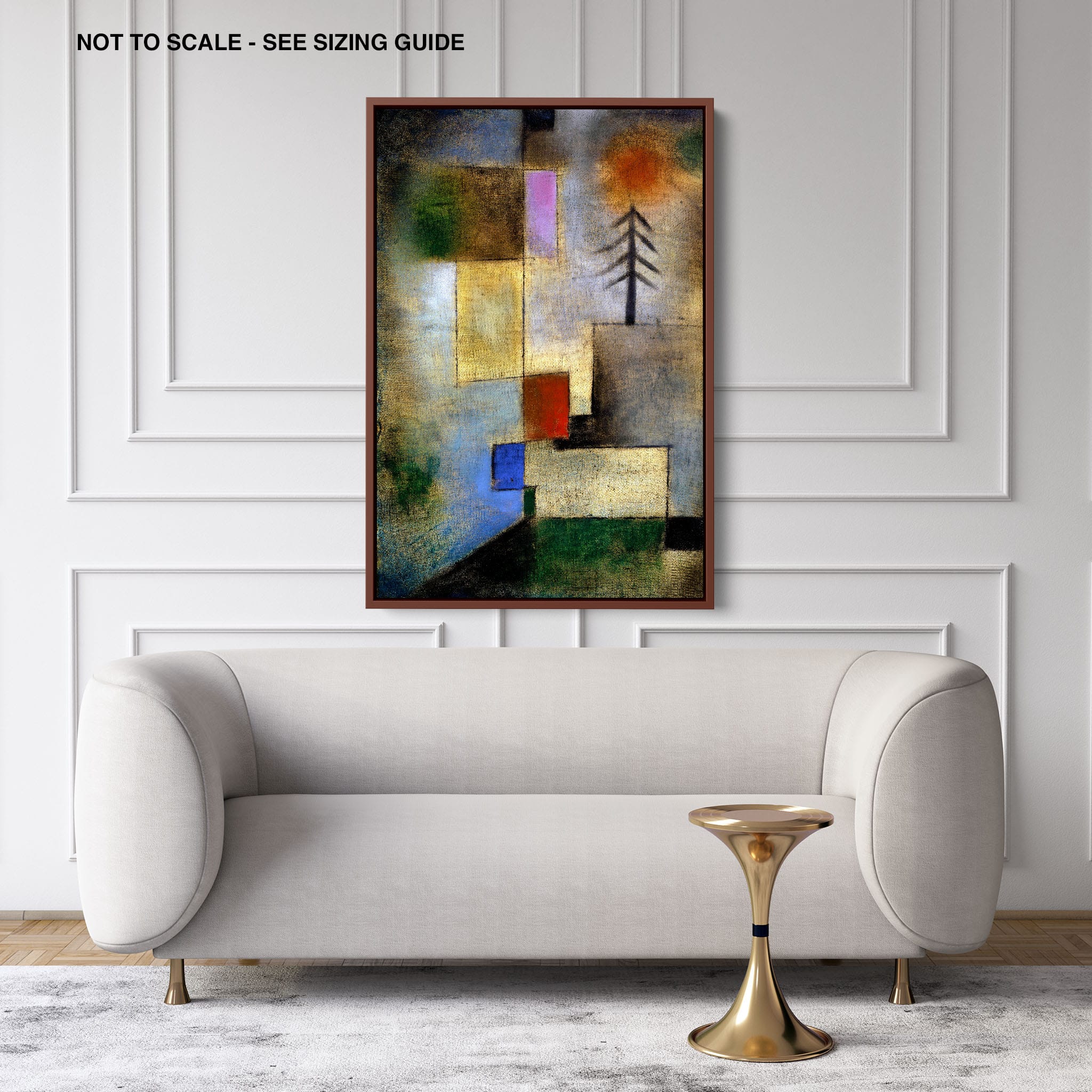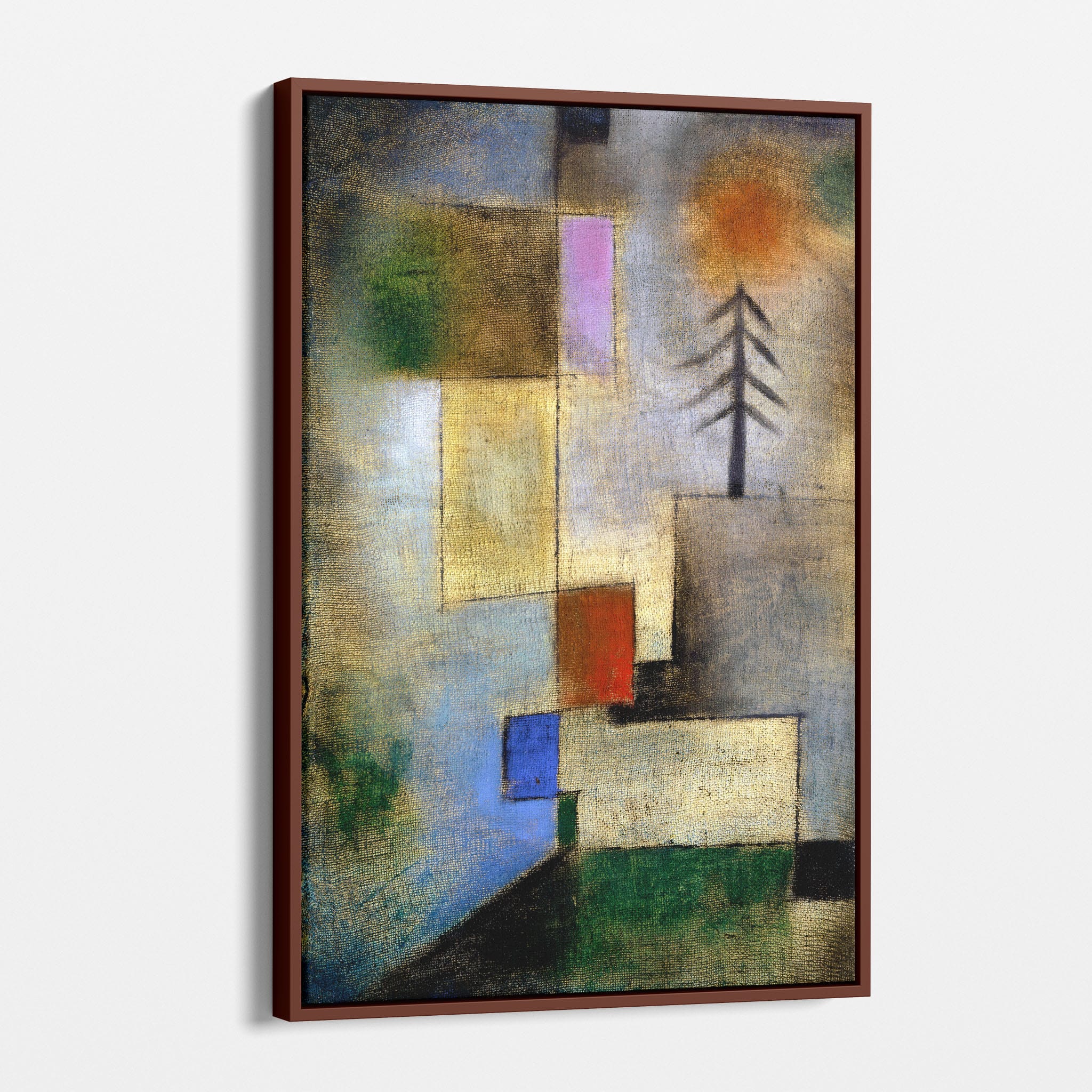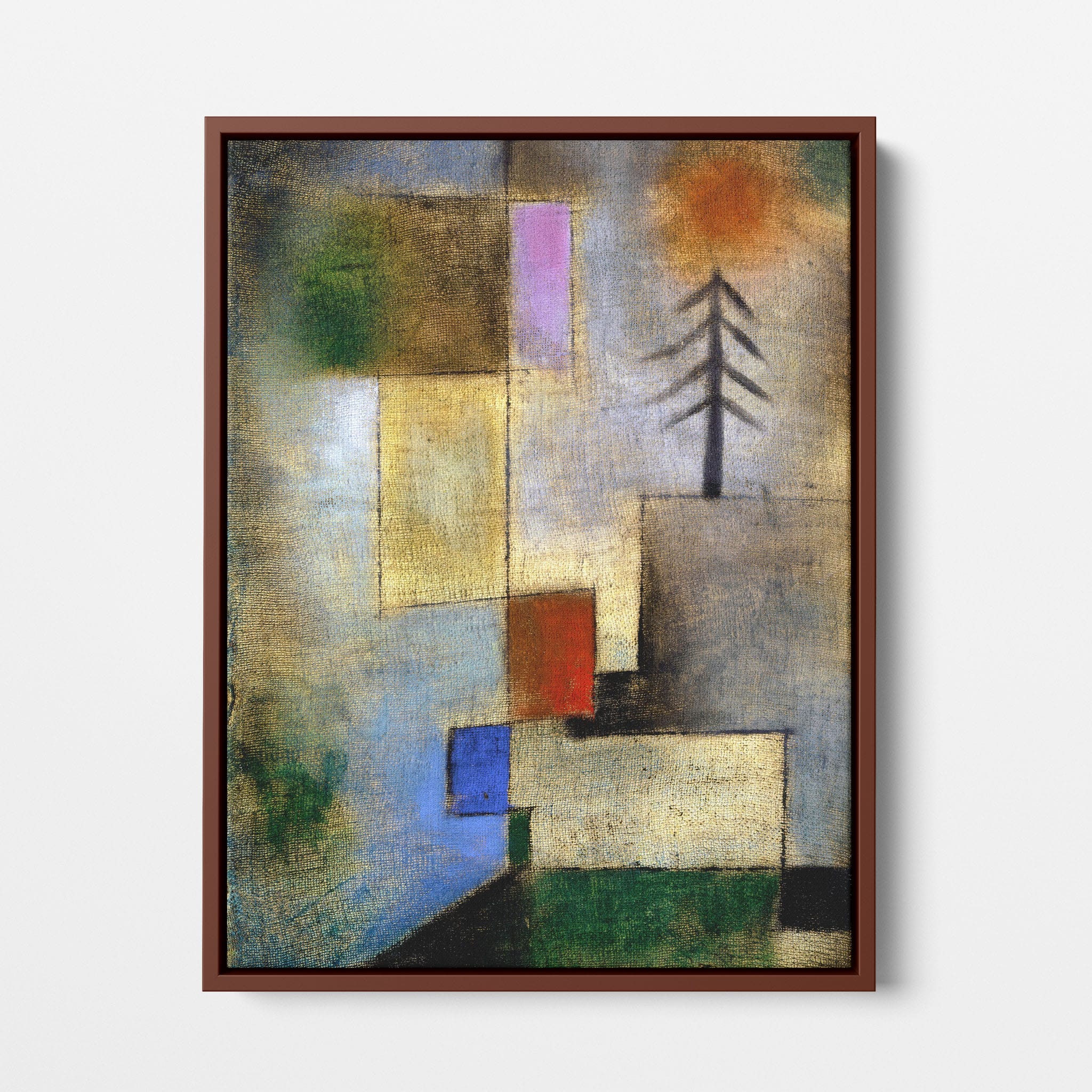 This artwork is titled "Small Fir Picture" by Paul Klee, painted in 1922. A slender fir tree stands silhouetted against a soft, dreamlike backdrop of diffused light and layered blocks. The composition interlocks warm ochres, violets, blues, and forest greens, rendered with a hazy, textured quality that merges geometry with atmosphere. The sun, a glowing orange orb, radiates subtly from the upper corner, adding warmth to the ethereal space. Klee’s precise arrangement of shapes evokes architectural forms, while the tree introduces a symbolic natural element. This fine art reproduction, made from a high-resolution image of the original, provides a serene yet structured presence ideal for modern and abstract art admirers.
