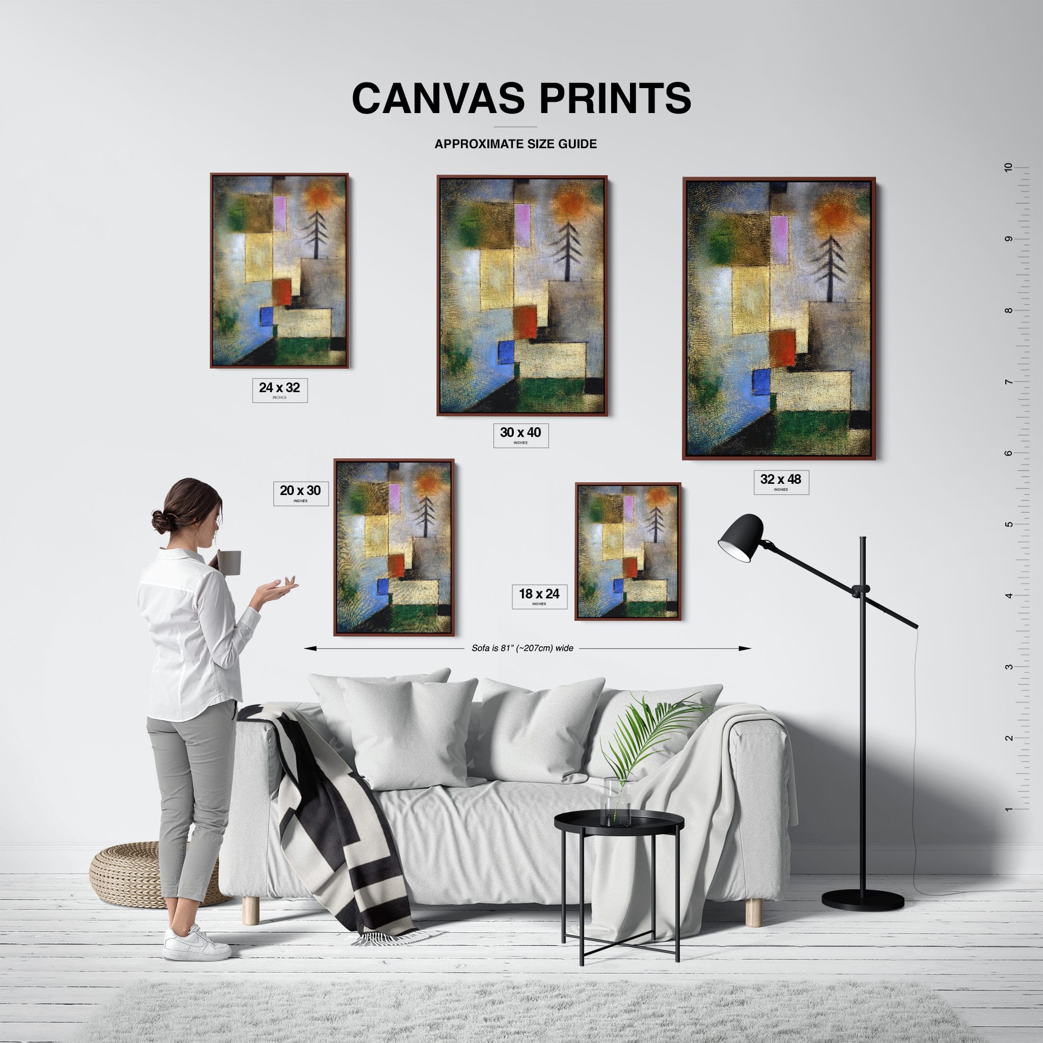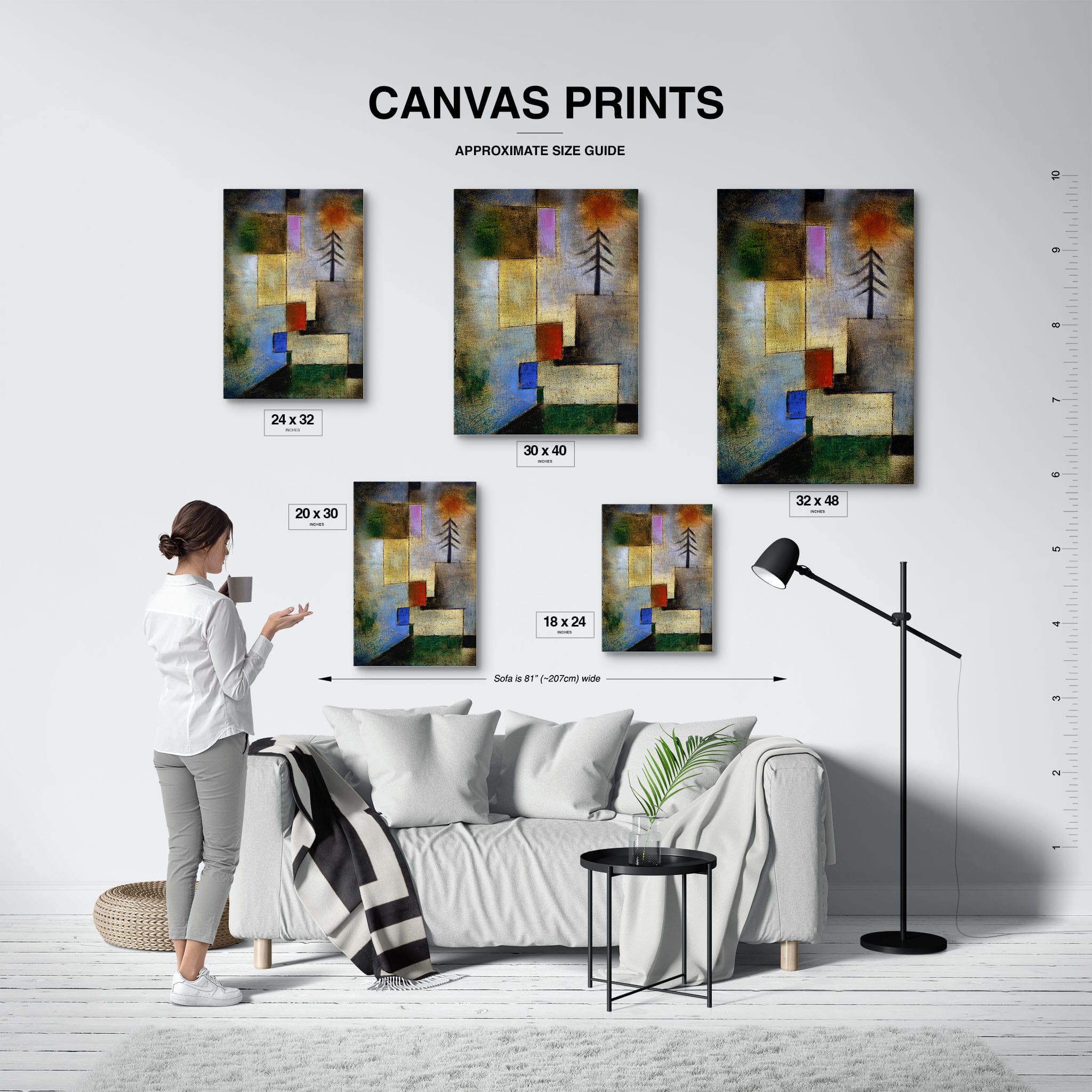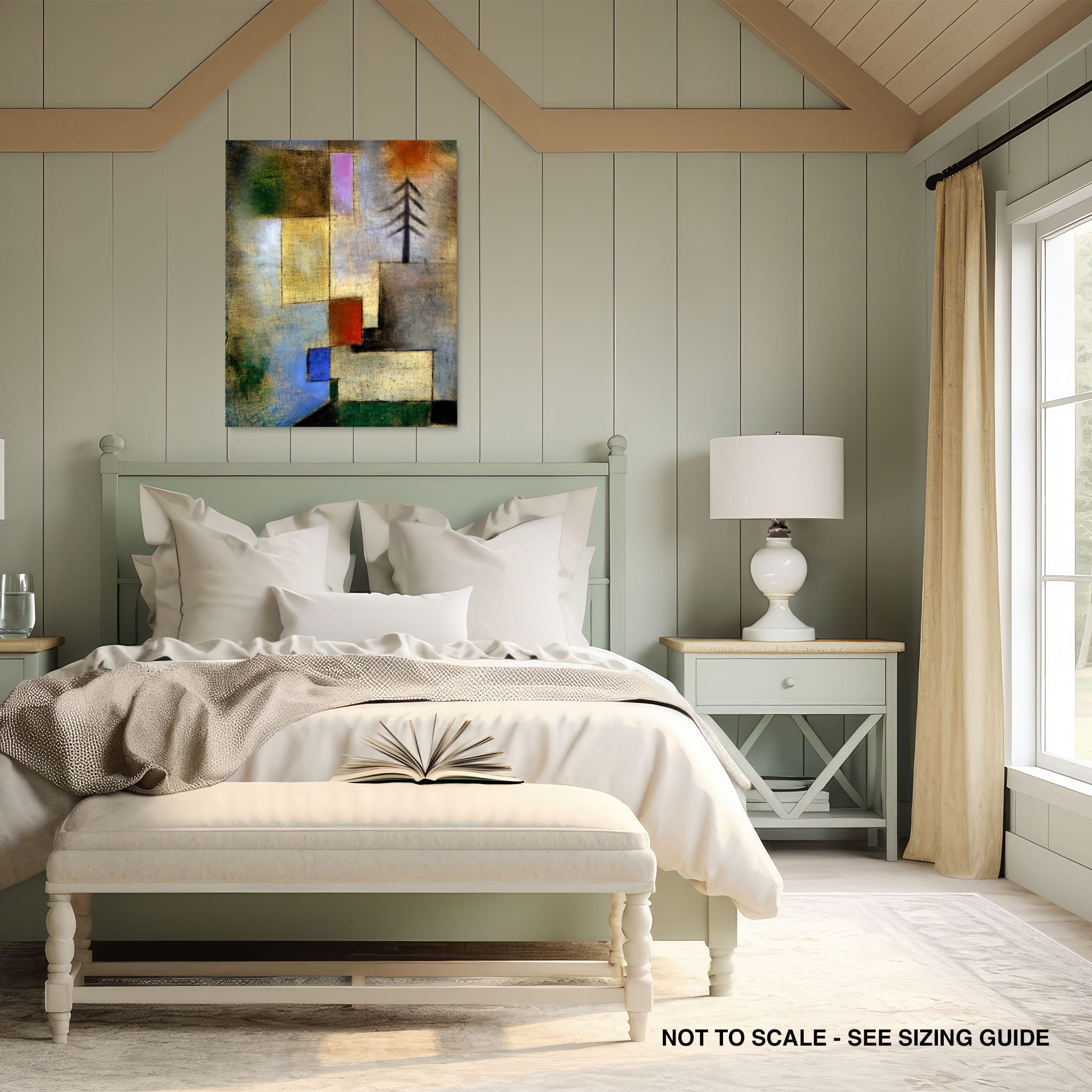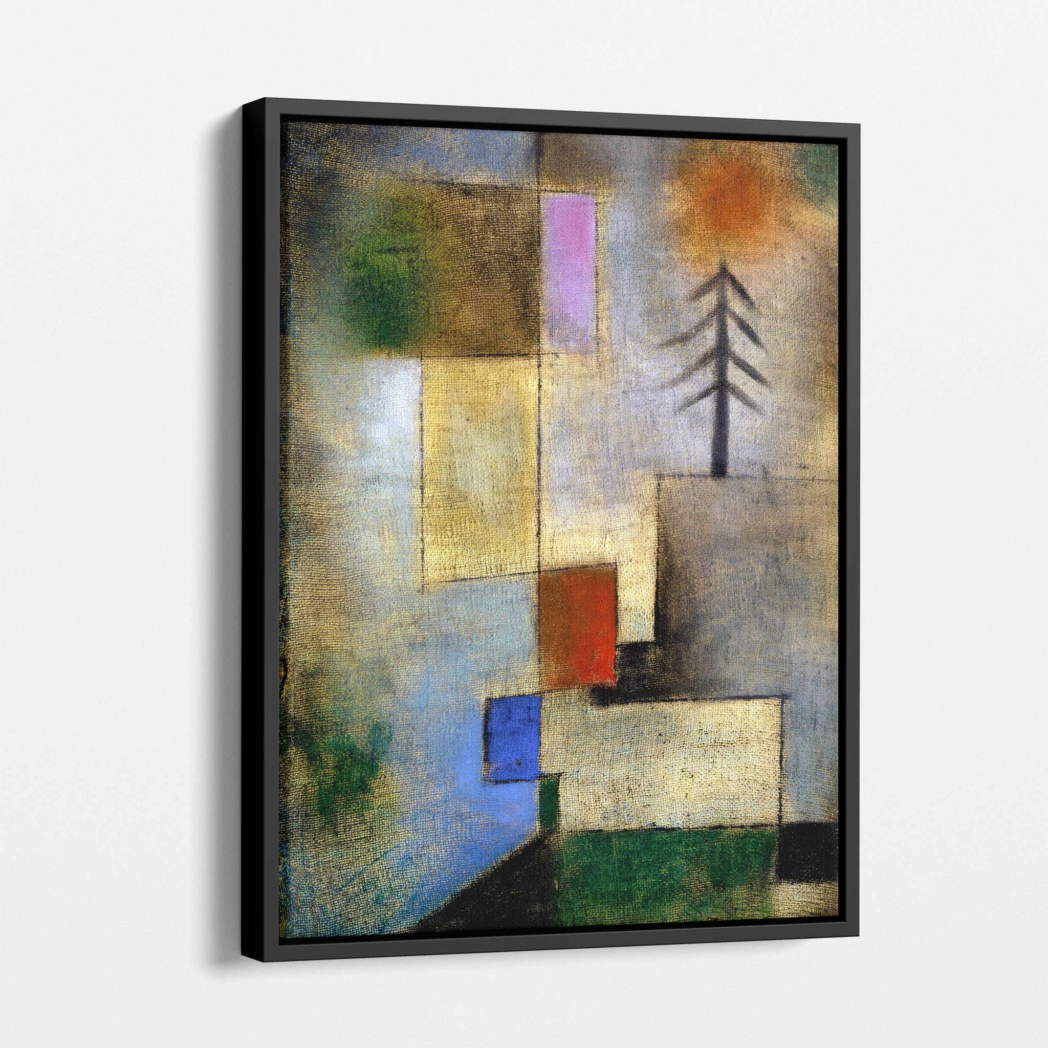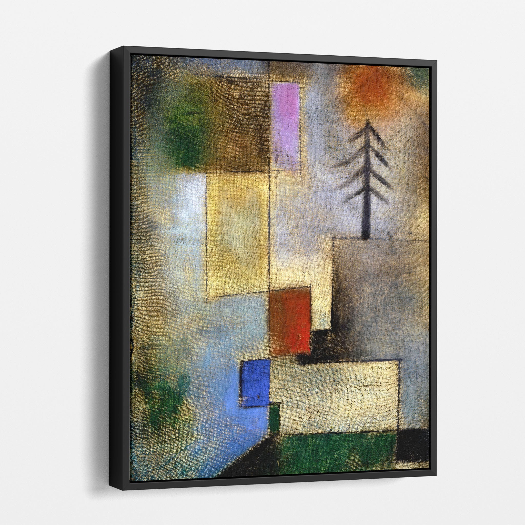 This artwork is titled "Small Fir Picture" by Paul Klee, painted in 1922. A slender fir tree stands silhouetted against a soft, dreamlike backdrop of diffused light and layered blocks. The composition interlocks warm ochres, violets, blues, and forest greens, rendered with a hazy, textured quality that merges geometry with atmosphere. The sun, a glowing orange orb, radiates subtly from the upper corner, adding warmth to the ethereal space. Klee’s precise arrangement of shapes evokes architectural forms, while the tree introduces a symbolic natural element. This fine art reproduction, made from a high-resolution image of the original, provides a serene yet structured presence ideal for modern and abstract art admirers.