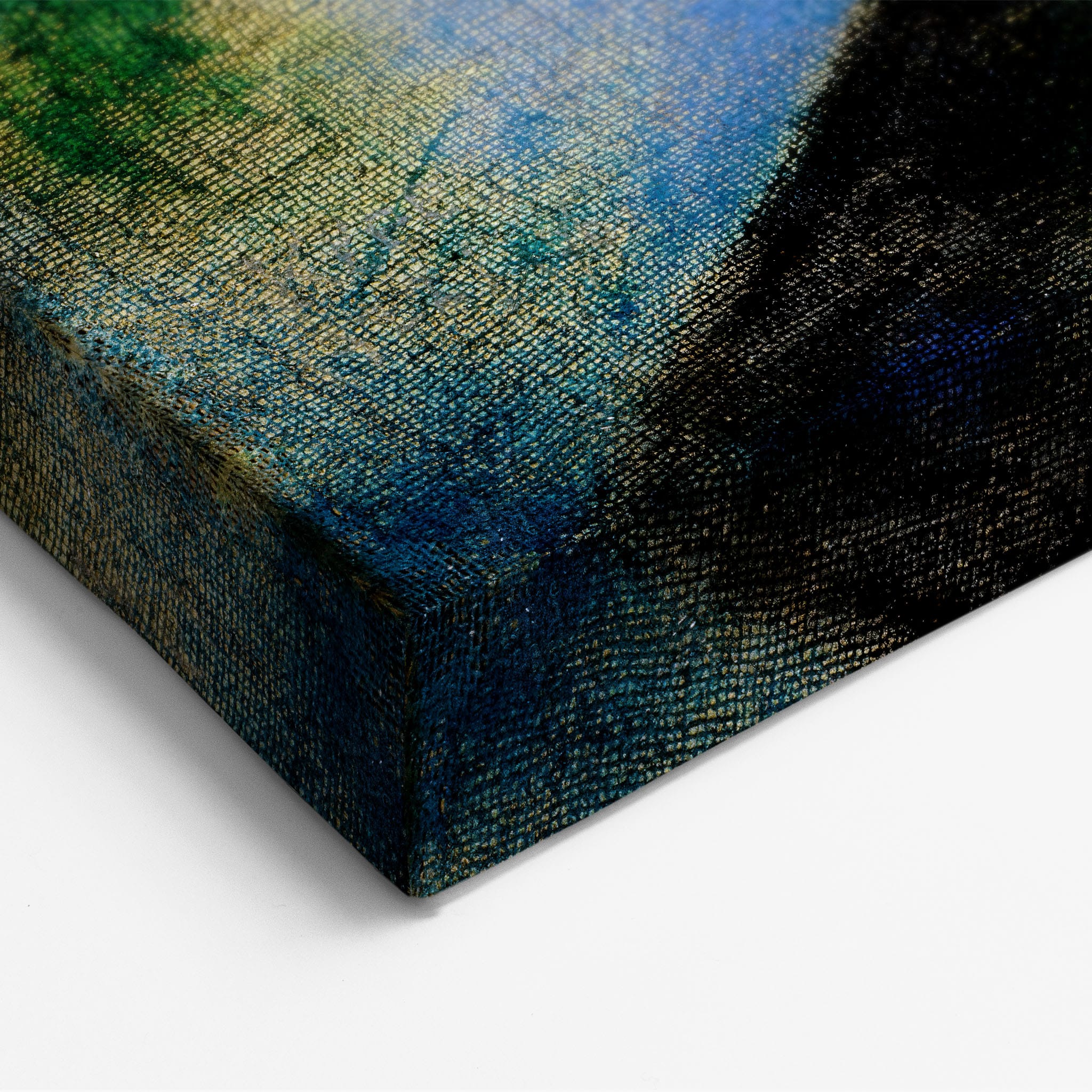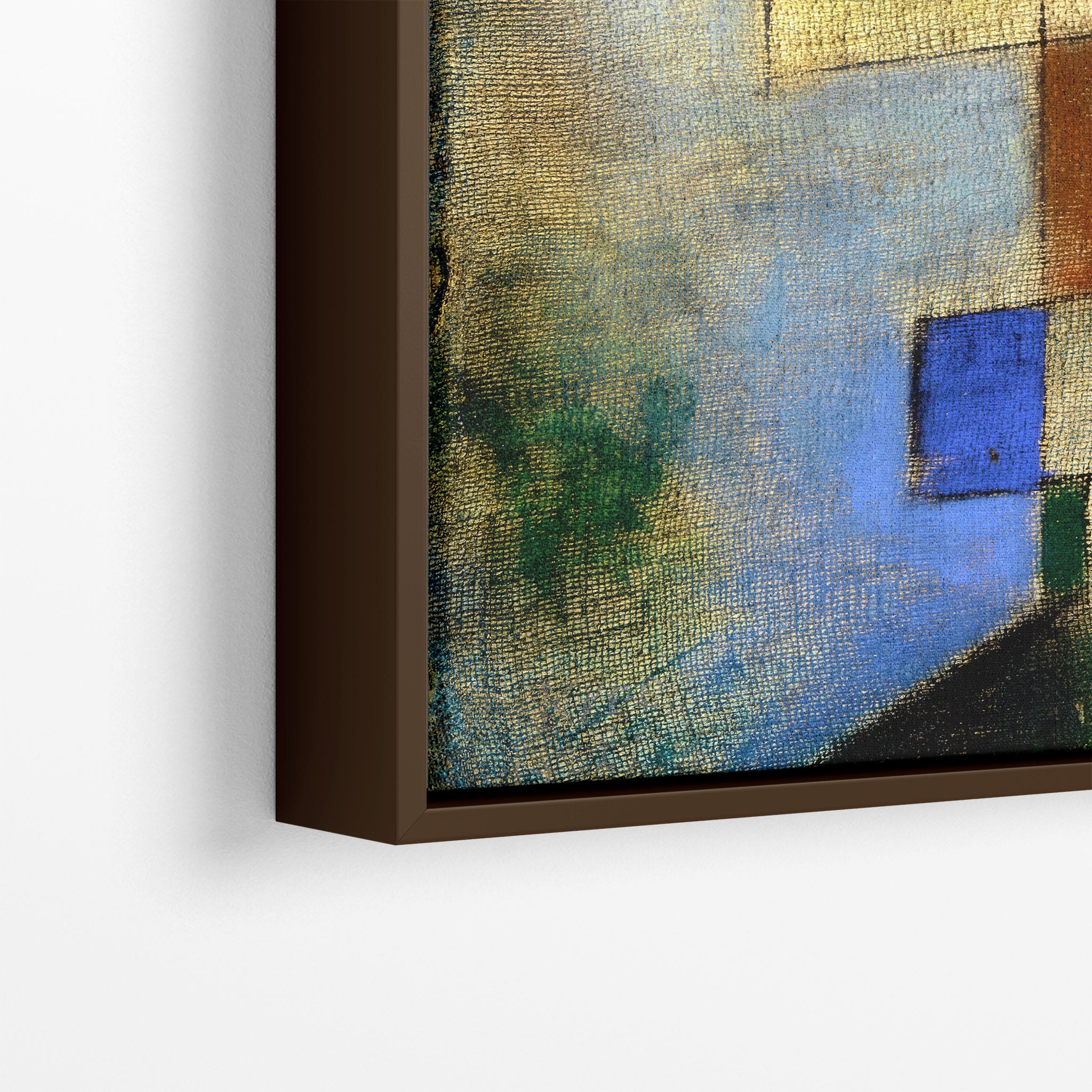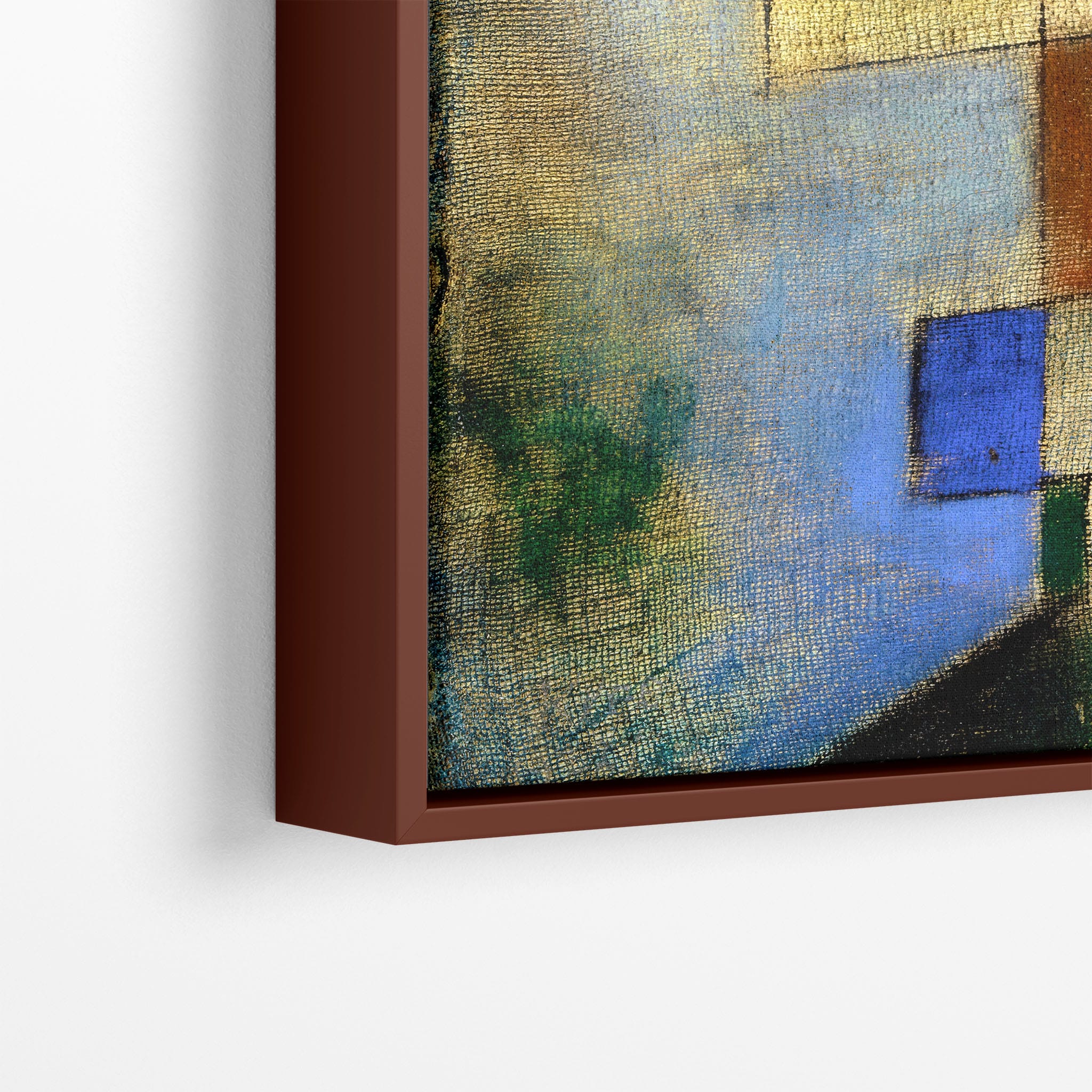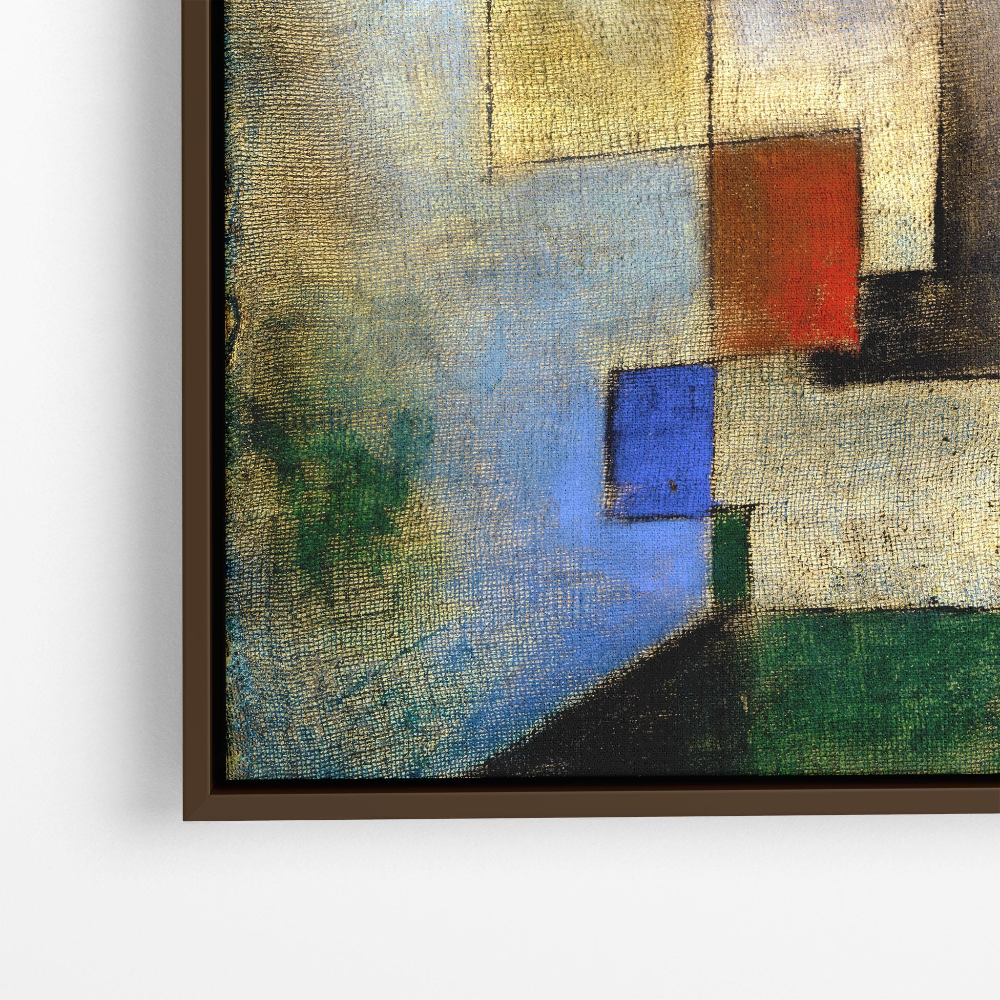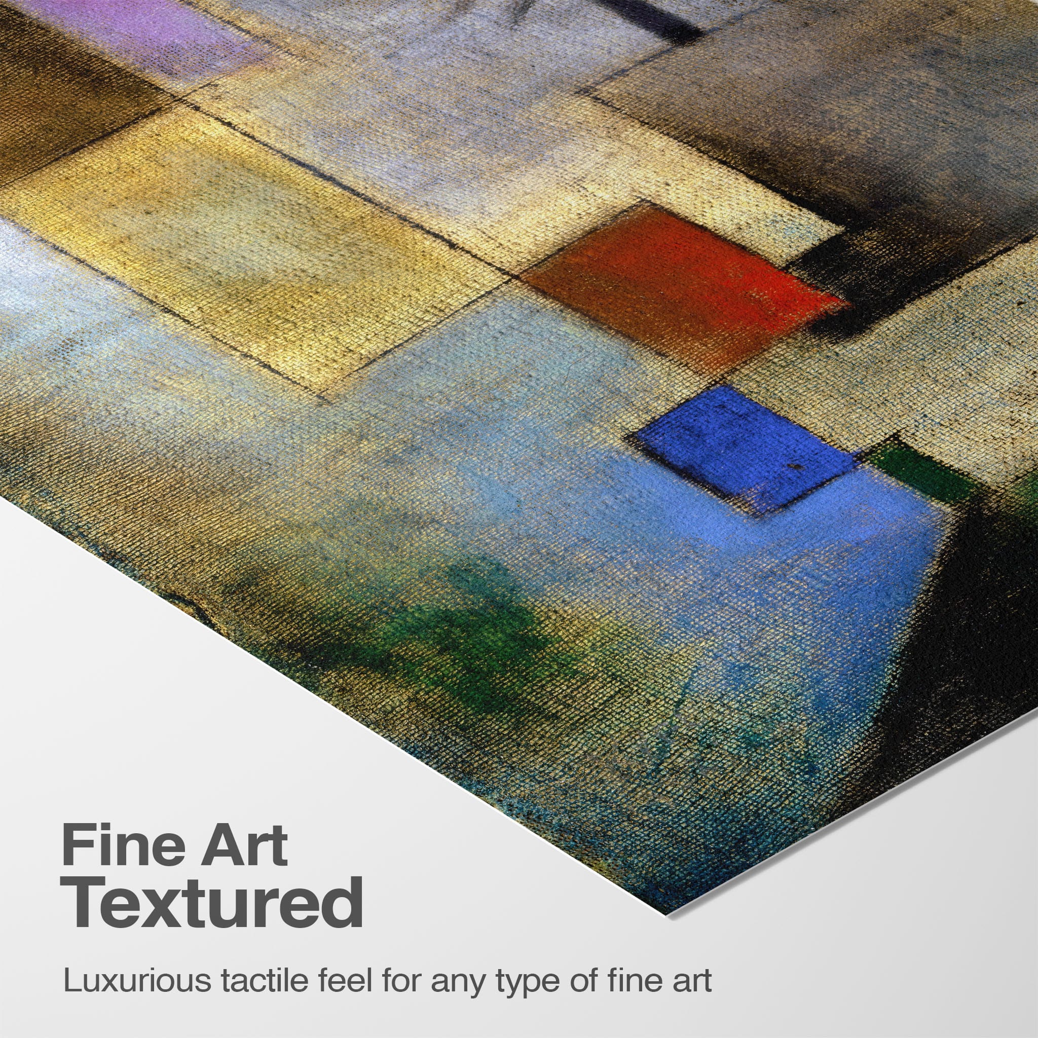 This artwork is titled "Small Fir Picture" by Paul Klee, painted in 1922. A slender fir tree stands silhouetted against a soft, dreamlike backdrop of diffused light and layered blocks. The composition interlocks warm ochres, violets, blues, and forest greens, rendered with a hazy, textured quality that merges geometry with atmosphere. The sun, a glowing orange orb, radiates subtly from the upper corner, adding warmth to the ethereal space. Klee’s precise arrangement of shapes evokes architectural forms, while the tree introduces a symbolic natural element. This fine art reproduction, made from a high-resolution image of the original, provides a serene yet structured presence ideal for modern and abstract art admirers.