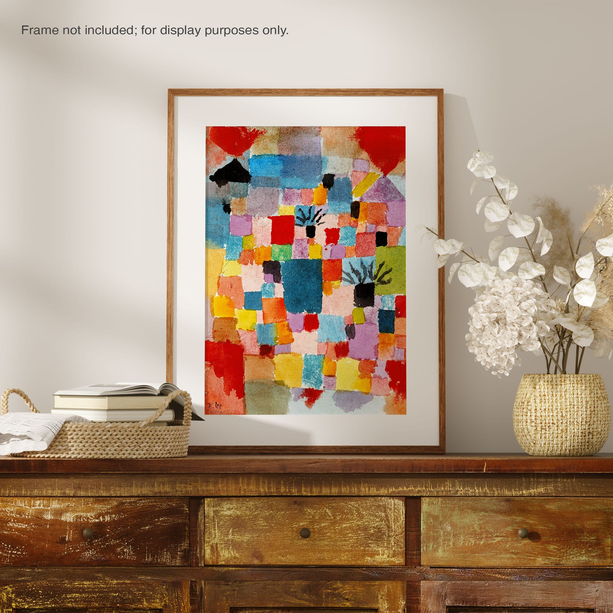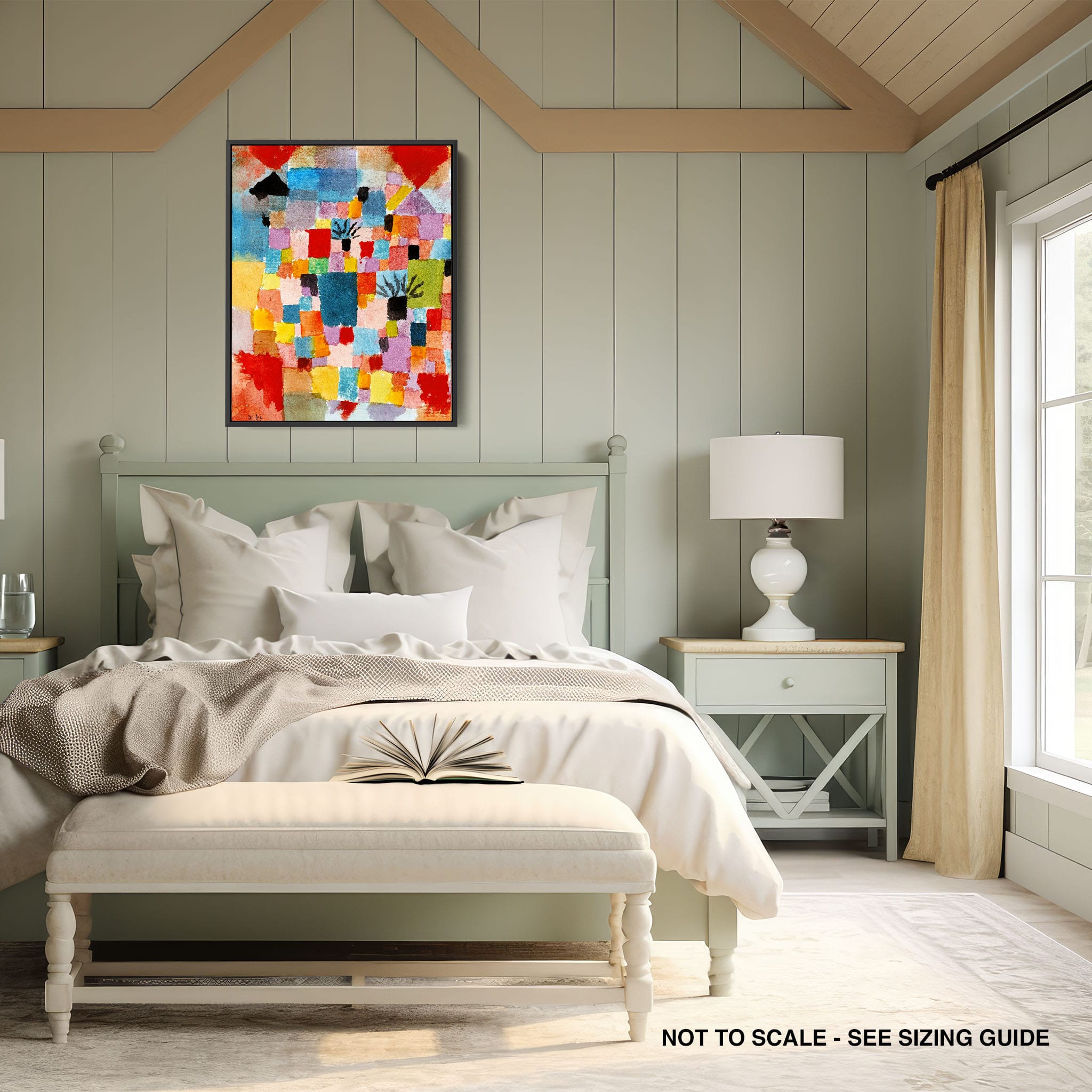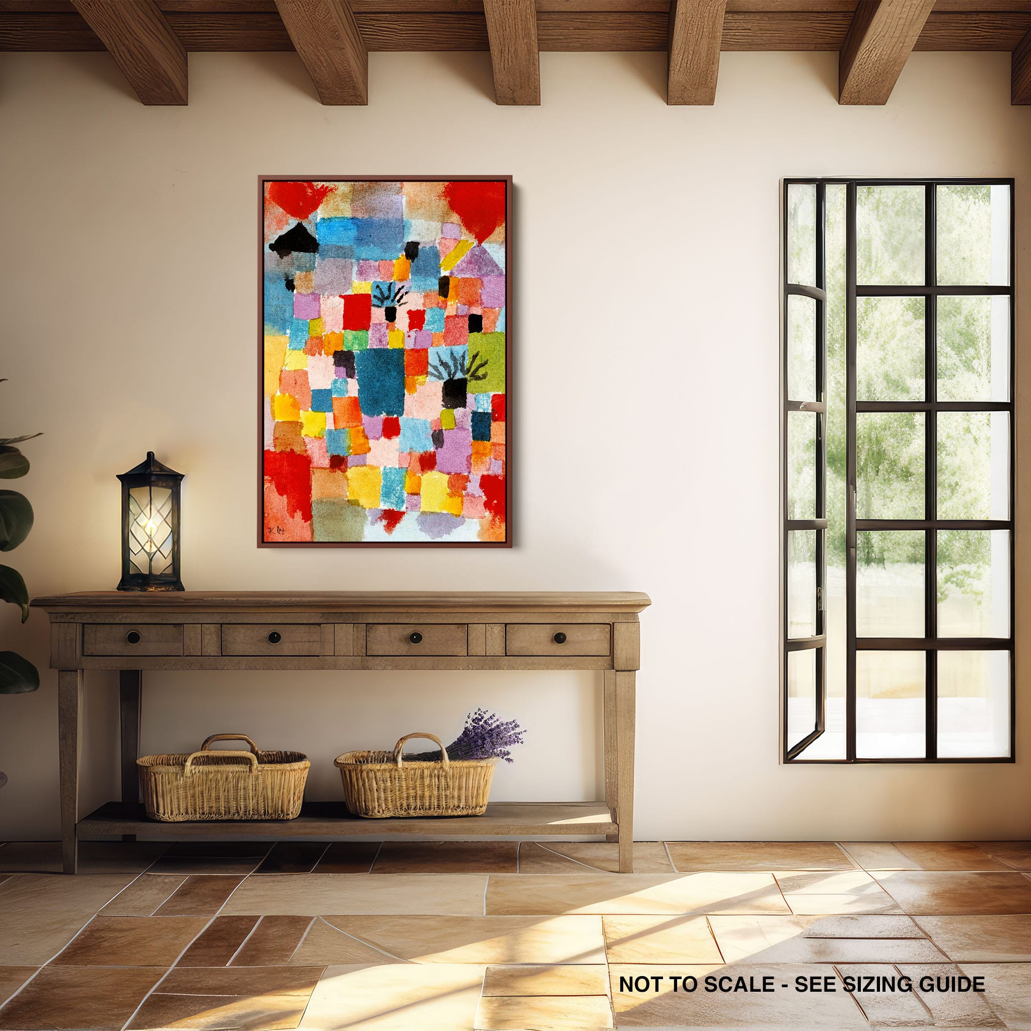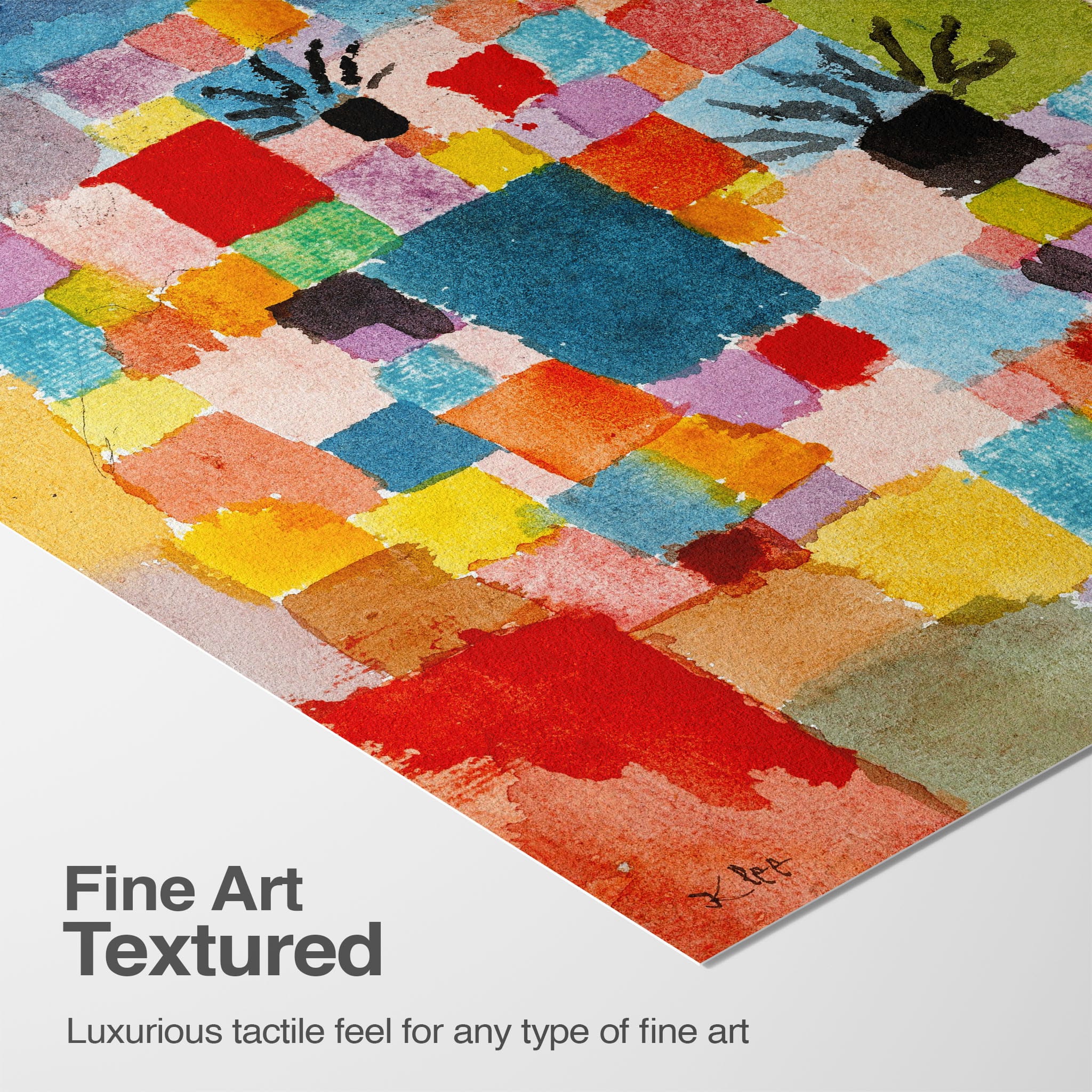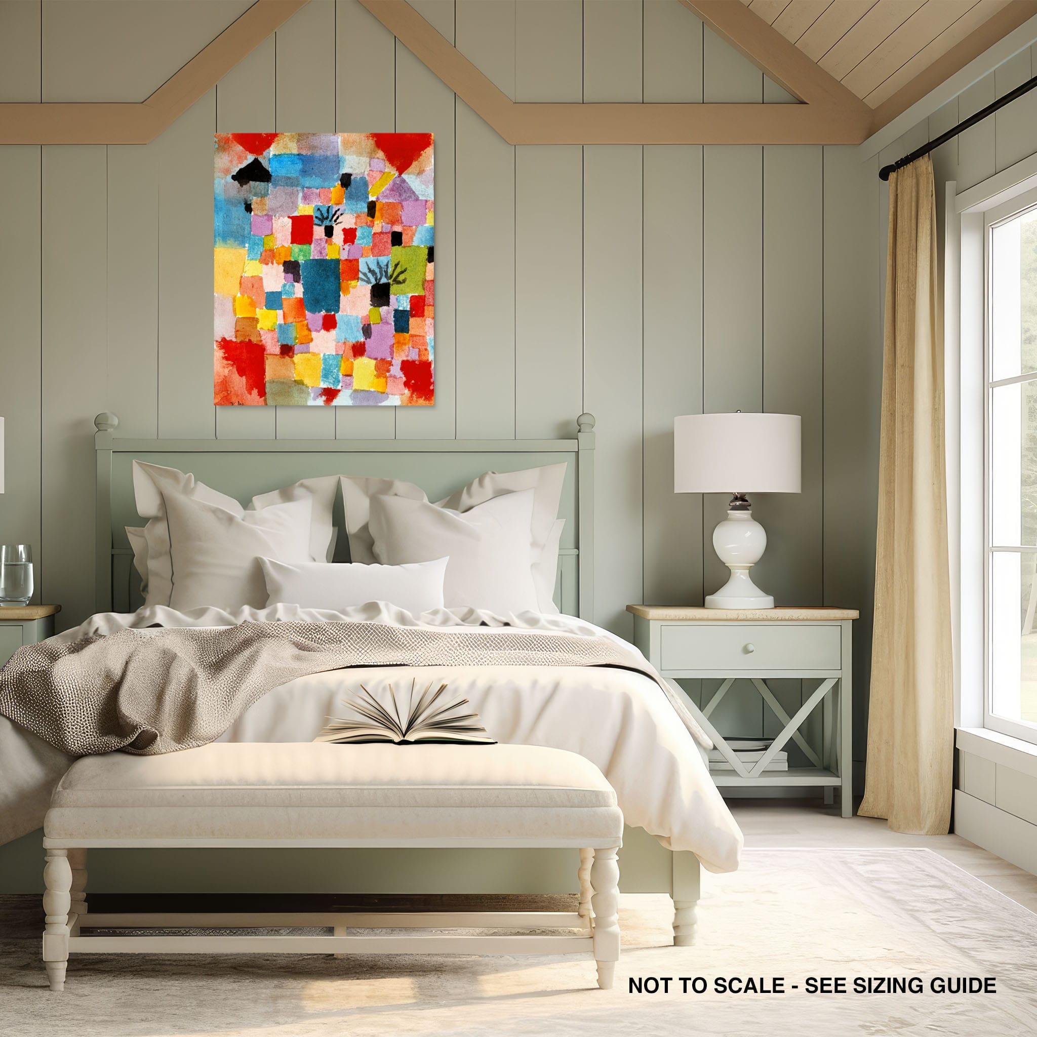 This artwork is titled "Southern Gardens" by Paul Klee, painted in 1919. A mosaic of luminous, overlapping color blocks forms a rhythmic gardenscape, bursting with reds, yellows, purples, and aqua blues. Amid the patchwork, stylized black tree motifs emerge like silhouettes rooted in vibrant soil, subtly grounding the composition. The geometric fragmentation, paired with organic forms and delicate textural washes, showcases Klee’s intuitive balance between abstraction and poetic symbolism. The composition suggests a sun-soaked, dreamlike terrain viewed through a prism of pure color. Offered as a fine art reproduction created from a high-resolution image of the original, this piece brings energy and painterly charm to modern interiors.