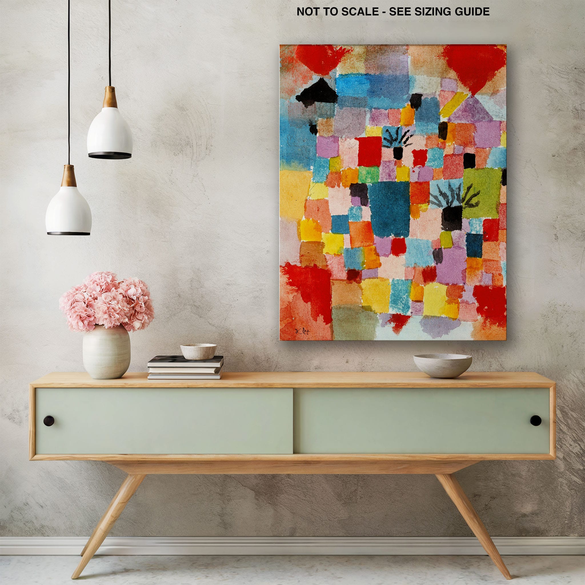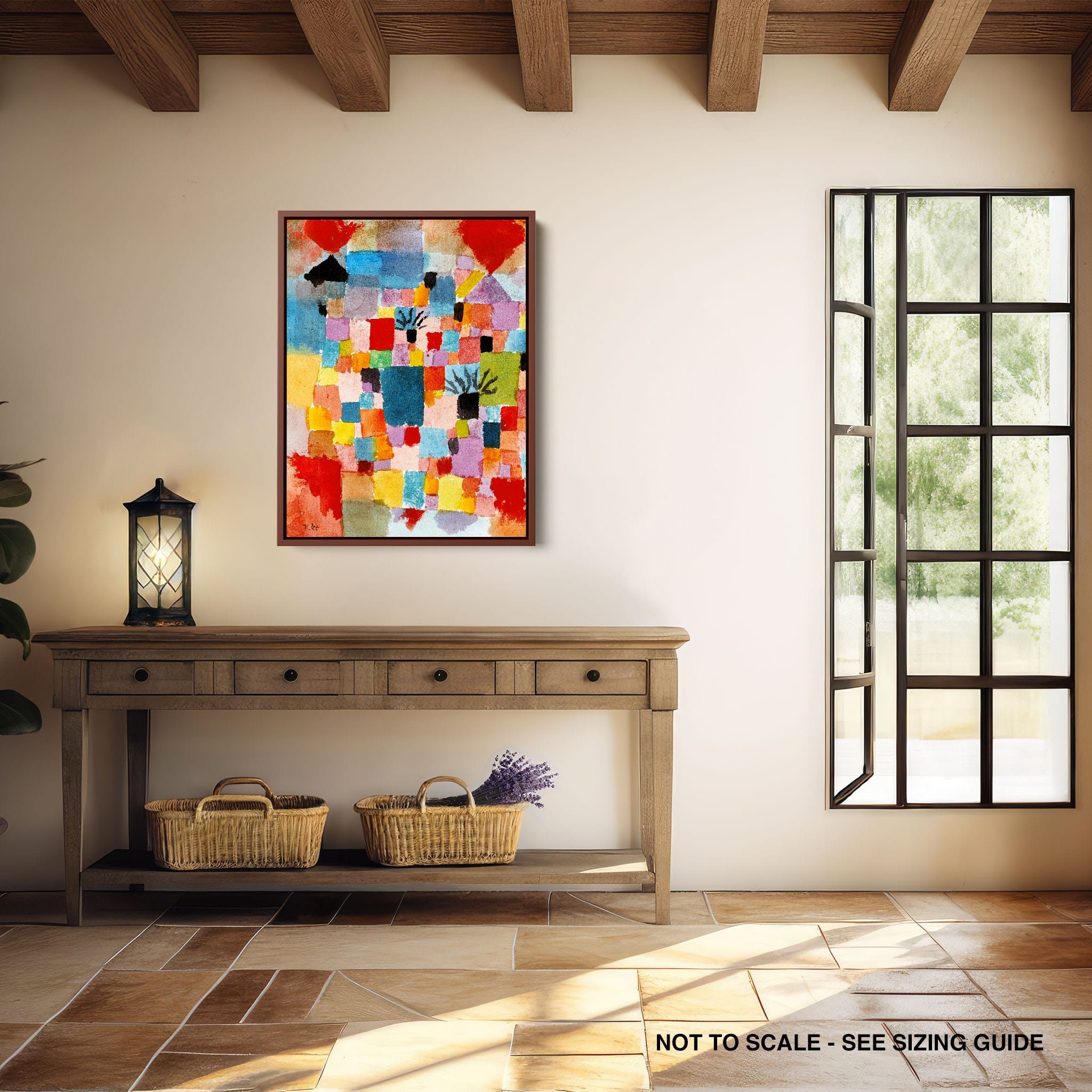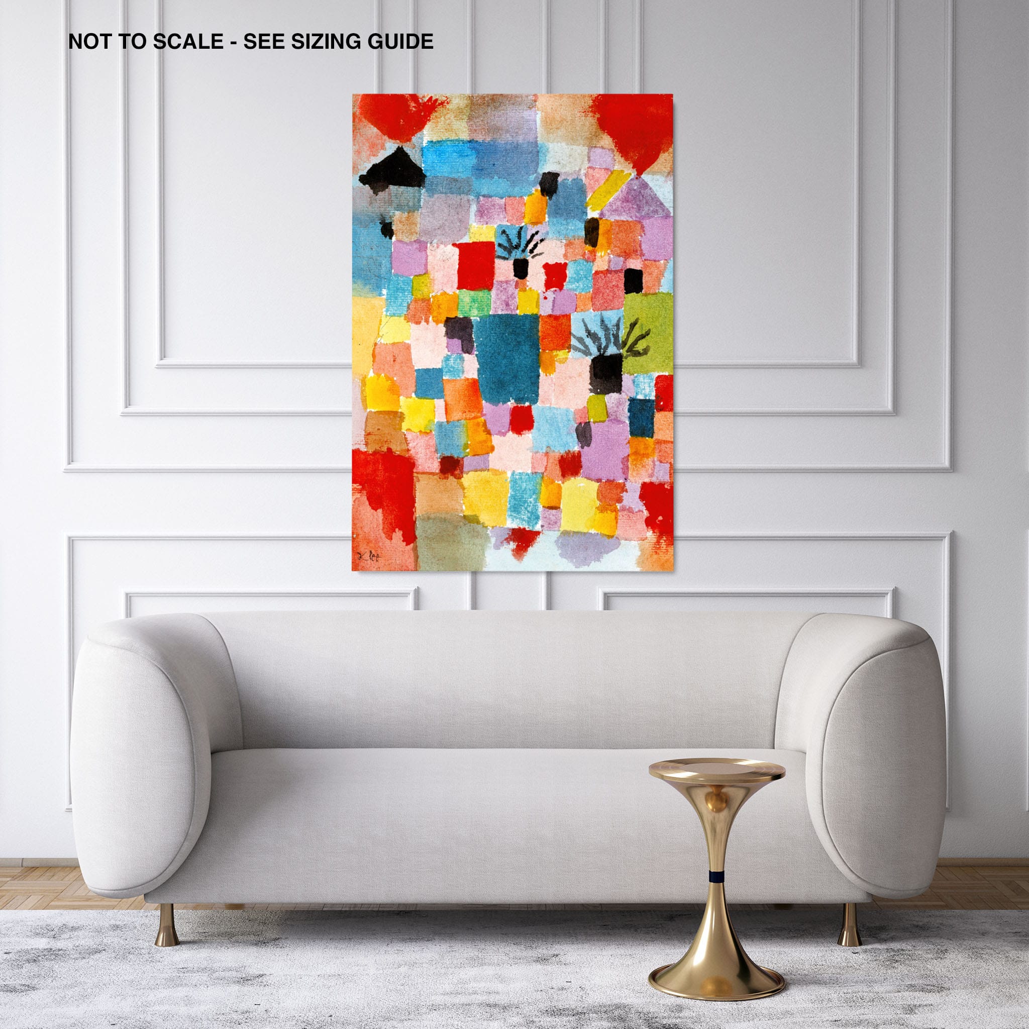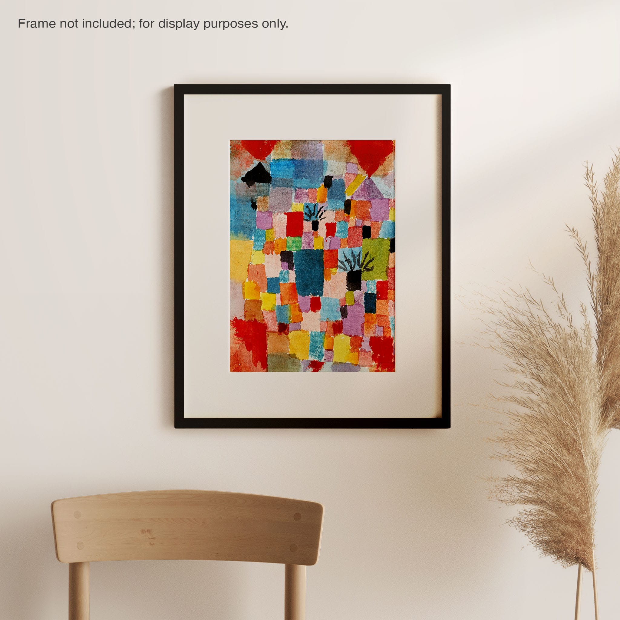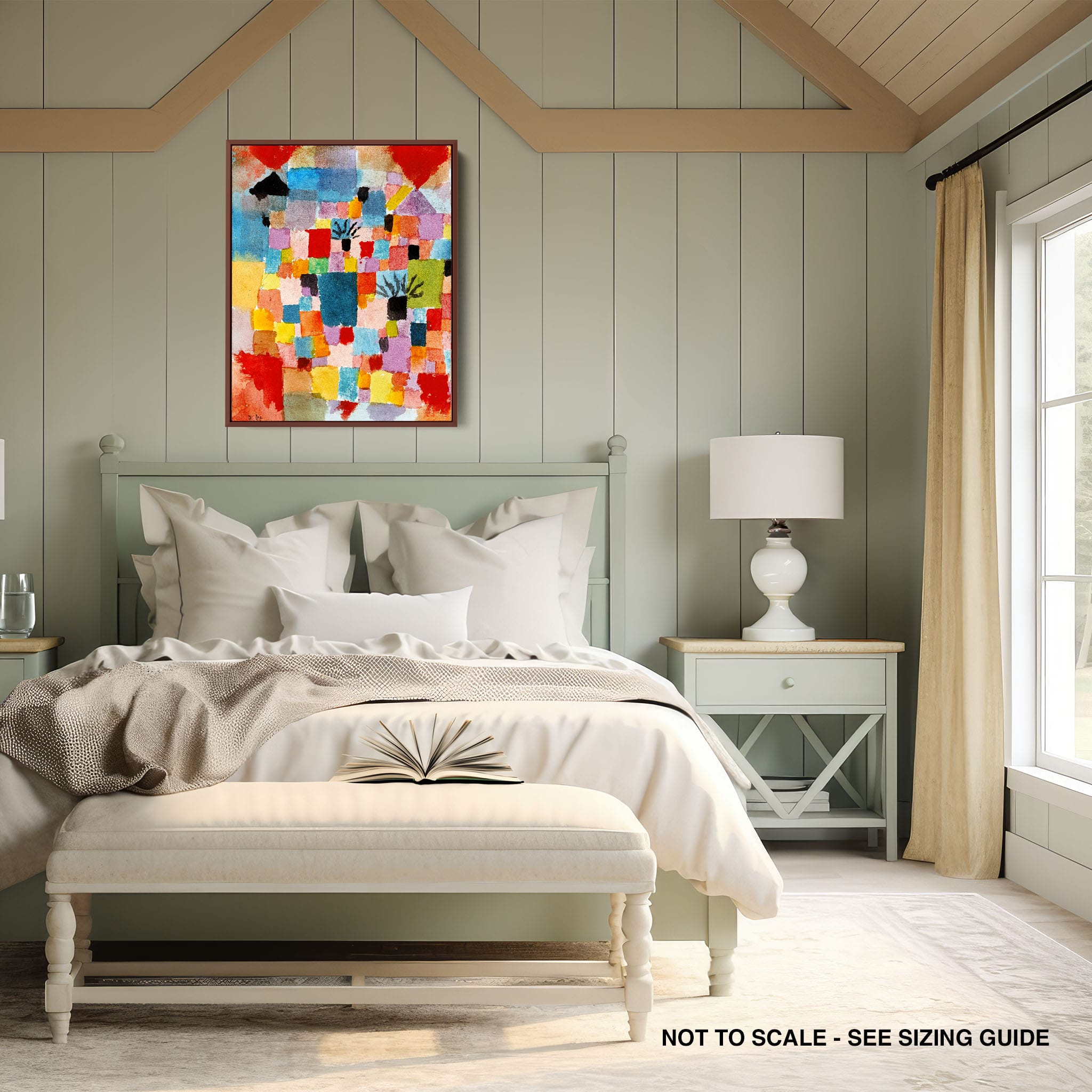 This artwork is titled "Southern Gardens" by Paul Klee, painted in 1919. A mosaic of luminous, overlapping color blocks forms a rhythmic gardenscape, bursting with reds, yellows, purples, and aqua blues. Amid the patchwork, stylized black tree motifs emerge like silhouettes rooted in vibrant soil, subtly grounding the composition. The geometric fragmentation, paired with organic forms and delicate textural washes, showcases Klee’s intuitive balance between abstraction and poetic symbolism. The composition suggests a sun-soaked, dreamlike terrain viewed through a prism of pure color. Offered as a fine art reproduction created from a high-resolution image of the original, this piece brings energy and painterly charm to modern interiors.