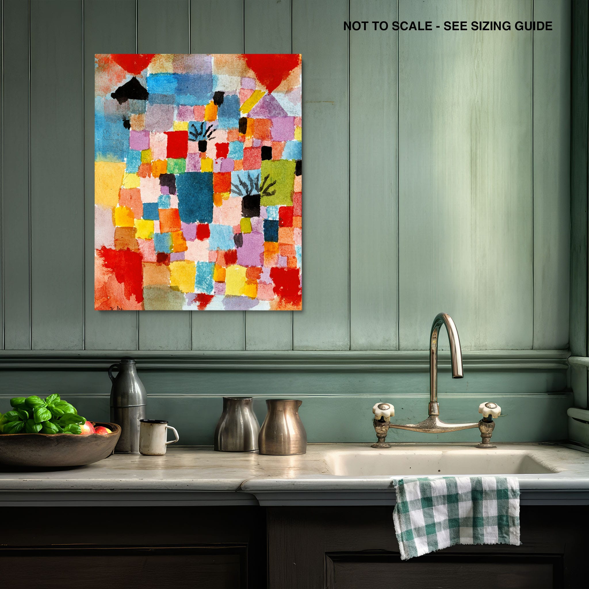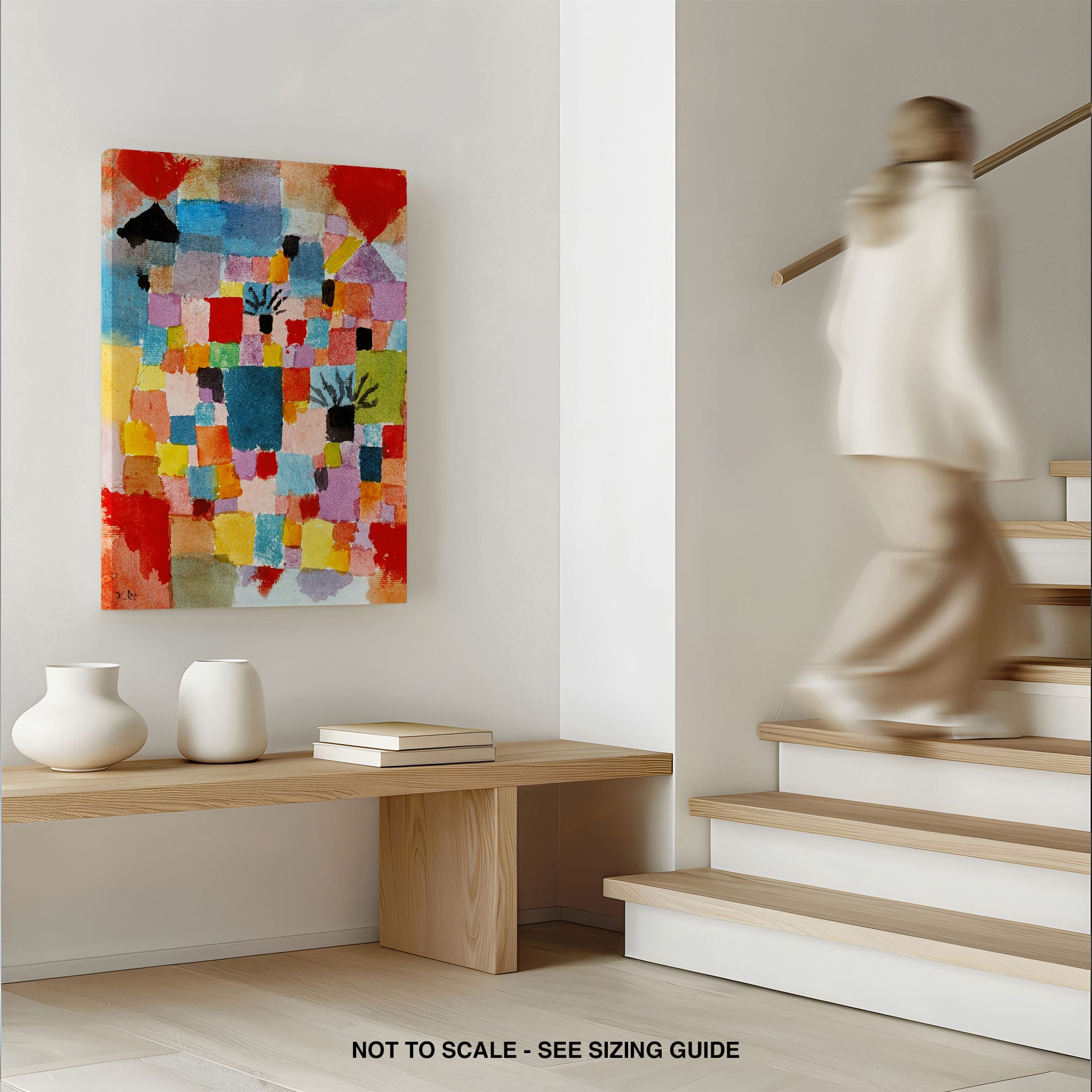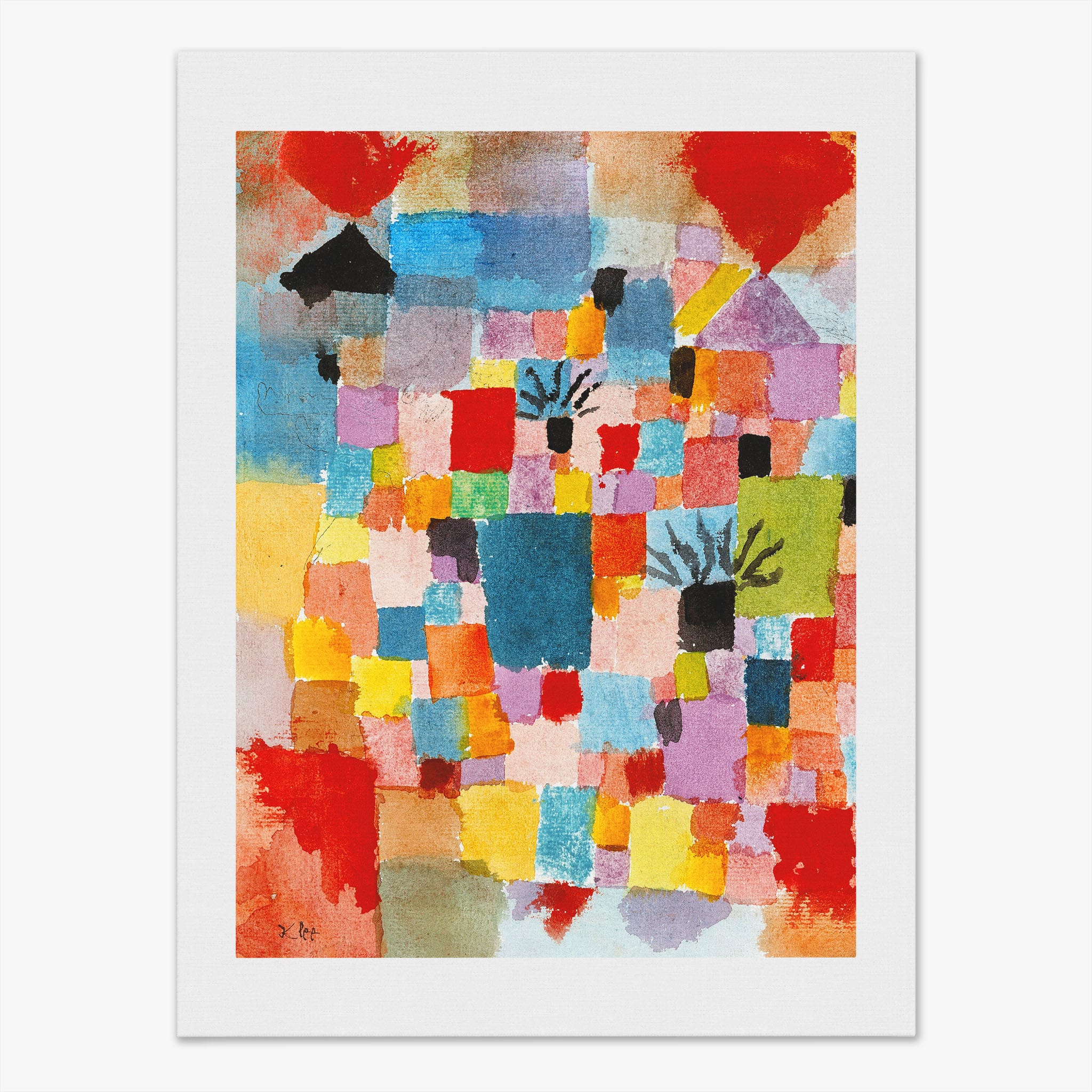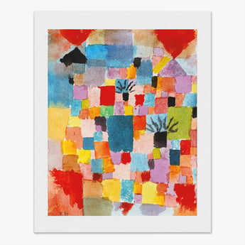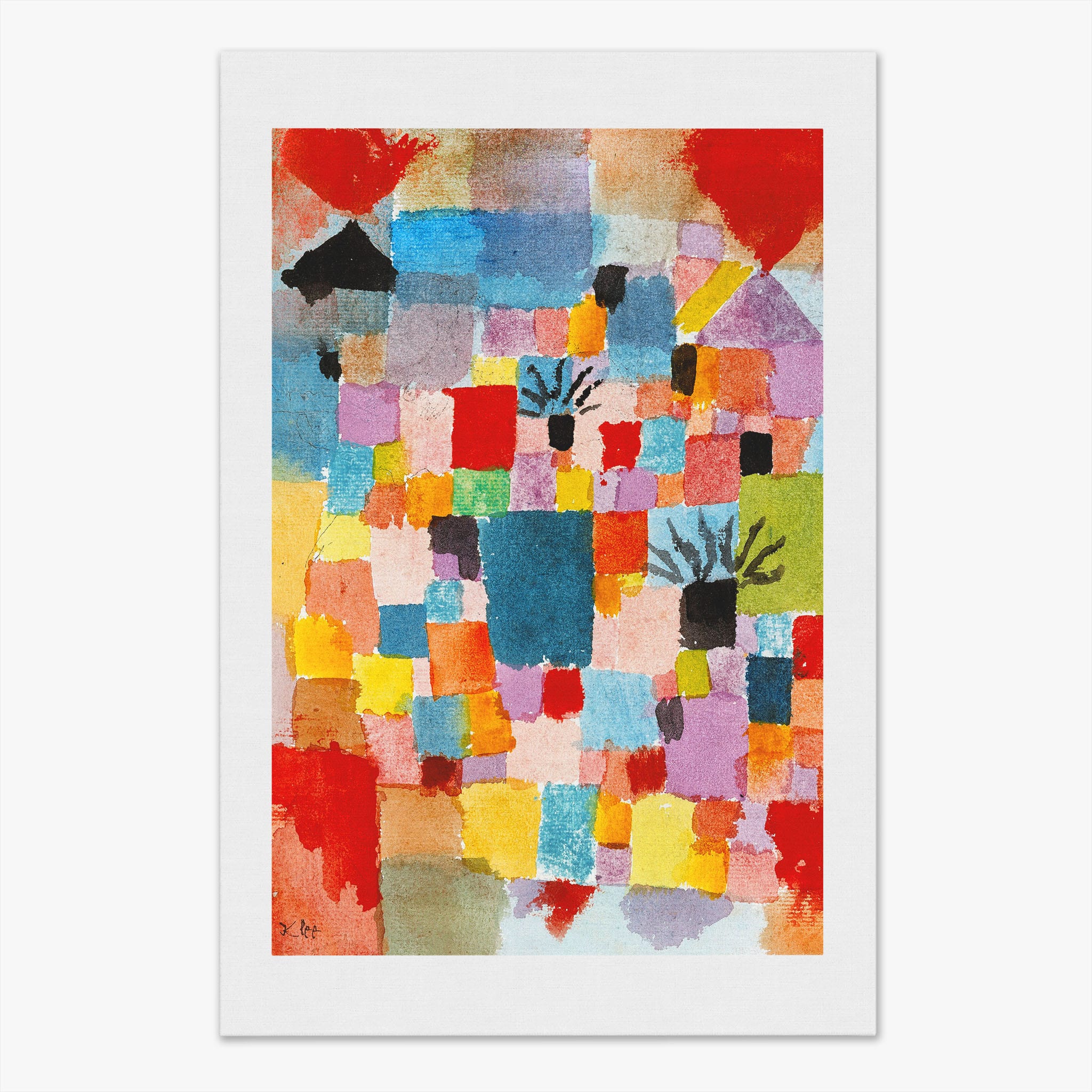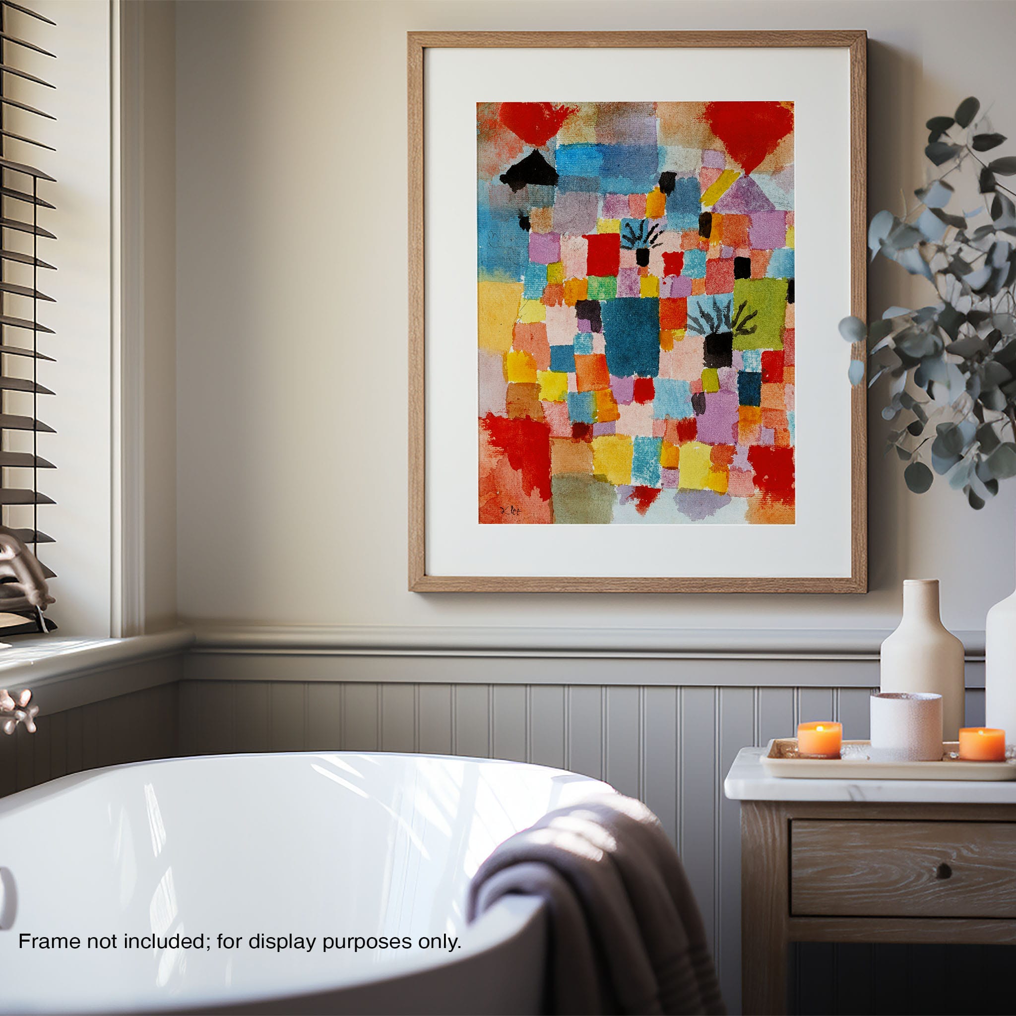 This artwork is titled "Southern Gardens" by Paul Klee, painted in 1919. A mosaic of luminous, overlapping color blocks forms a rhythmic gardenscape, bursting with reds, yellows, purples, and aqua blues. Amid the patchwork, stylized black tree motifs emerge like silhouettes rooted in vibrant soil, subtly grounding the composition. The geometric fragmentation, paired with organic forms and delicate textural washes, showcases Klee’s intuitive balance between abstraction and poetic symbolism. The composition suggests a sun-soaked, dreamlike terrain viewed through a prism of pure color. Offered as a fine art reproduction created from a high-resolution image of the original, this piece brings energy and painterly charm to modern interiors.