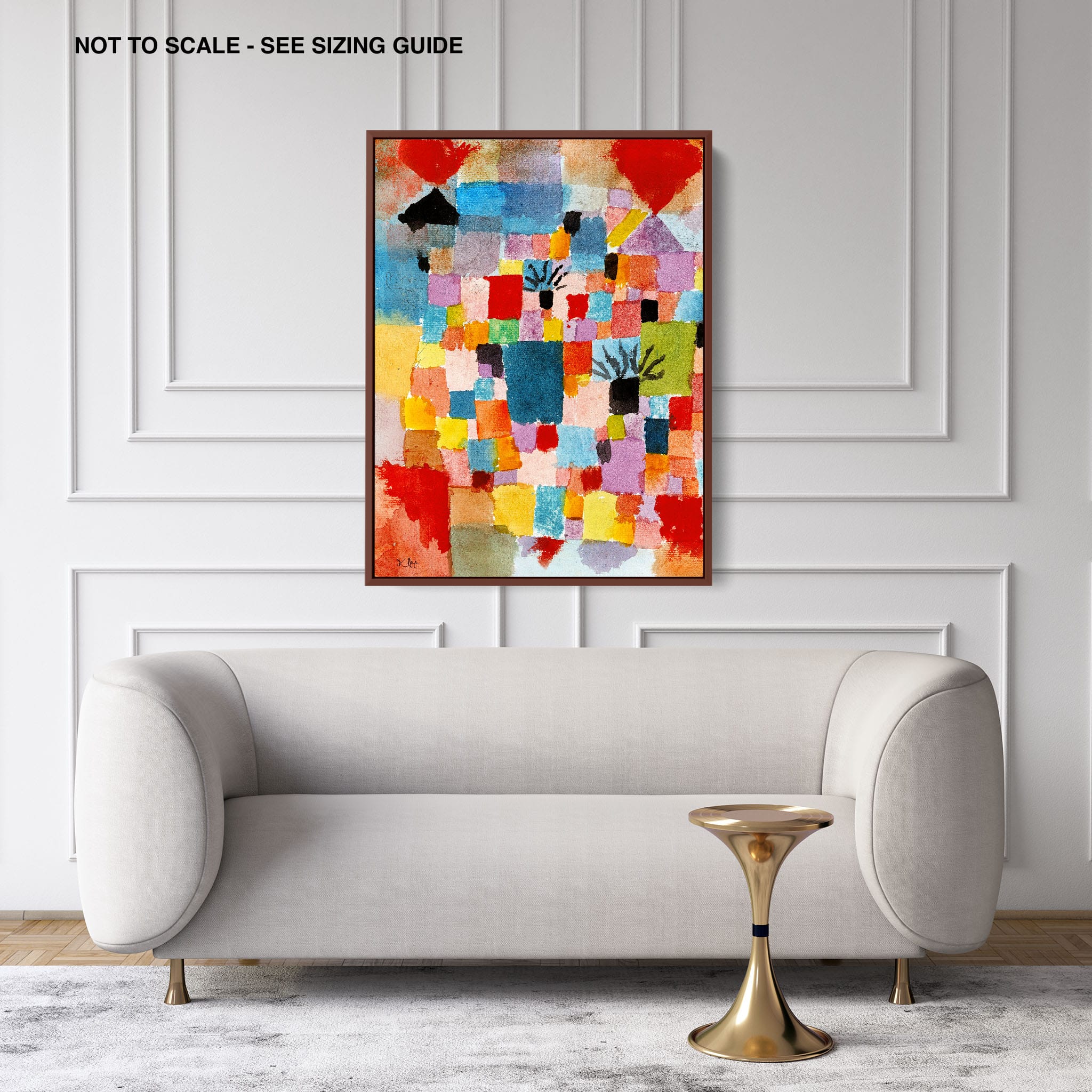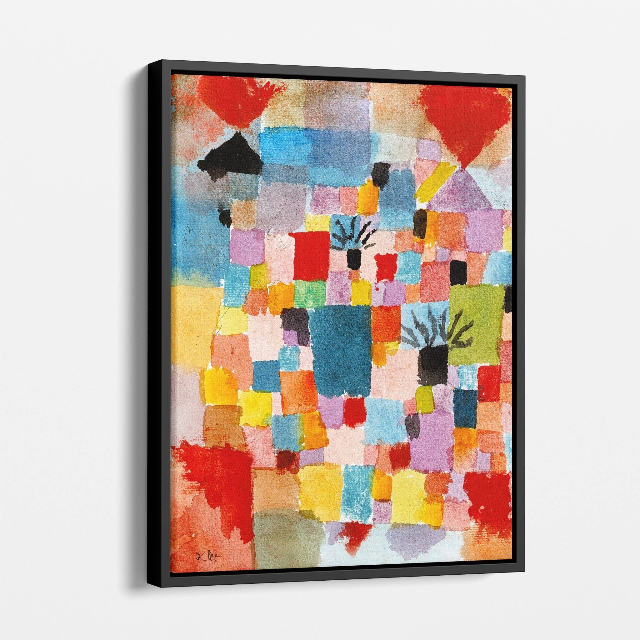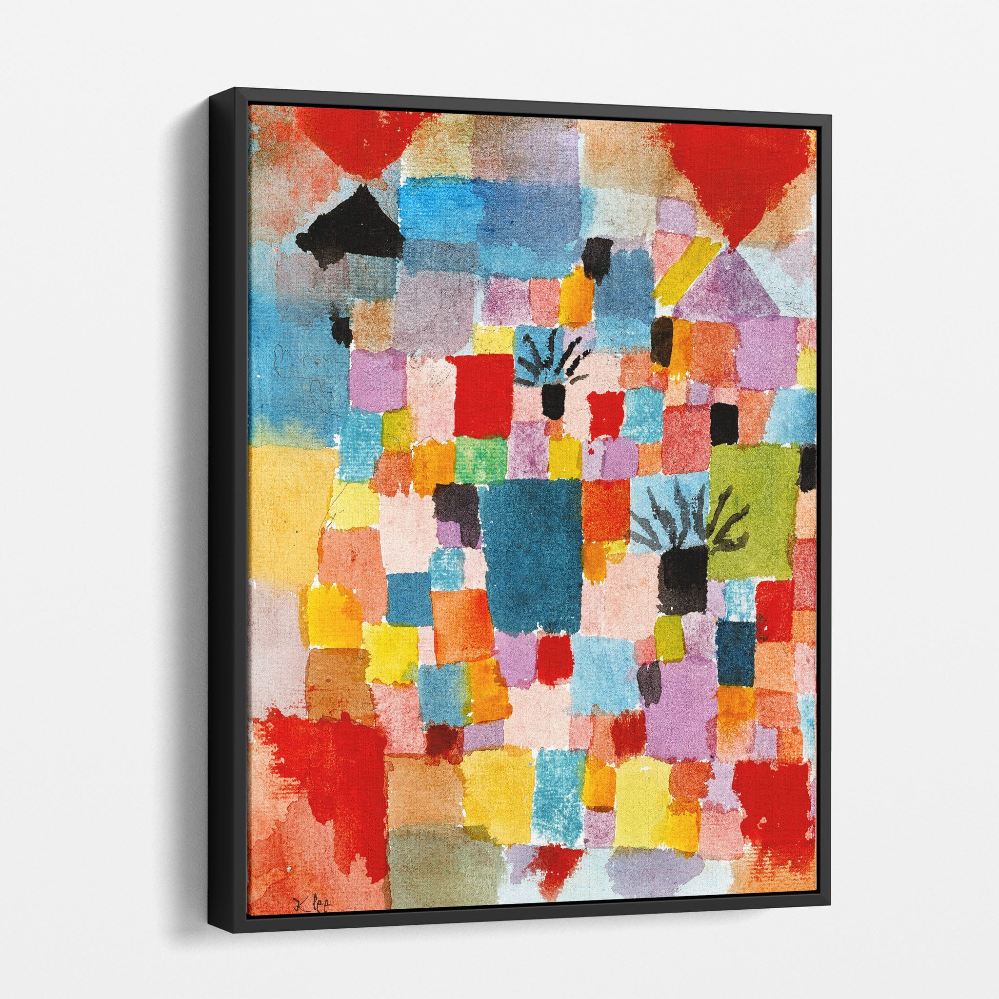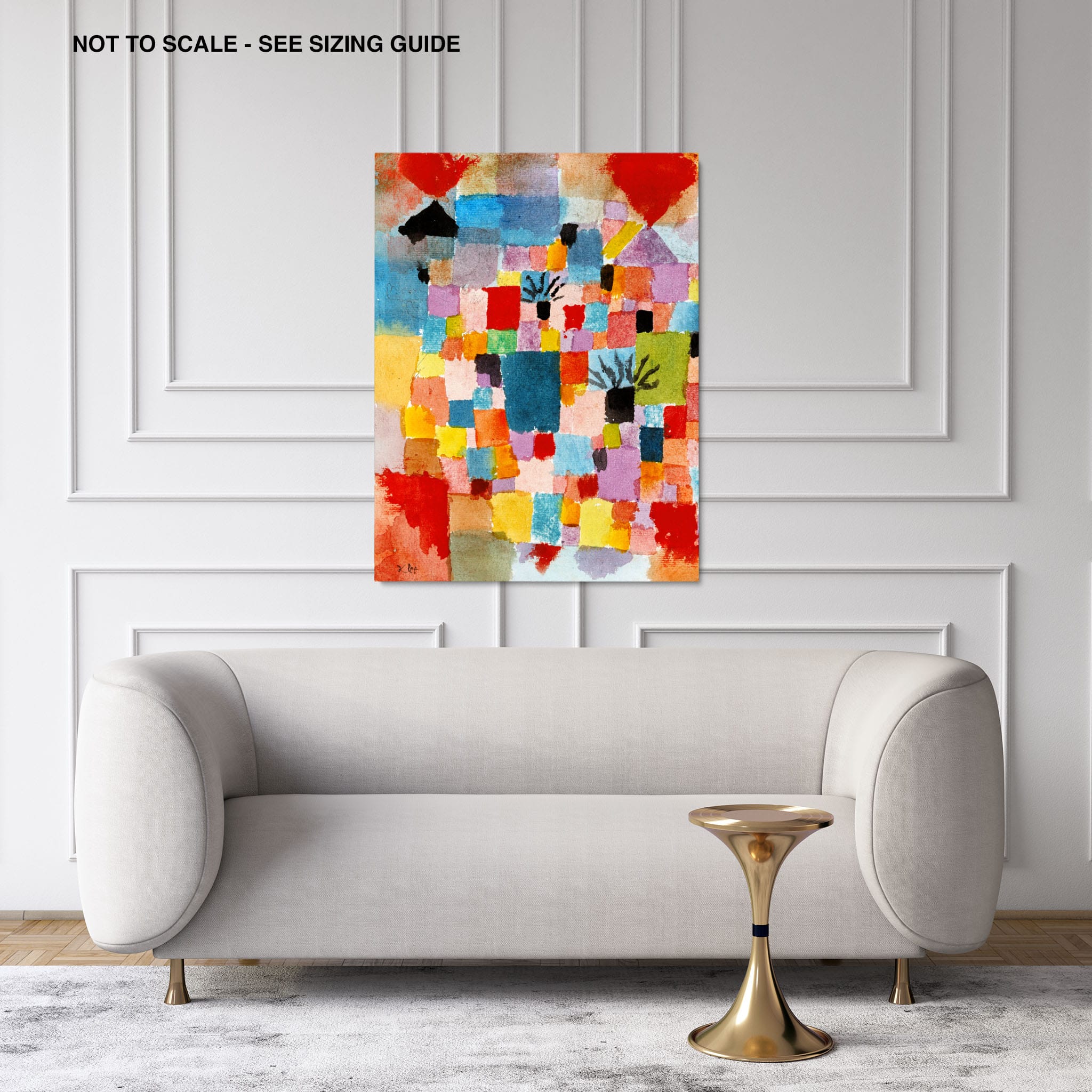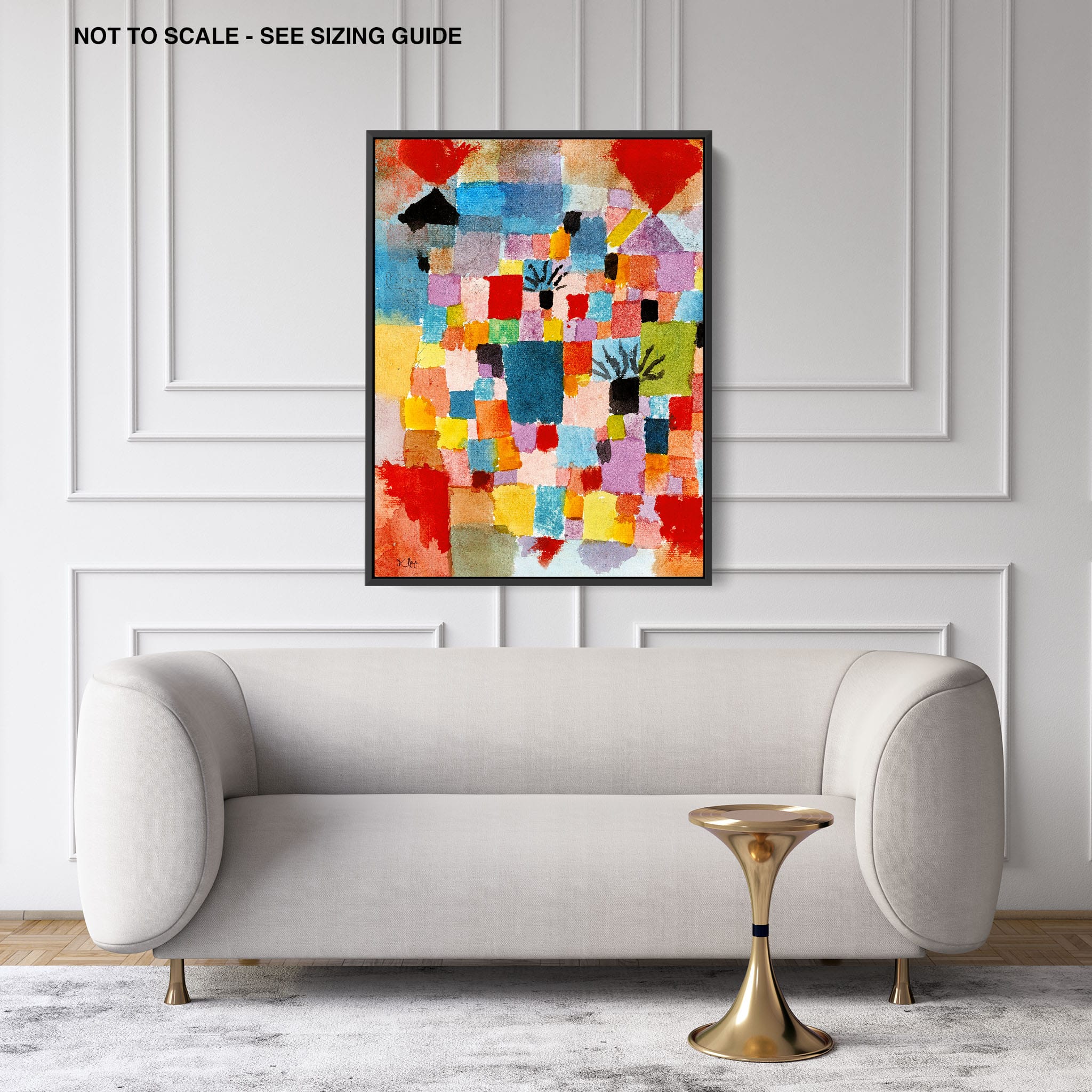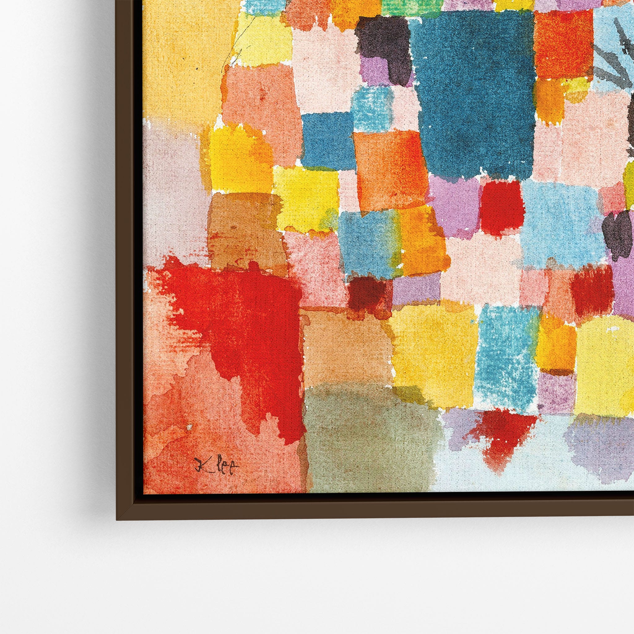 This artwork is titled "Southern Gardens" by Paul Klee, painted in 1919. A mosaic of luminous, overlapping color blocks forms a rhythmic gardenscape, bursting with reds, yellows, purples, and aqua blues. Amid the patchwork, stylized black tree motifs emerge like silhouettes rooted in vibrant soil, subtly grounding the composition. The geometric fragmentation, paired with organic forms and delicate textural washes, showcases Klee’s intuitive balance between abstraction and poetic symbolism. The composition suggests a sun-soaked, dreamlike terrain viewed through a prism of pure color. Offered as a fine art reproduction created from a high-resolution image of the original, this piece brings energy and painterly charm to modern interiors.