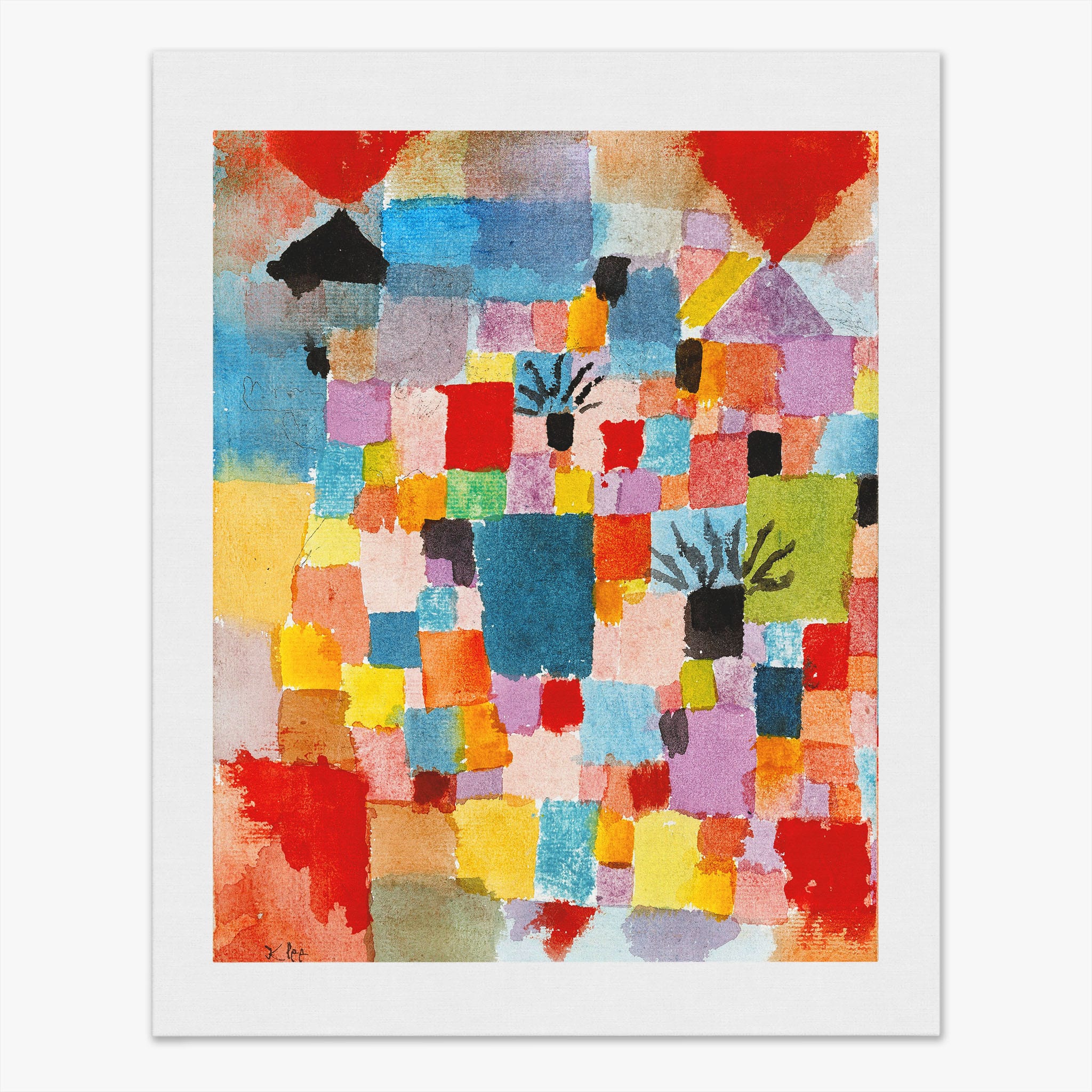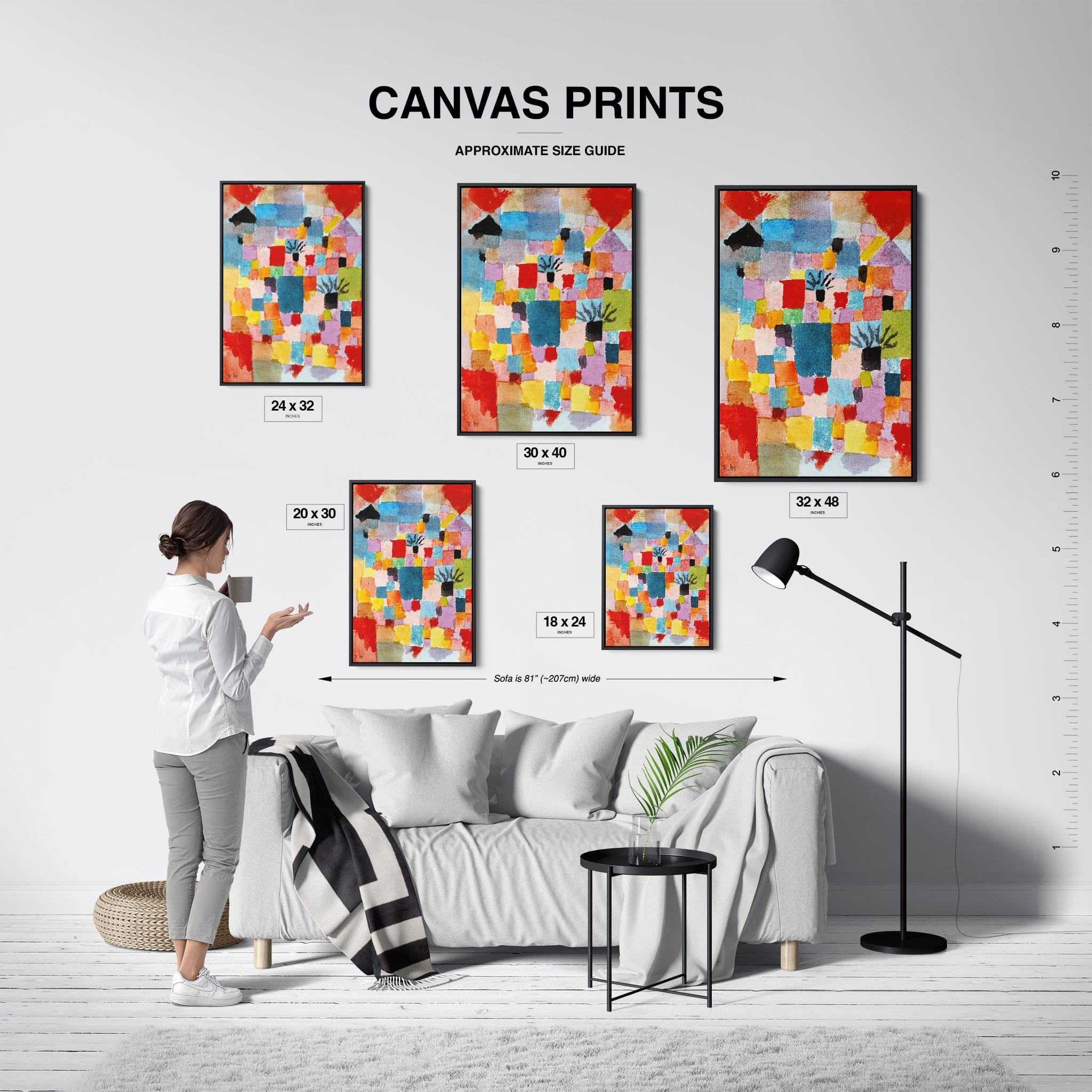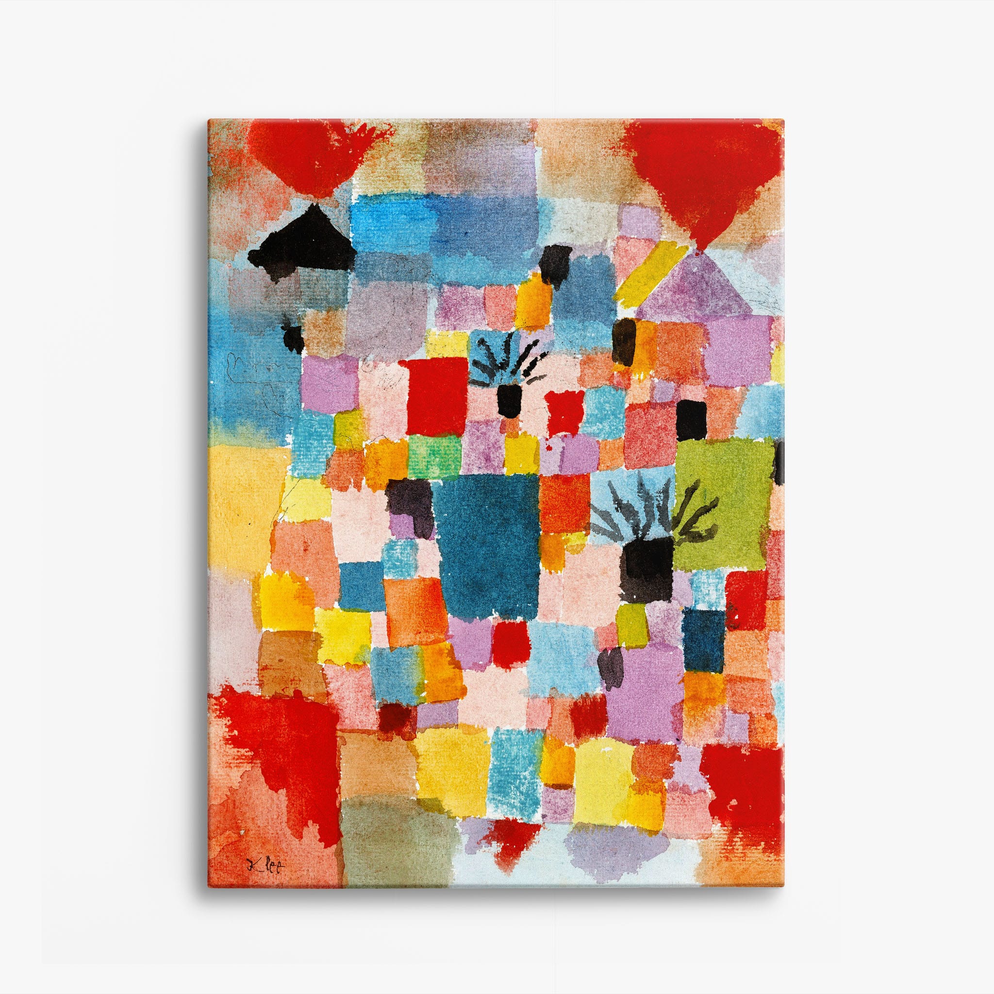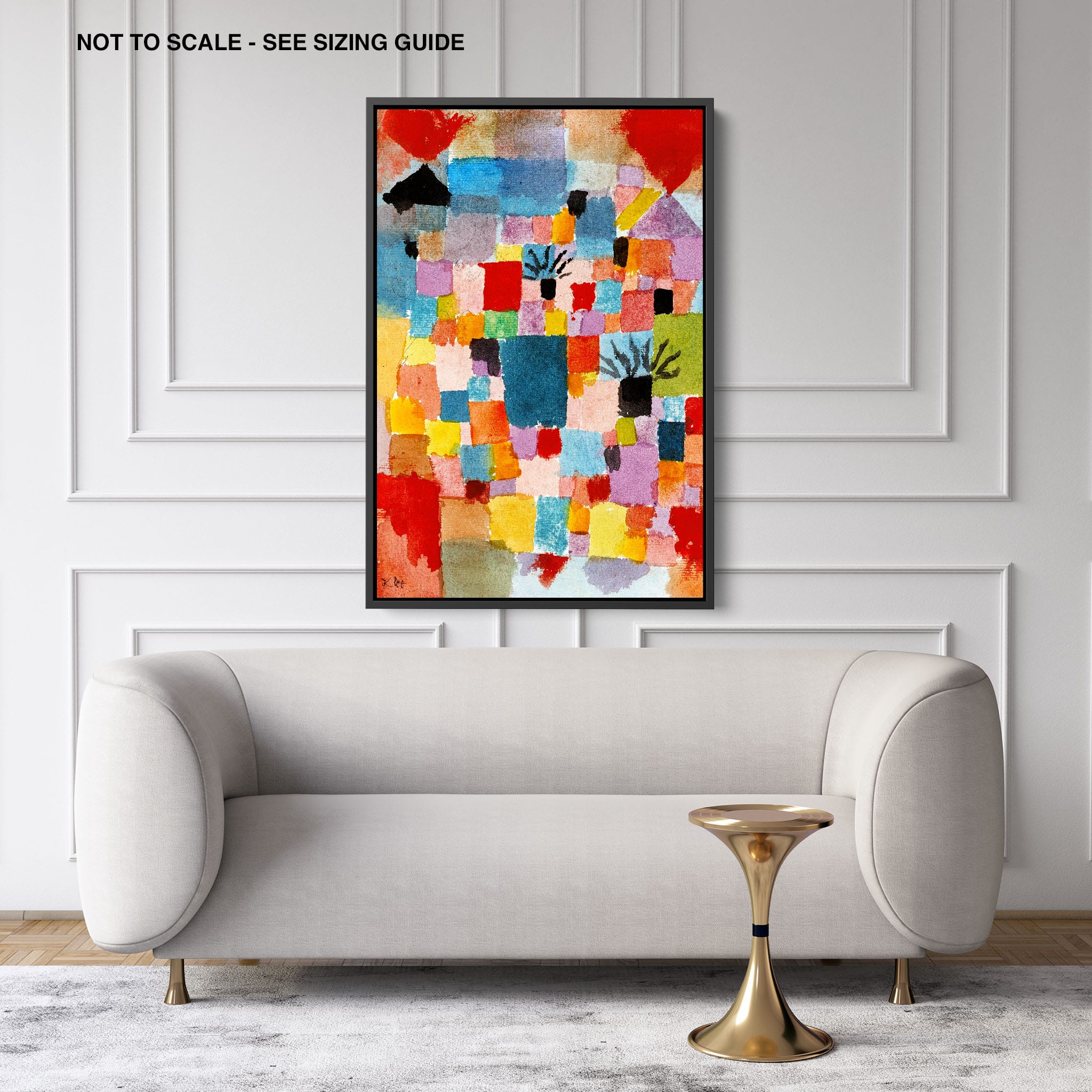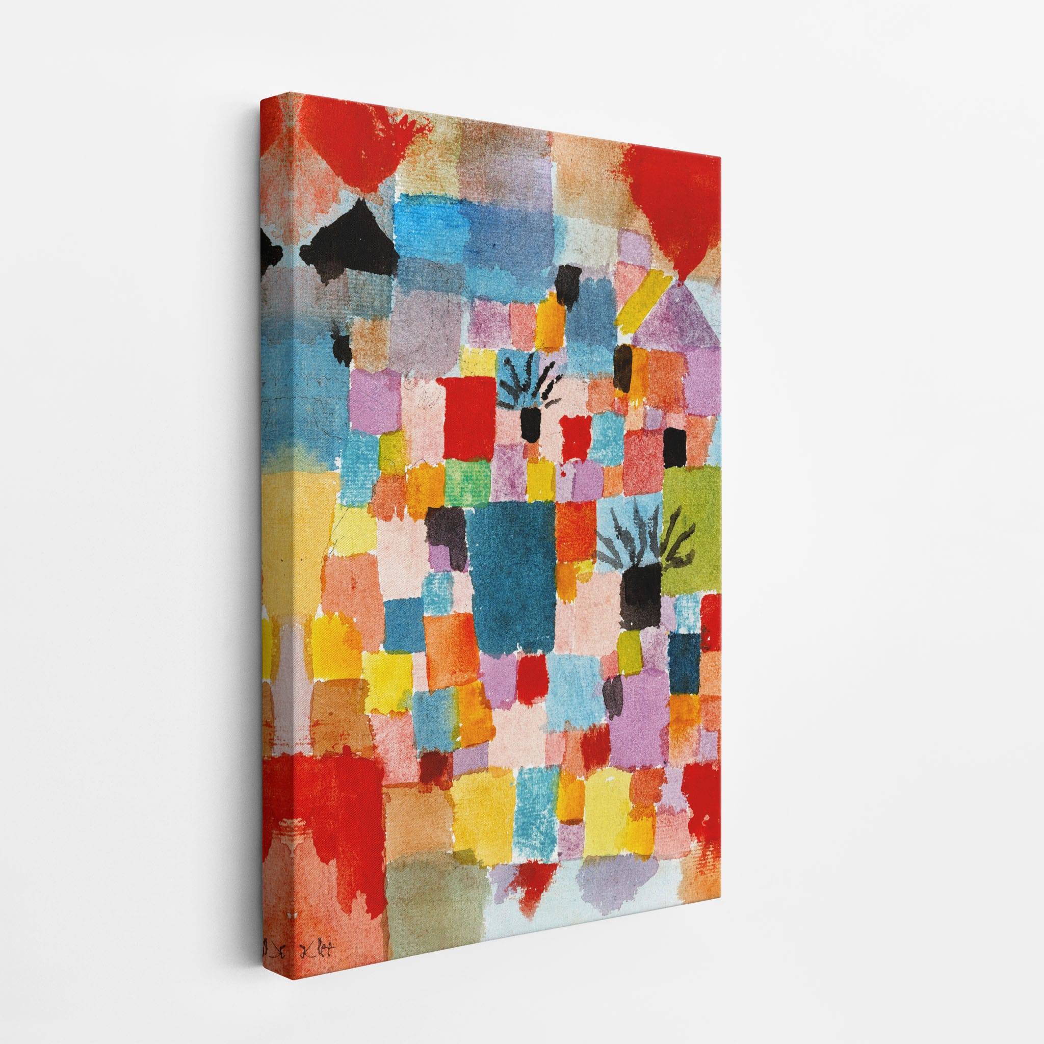 This artwork is titled "Southern Gardens" by Paul Klee, painted in 1919. A mosaic of luminous, overlapping color blocks forms a rhythmic gardenscape, bursting with reds, yellows, purples, and aqua blues. Amid the patchwork, stylized black tree motifs emerge like silhouettes rooted in vibrant soil, subtly grounding the composition. The geometric fragmentation, paired with organic forms and delicate textural washes, showcases Klee’s intuitive balance between abstraction and poetic symbolism. The composition suggests a sun-soaked, dreamlike terrain viewed through a prism of pure color. Offered as a fine art reproduction created from a high-resolution image of the original, this piece brings energy and painterly charm to modern interiors.