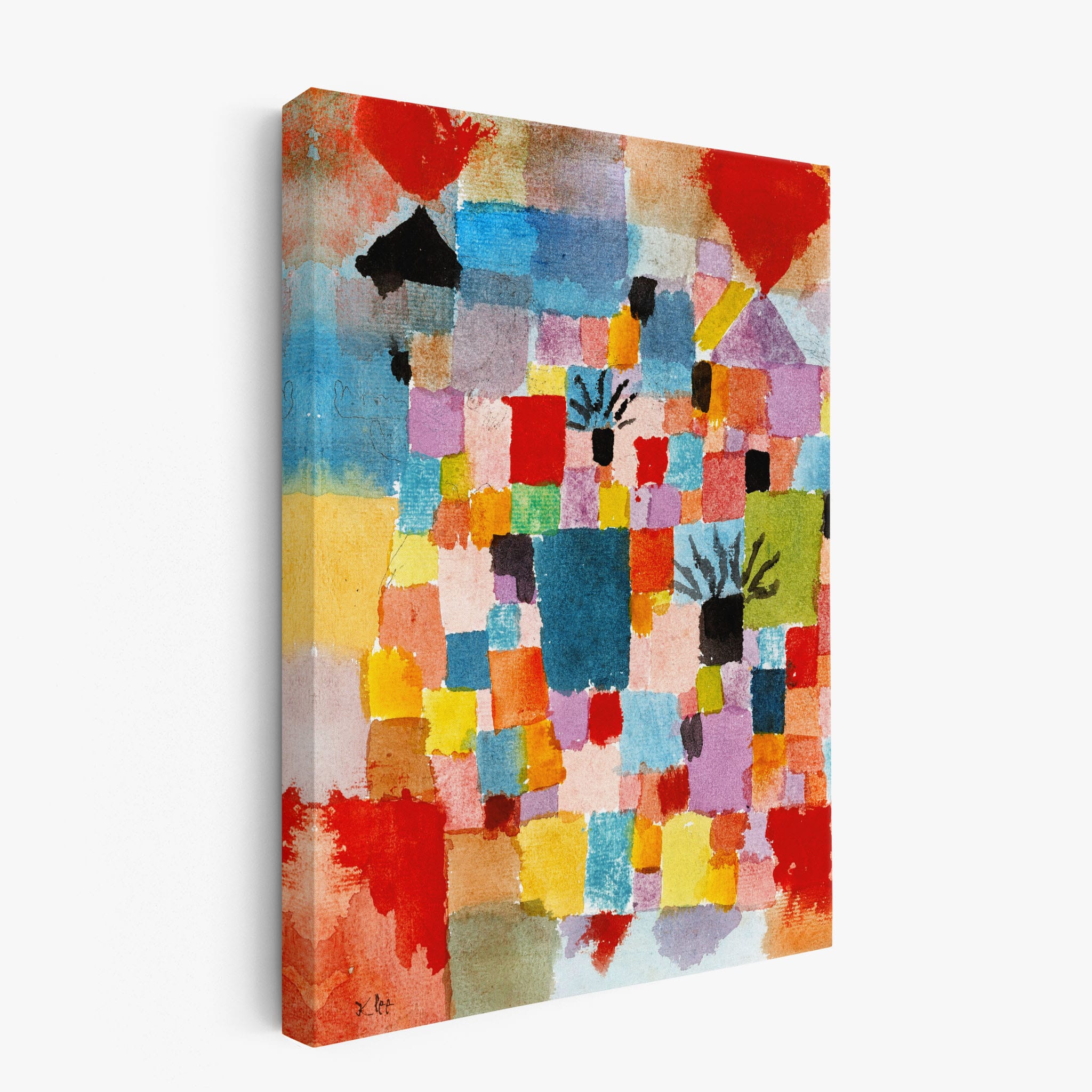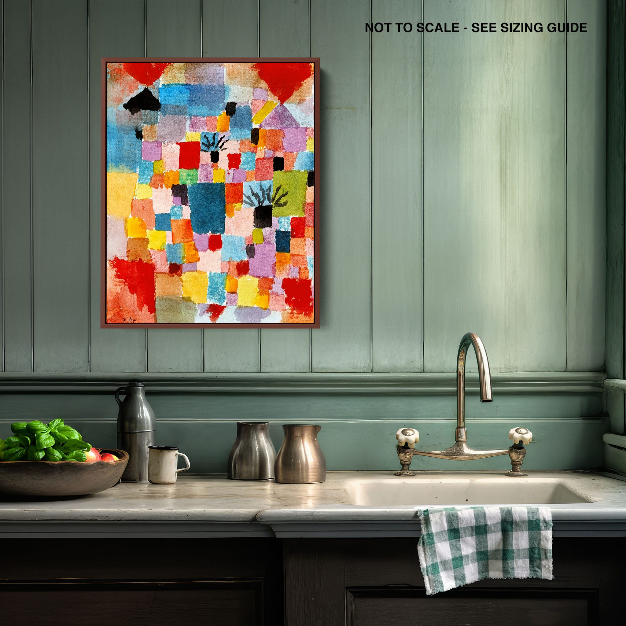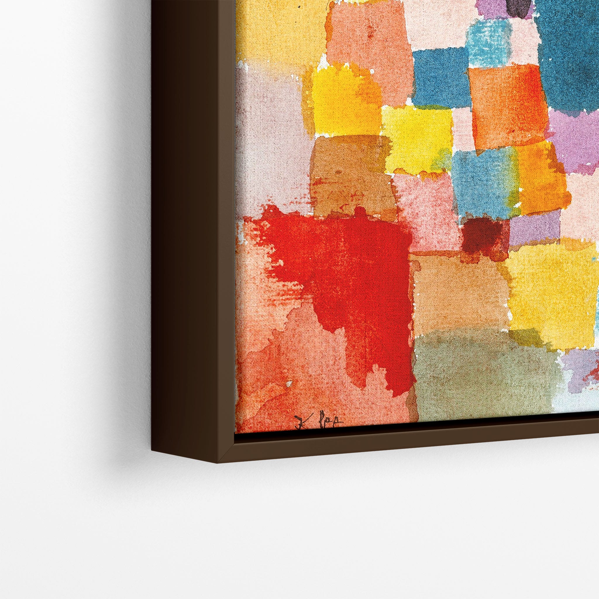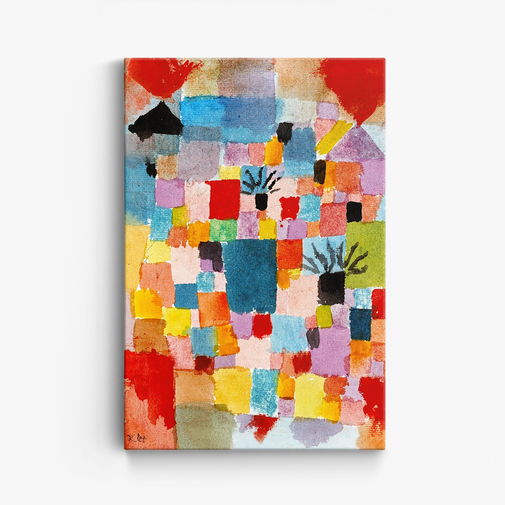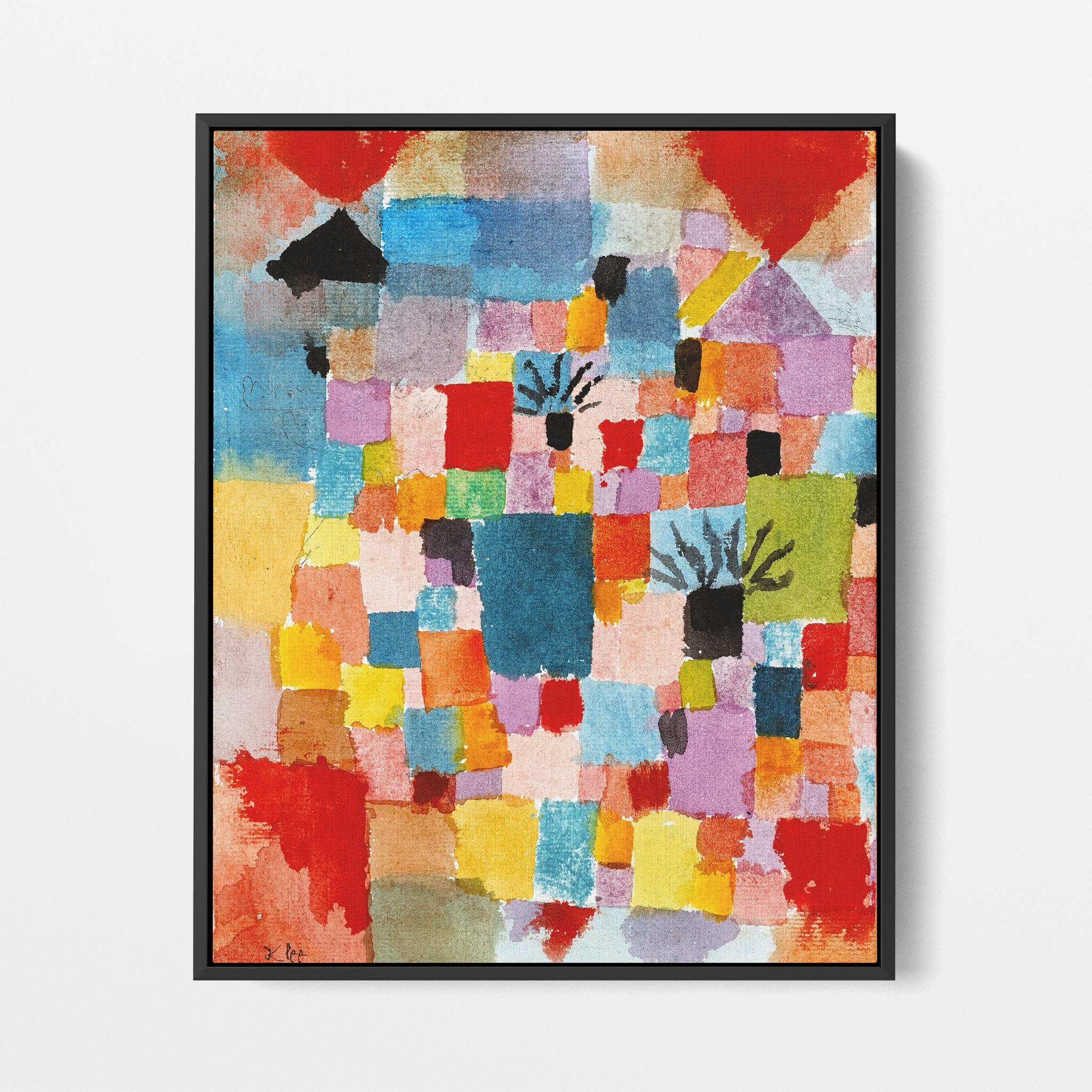 This artwork is titled "Southern Gardens" by Paul Klee, painted in 1919. A mosaic of luminous, overlapping color blocks forms a rhythmic gardenscape, bursting with reds, yellows, purples, and aqua blues. Amid the patchwork, stylized black tree motifs emerge like silhouettes rooted in vibrant soil, subtly grounding the composition. The geometric fragmentation, paired with organic forms and delicate textural washes, showcases Klee’s intuitive balance between abstraction and poetic symbolism. The composition suggests a sun-soaked, dreamlike terrain viewed through a prism of pure color. Offered as a fine art reproduction created from a high-resolution image of the original, this piece brings energy and painterly charm to modern interiors.