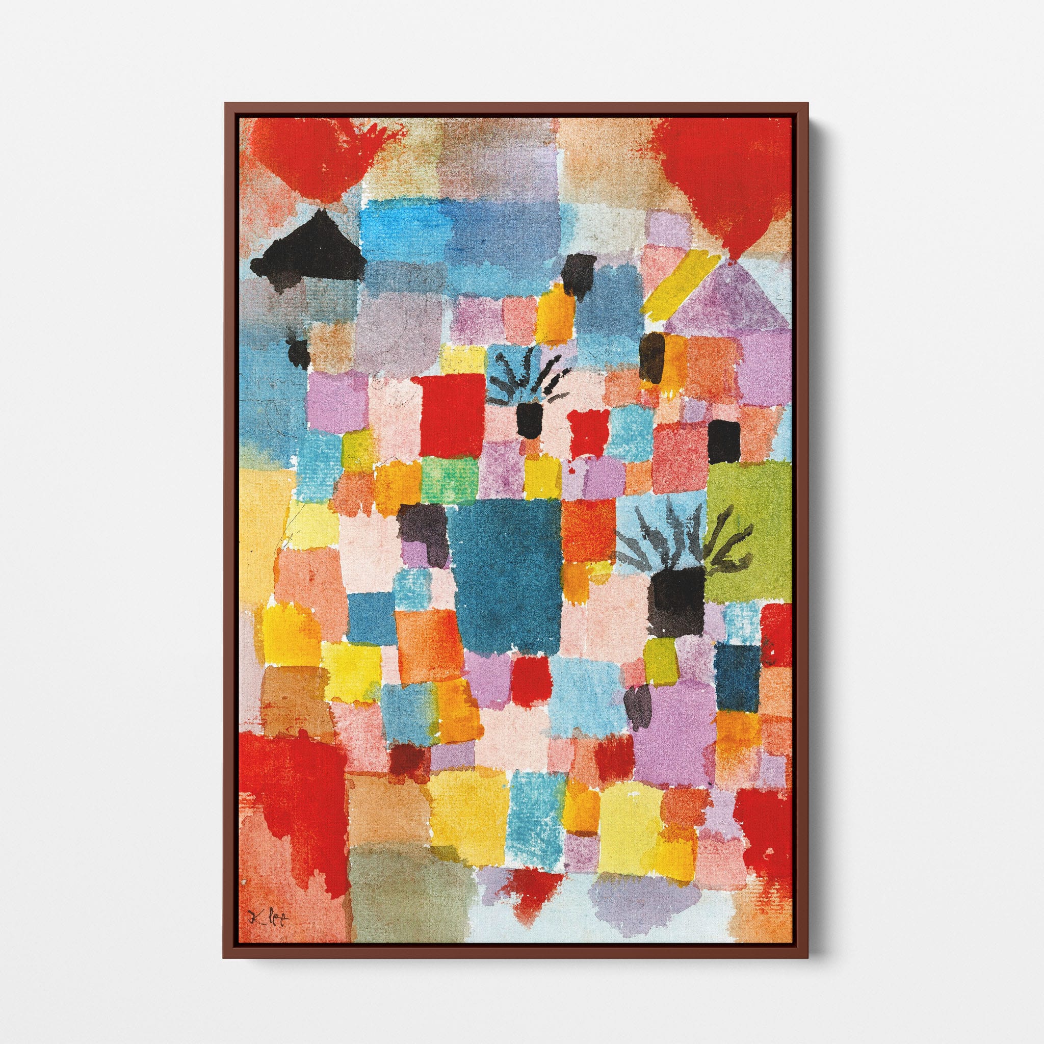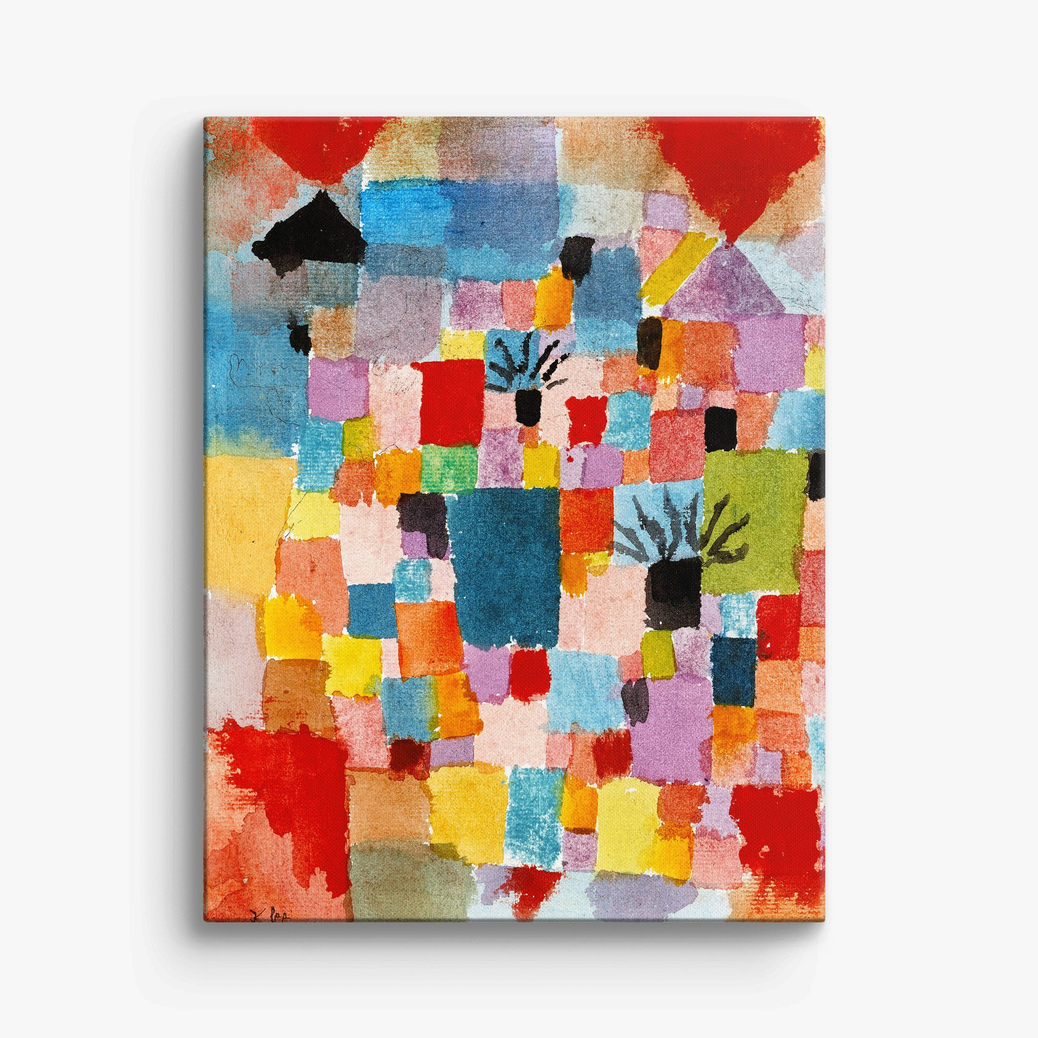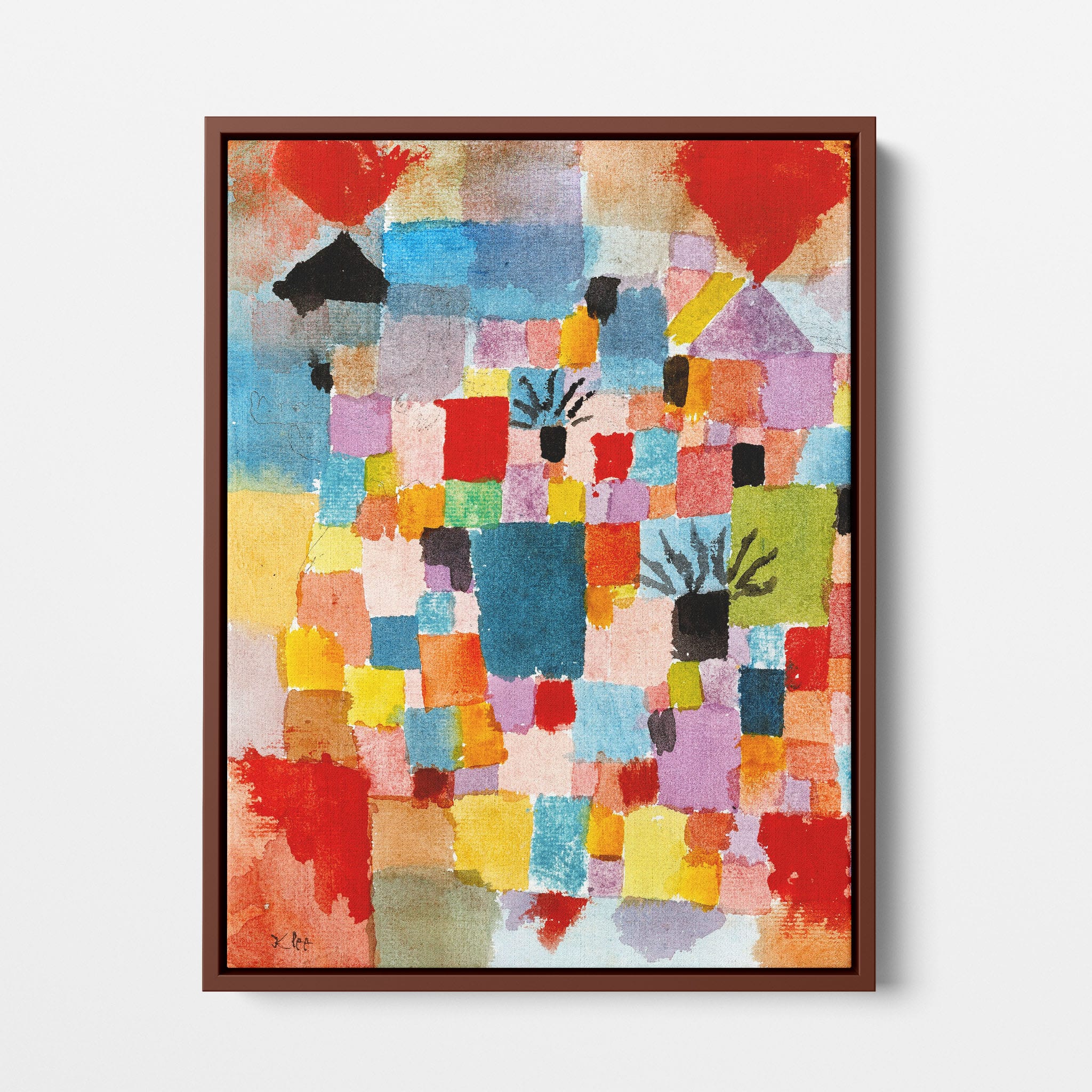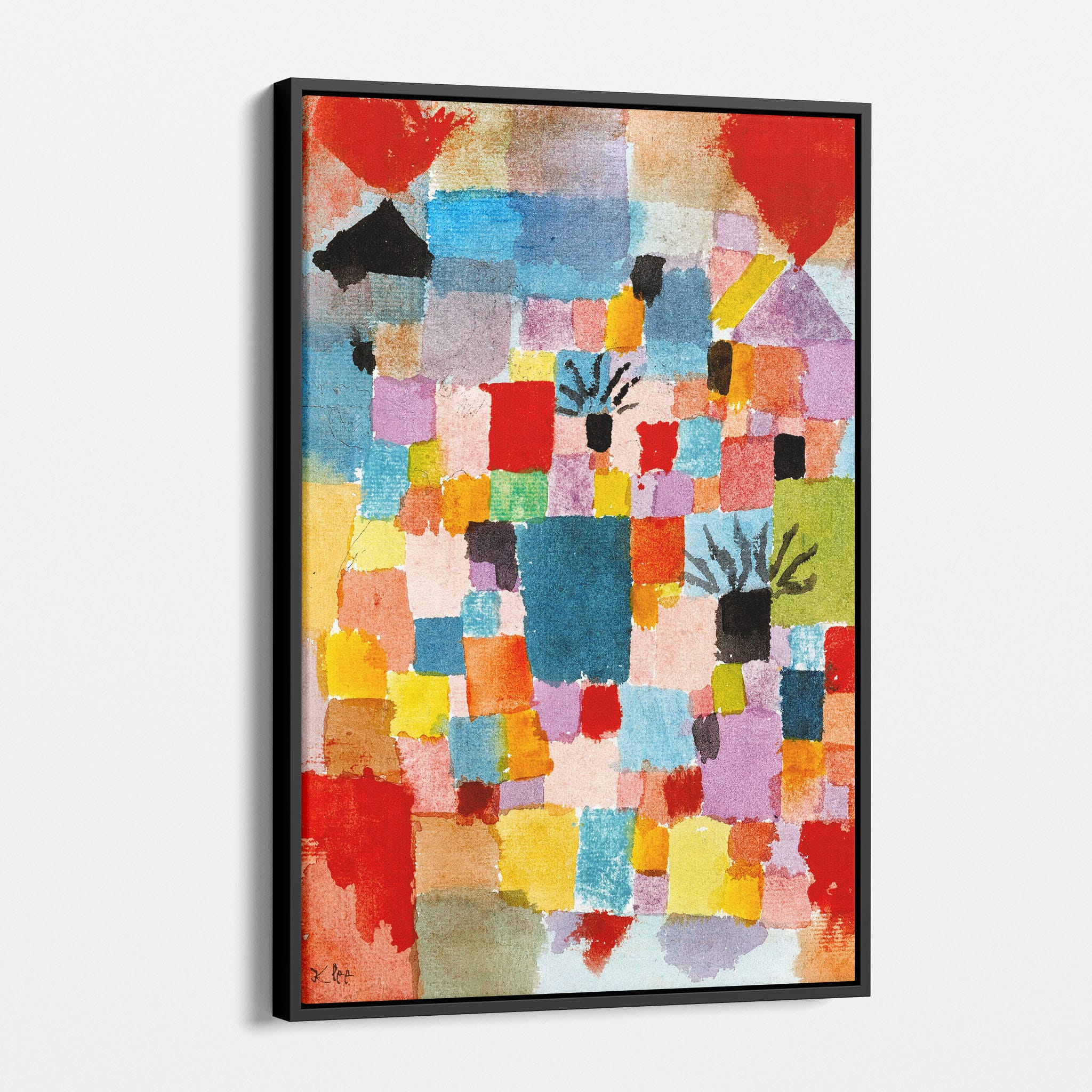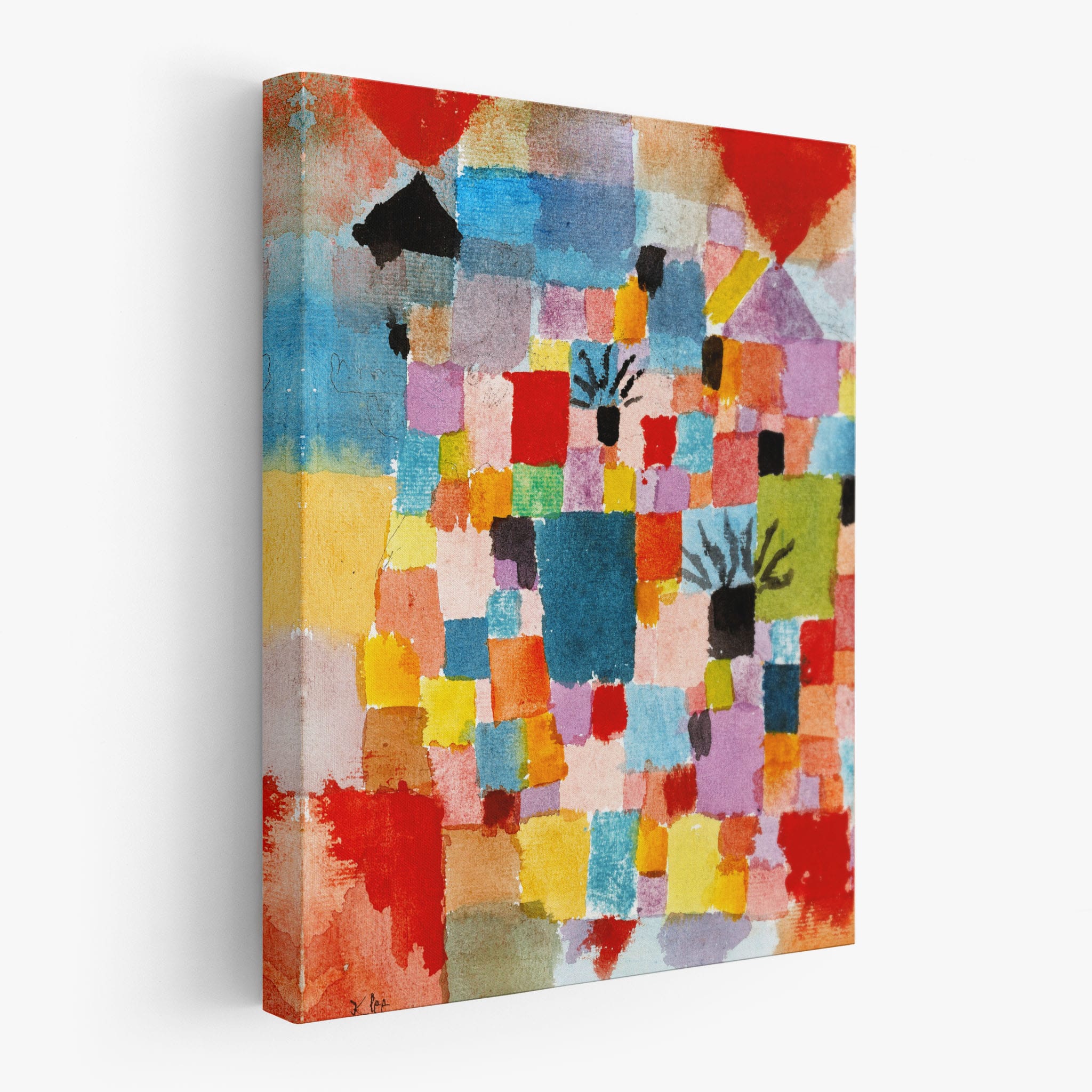 This artwork is titled "Southern Gardens" by Paul Klee, painted in 1919. A mosaic of luminous, overlapping color blocks forms a rhythmic gardenscape, bursting with reds, yellows, purples, and aqua blues. Amid the patchwork, stylized black tree motifs emerge like silhouettes rooted in vibrant soil, subtly grounding the composition. The geometric fragmentation, paired with organic forms and delicate textural washes, showcases Klee’s intuitive balance between abstraction and poetic symbolism. The composition suggests a sun-soaked, dreamlike terrain viewed through a prism of pure color. Offered as a fine art reproduction created from a high-resolution image of the original, this piece brings energy and painterly charm to modern interiors.