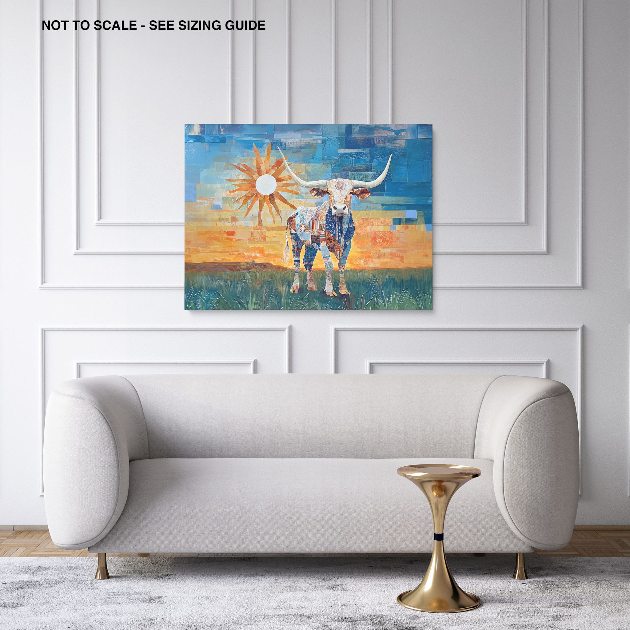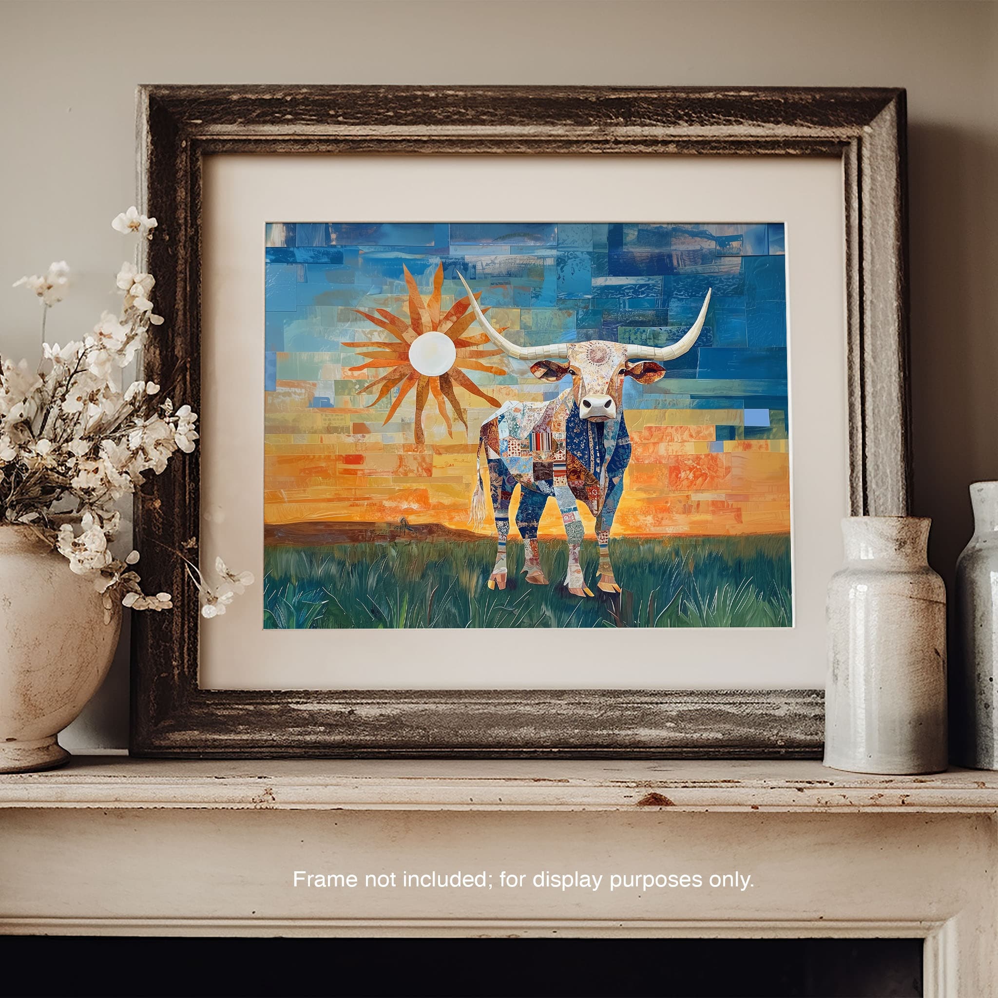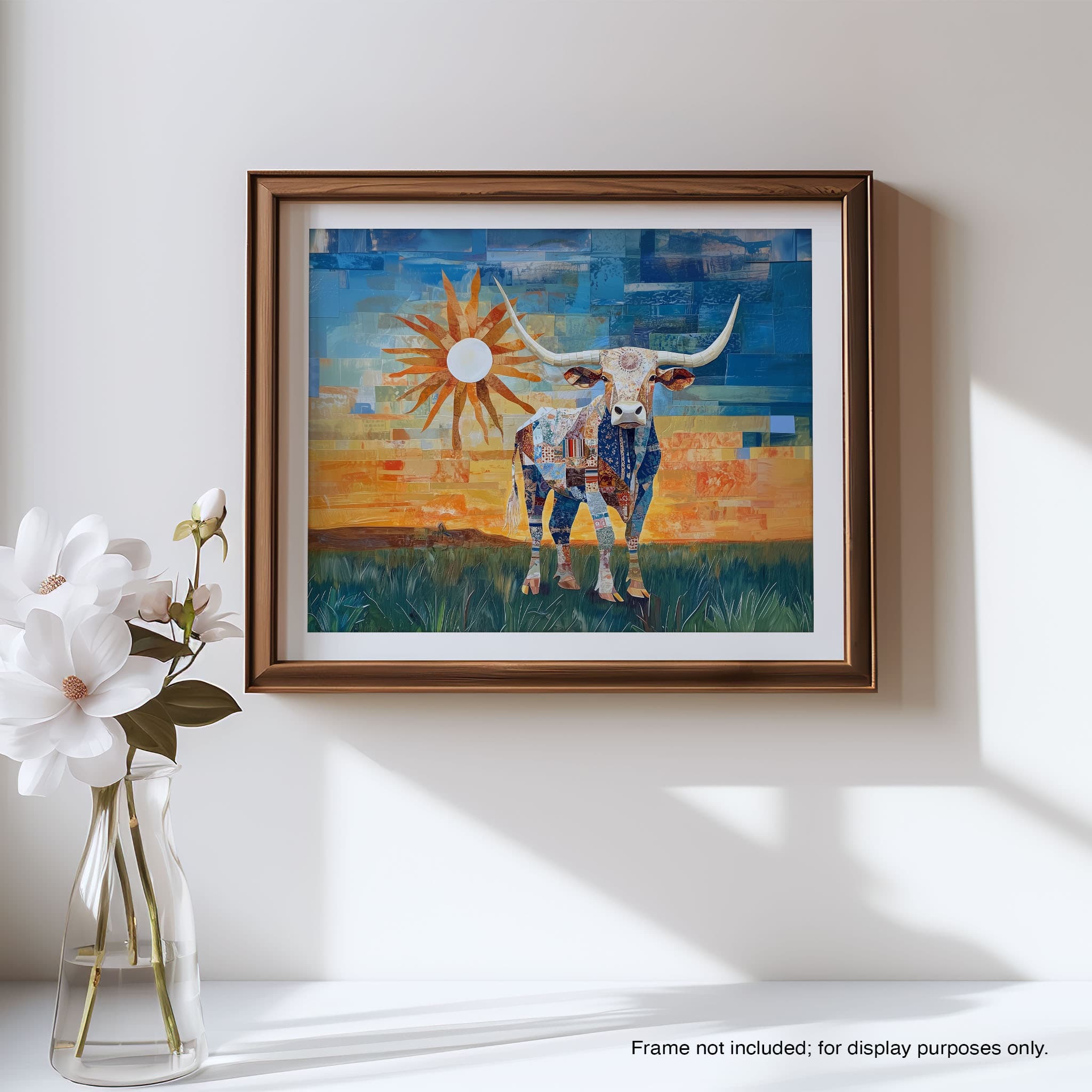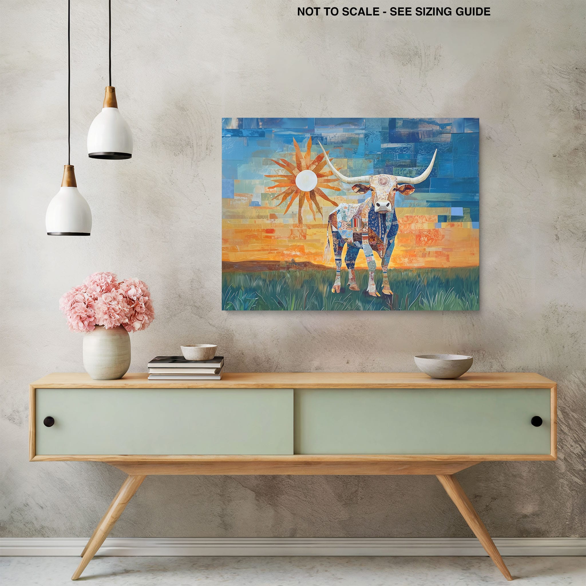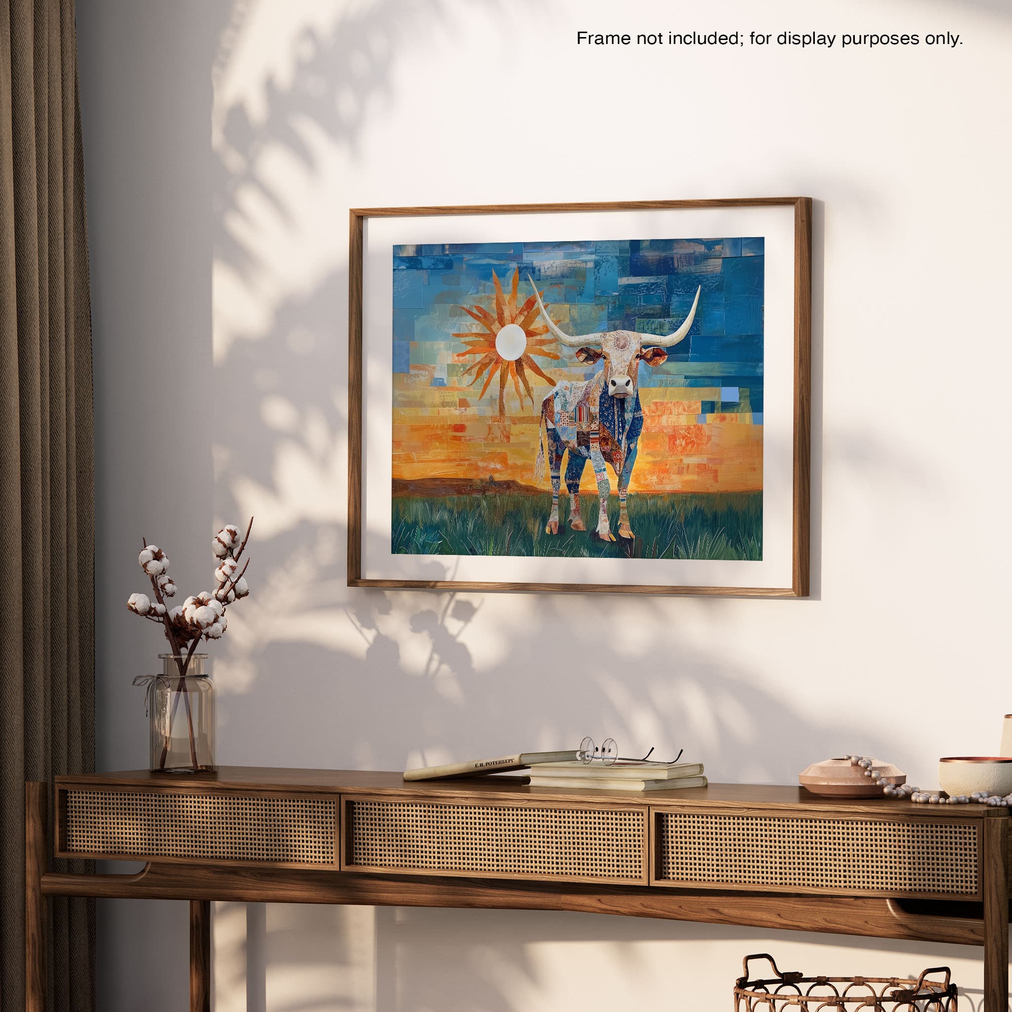 Infuse your space with the vibrant soul of the American Southwest. Southwestern Sunset Tapestry is a masterful textile illustration capturing a majestic longhorn basking under a radiant, mosaic sun. Each piece brings together intricate patterns and rich hues, creating a colorful tapestry that symbolizes resilience and freedom. The blend of mosaic artistry and southwestern elements makes it a perfect focal point for any room, exuding warmth and regional charm. Ideal for art enthusiasts seeking to enrich their decor with a touch of cultural heritage and artistry. Embrace the spirit of the West with this stunning conversation piece.