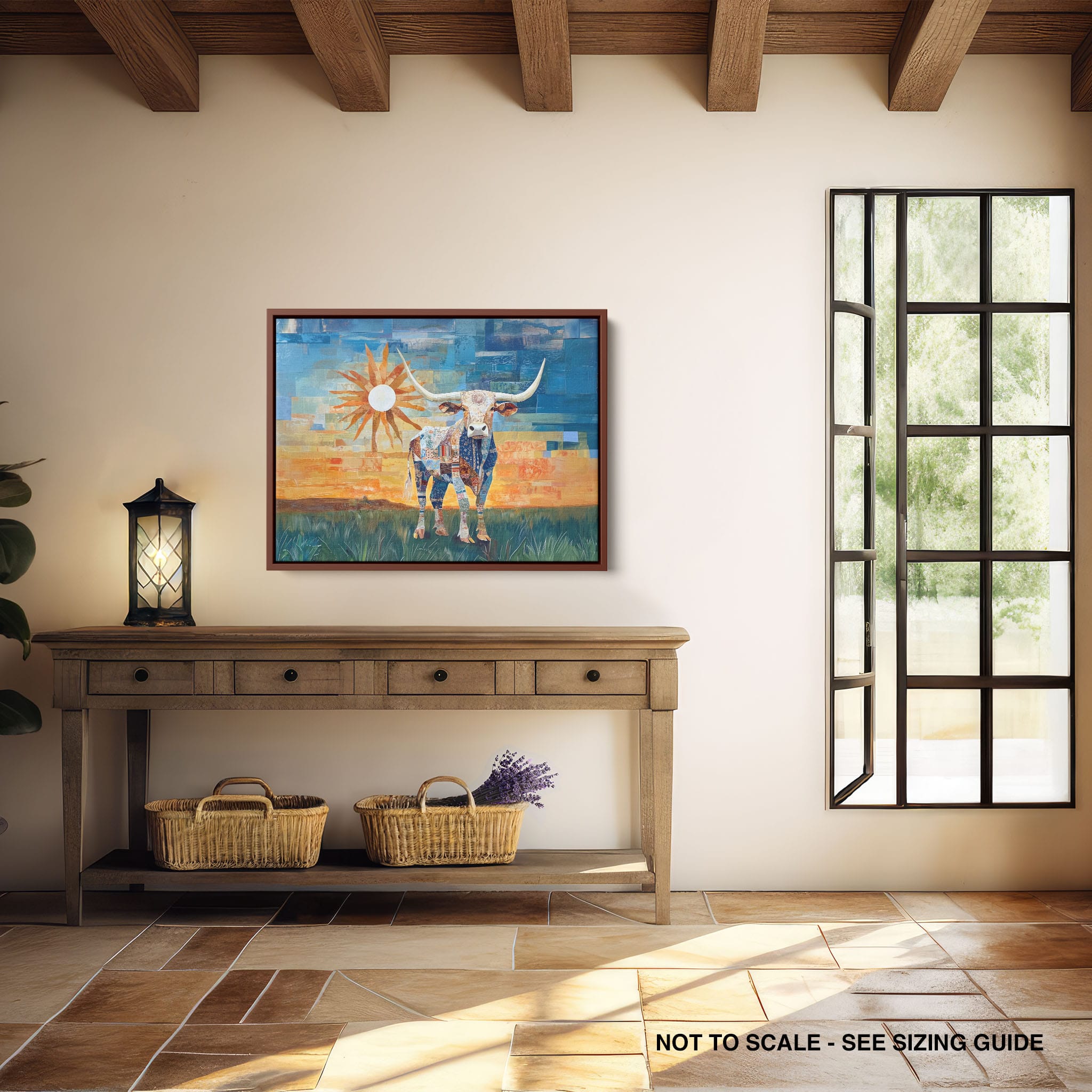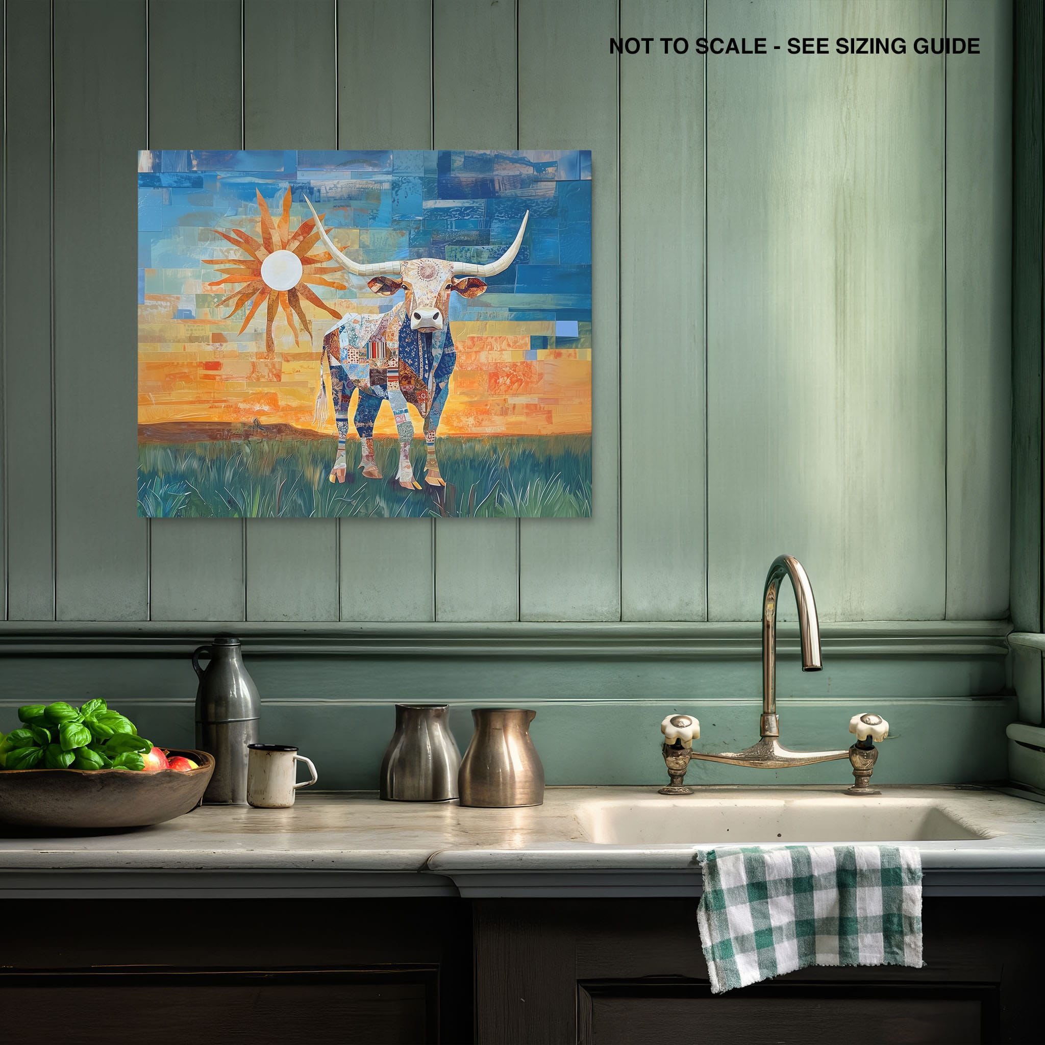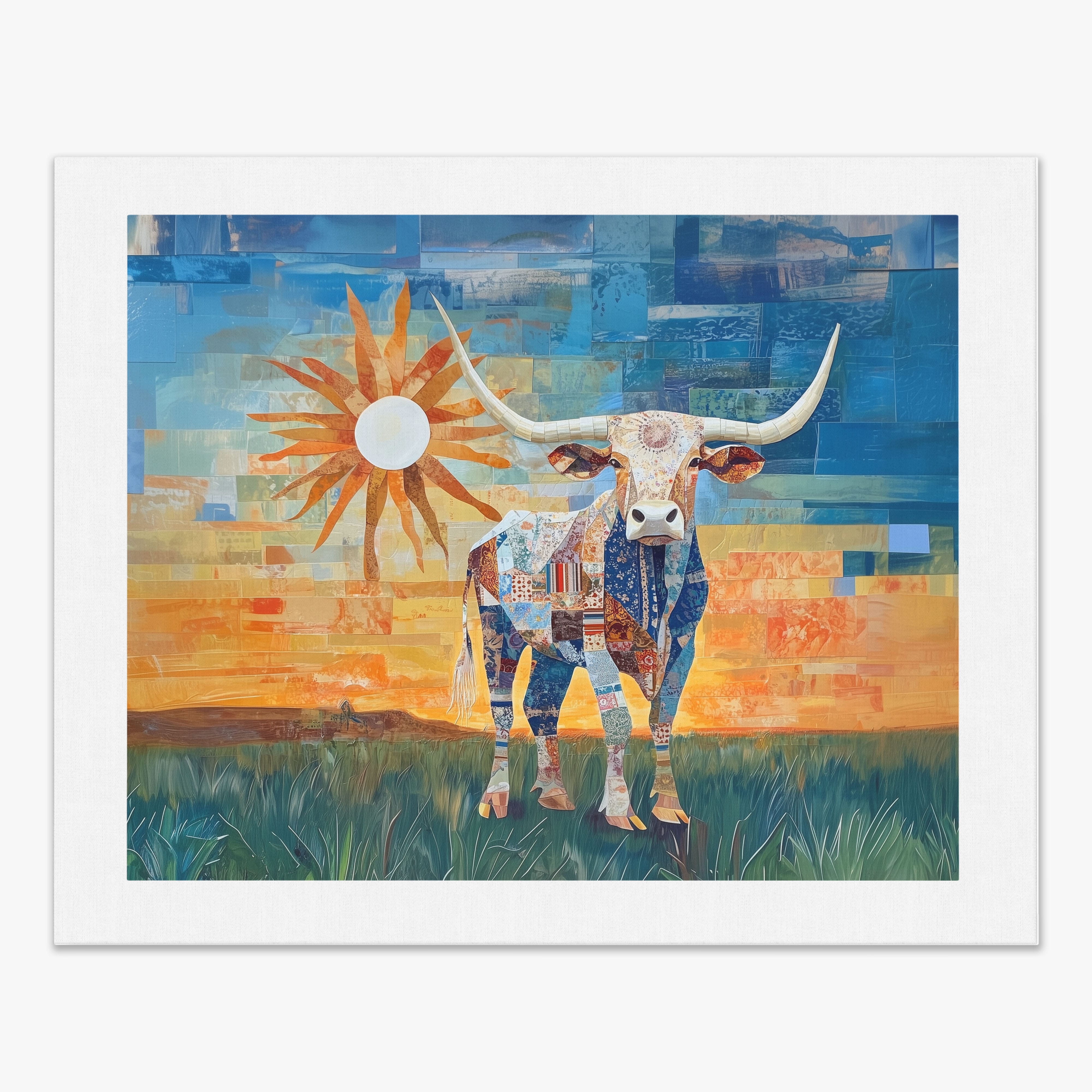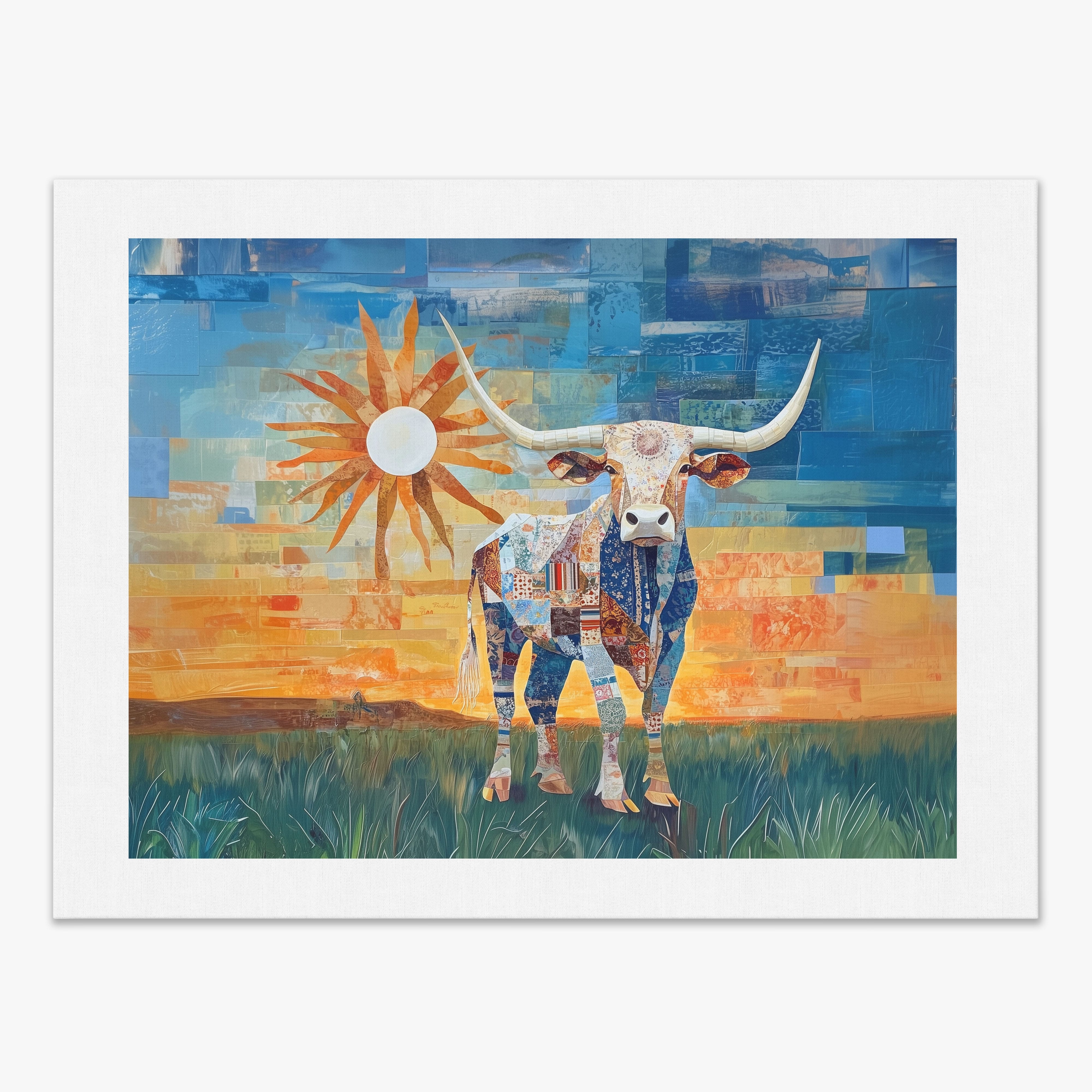 Infuse your space with the vibrant soul of the American Southwest. Southwestern Sunset Tapestry is a masterful textile illustration capturing a majestic longhorn basking under a radiant, mosaic sun. Each piece brings together intricate patterns and rich hues, creating a colorful tapestry that symbolizes resilience and freedom. The blend of mosaic artistry and southwestern elements makes it a perfect focal point for any room, exuding warmth and regional charm. Ideal for art enthusiasts seeking to enrich their decor with a touch of cultural heritage and artistry. Embrace the spirit of the West with this stunning conversation piece.