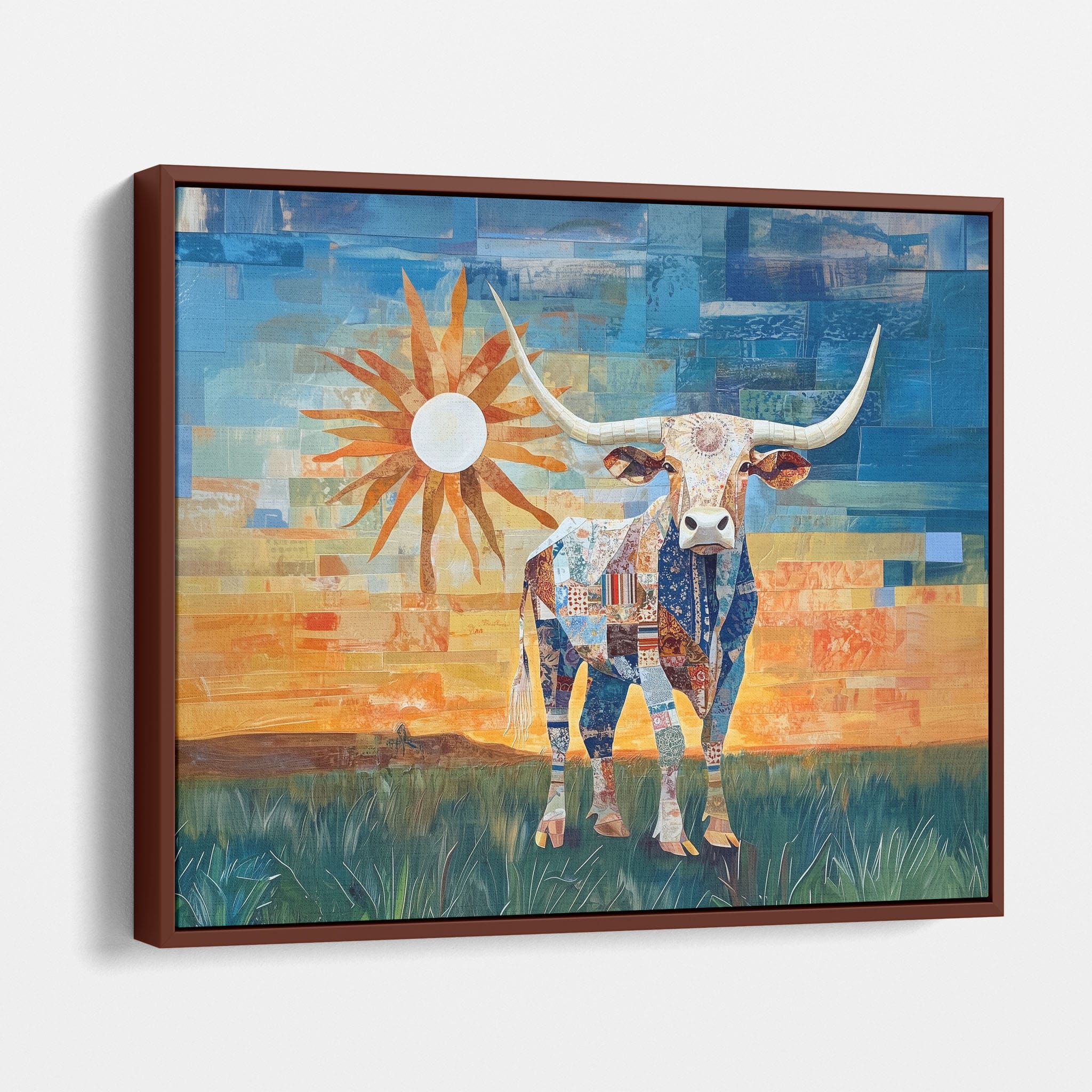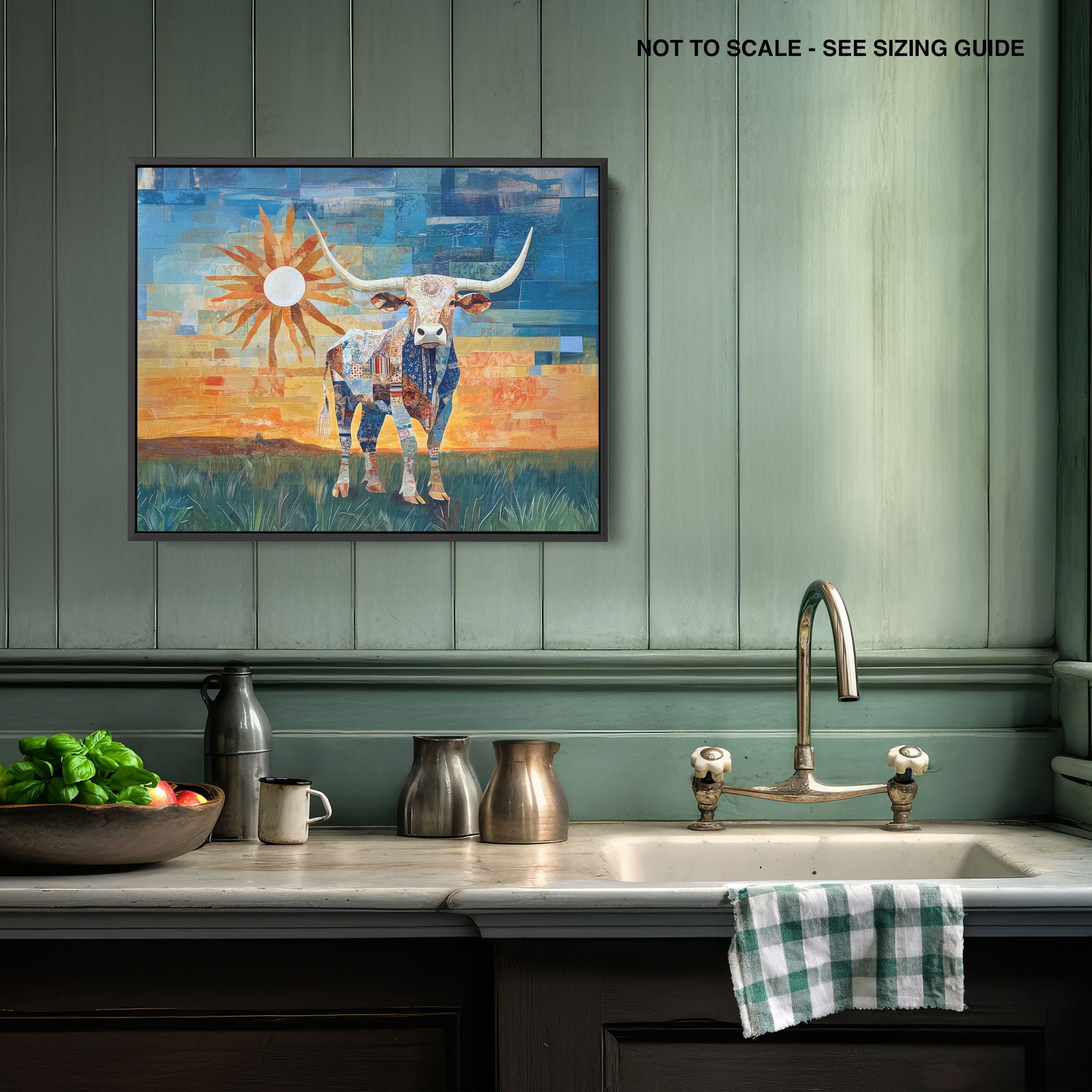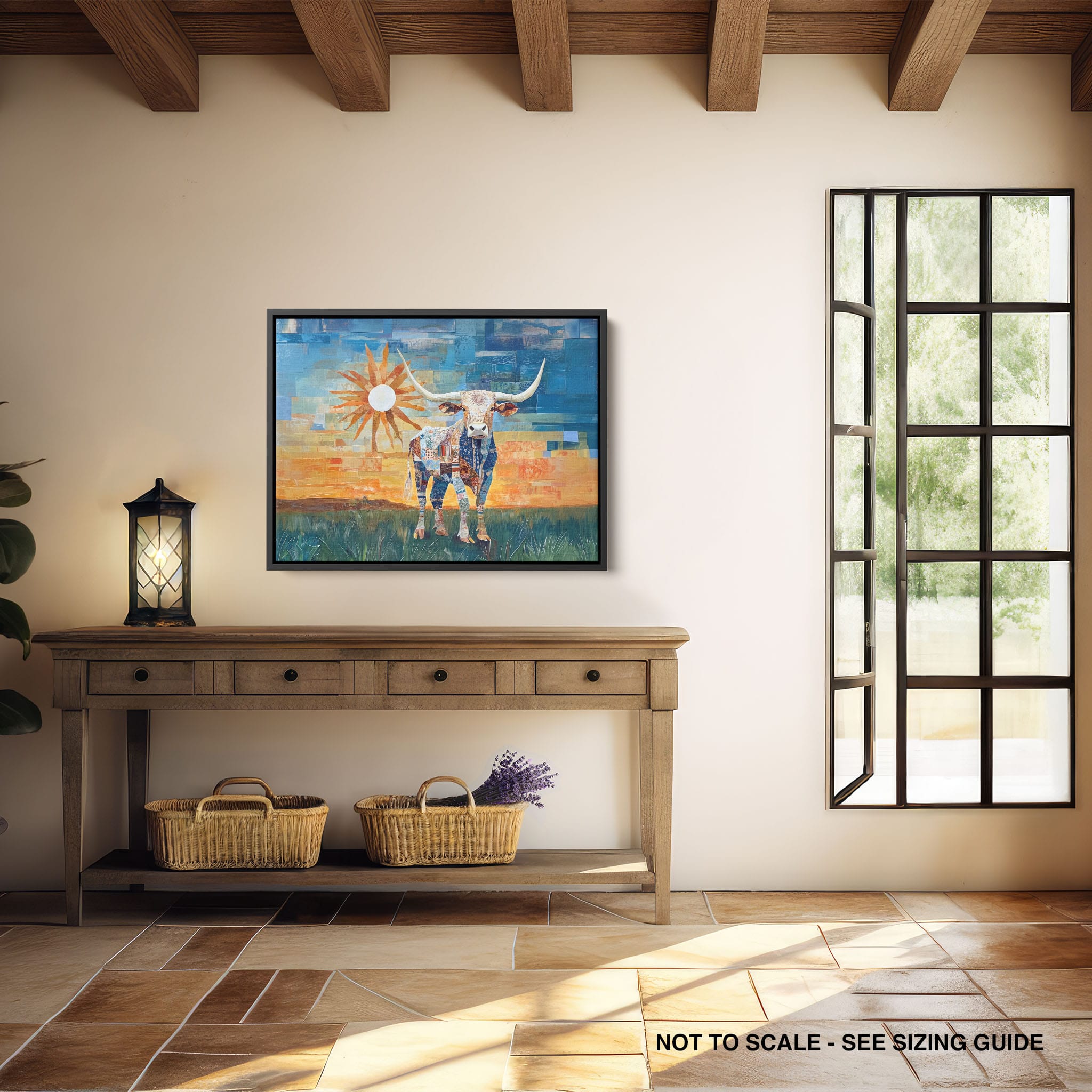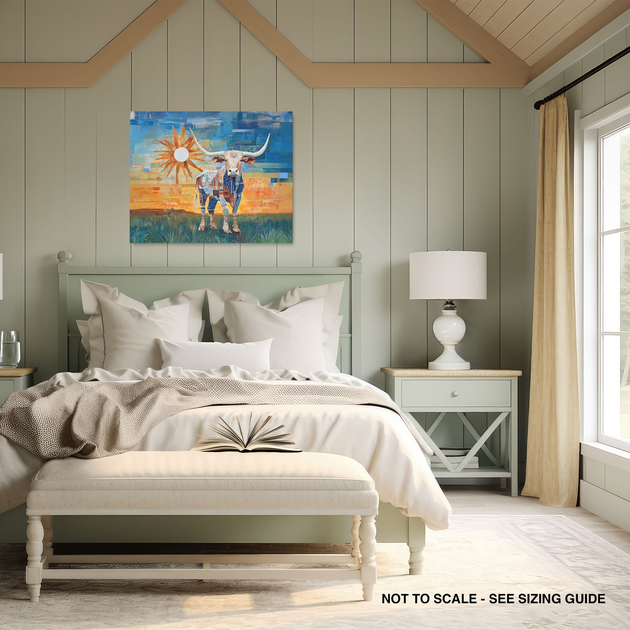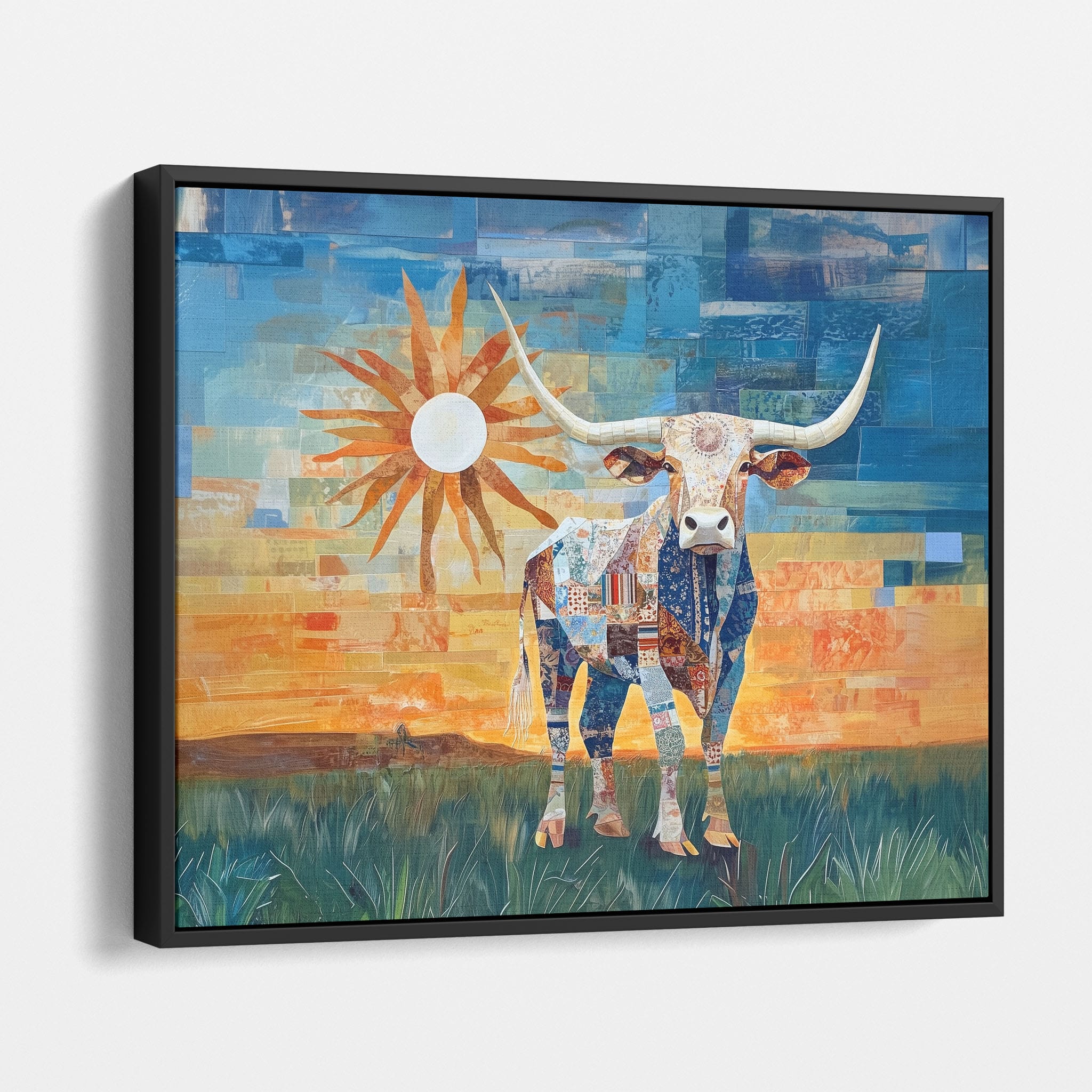 Infuse your space with the vibrant soul of the American Southwest. Southwestern Sunset Tapestry is a masterful textile illustration capturing a majestic longhorn basking under a radiant, mosaic sun. Each piece brings together intricate patterns and rich hues, creating a colorful tapestry that symbolizes resilience and freedom. The blend of mosaic artistry and southwestern elements makes it a perfect focal point for any room, exuding warmth and regional charm. Ideal for art enthusiasts seeking to enrich their decor with a touch of cultural heritage and artistry. Embrace the spirit of the West with this stunning conversation piece.