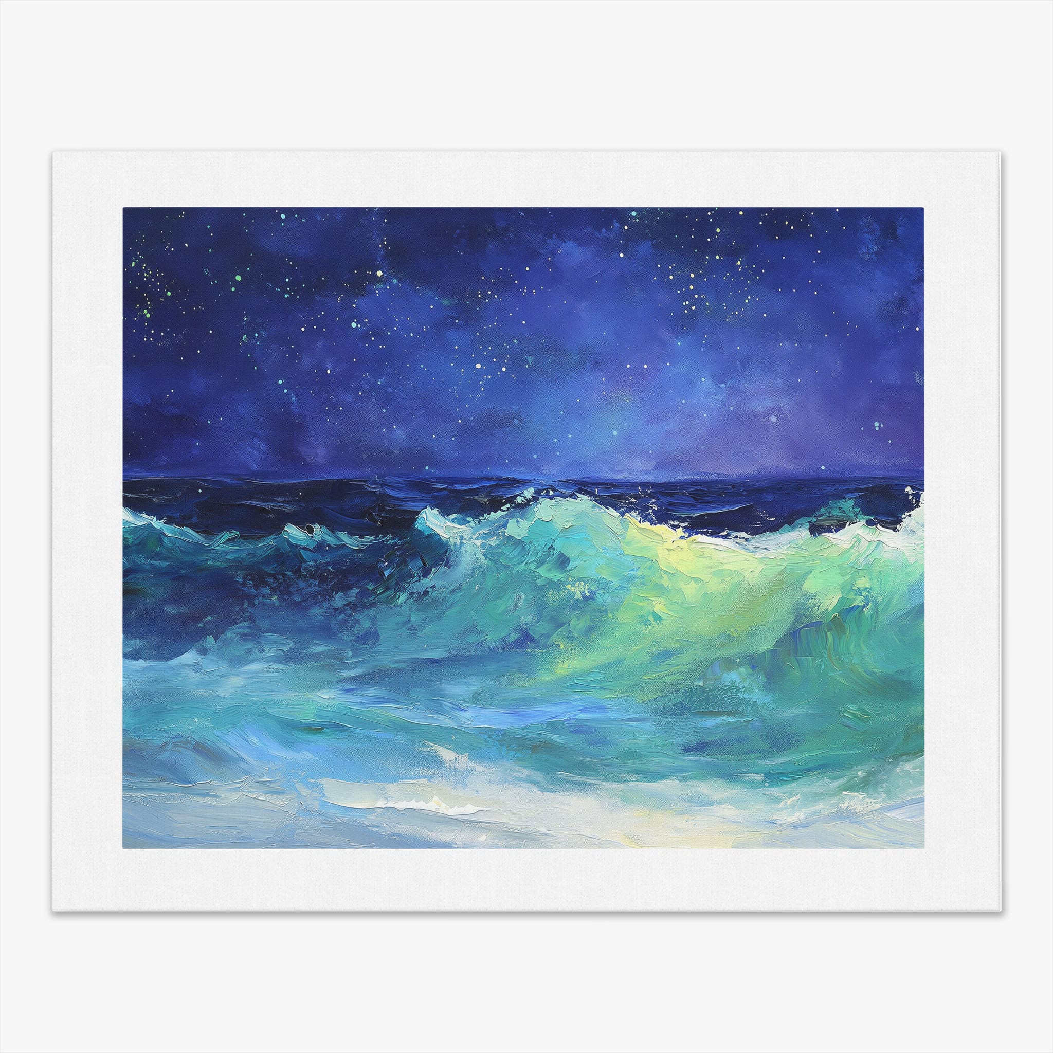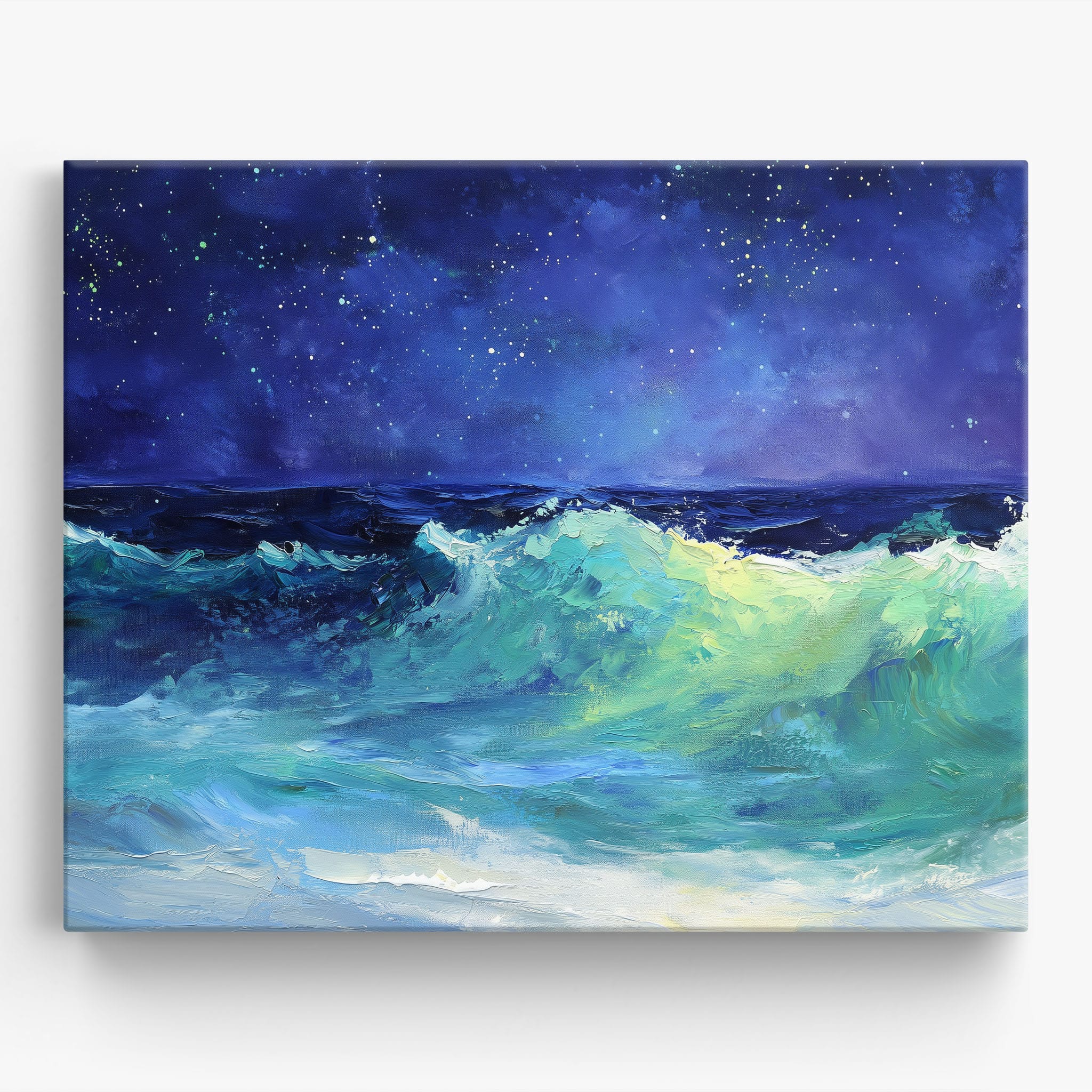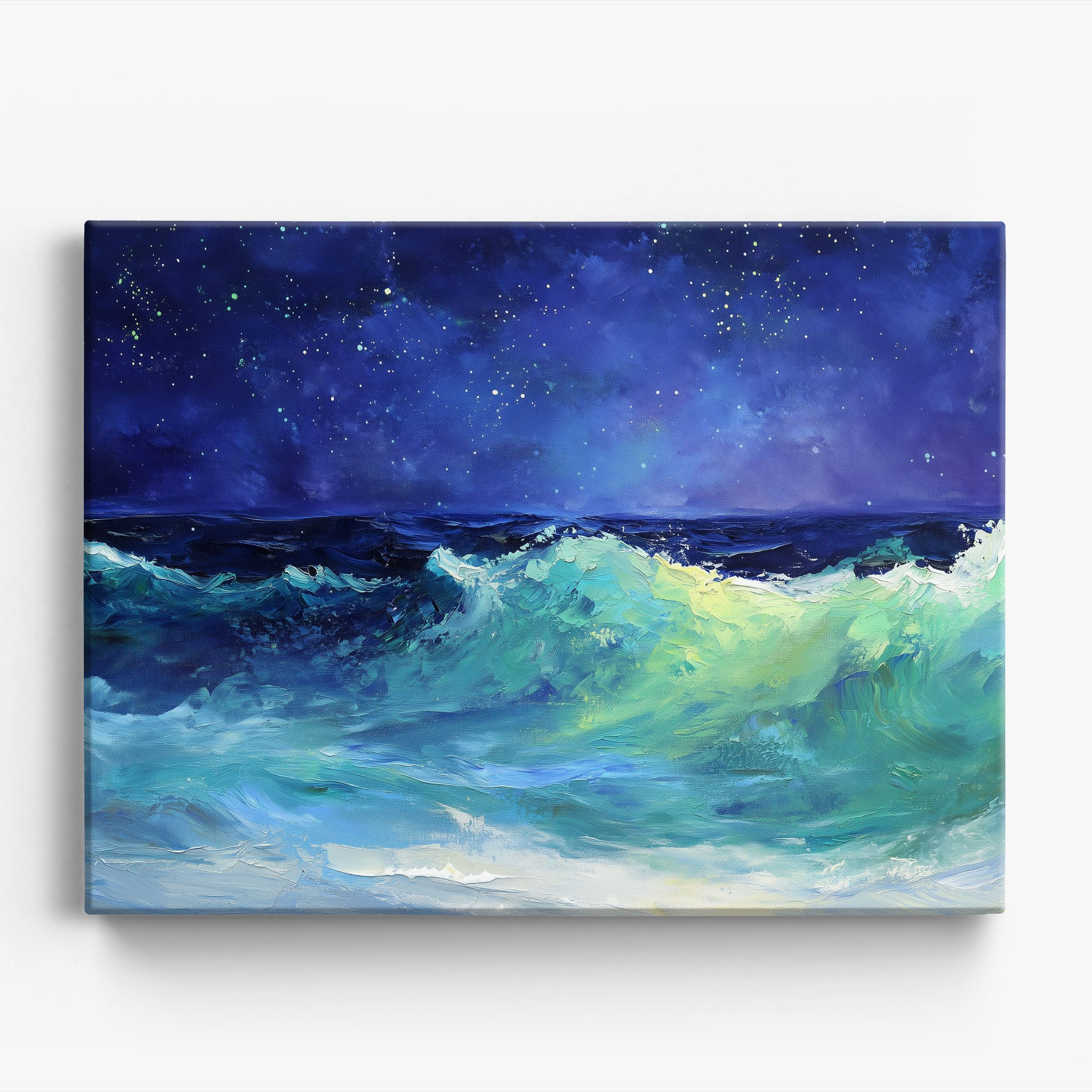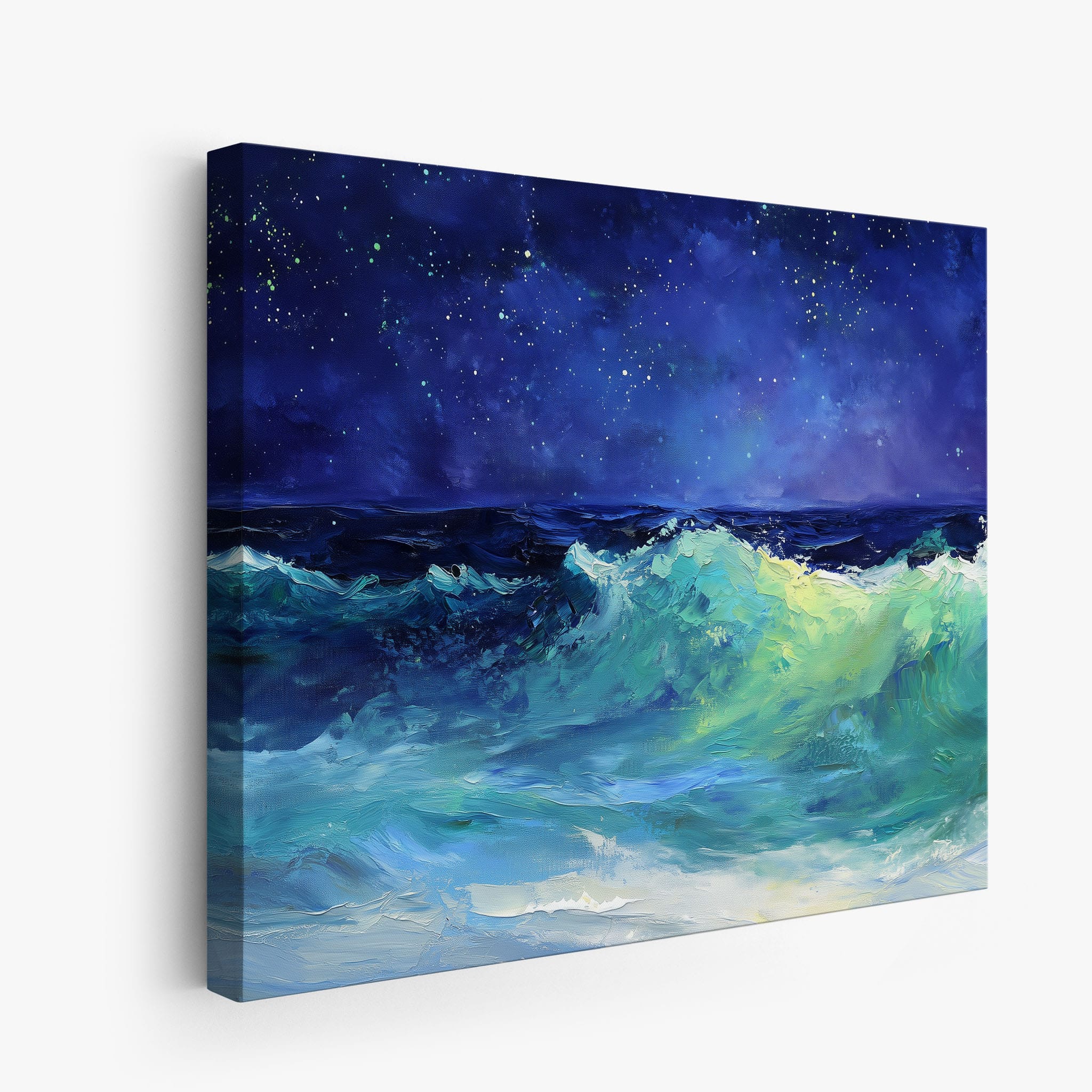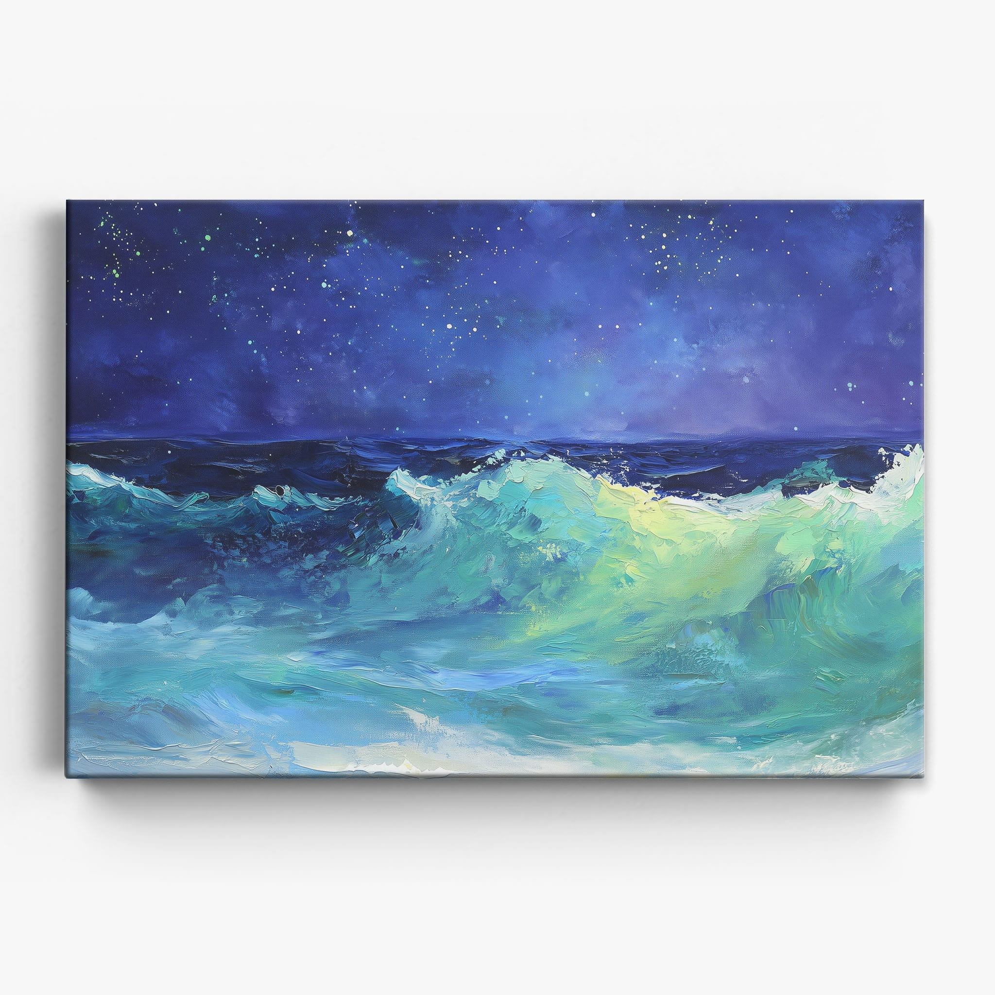 Marvel at Starlit Midnight Ocean Waves, a dynamic expressionist painting that captures the tumultuous beauty of the ocean under a star-filled sky. The rich blues and luminous greens blend dramatically, crafting waves that seem to crash beyond the canvas. The surreal touch of twinkling stars adds a magical quality, making this art piece a majestic view for any space. A blend of impressionism techniques brings the scene to life with bold strokes and vivid colors. Perfect for those looking to add a piece of the ocean's mystery to their home or office.