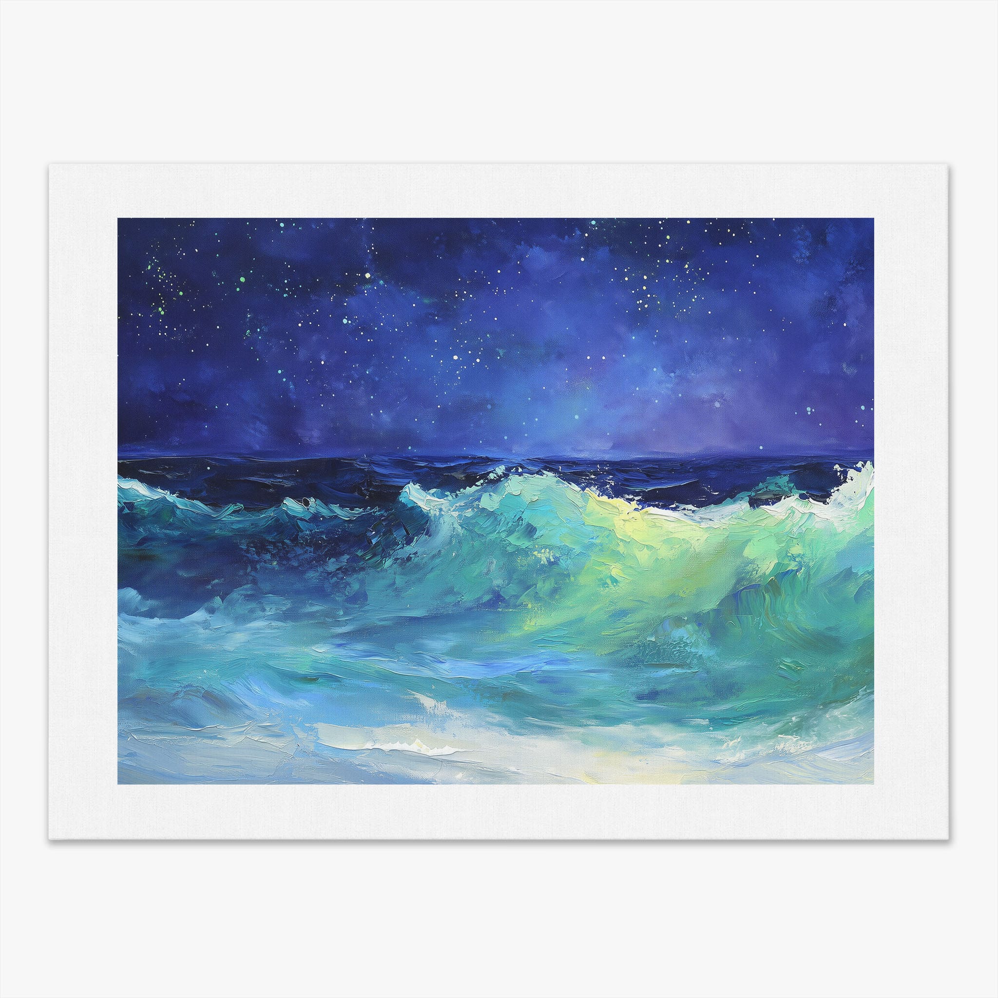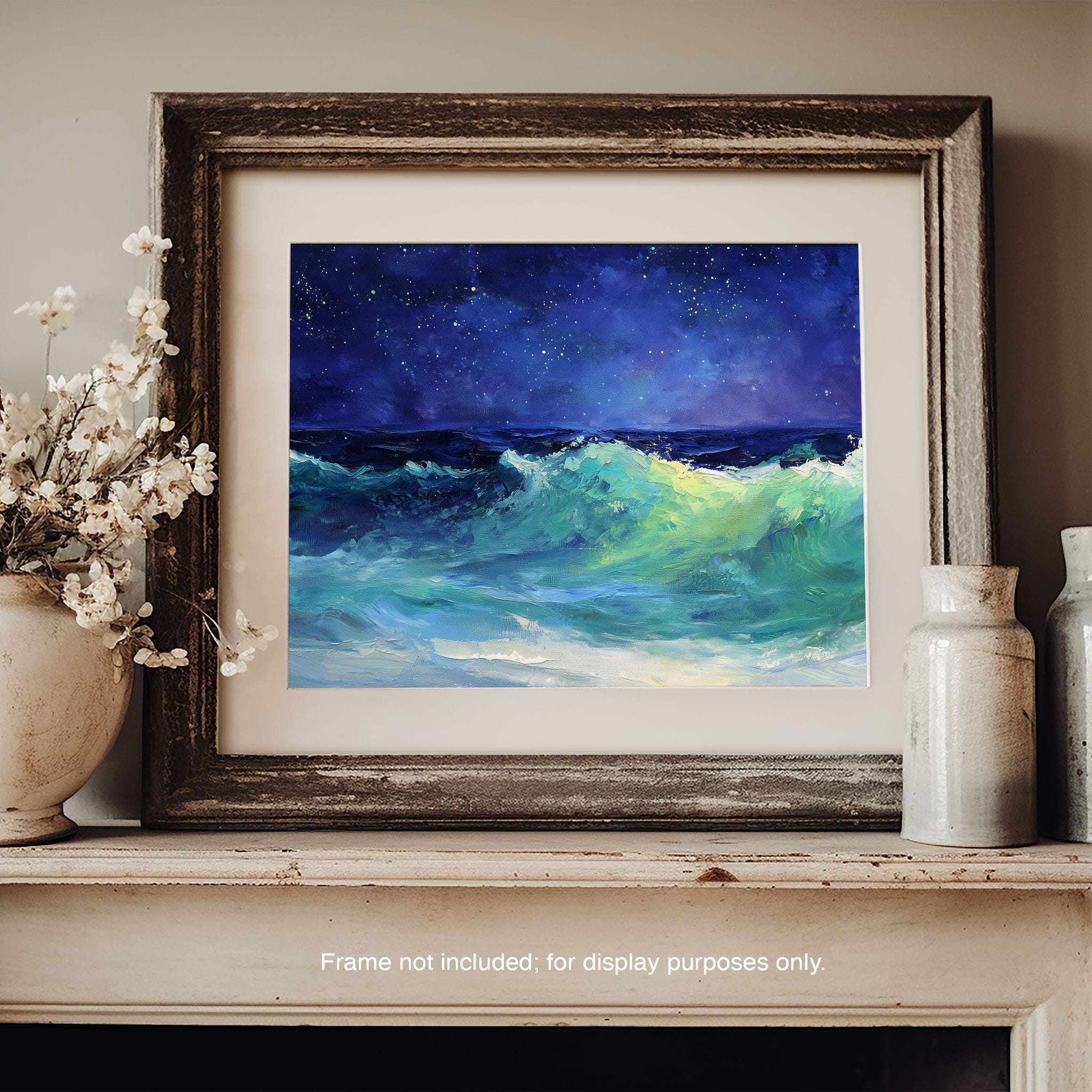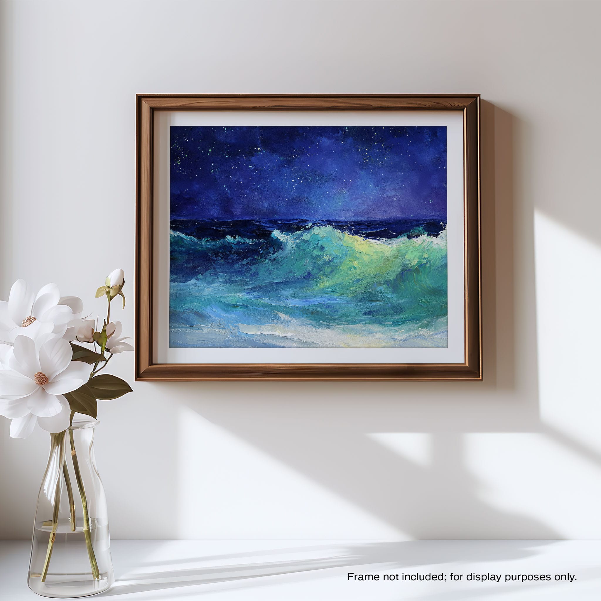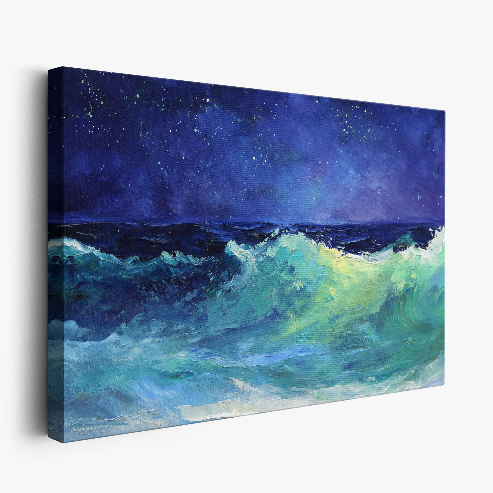 Marvel at Starlit Midnight Ocean Waves, a dynamic expressionist painting that captures the tumultuous beauty of the ocean under a star-filled sky. The rich blues and luminous greens blend dramatically, crafting waves that seem to crash beyond the canvas. The surreal touch of twinkling stars adds a magical quality, making this art piece a majestic view for any space. A blend of impressionism techniques brings the scene to life with bold strokes and vivid colors. Perfect for those looking to add a piece of the ocean's mystery to their home or office.