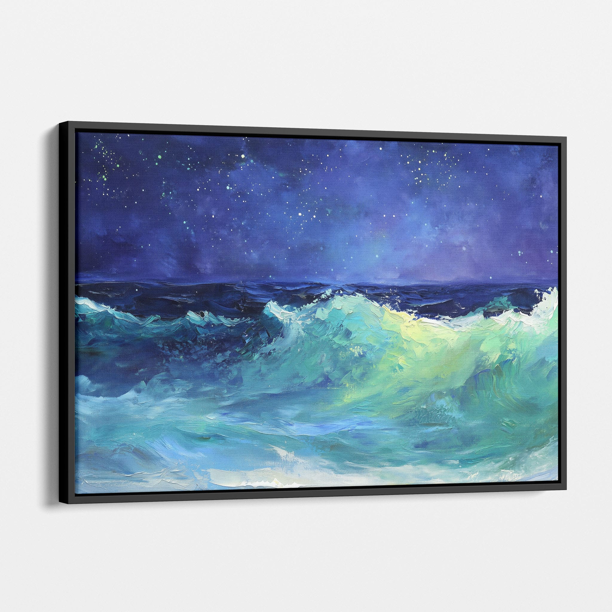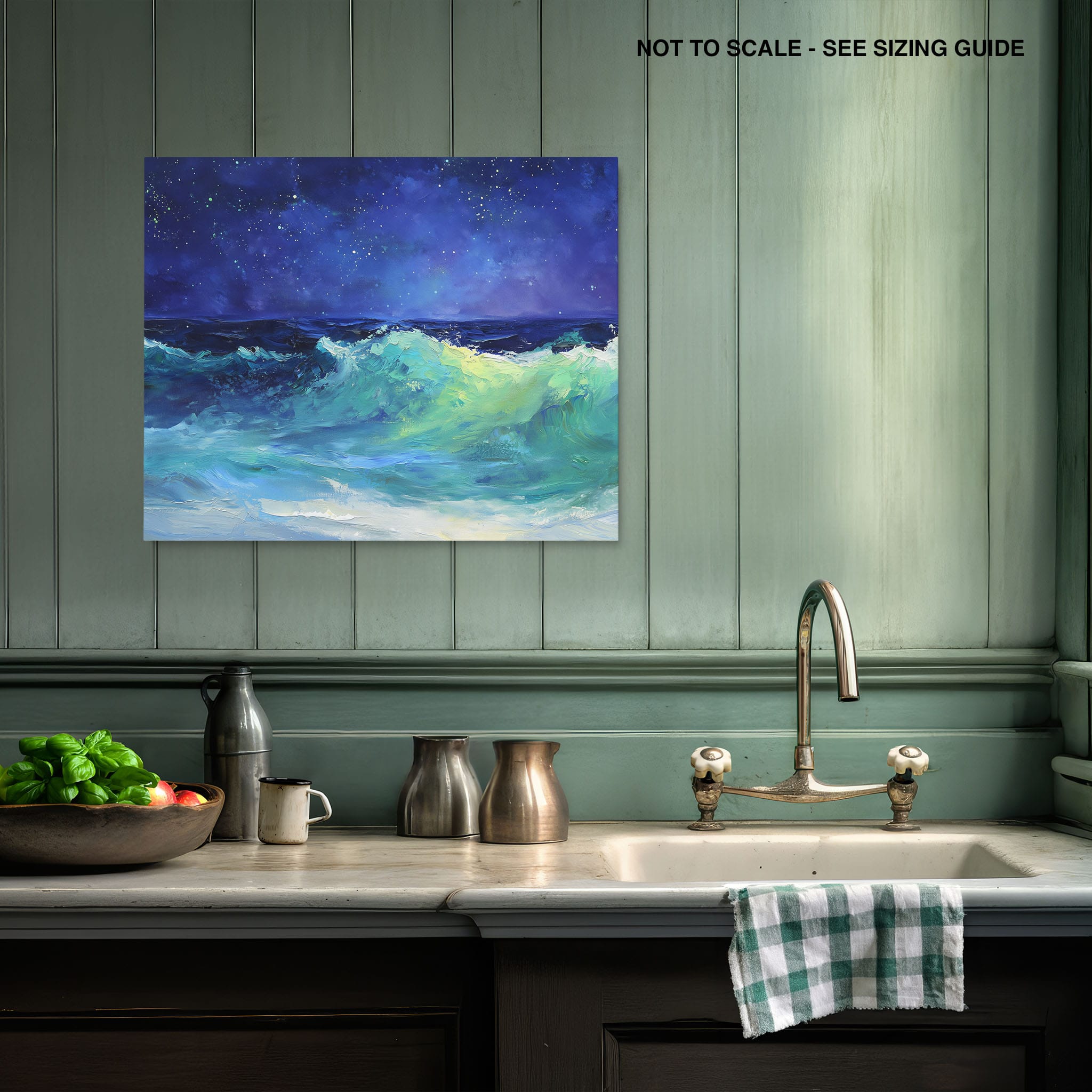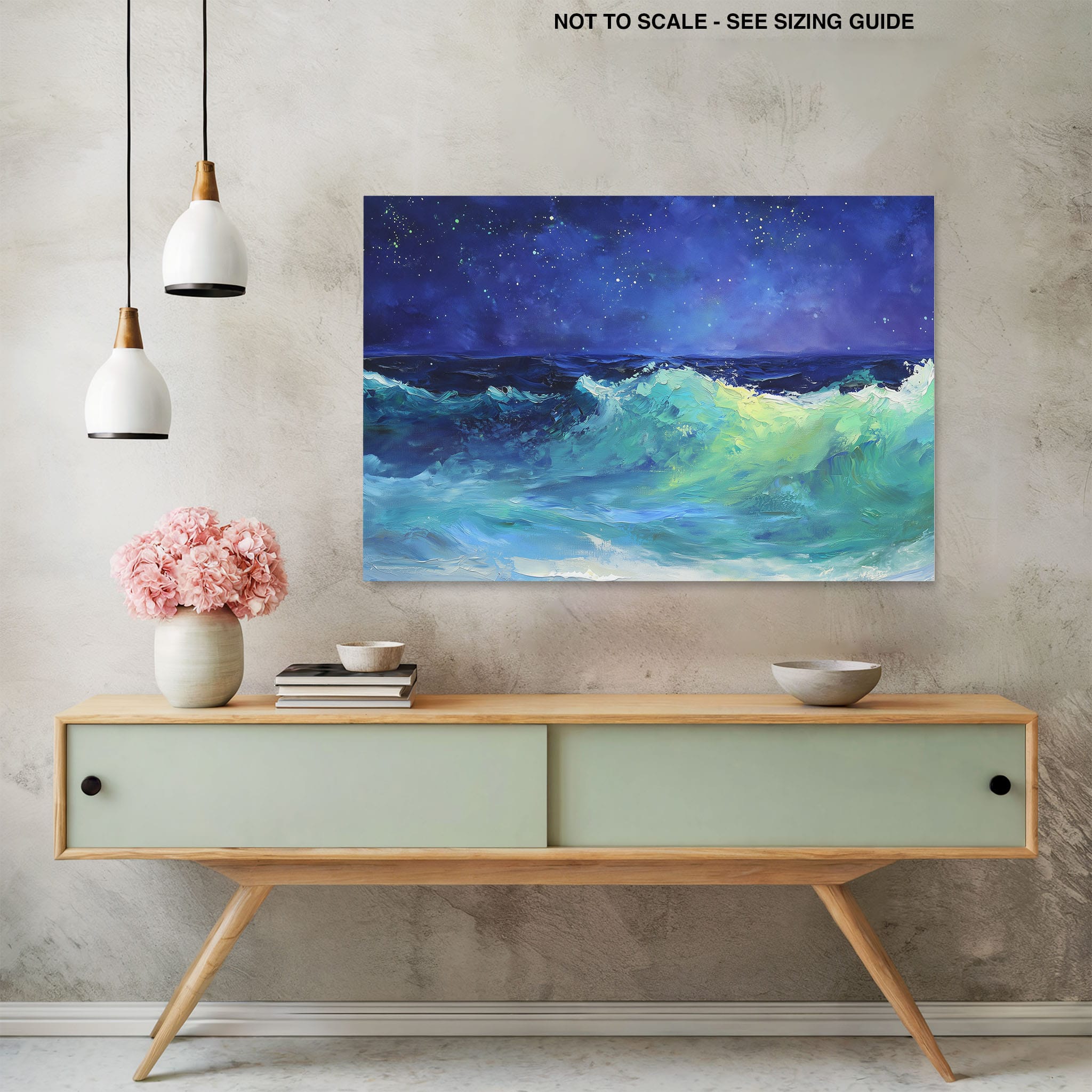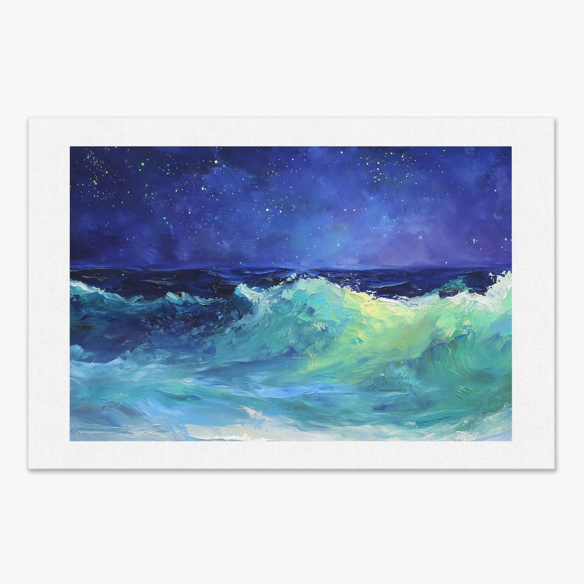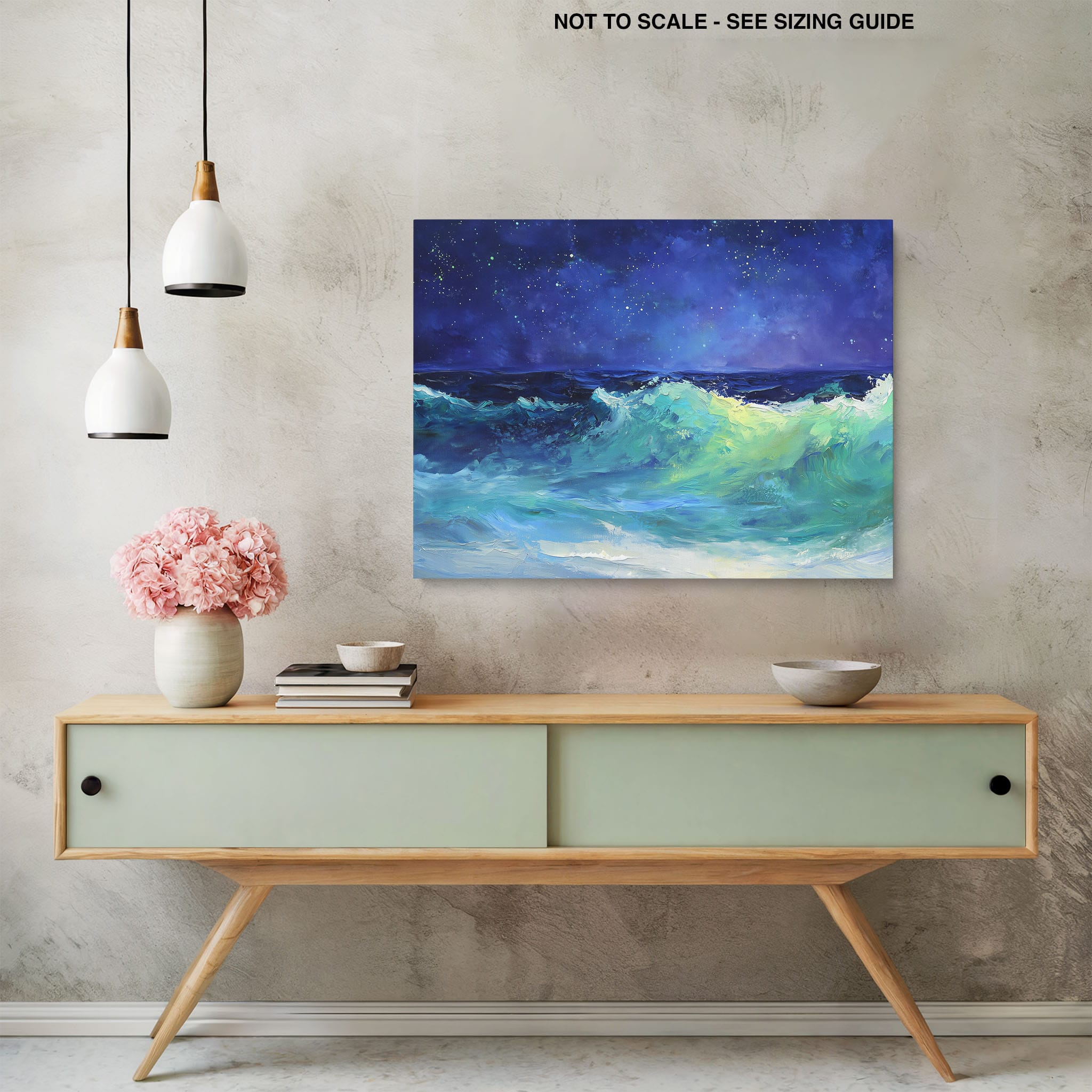 Marvel at Starlit Midnight Ocean Waves, a dynamic expressionist painting that captures the tumultuous beauty of the ocean under a star-filled sky. The rich blues and luminous greens blend dramatically, crafting waves that seem to crash beyond the canvas. The surreal touch of twinkling stars adds a magical quality, making this art piece a majestic view for any space. A blend of impressionism techniques brings the scene to life with bold strokes and vivid colors. Perfect for those looking to add a piece of the ocean's mystery to their home or office.