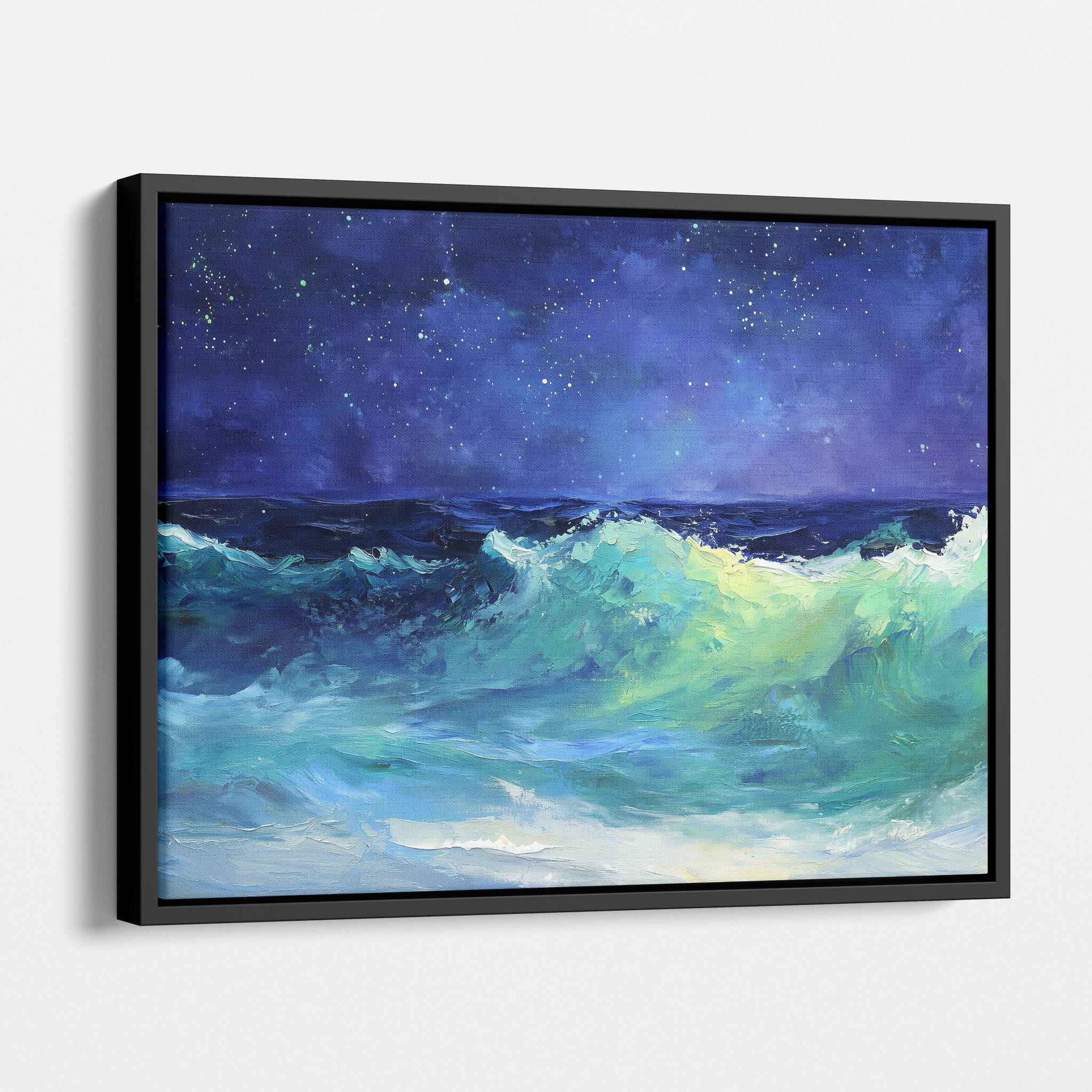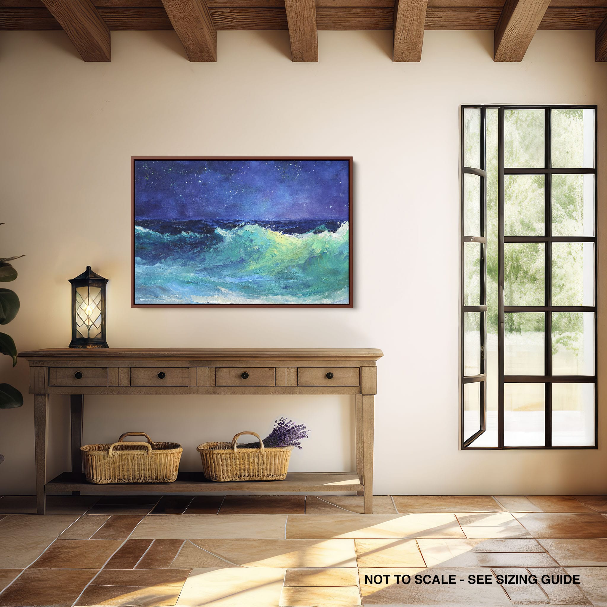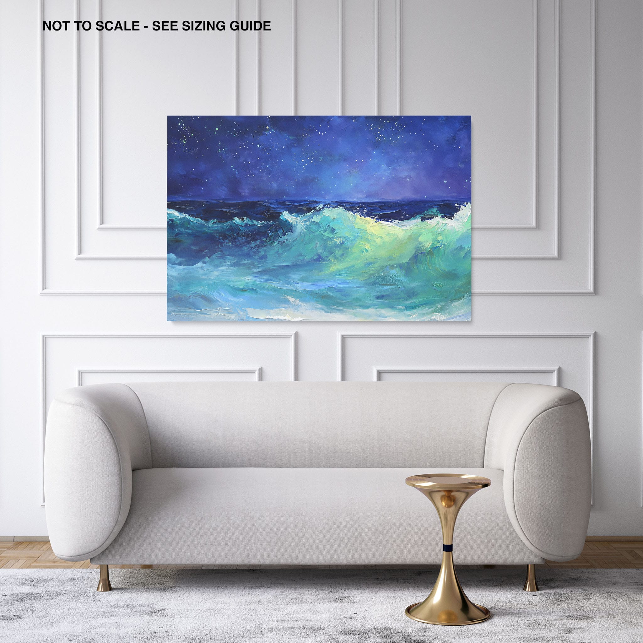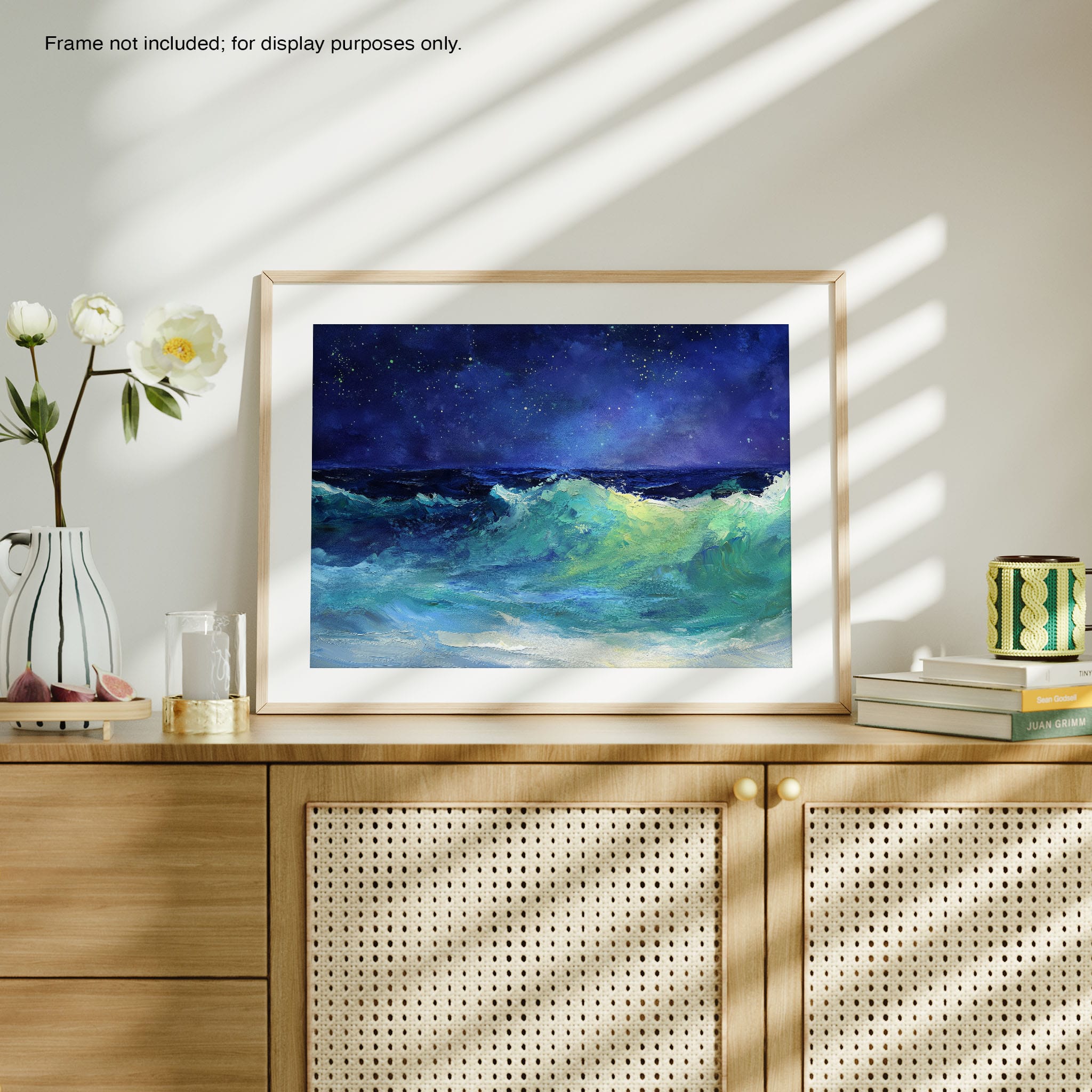 Marvel at Starlit Midnight Ocean Waves, a dynamic expressionist painting that captures the tumultuous beauty of the ocean under a star-filled sky. The rich blues and luminous greens blend dramatically, crafting waves that seem to crash beyond the canvas. The surreal touch of twinkling stars adds a magical quality, making this art piece a majestic view for any space. A blend of impressionism techniques brings the scene to life with bold strokes and vivid colors. Perfect for those looking to add a piece of the ocean's mystery to their home or office.