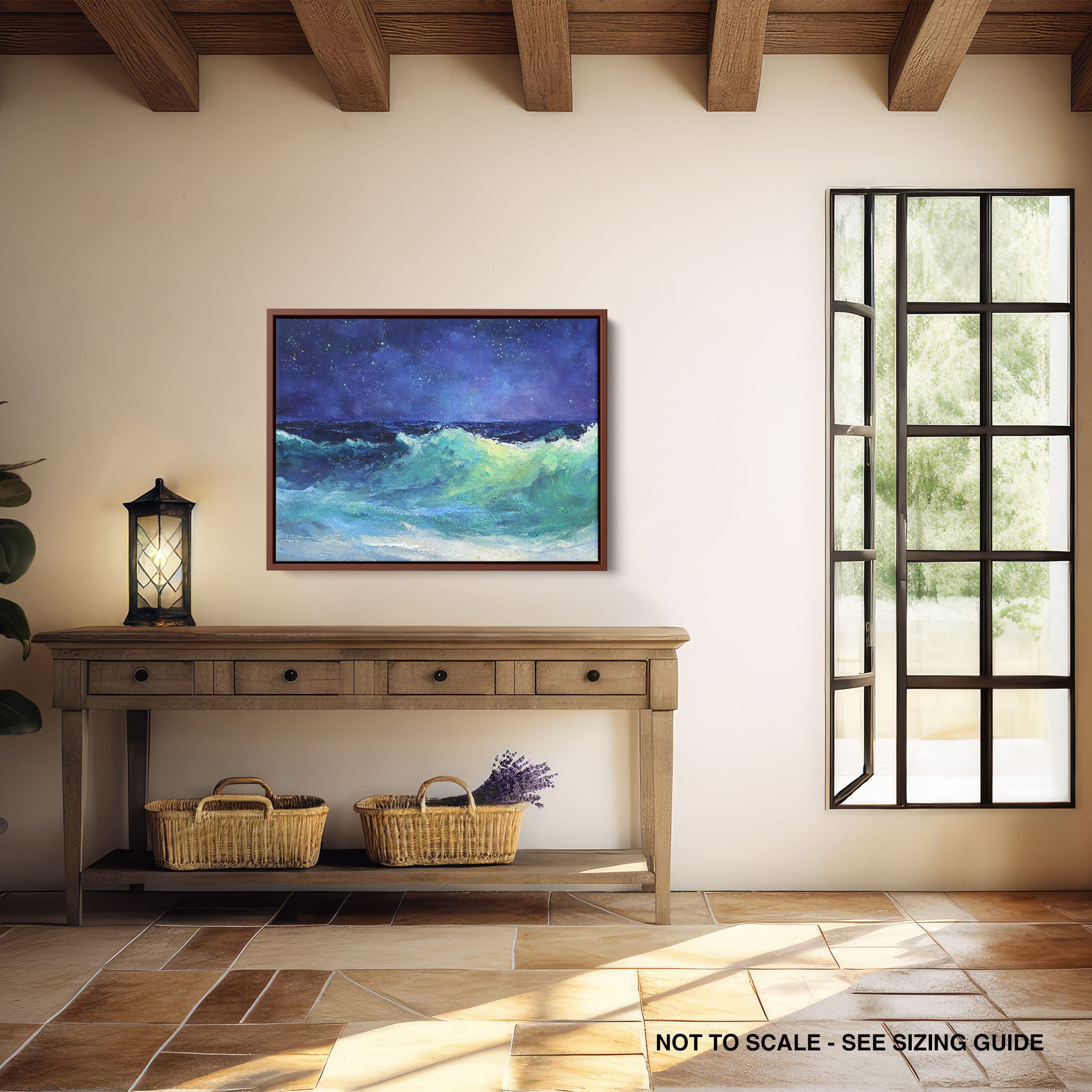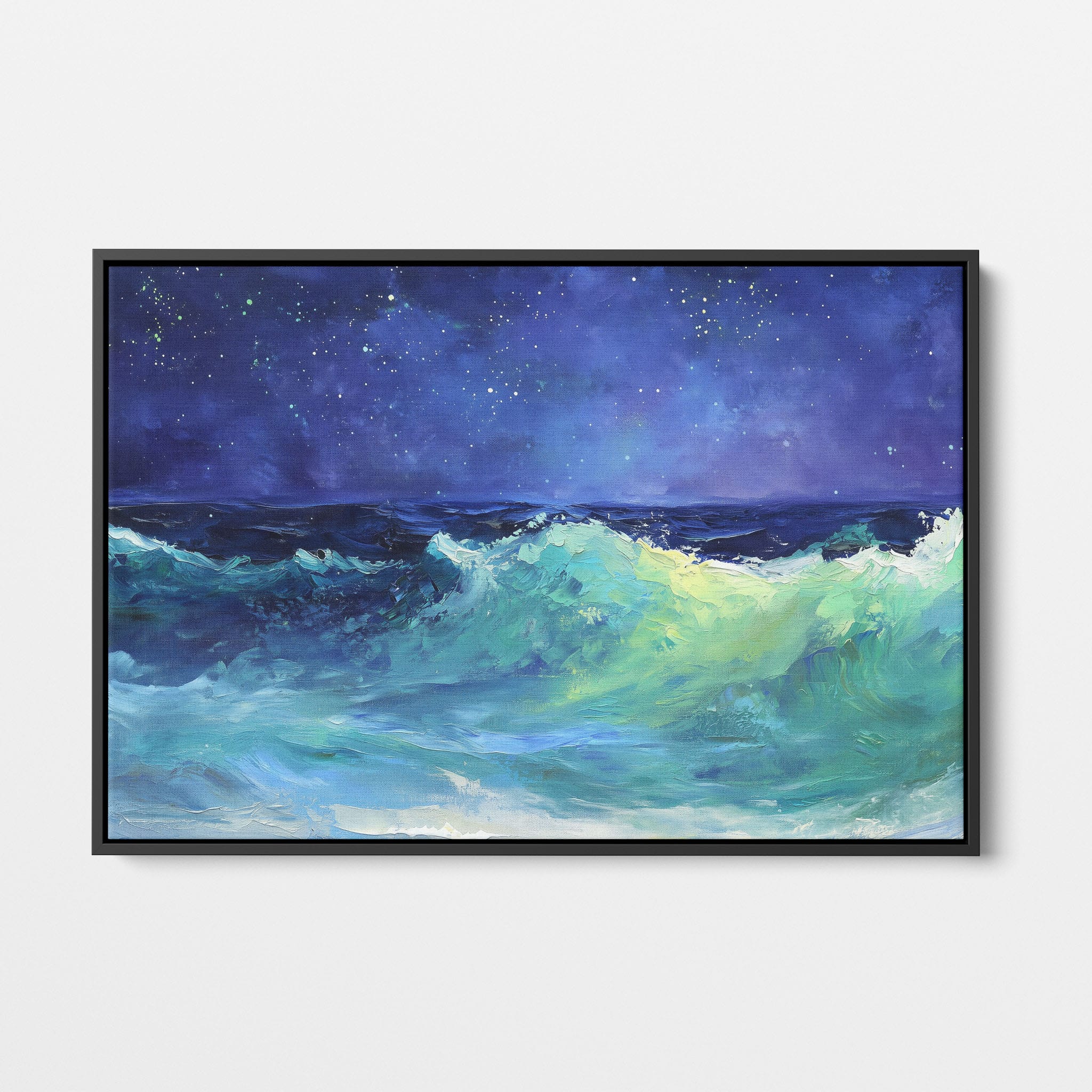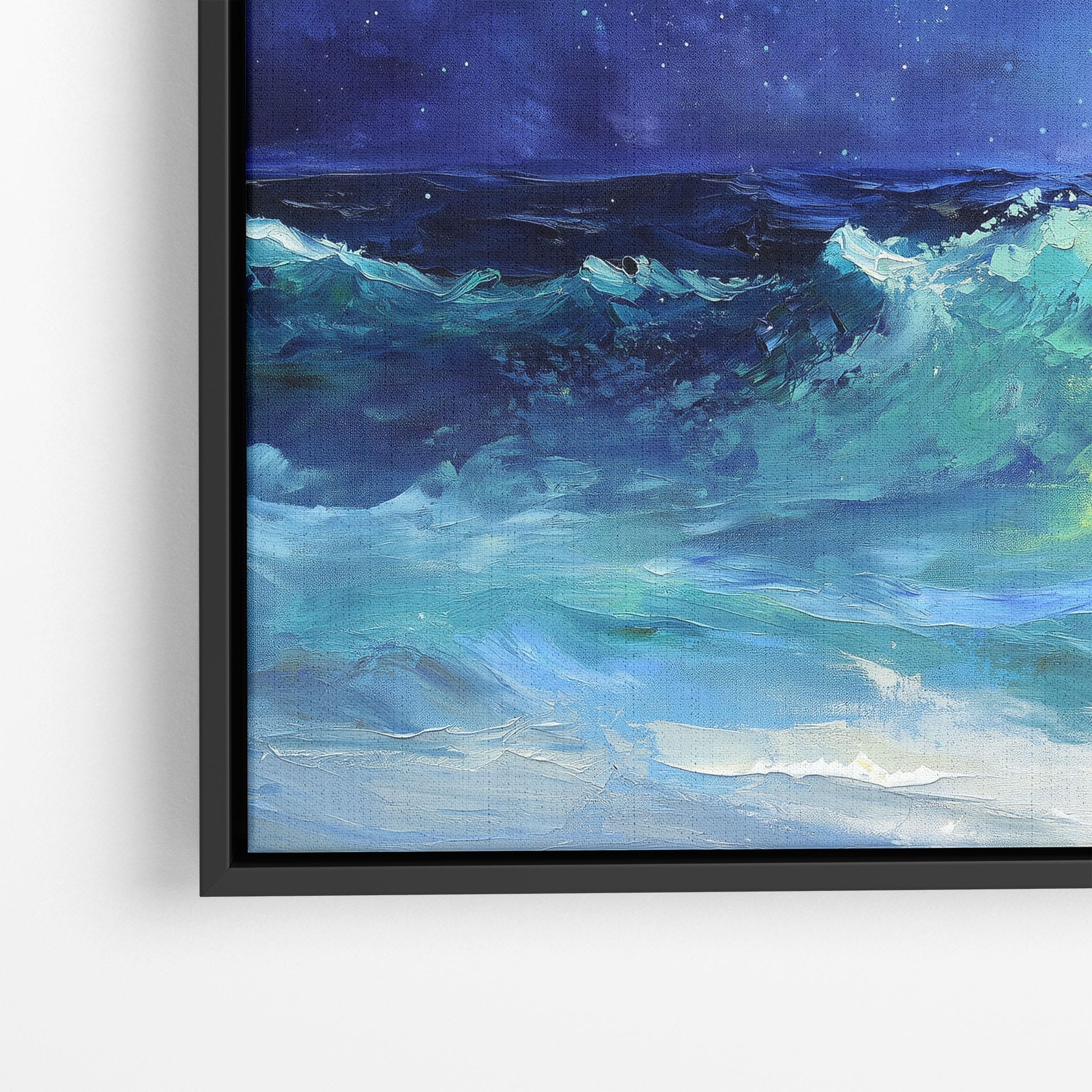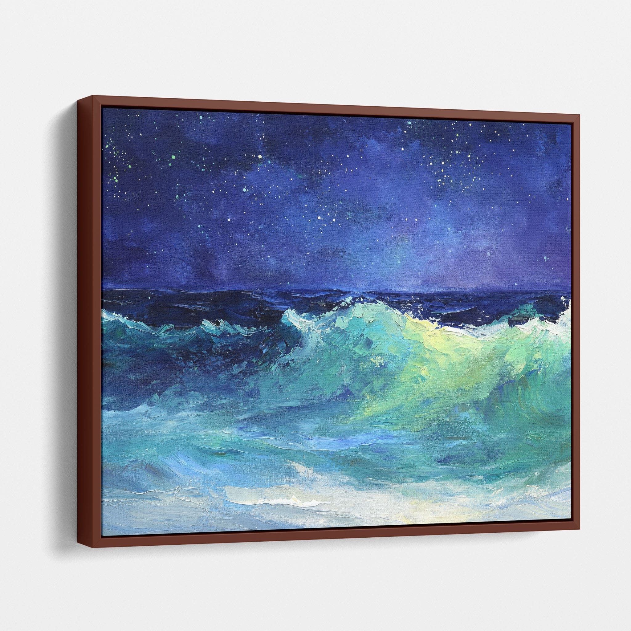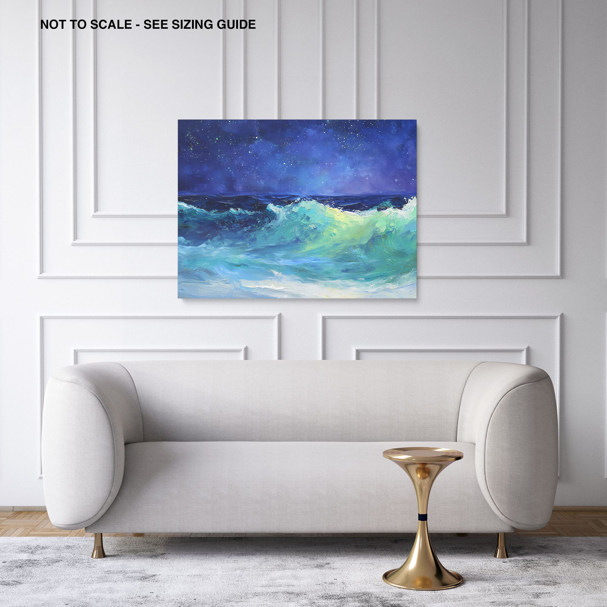 Marvel at Starlit Midnight Ocean Waves, a dynamic expressionist painting that captures the tumultuous beauty of the ocean under a star-filled sky. The rich blues and luminous greens blend dramatically, crafting waves that seem to crash beyond the canvas. The surreal touch of twinkling stars adds a magical quality, making this art piece a majestic view for any space. A blend of impressionism techniques brings the scene to life with bold strokes and vivid colors. Perfect for those looking to add a piece of the ocean's mystery to their home or office.