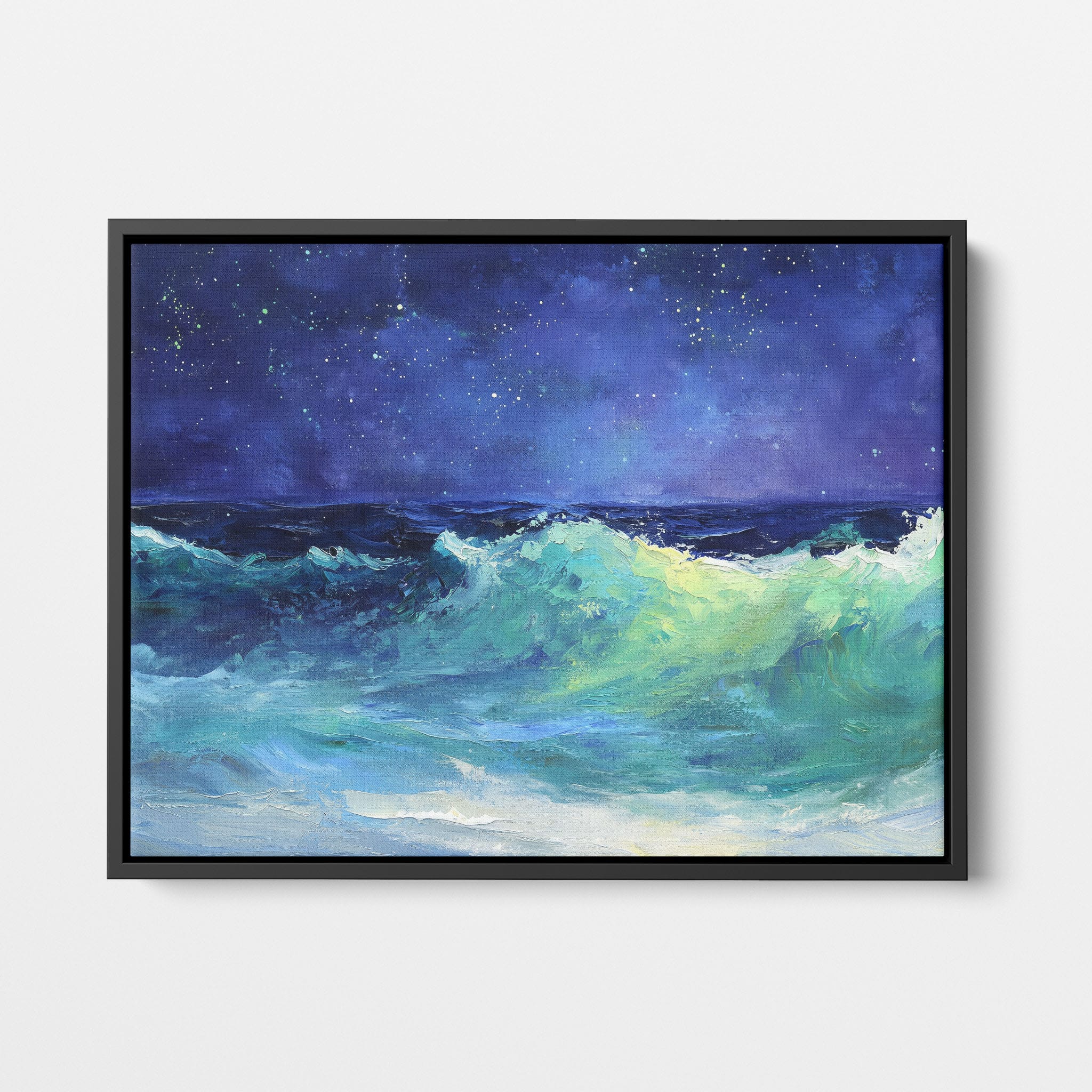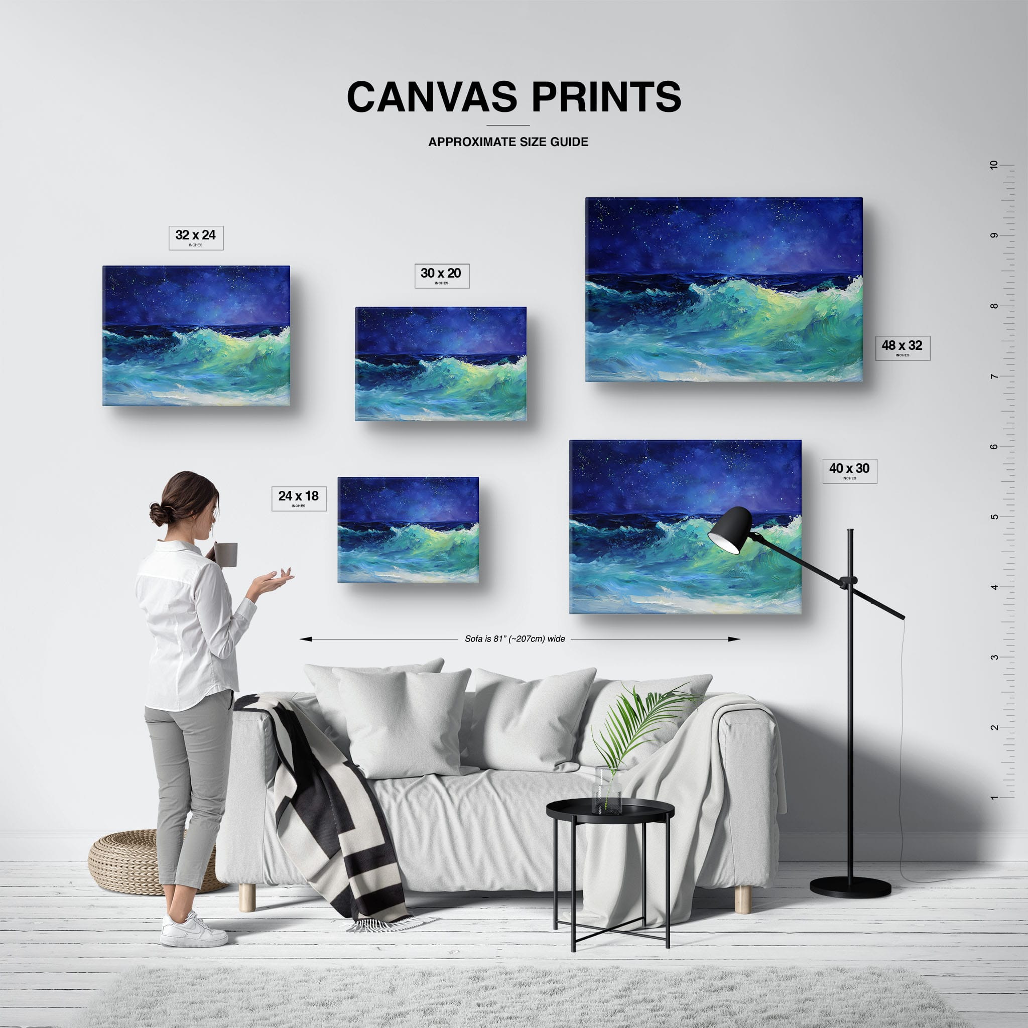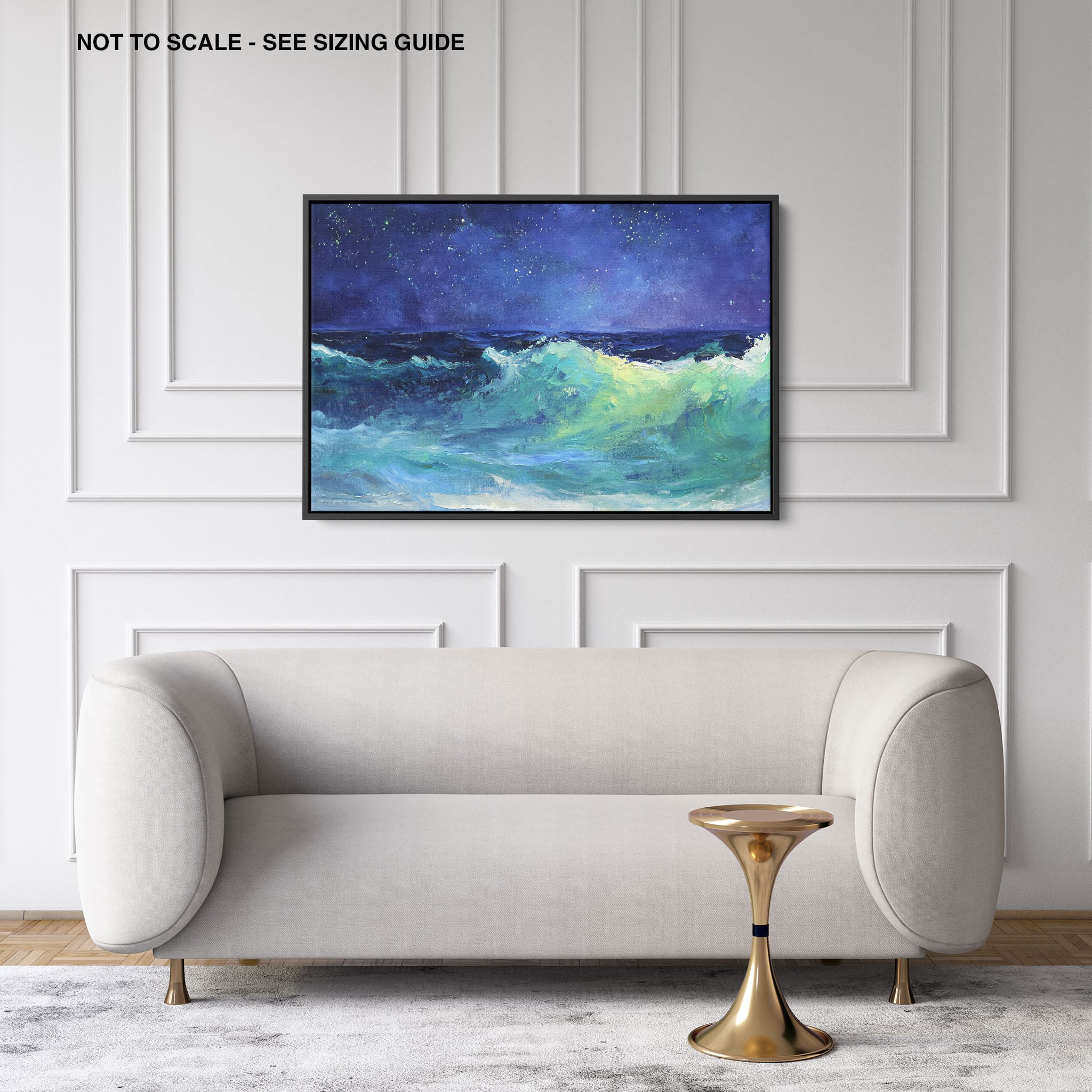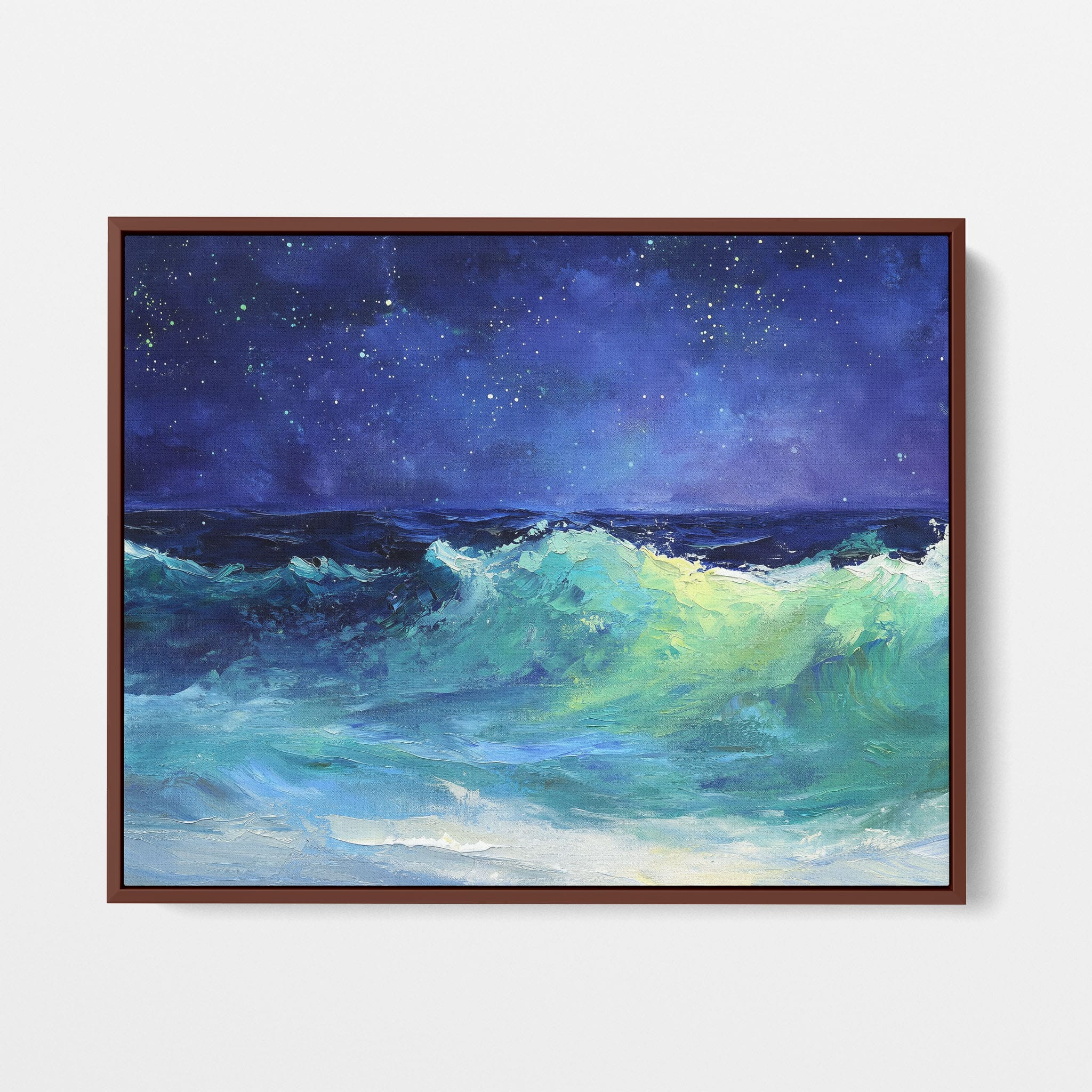 Marvel at Starlit Midnight Ocean Waves, a dynamic expressionist painting that captures the tumultuous beauty of the ocean under a star-filled sky. The rich blues and luminous greens blend dramatically, crafting waves that seem to crash beyond the canvas. The surreal touch of twinkling stars adds a magical quality, making this art piece a majestic view for any space. A blend of impressionism techniques brings the scene to life with bold strokes and vivid colors. Perfect for those looking to add a piece of the ocean's mystery to their home or office.