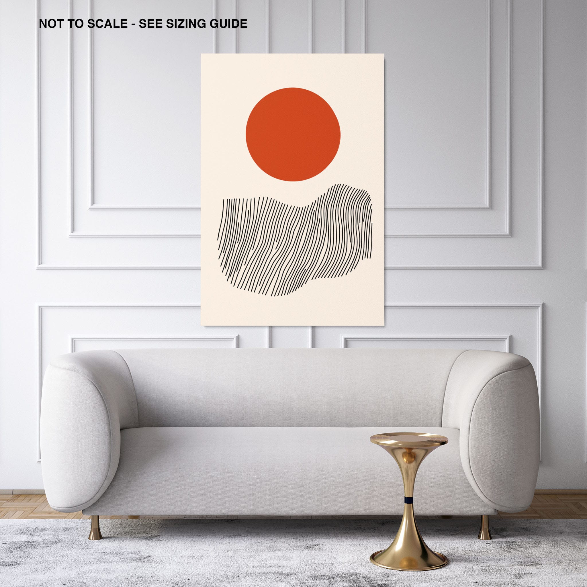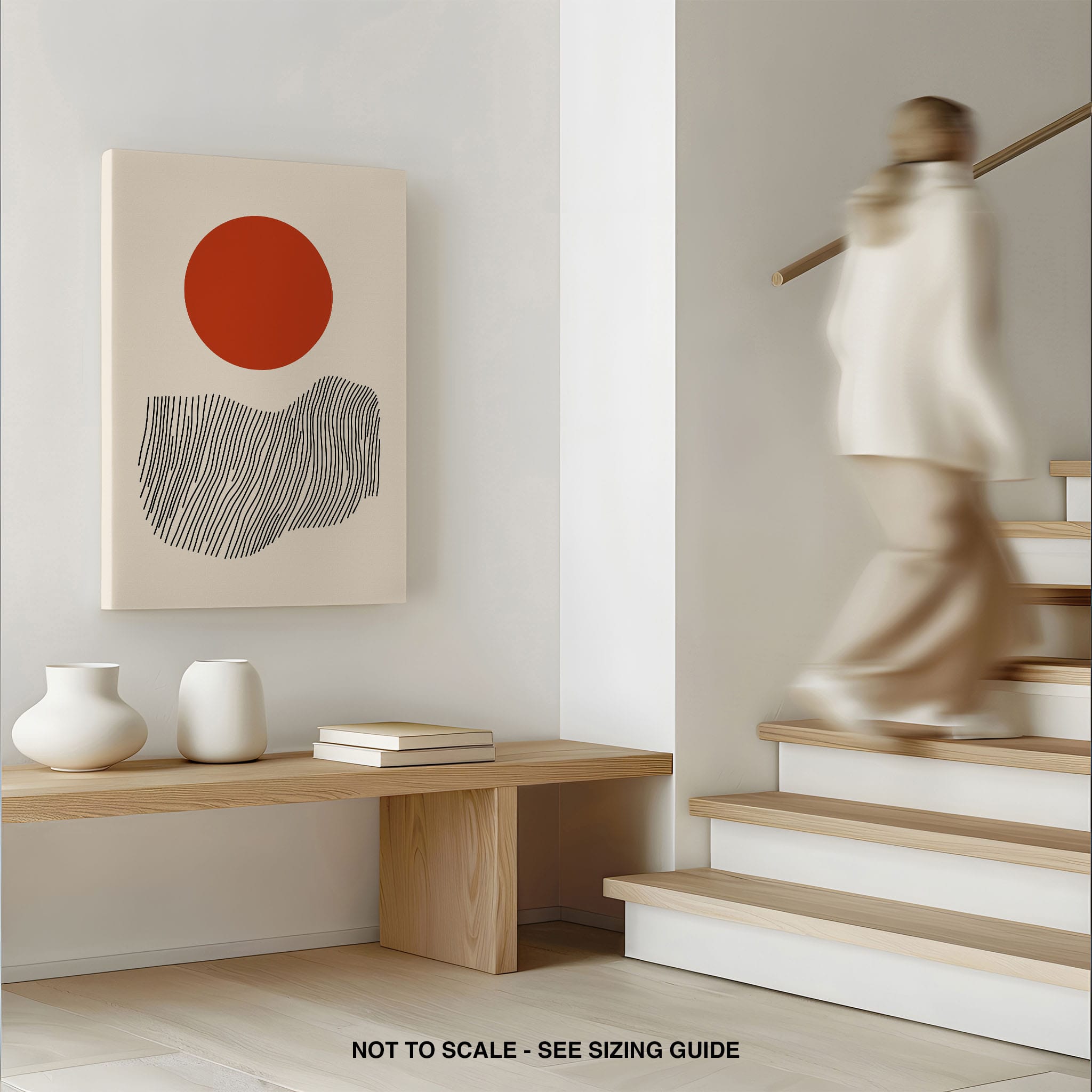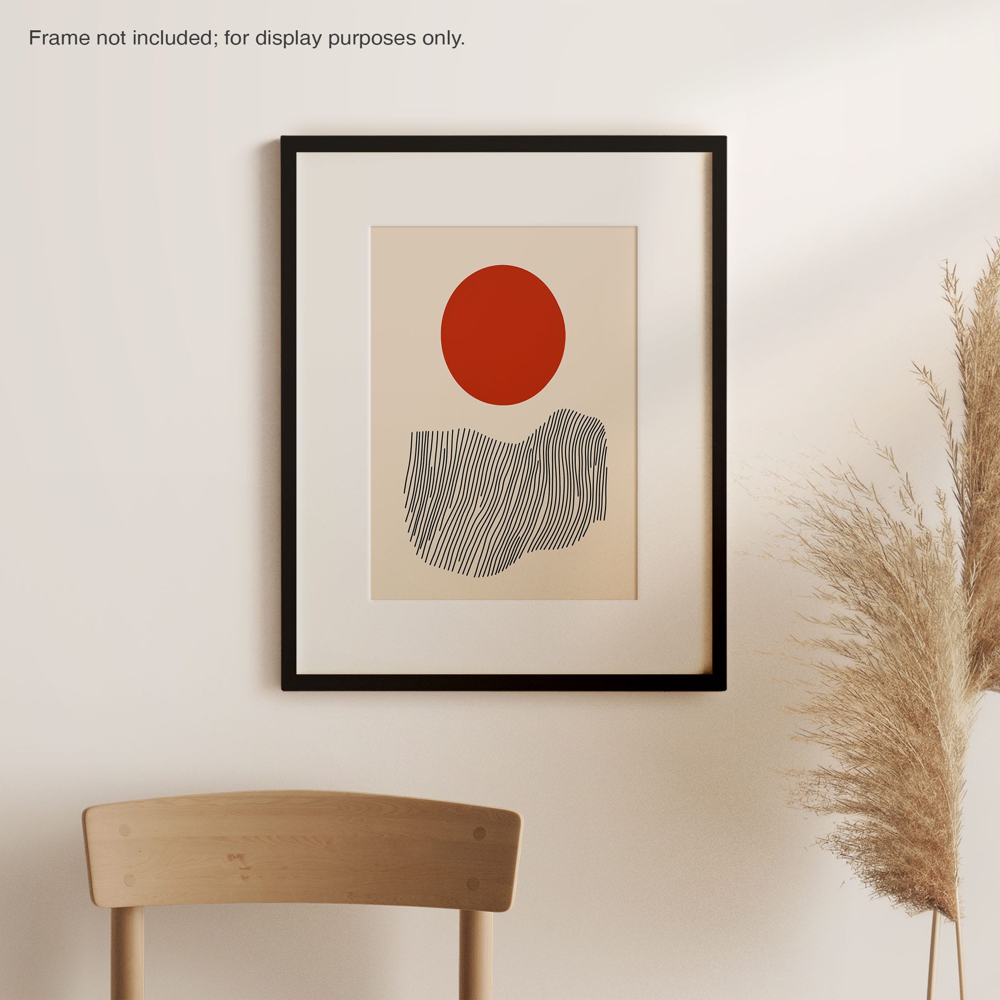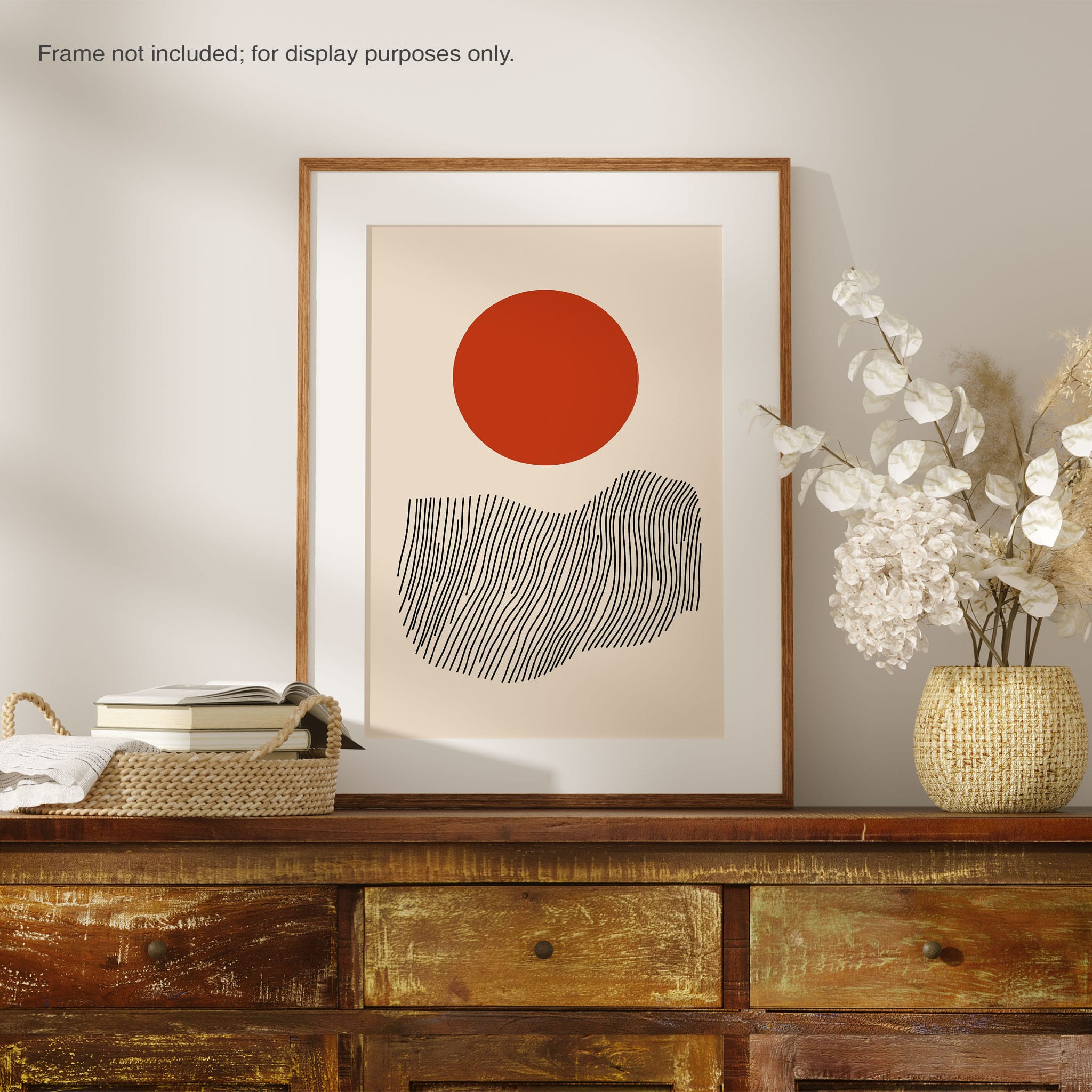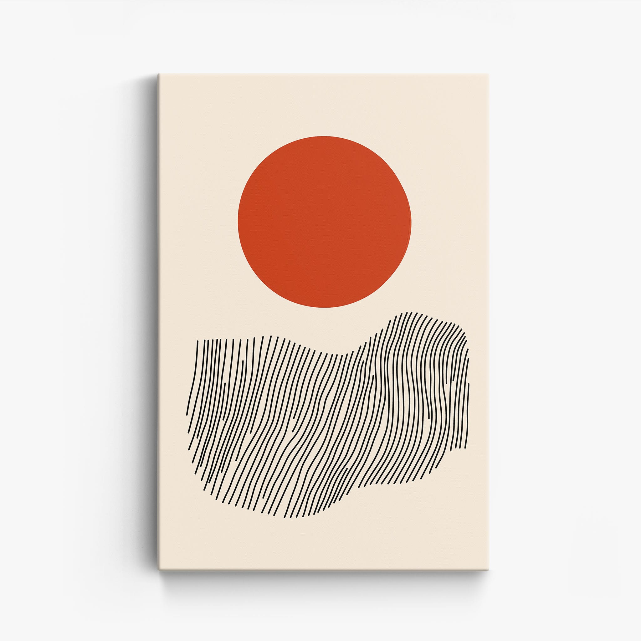 This piece features a bold, red circle set above an undulating pattern of black lines against a soft beige background. Its minimalist yet geometric design draws the eye, while the modern influence provides an aesthetic that fits seamlessly into contemporary decor. A perfect choice for those seeking art that conveys simplicity and calmness with a striking use of color contrast. This digital illustration brilliantly catches the viewer’s attention and would be a stylish addition to any living space or office, appealing directly to lovers of abstract and modern art forms.