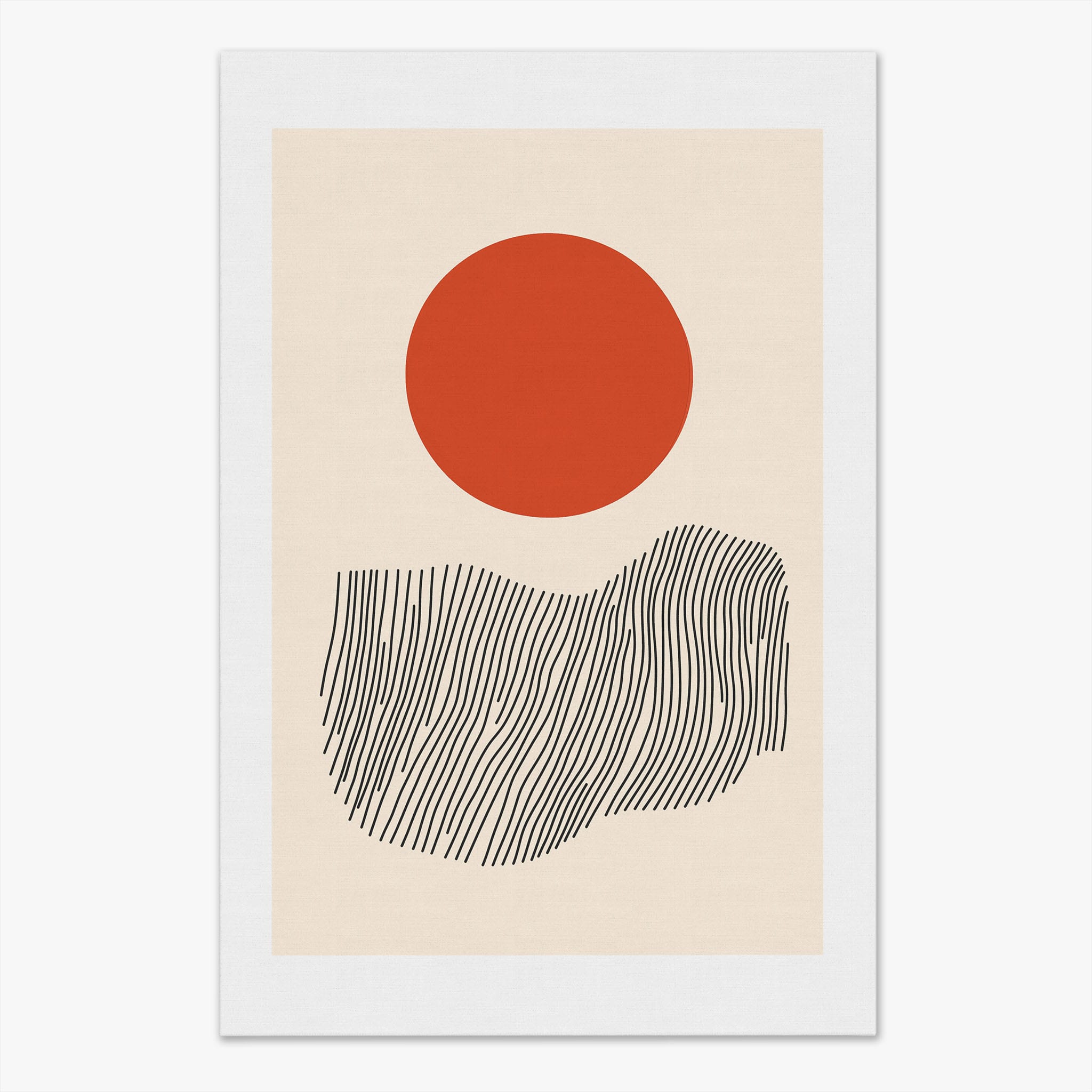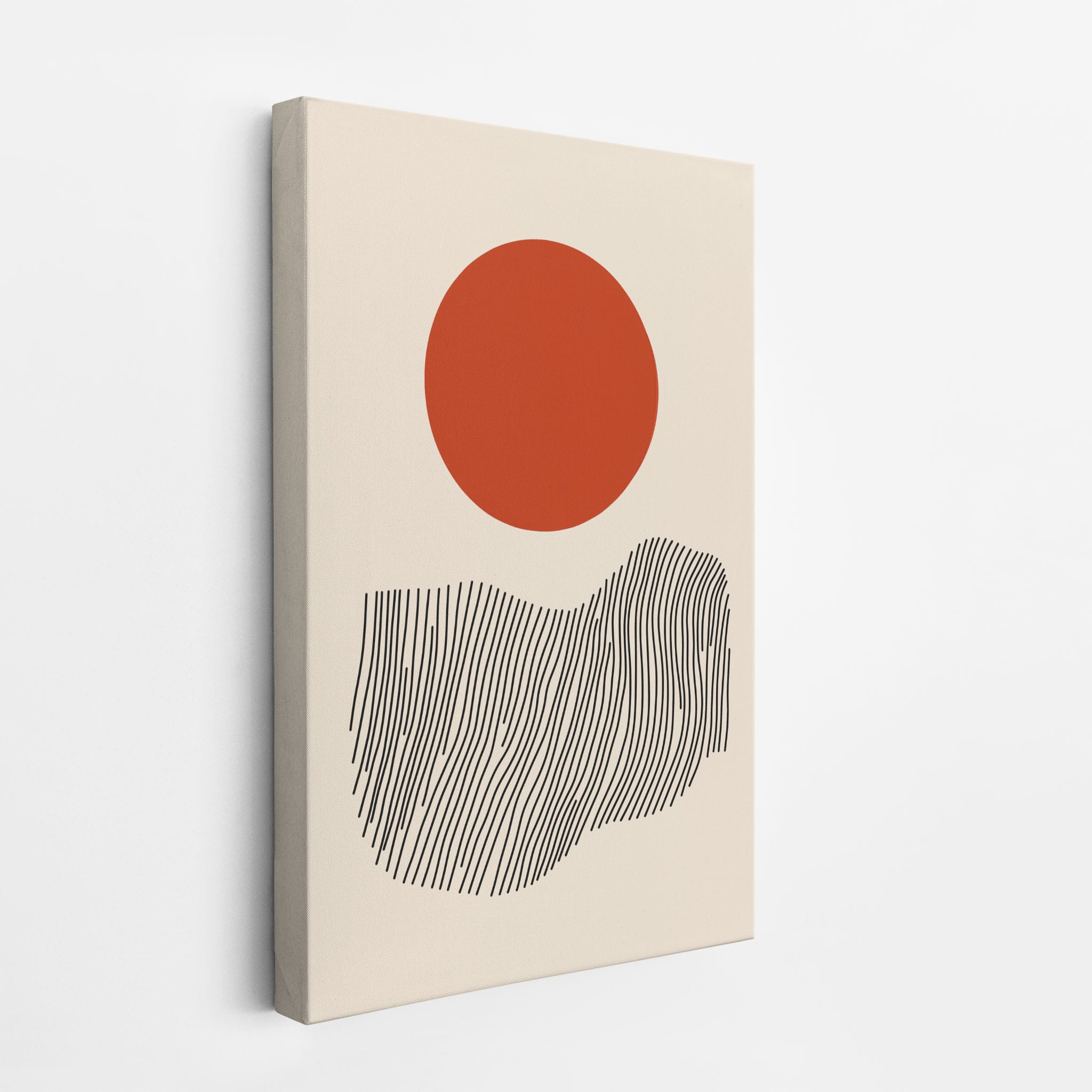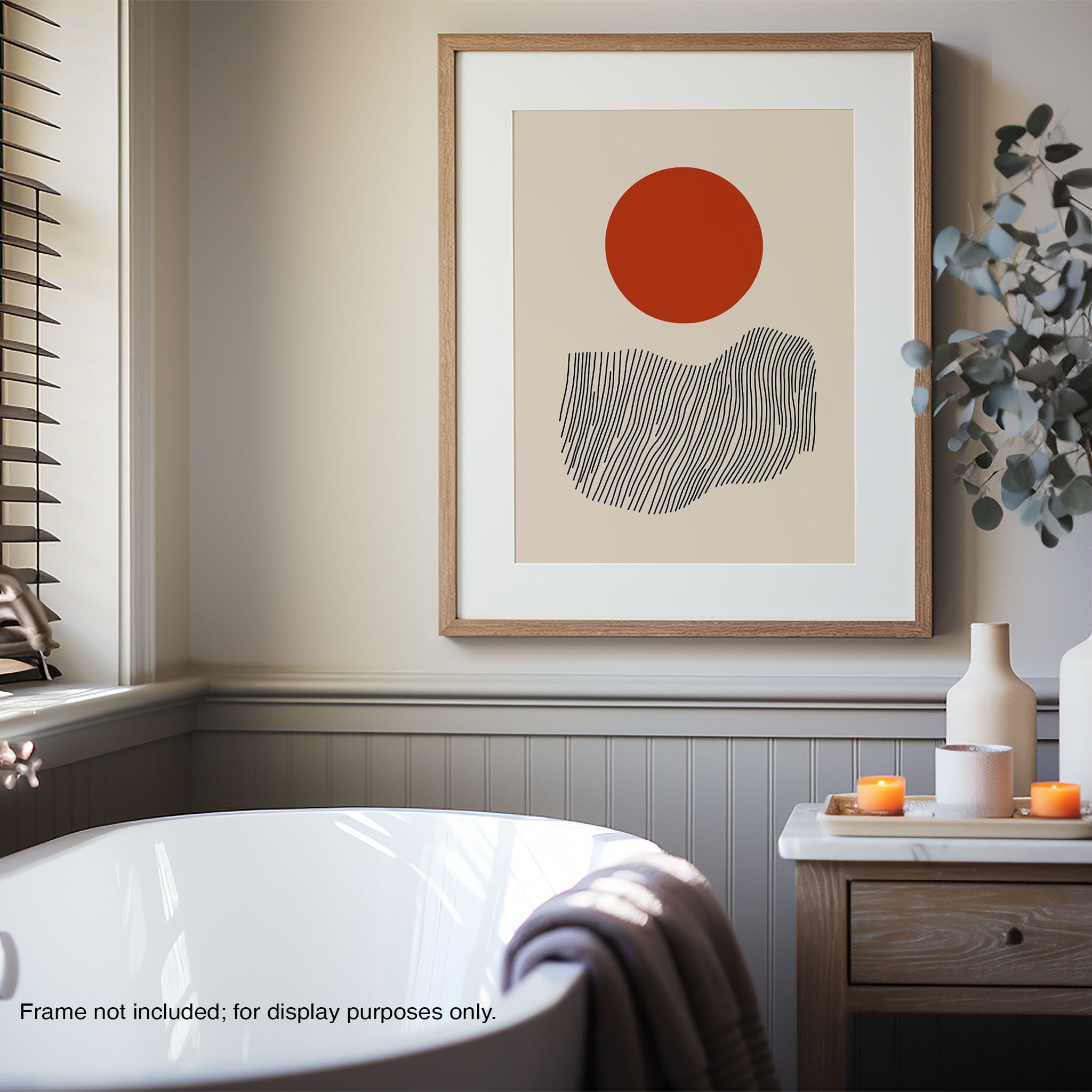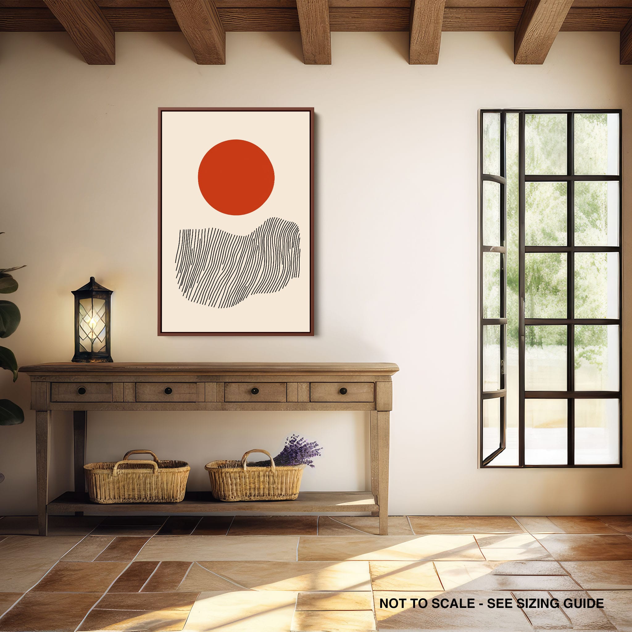This piece features a bold, red circle set above an undulating pattern of black lines against a soft beige background. Its minimalist yet geometric design draws the eye, while the modern influence provides an aesthetic that fits seamlessly into contemporary decor. A perfect choice for those seeking art that conveys simplicity and calmness with a striking use of color contrast. This digital illustration brilliantly catches the viewer’s attention and would be a stylish addition to any living space or office, appealing directly to lovers of abstract and modern art forms.