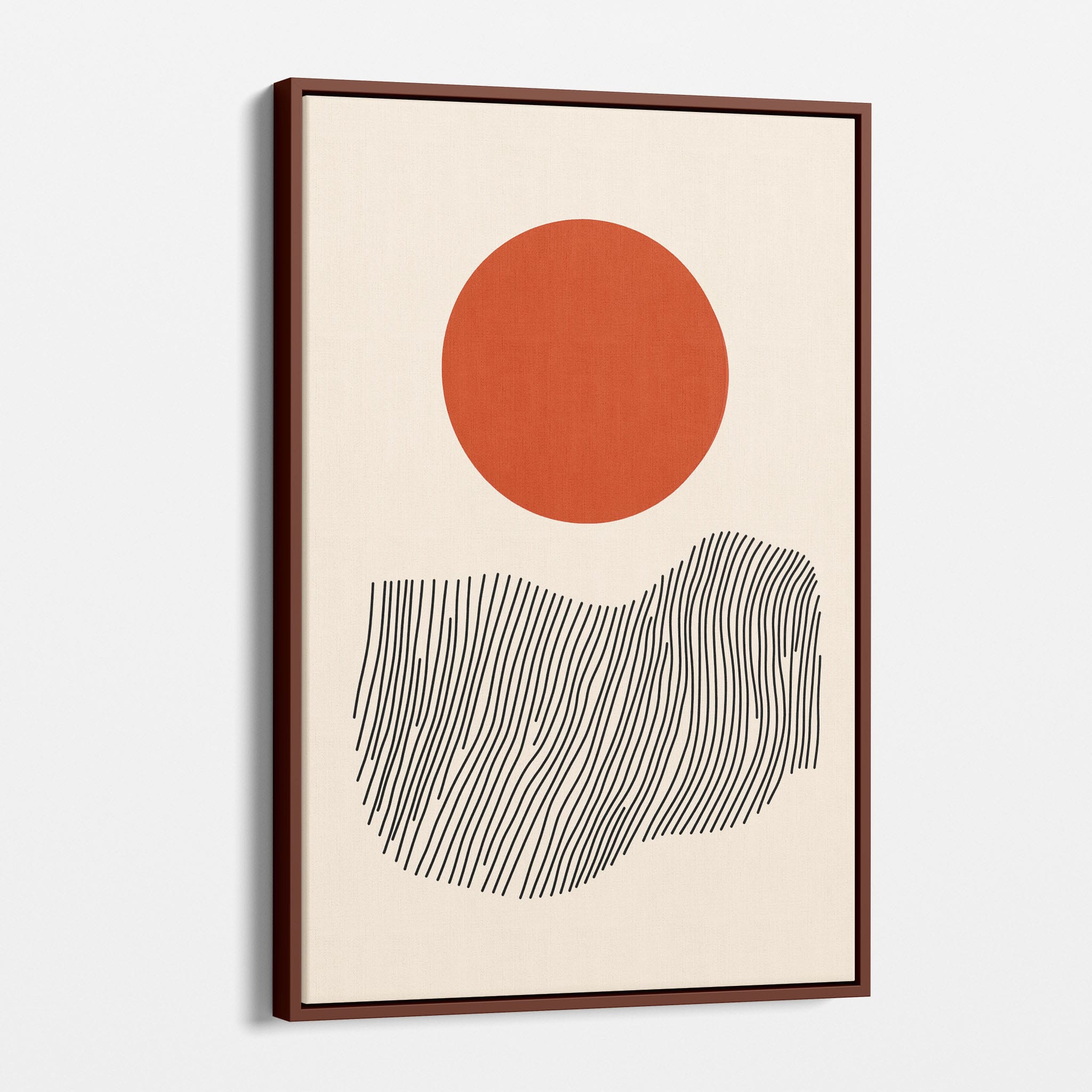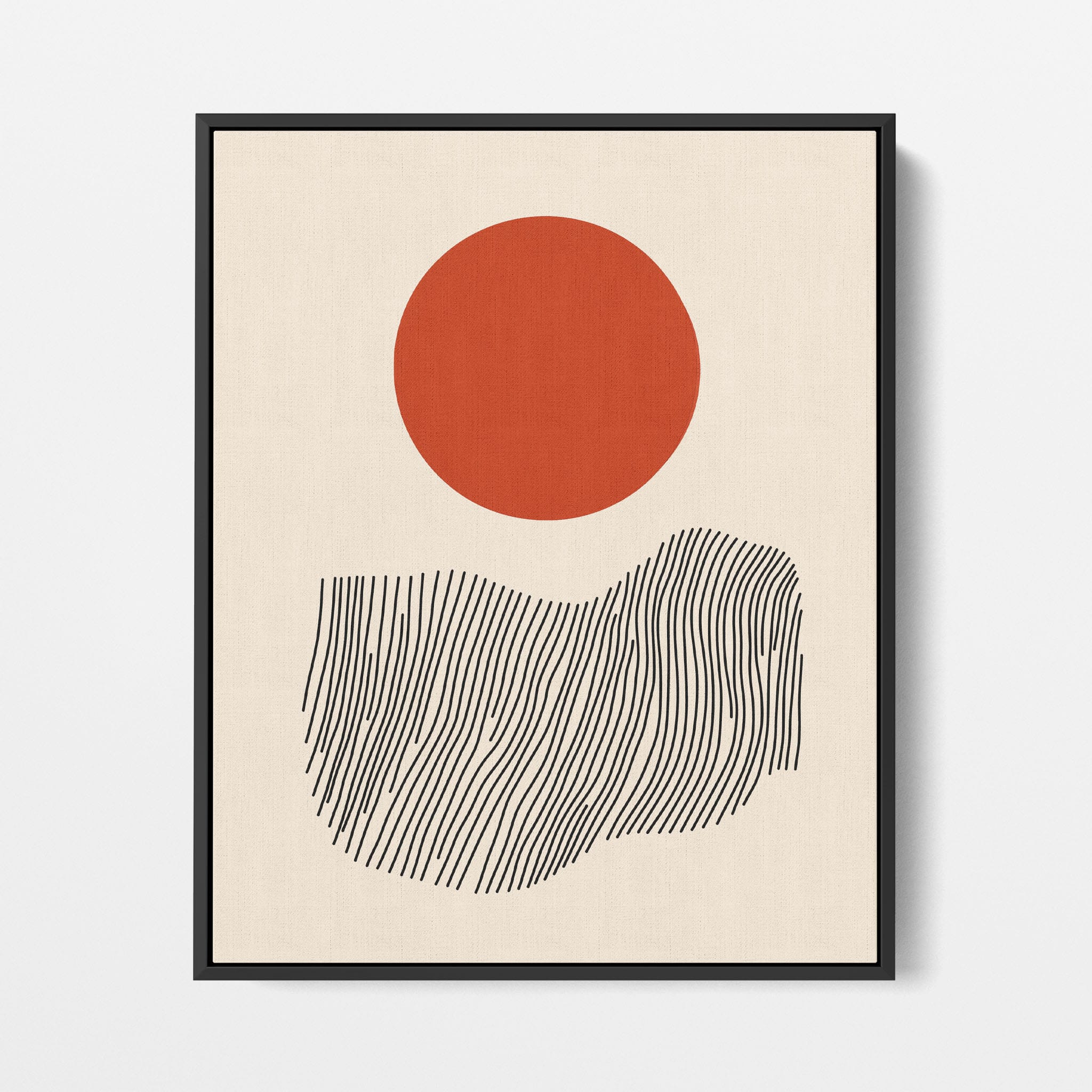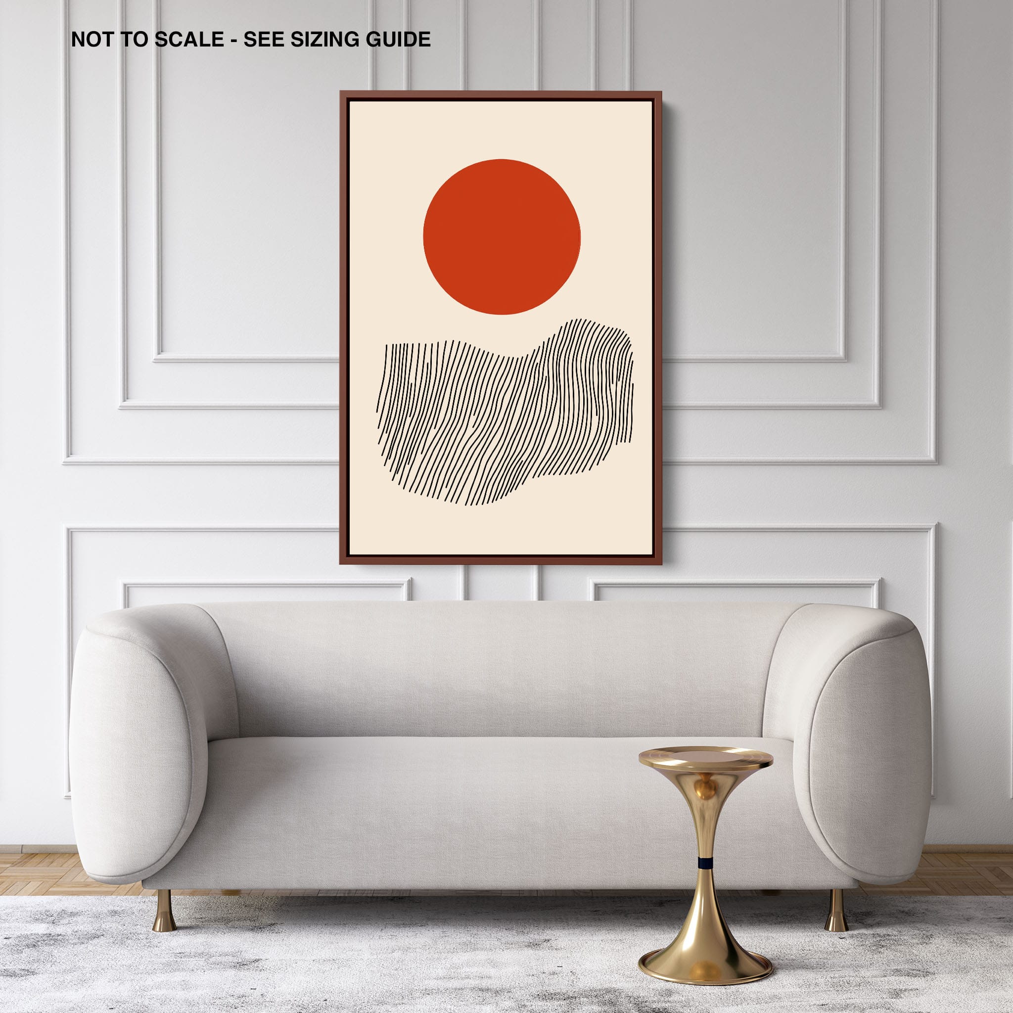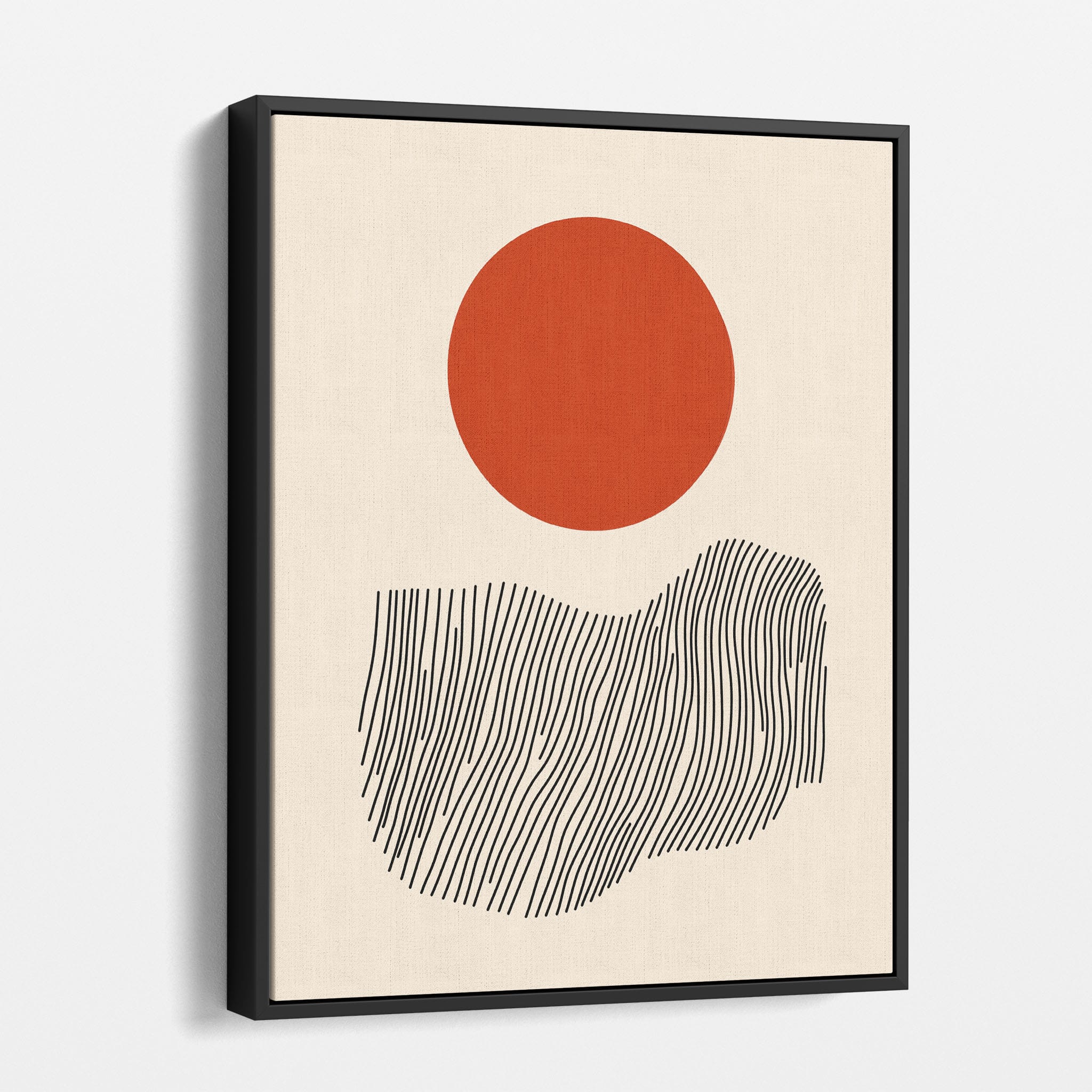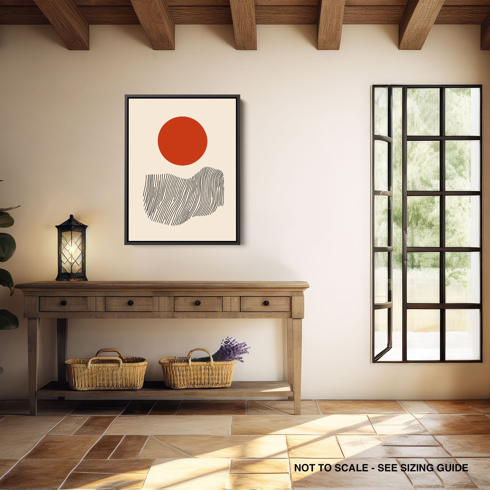 This piece features a bold, red circle set above an undulating pattern of black lines against a soft beige background. Its minimalist yet geometric design draws the eye, while the modern influence provides an aesthetic that fits seamlessly into contemporary decor. A perfect choice for those seeking art that conveys simplicity and calmness with a striking use of color contrast. This digital illustration brilliantly catches the viewer’s attention and would be a stylish addition to any living space or office, appealing directly to lovers of abstract and modern art forms.