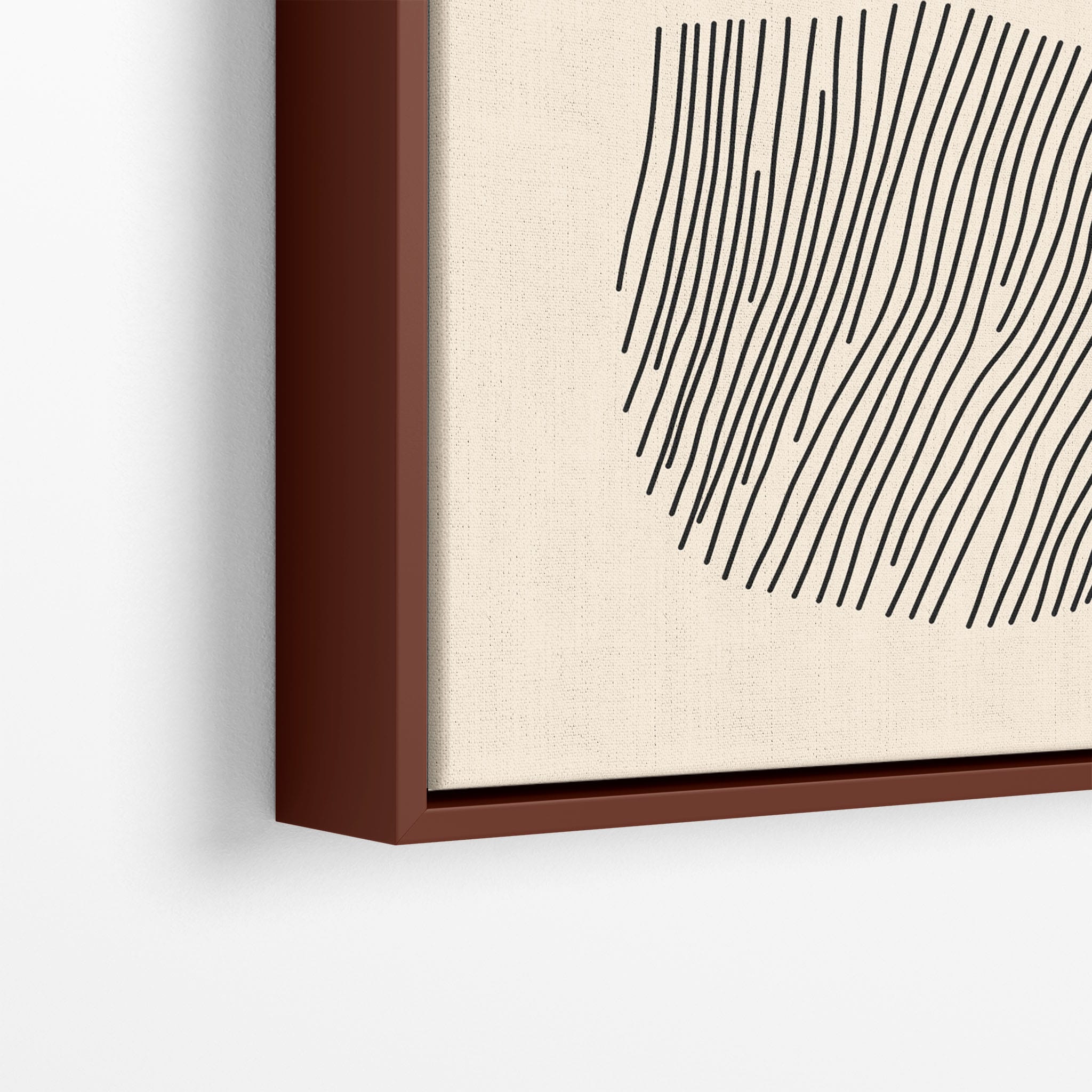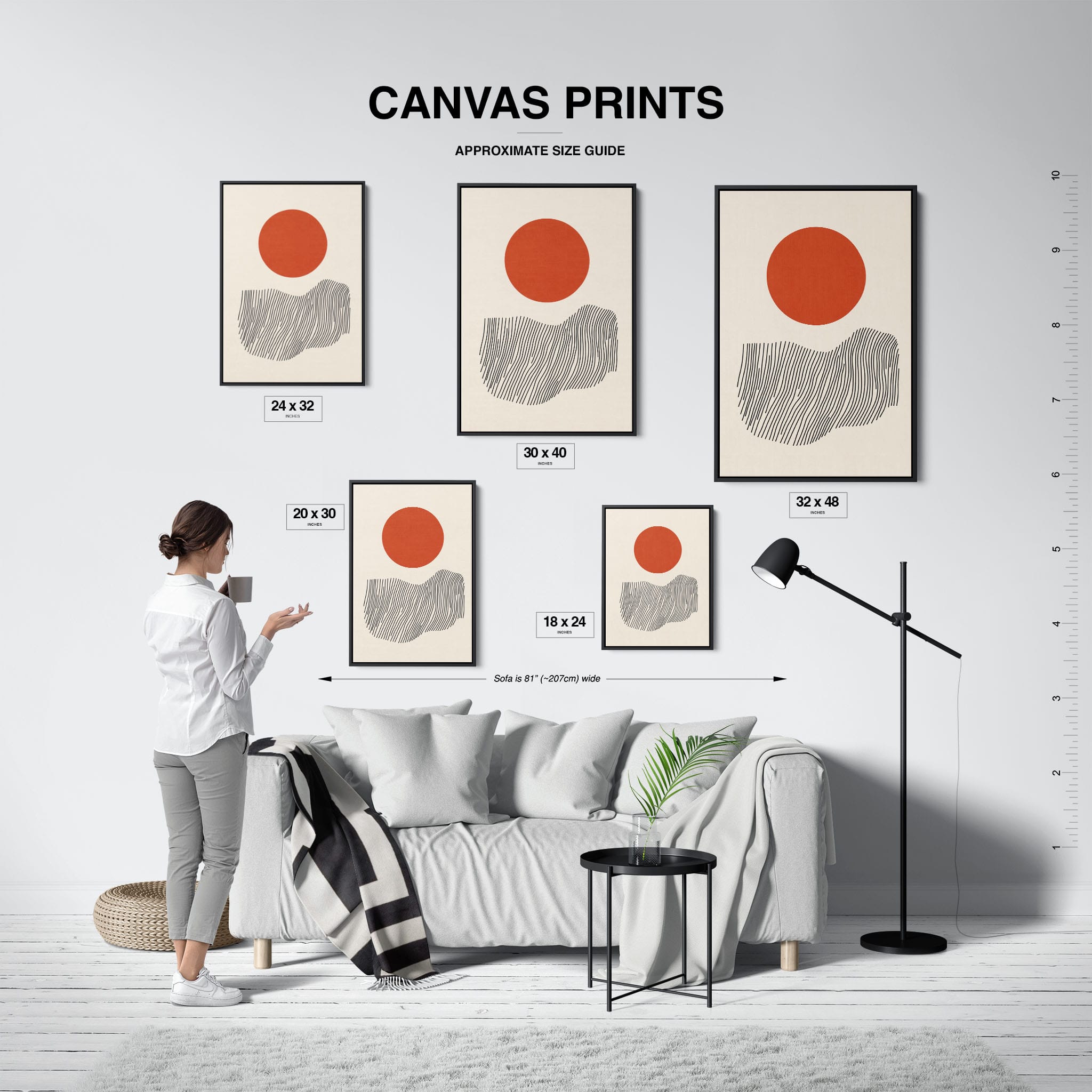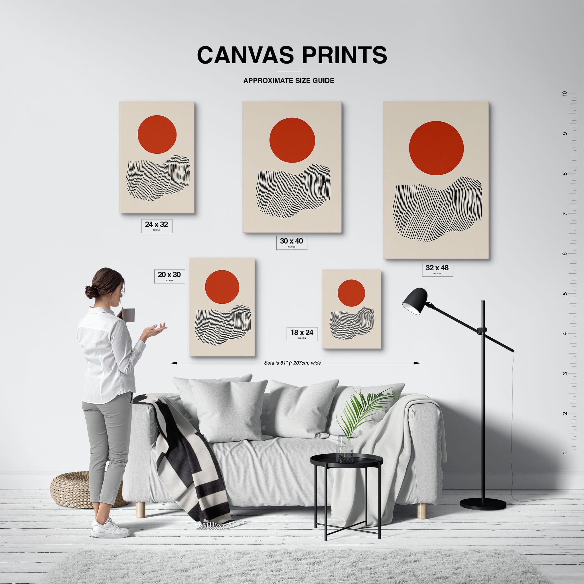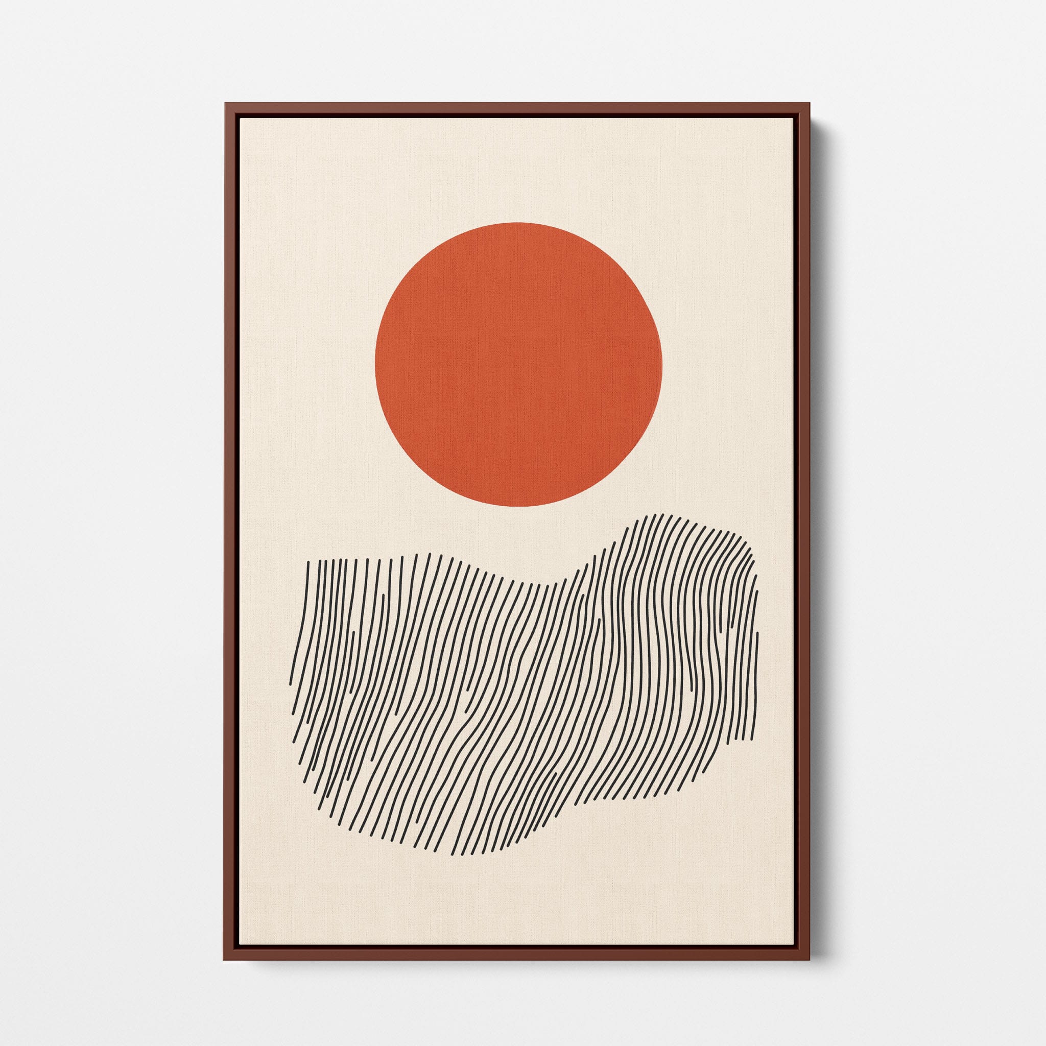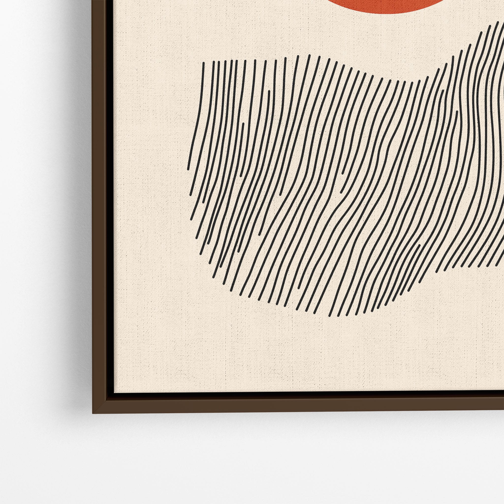 This piece features a bold, red circle set above an undulating pattern of black lines against a soft beige background. Its minimalist yet geometric design draws the eye, while the modern influence provides an aesthetic that fits seamlessly into contemporary decor. A perfect choice for those seeking art that conveys simplicity and calmness with a striking use of color contrast. This digital illustration brilliantly catches the viewer’s attention and would be a stylish addition to any living space or office, appealing directly to lovers of abstract and modern art forms.