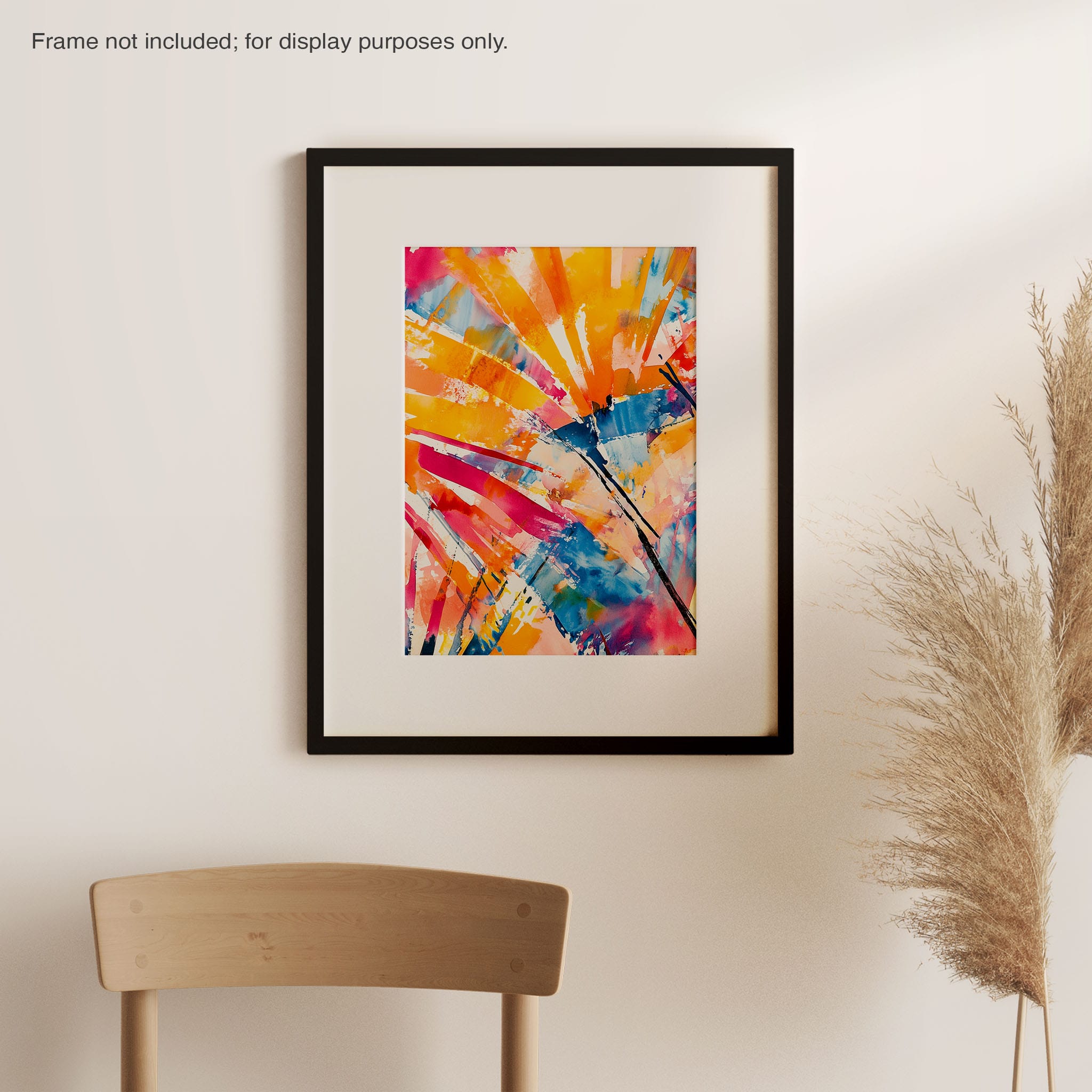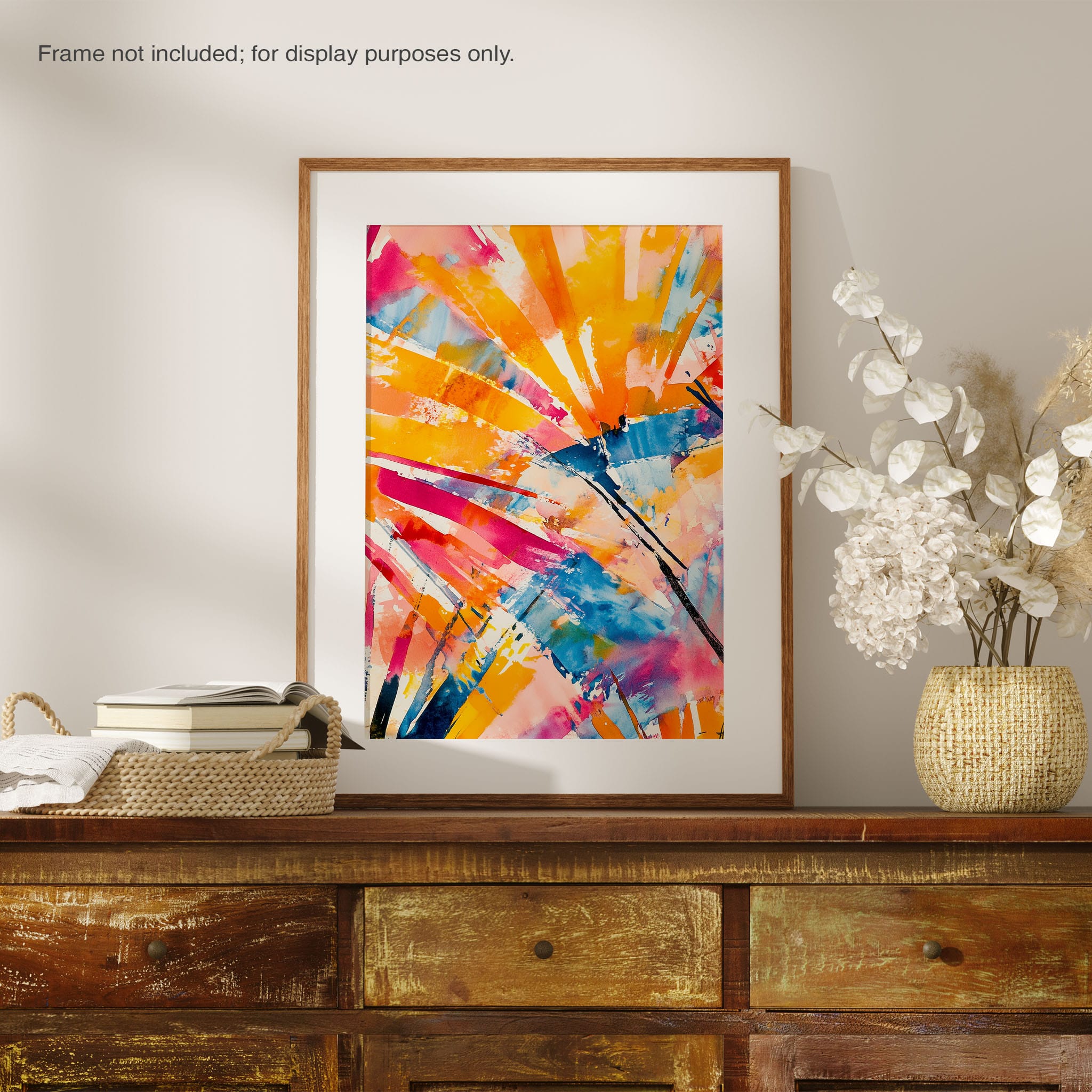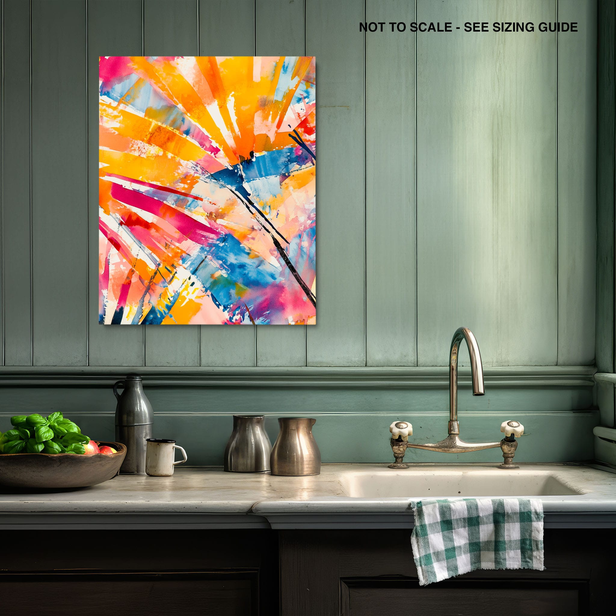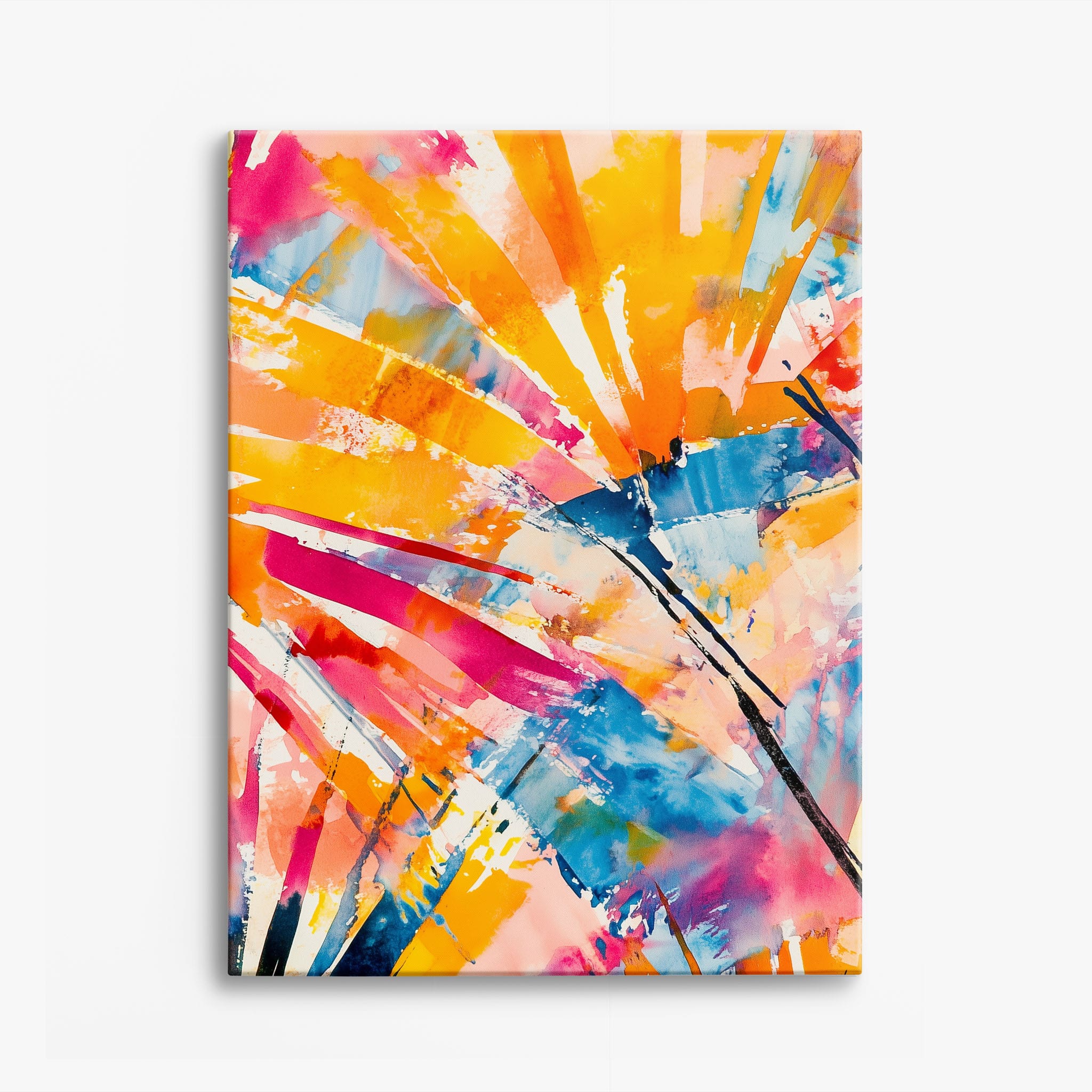 This vivid watercolor piece captures the explosive energy of a sunburst through abstract forms and lively, expressive color transitions. The blending of orange, pink, blue, and yellow hues, along with spontaneous drip effects, provide a dynamic visual experience that simulates the sensory overload of witnessing a sunrise. Apt for both modern interior spaces and collections accentuating vibrant abstracts, this artwork brings a piece of the sky's transcendent beauty indoors. Ideal for anyone looking to invigorate their environment with a splash of color and abstraction.