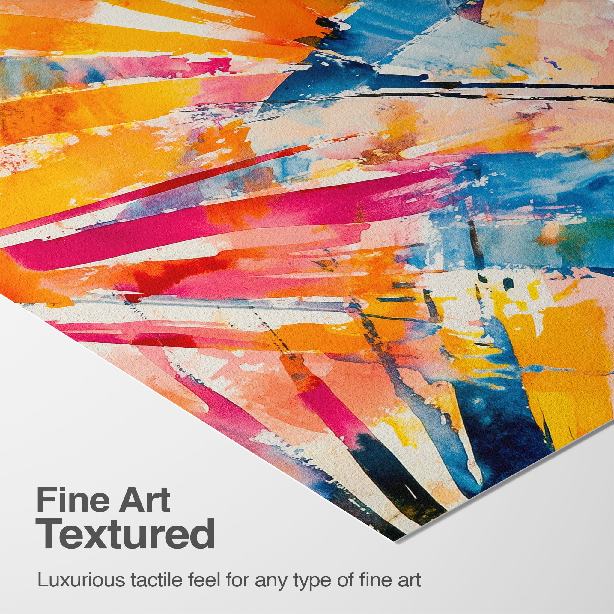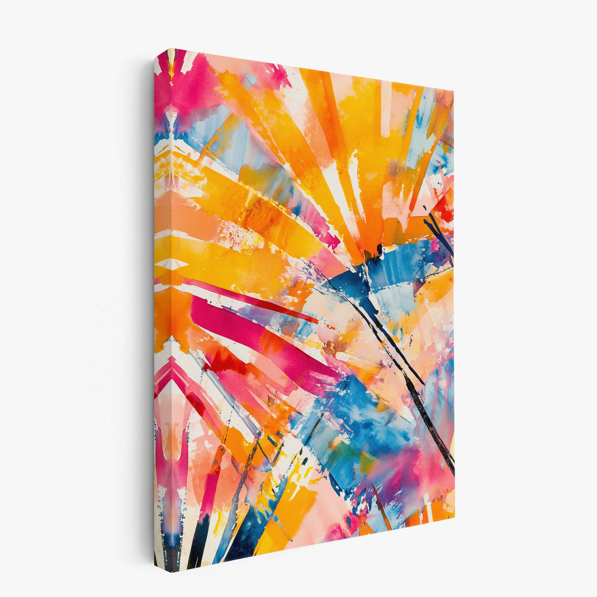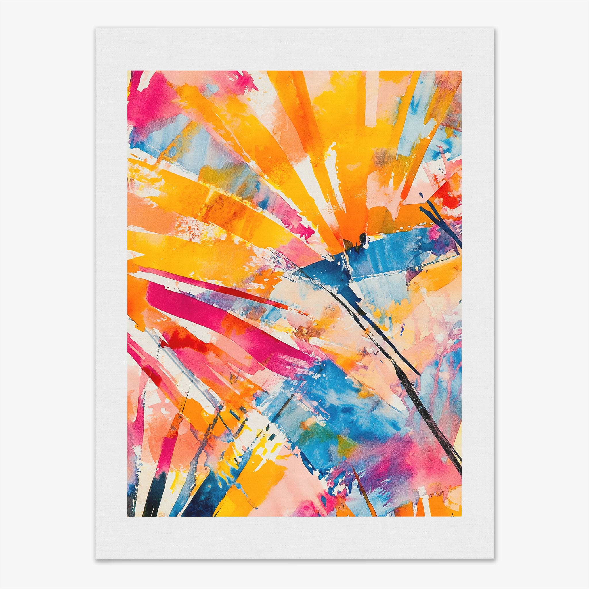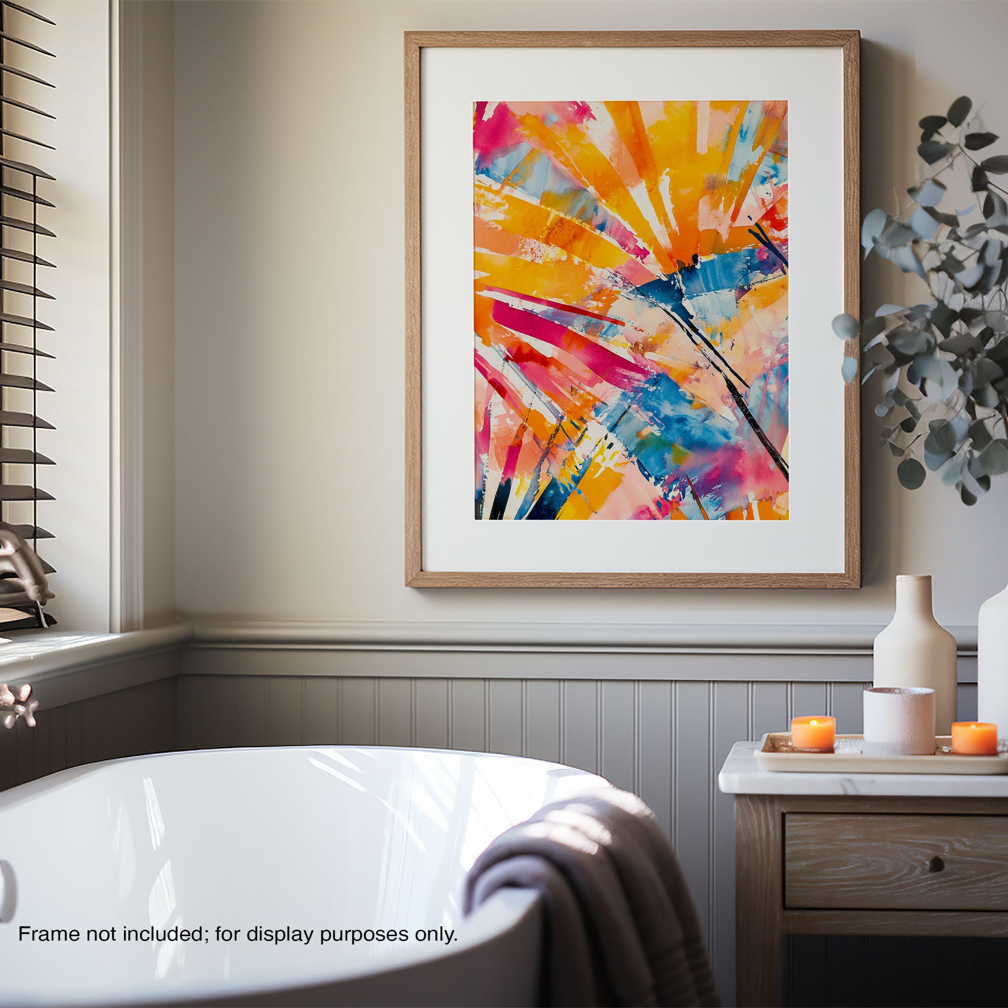 This vivid watercolor piece captures the explosive energy of a sunburst through abstract forms and lively, expressive color transitions. The blending of orange, pink, blue, and yellow hues, along with spontaneous drip effects, provide a dynamic visual experience that simulates the sensory overload of witnessing a sunrise. Apt for both modern interior spaces and collections accentuating vibrant abstracts, this artwork brings a piece of the sky's transcendent beauty indoors. Ideal for anyone looking to invigorate their environment with a splash of color and abstraction.