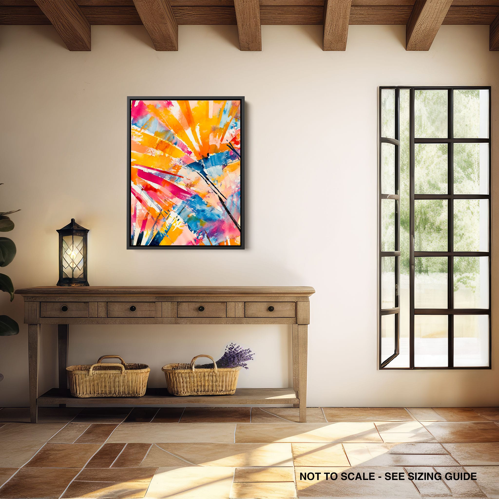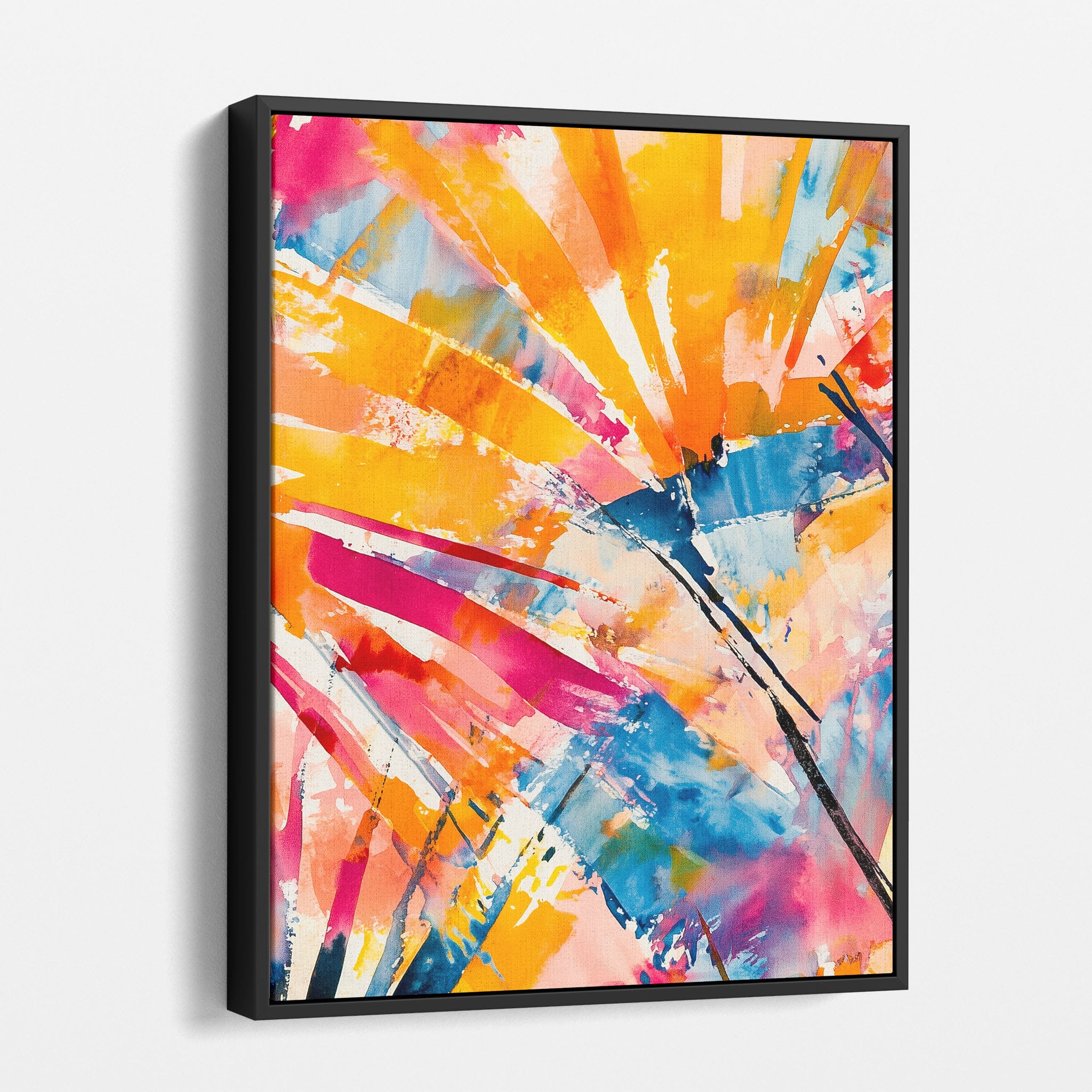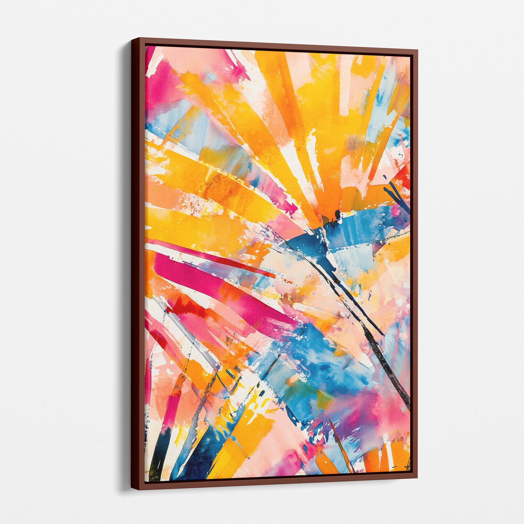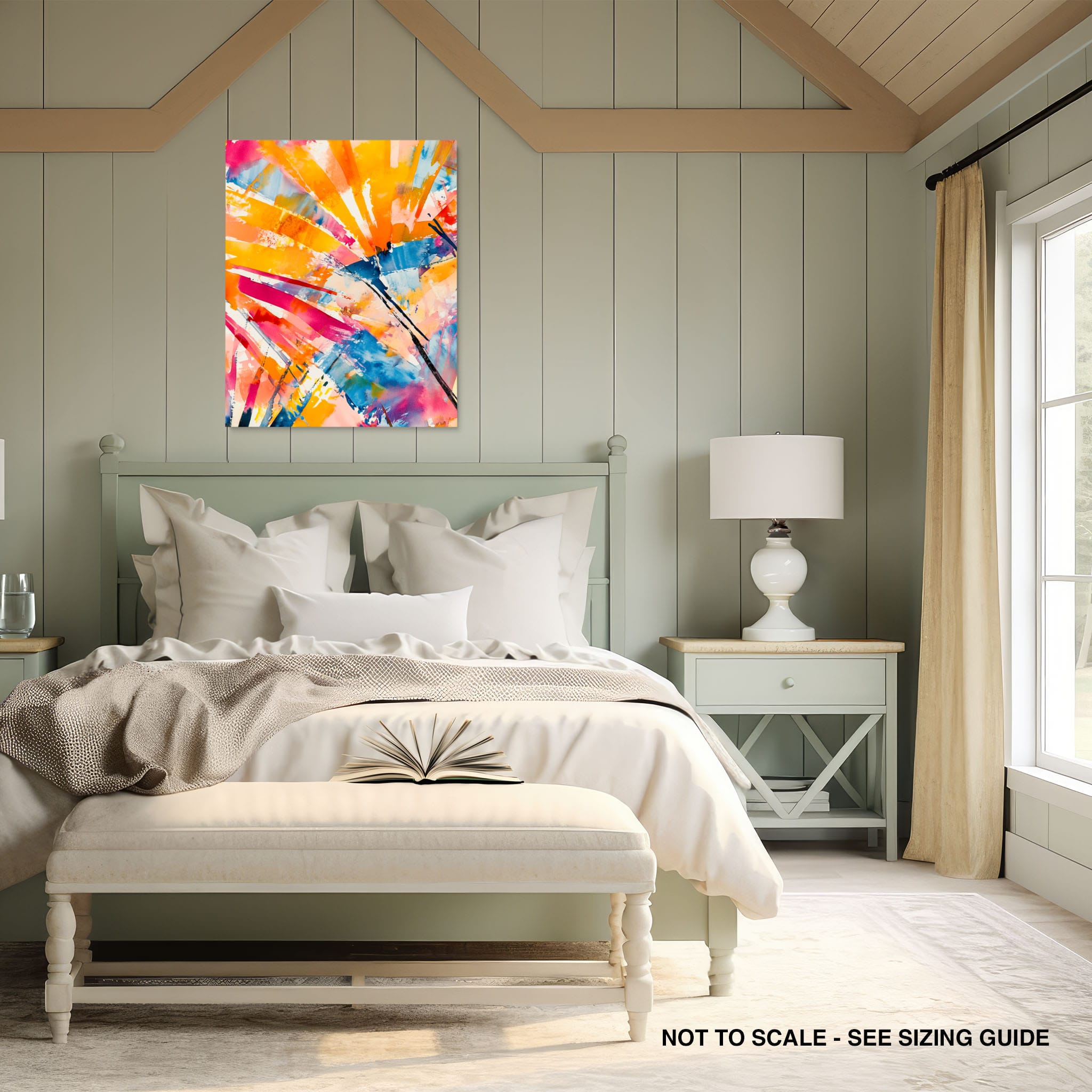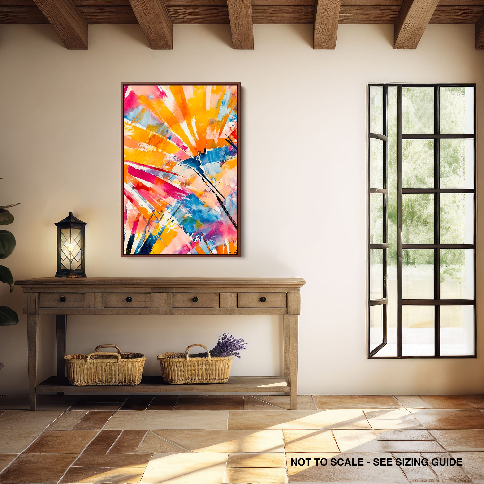 This vivid watercolor piece captures the explosive energy of a sunburst through abstract forms and lively, expressive color transitions. The blending of orange, pink, blue, and yellow hues, along with spontaneous drip effects, provide a dynamic visual experience that simulates the sensory overload of witnessing a sunrise. Apt for both modern interior spaces and collections accentuating vibrant abstracts, this artwork brings a piece of the sky's transcendent beauty indoors. Ideal for anyone looking to invigorate their environment with a splash of color and abstraction.