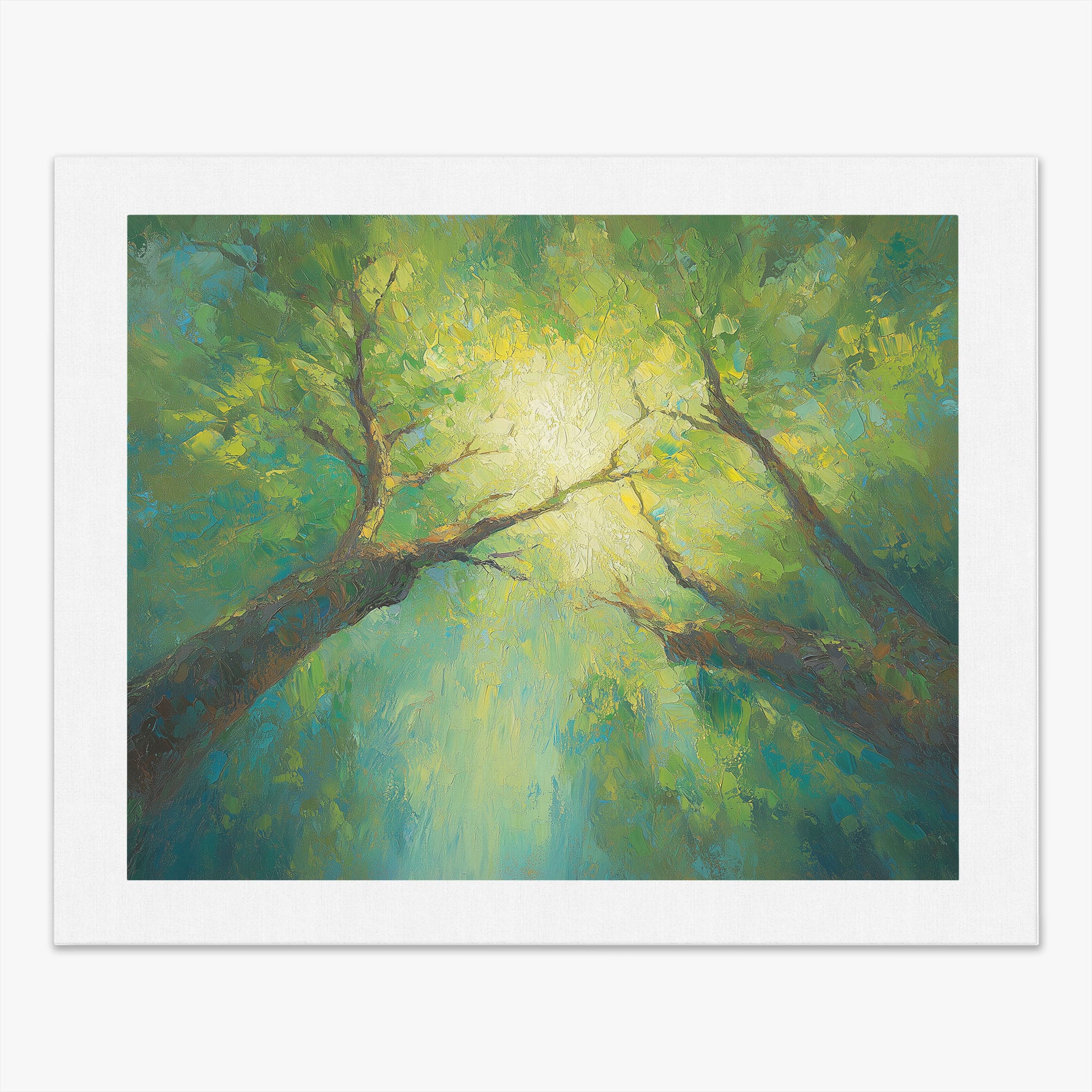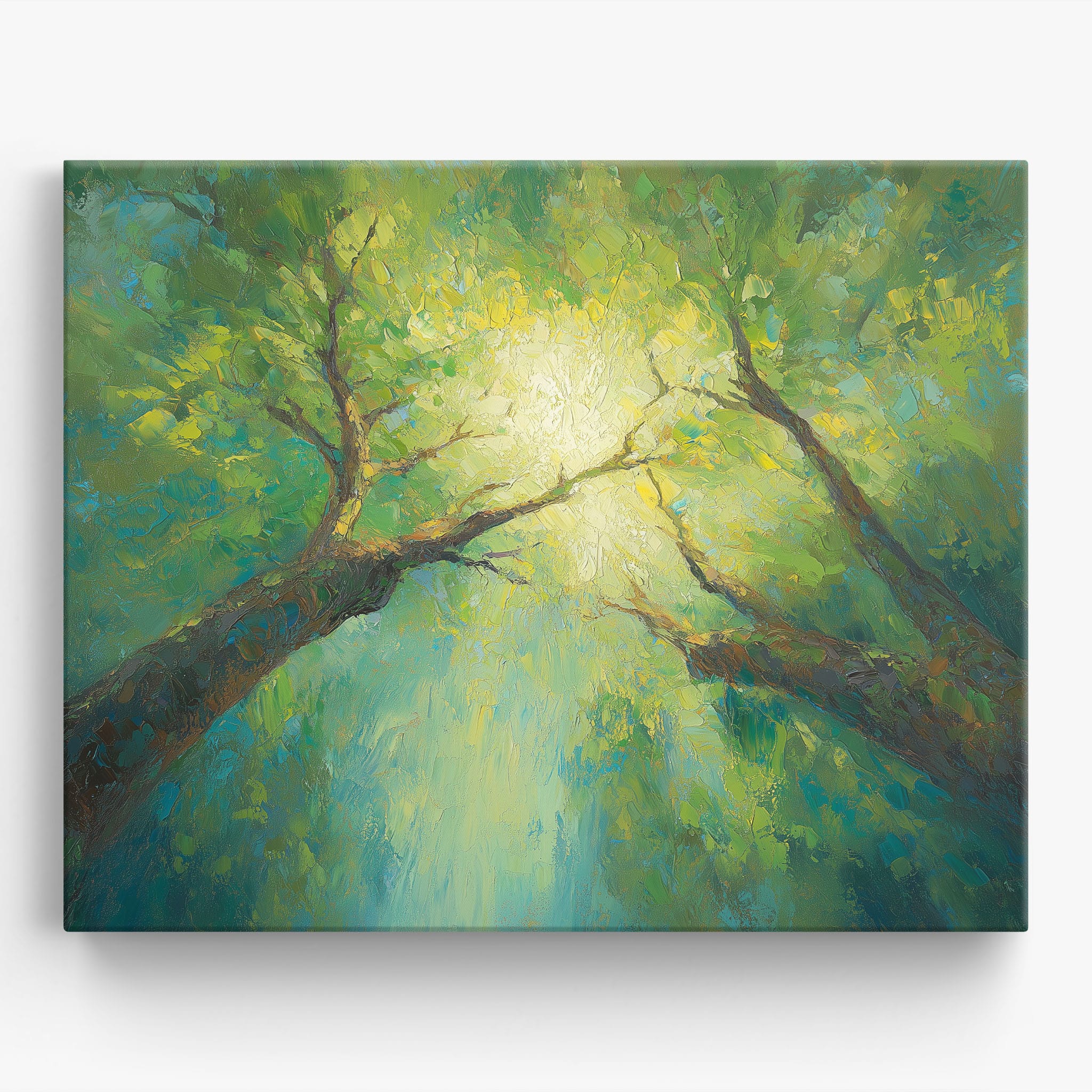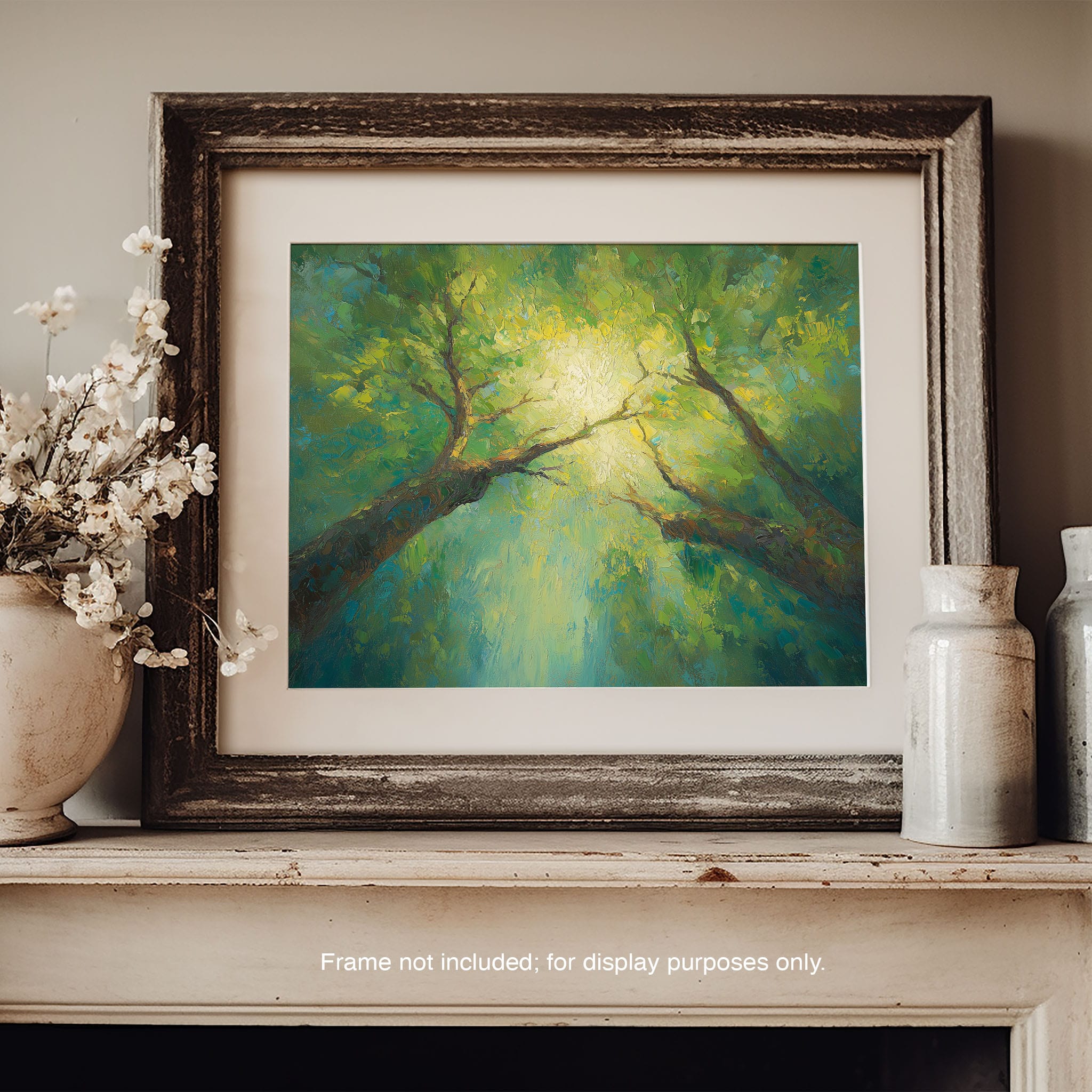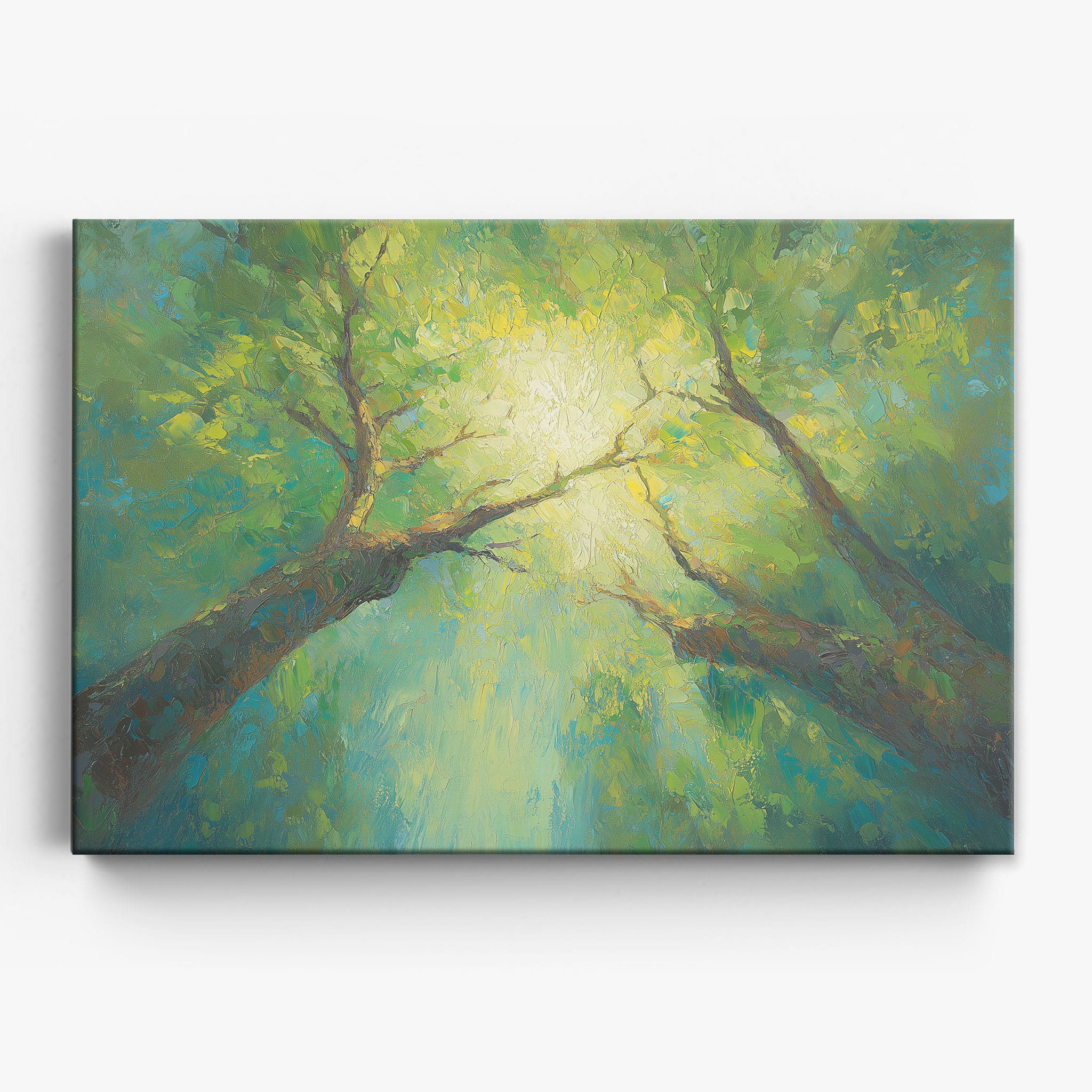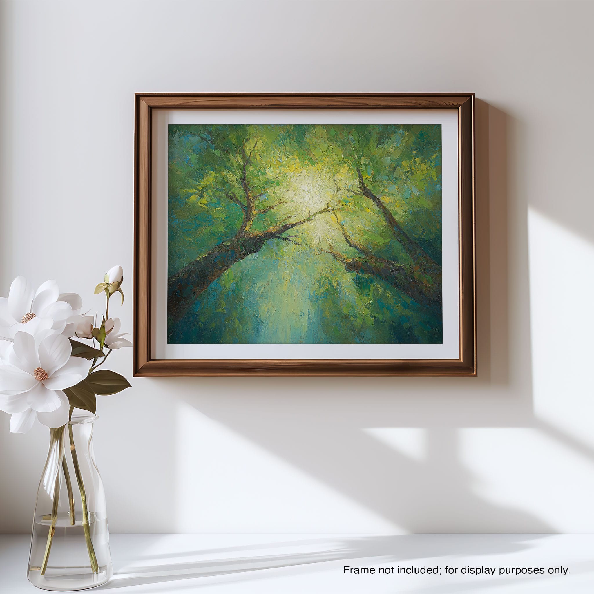 This painting captures a dynamic play of light and shadow through a lush, green landscape, depicted with abstract, thick brushstrokes typical of Impressionist technique. Evoking a mid-morning radiance peeking through richly textured tree canopies, the artwork invites viewers into a serene, verdant world. Perfect for bringing a touch of calm elegance to any living space, this art piece appeals to those who appreciate nature's beauty meticulously rendered through expressive, vibrant hues and discernible forms, enhancing any art collection with a serene yet illustrative quality.