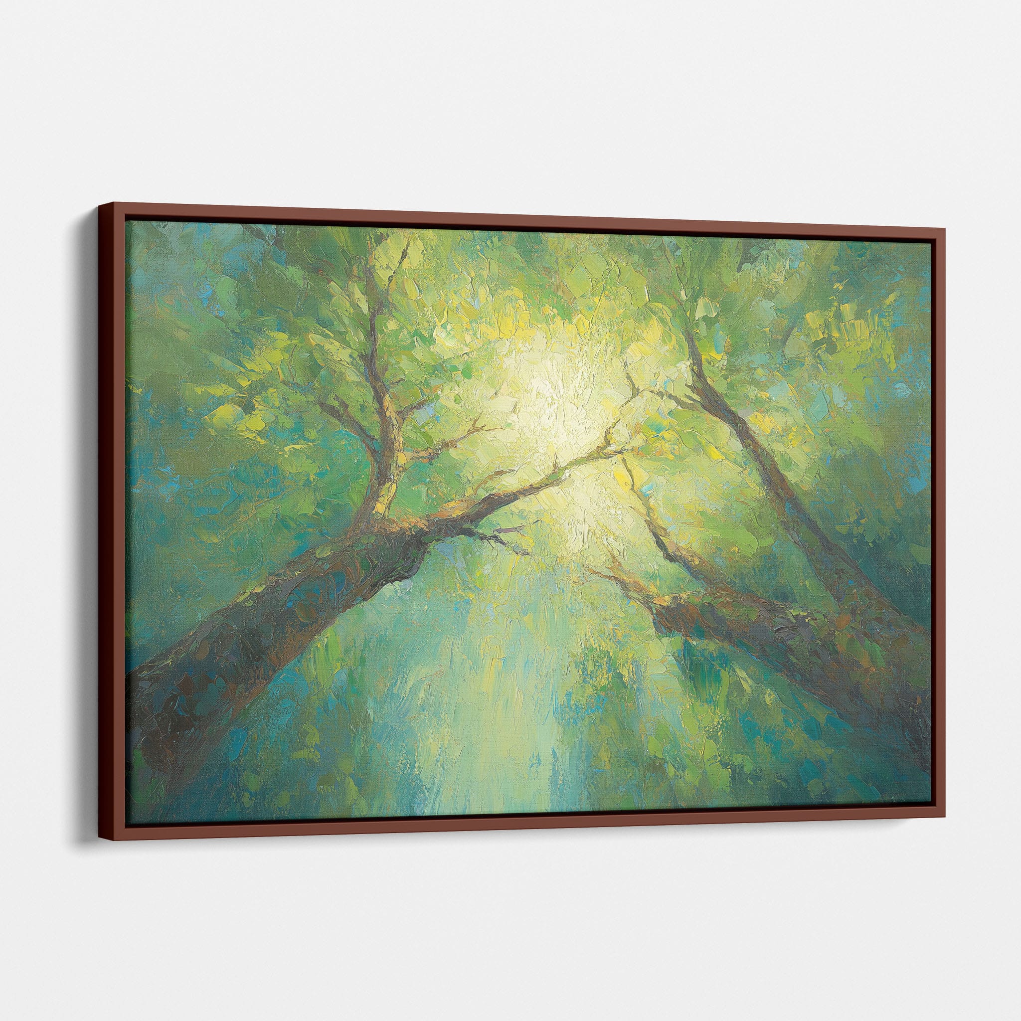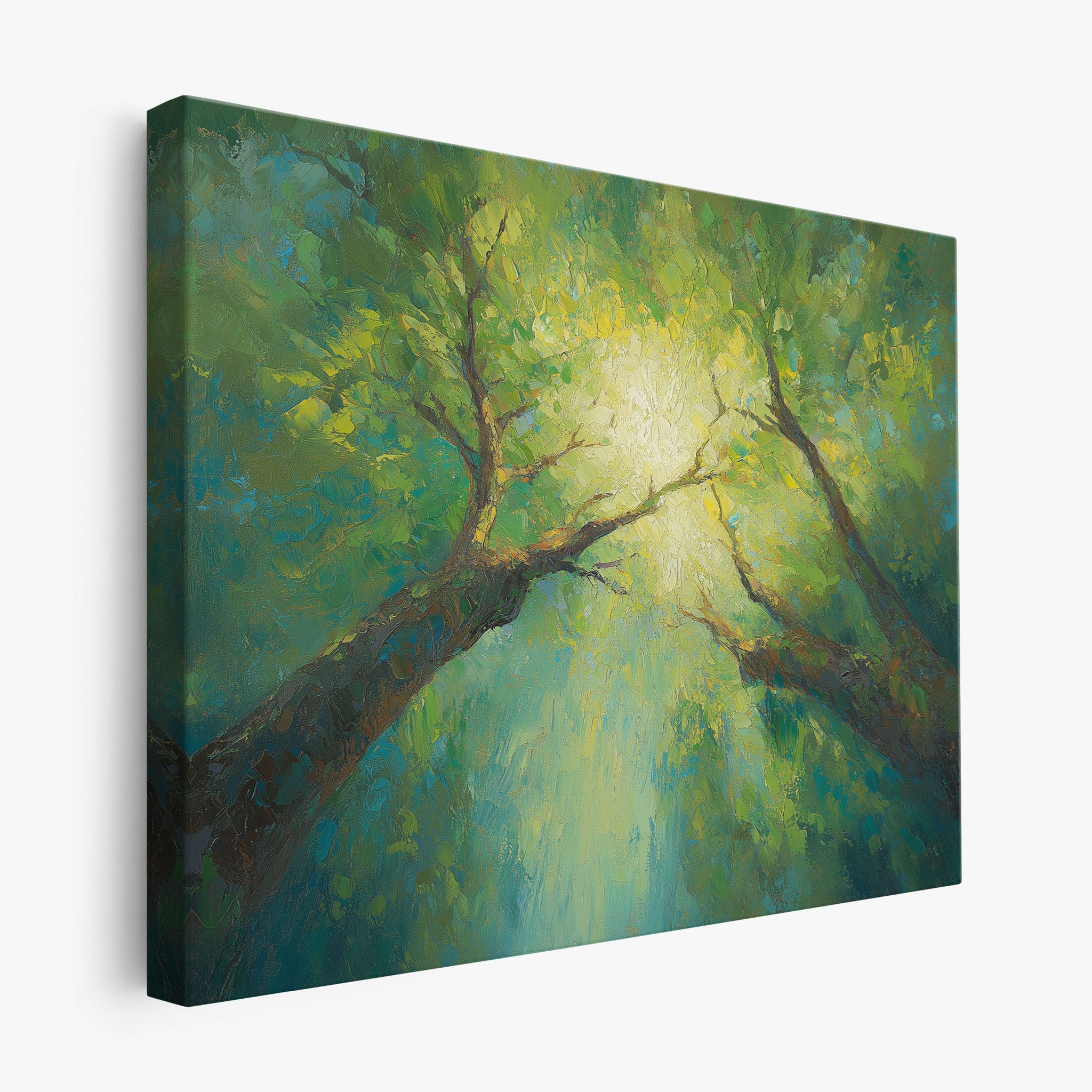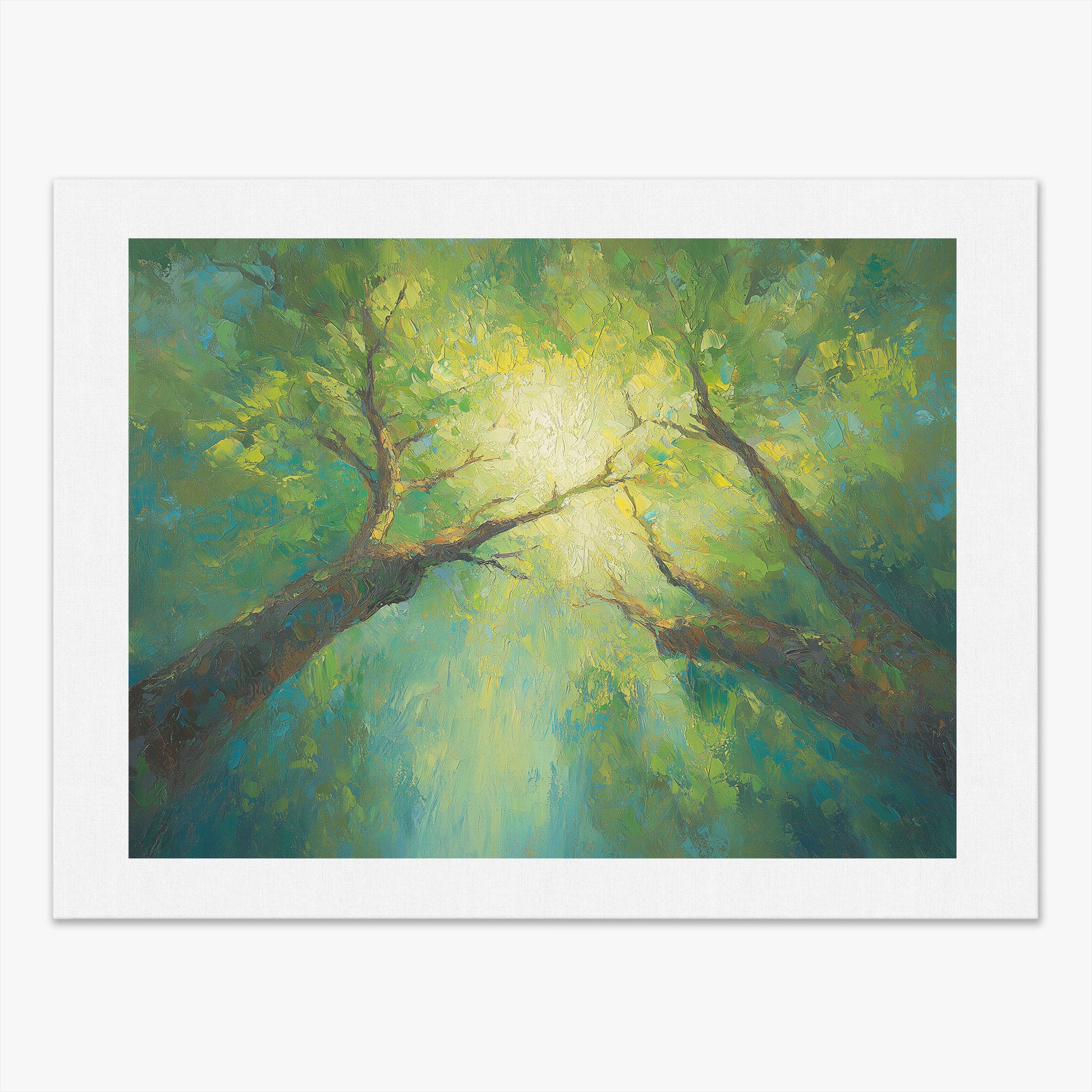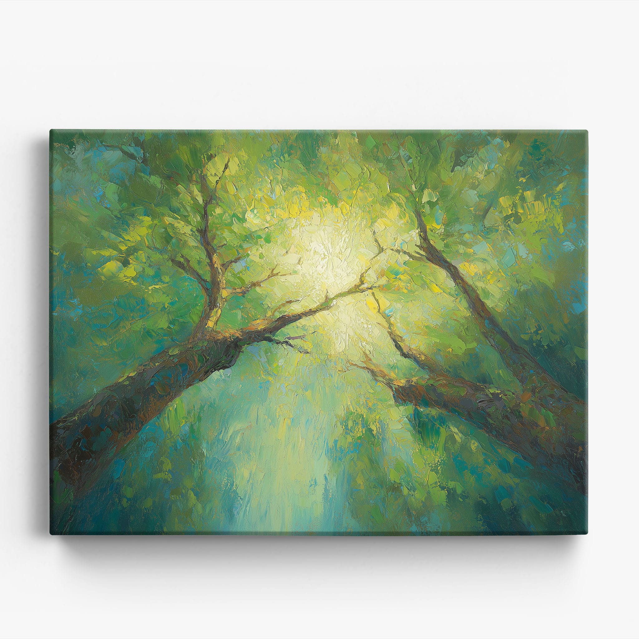 This painting captures a dynamic play of light and shadow through a lush, green landscape, depicted with abstract, thick brushstrokes typical of Impressionist technique. Evoking a mid-morning radiance peeking through richly textured tree canopies, the artwork invites viewers into a serene, verdant world. Perfect for bringing a touch of calm elegance to any living space, this art piece appeals to those who appreciate nature's beauty meticulously rendered through expressive, vibrant hues and discernible forms, enhancing any art collection with a serene yet illustrative quality.