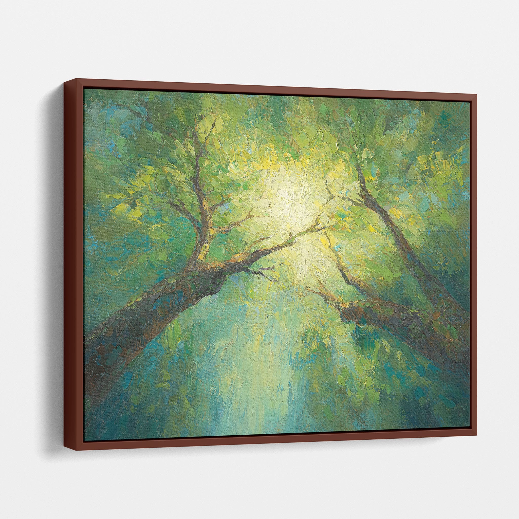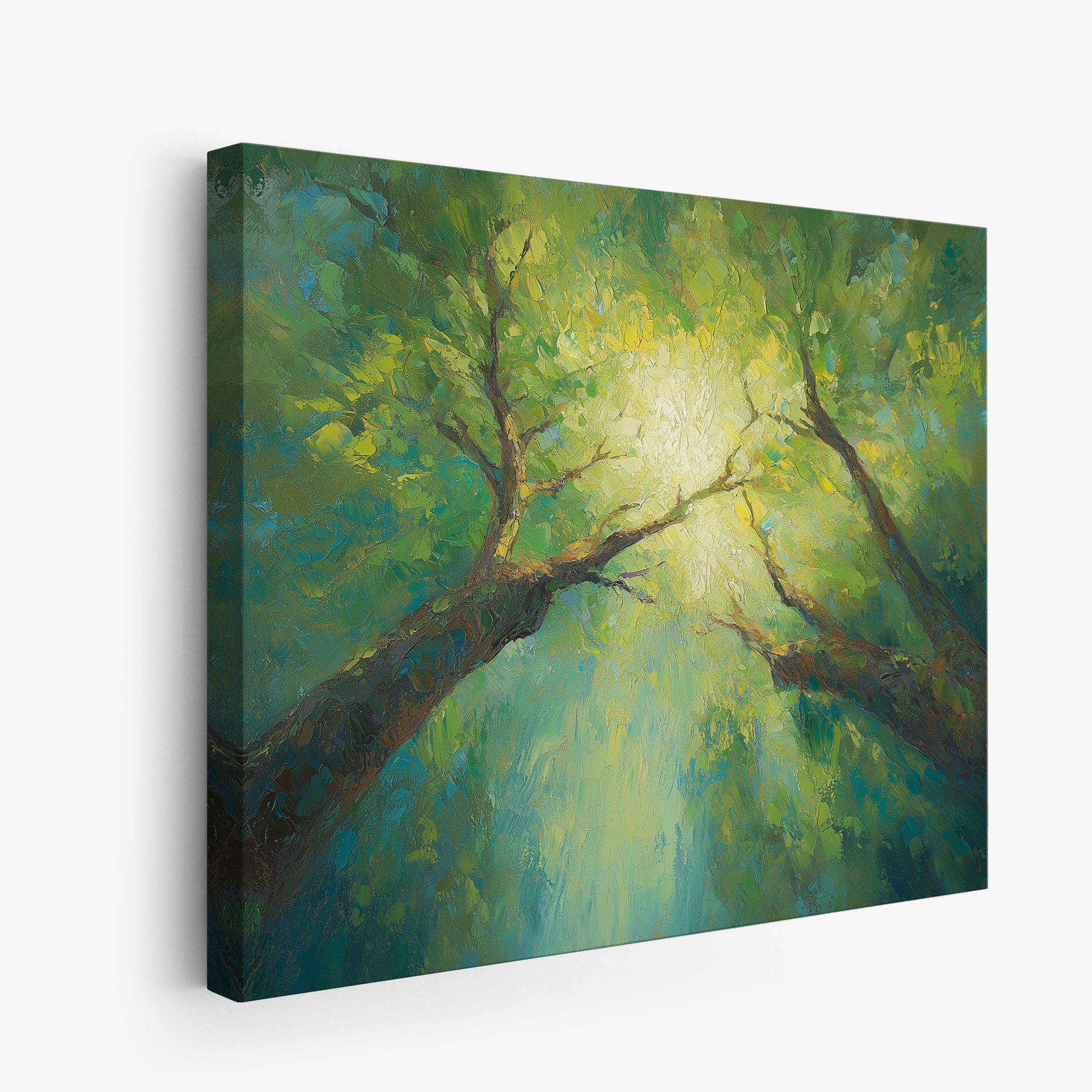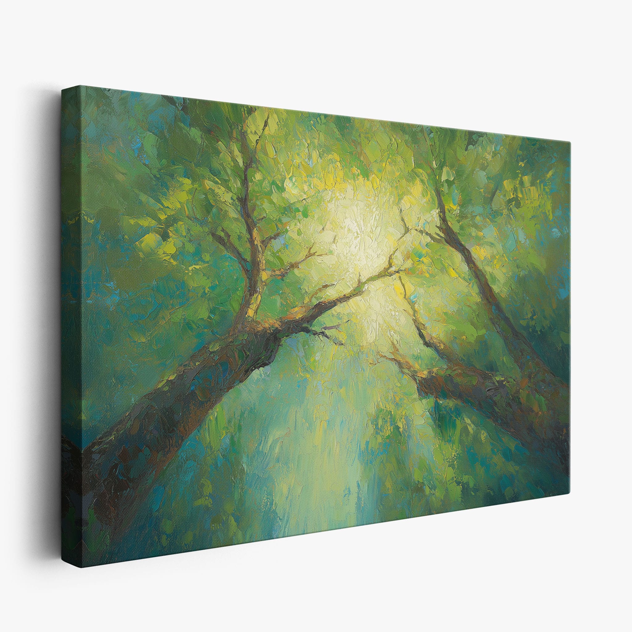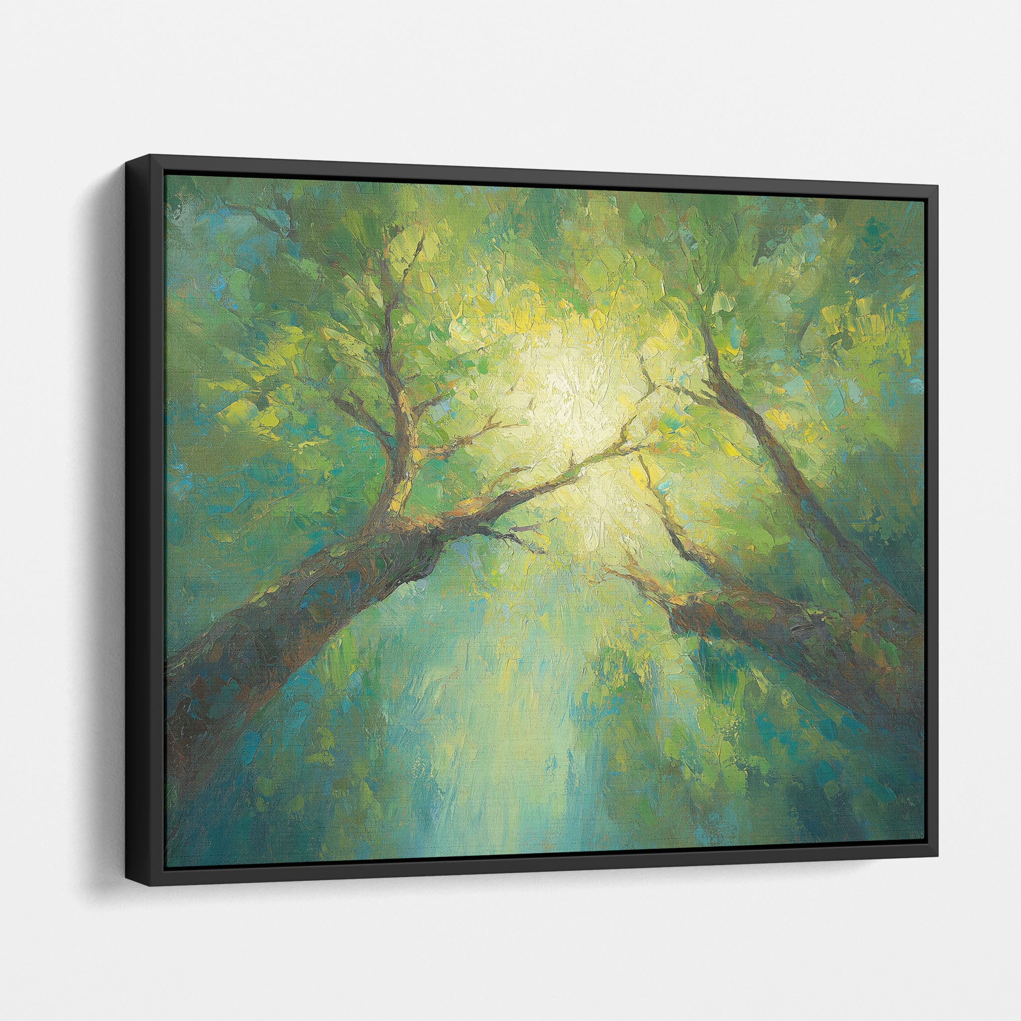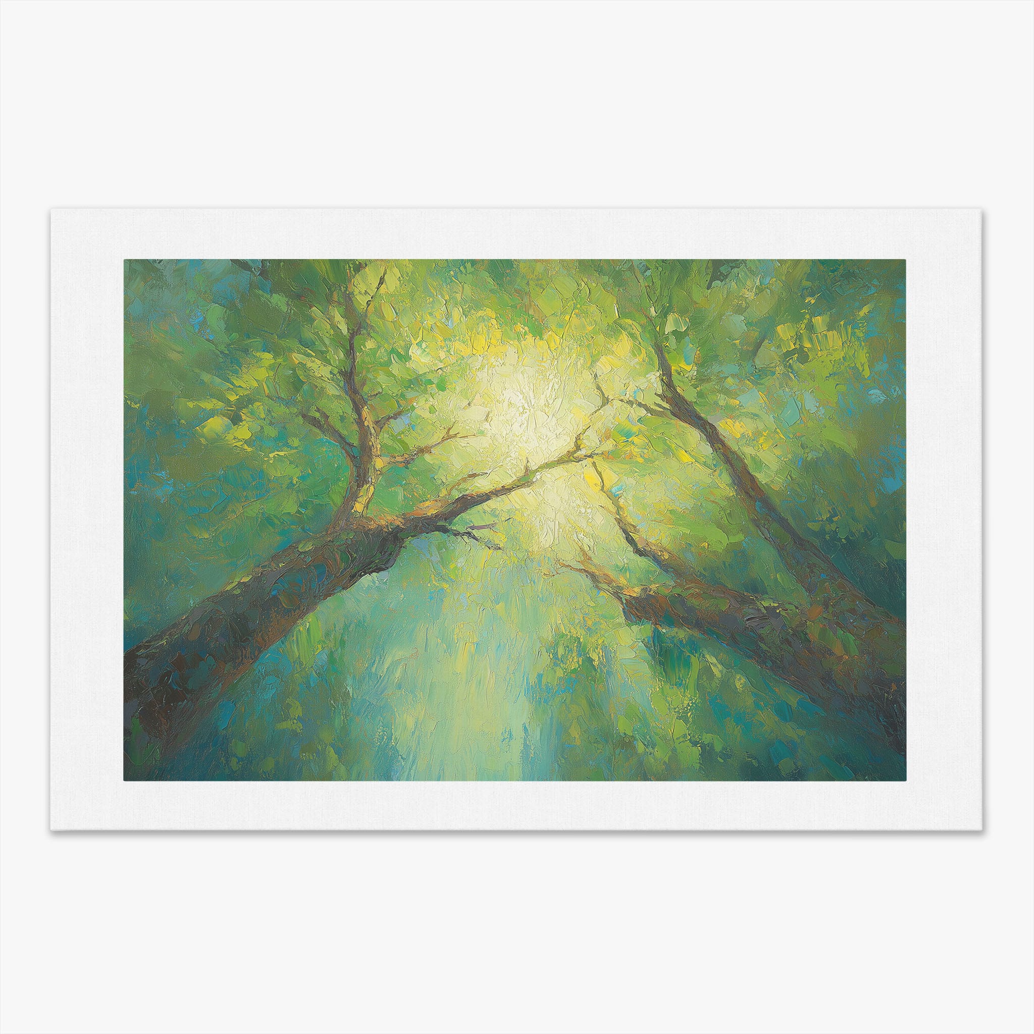 This painting captures a dynamic play of light and shadow through a lush, green landscape, depicted with abstract, thick brushstrokes typical of Impressionist technique. Evoking a mid-morning radiance peeking through richly textured tree canopies, the artwork invites viewers into a serene, verdant world. Perfect for bringing a touch of calm elegance to any living space, this art piece appeals to those who appreciate nature's beauty meticulously rendered through expressive, vibrant hues and discernible forms, enhancing any art collection with a serene yet illustrative quality.