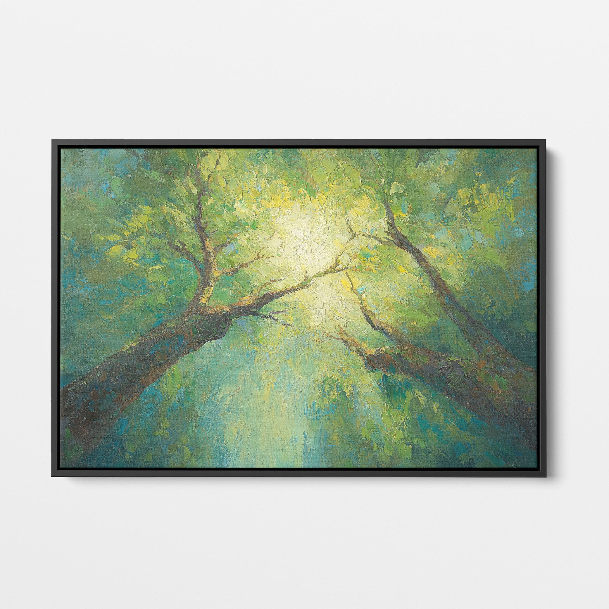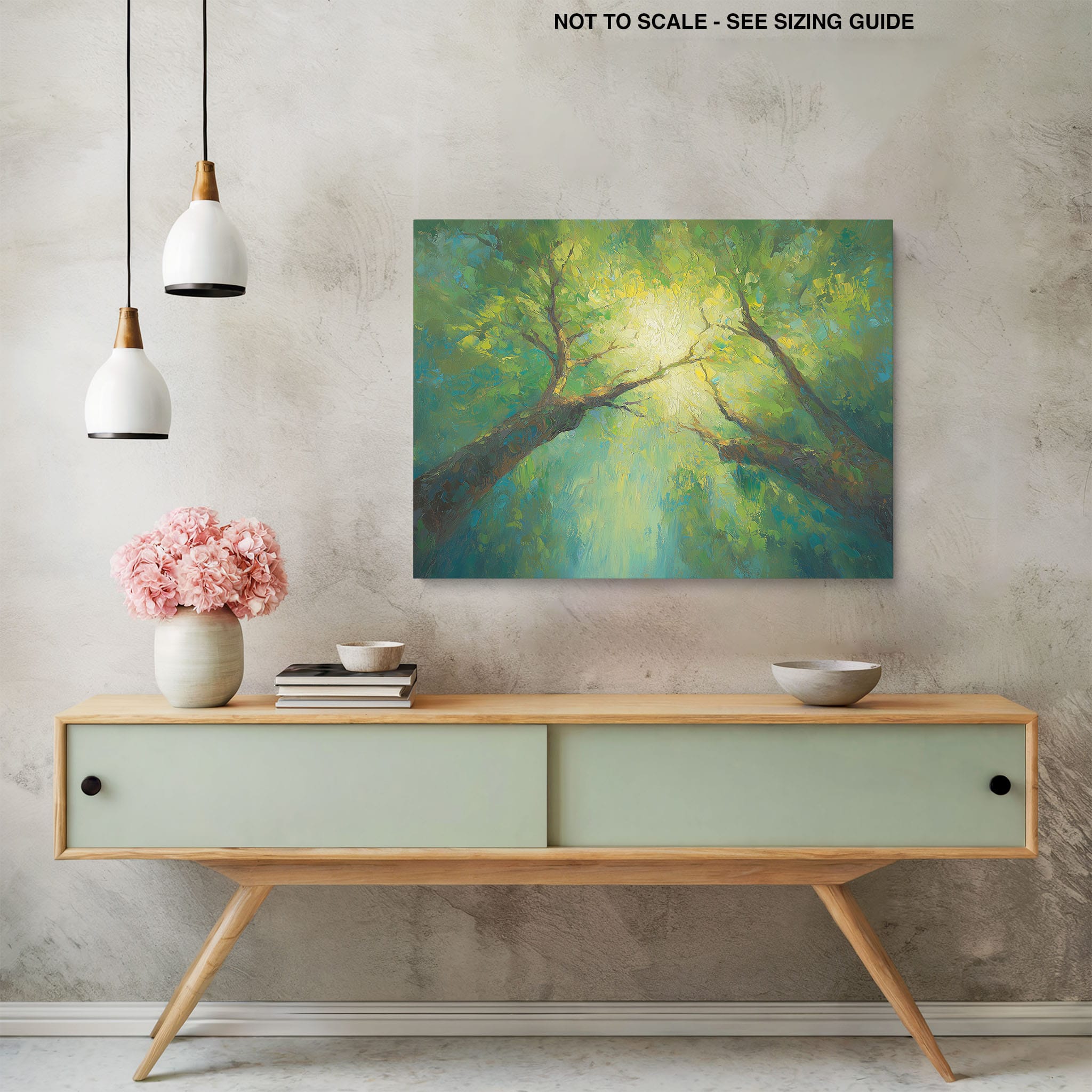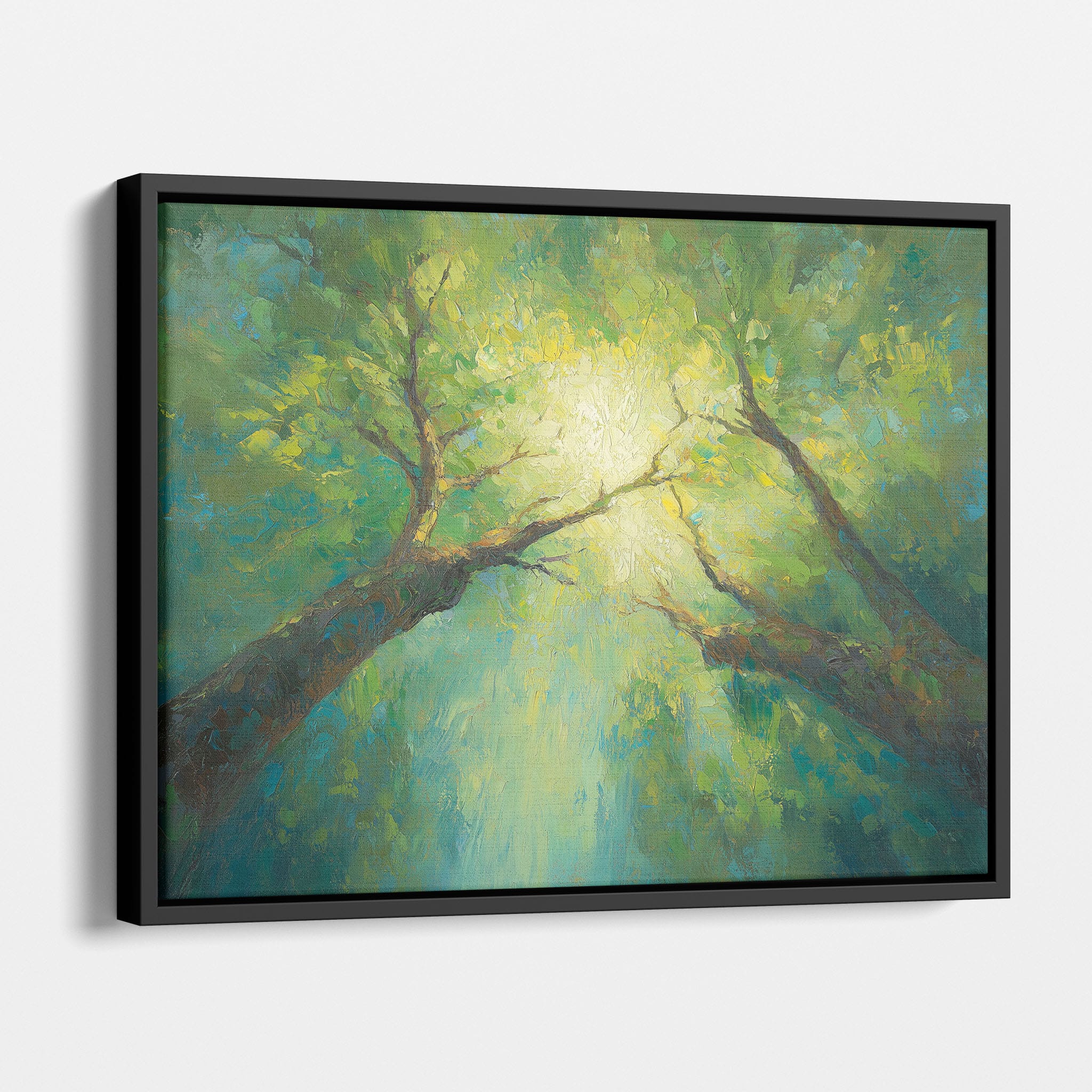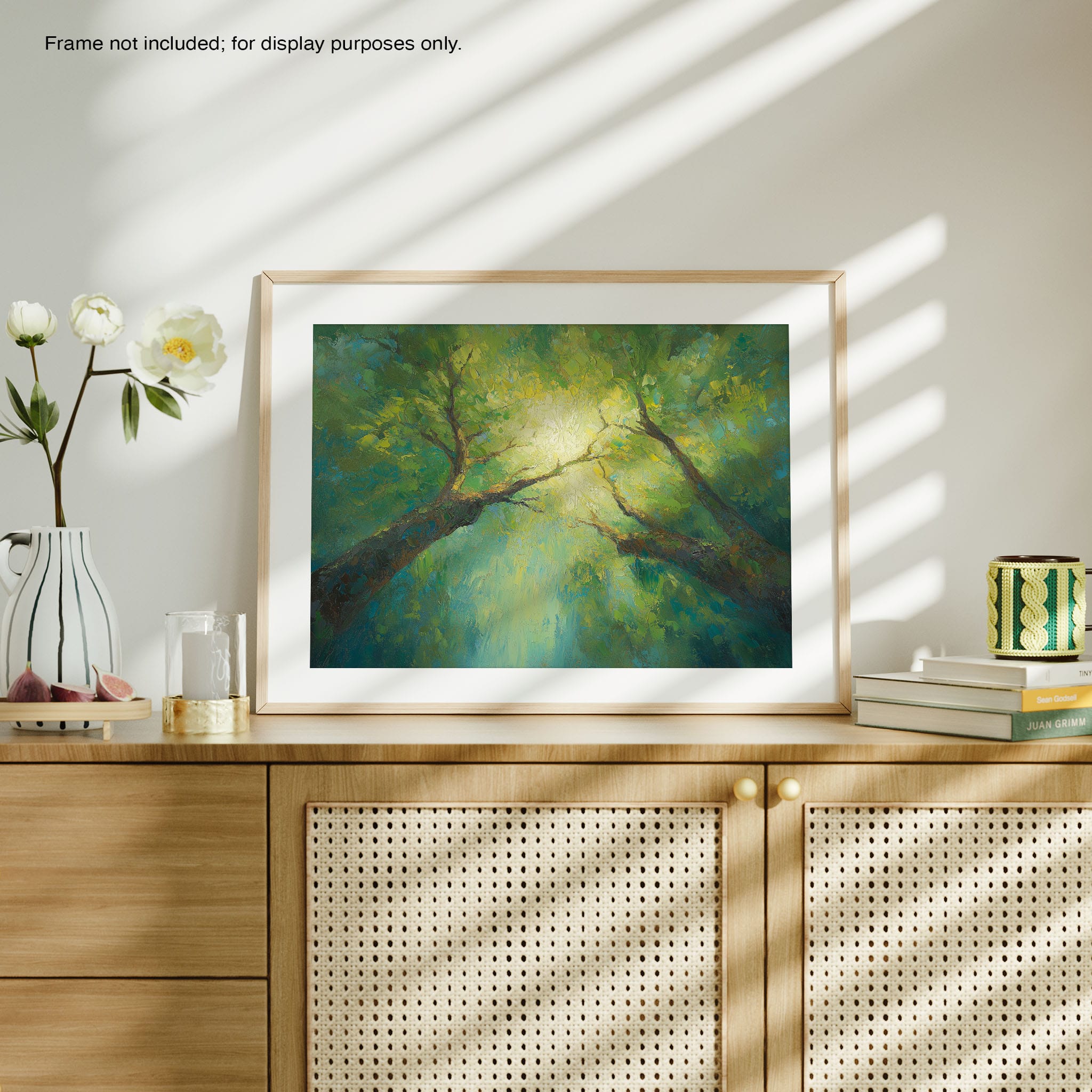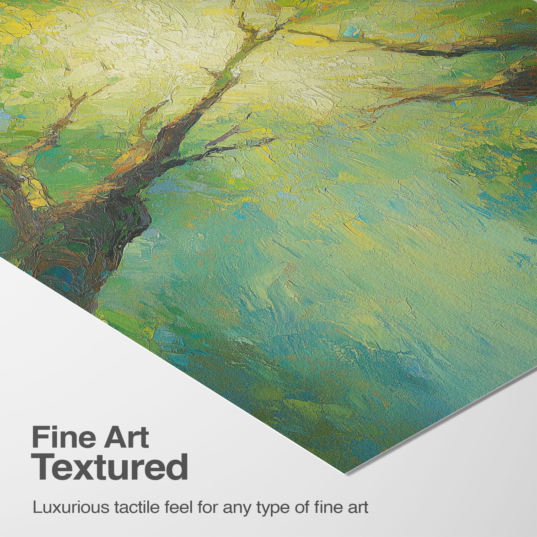 This painting captures a dynamic play of light and shadow through a lush, green landscape, depicted with abstract, thick brushstrokes typical of Impressionist technique. Evoking a mid-morning radiance peeking through richly textured tree canopies, the artwork invites viewers into a serene, verdant world. Perfect for bringing a touch of calm elegance to any living space, this art piece appeals to those who appreciate nature's beauty meticulously rendered through expressive, vibrant hues and discernible forms, enhancing any art collection with a serene yet illustrative quality.