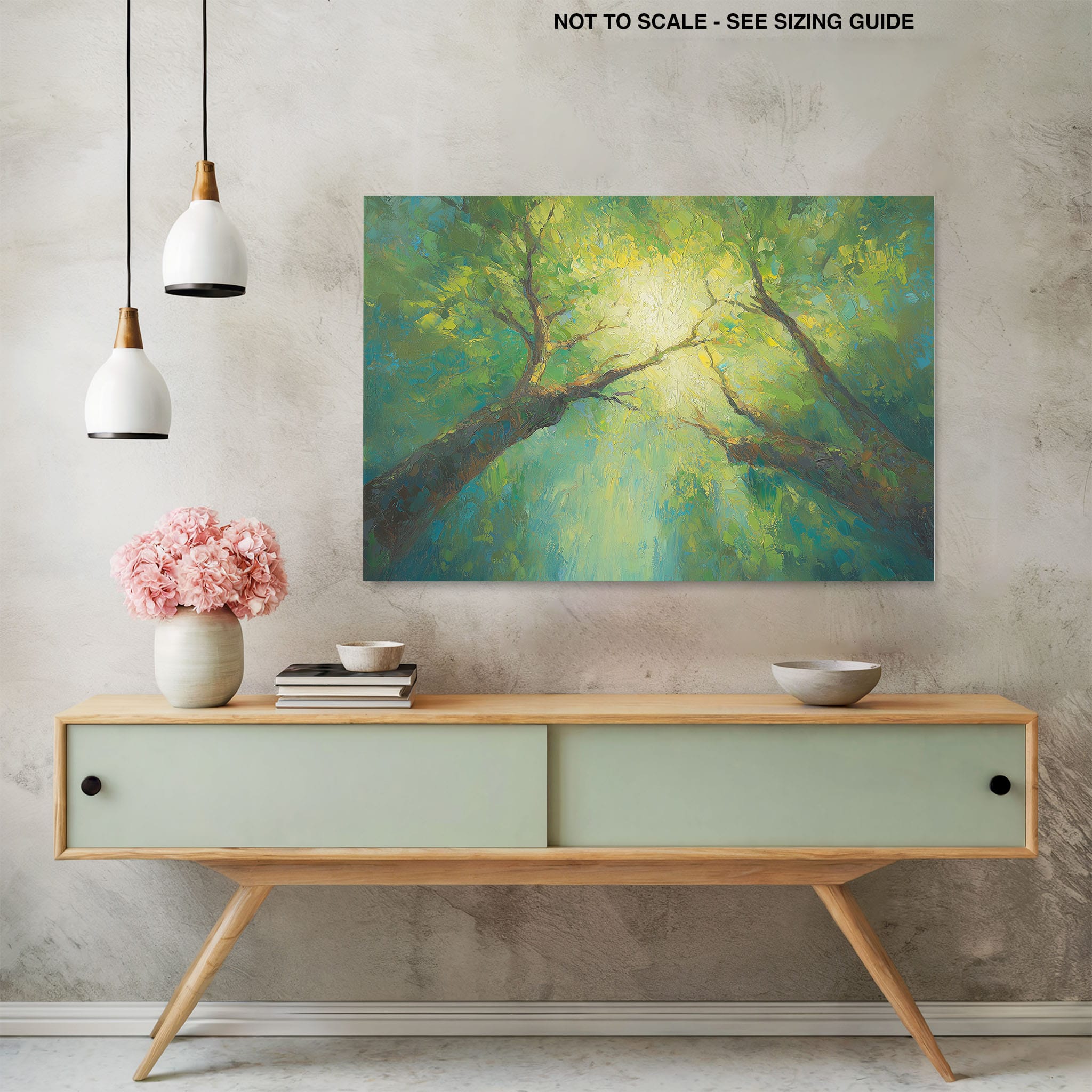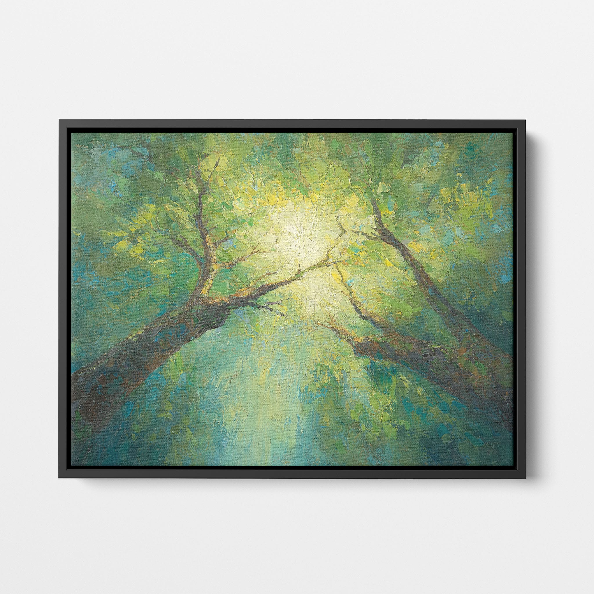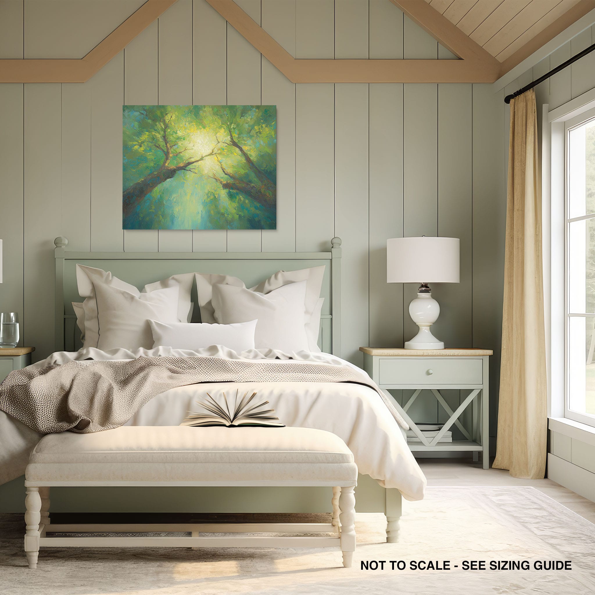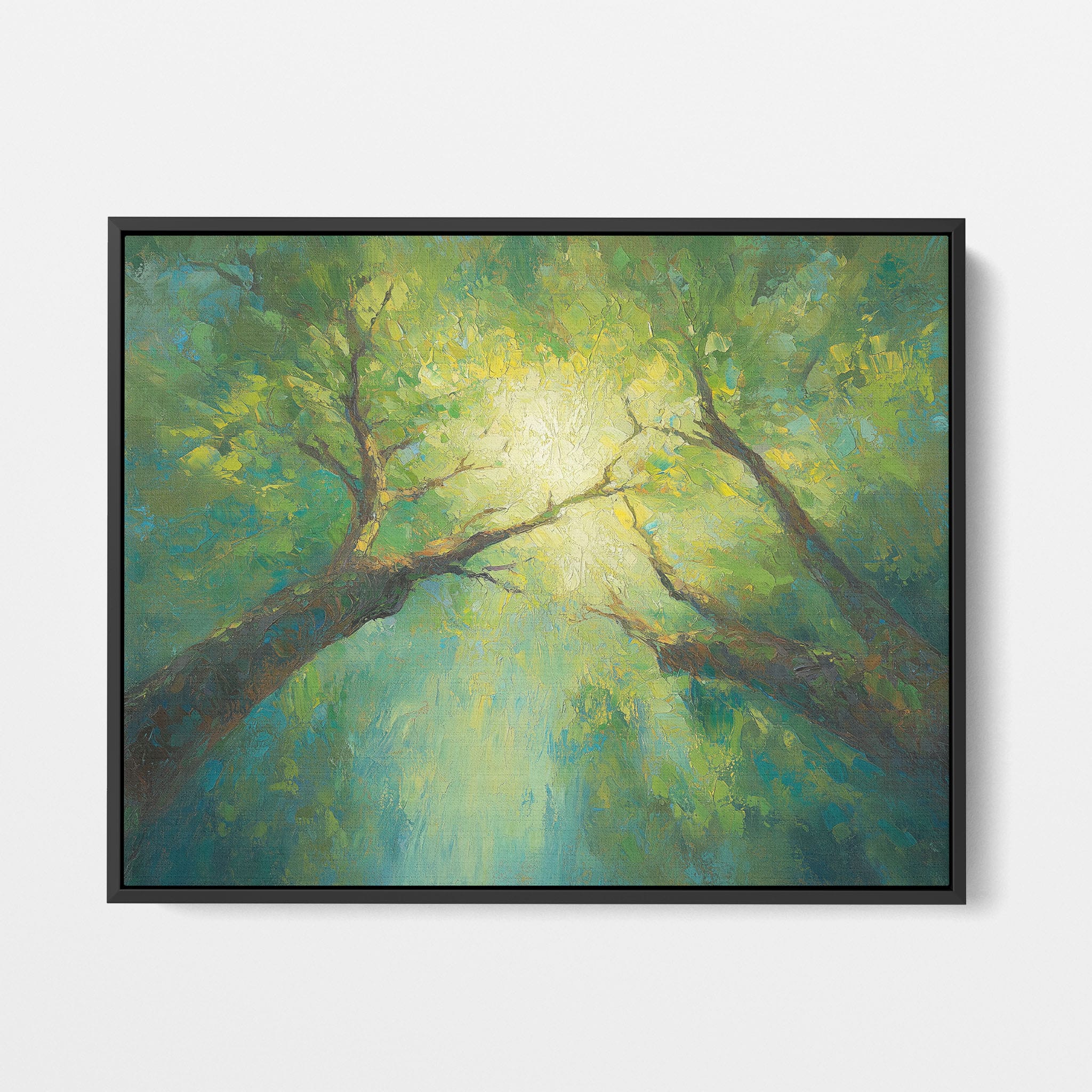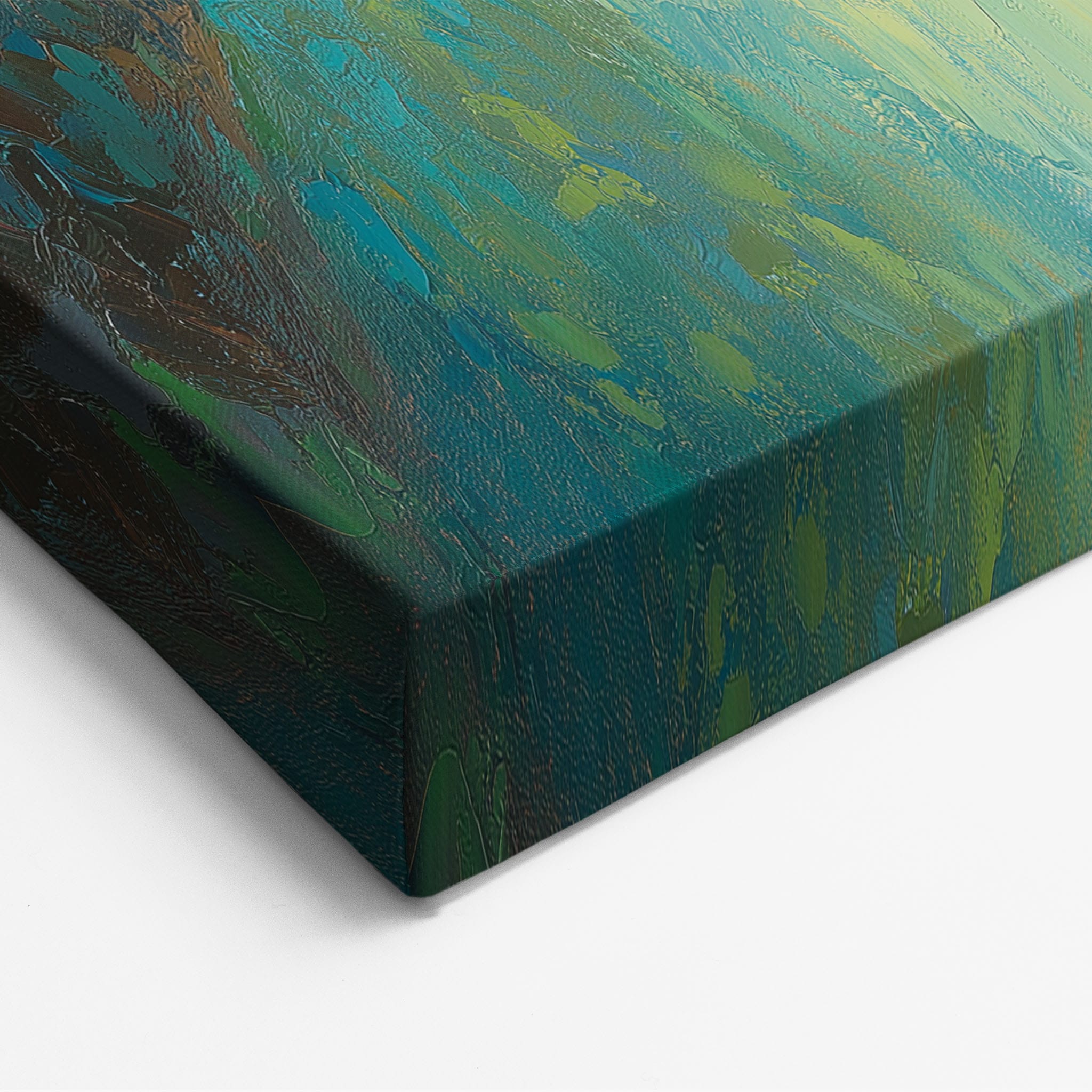 This painting captures a dynamic play of light and shadow through a lush, green landscape, depicted with abstract, thick brushstrokes typical of Impressionist technique. Evoking a mid-morning radiance peeking through richly textured tree canopies, the artwork invites viewers into a serene, verdant world. Perfect for bringing a touch of calm elegance to any living space, this art piece appeals to those who appreciate nature's beauty meticulously rendered through expressive, vibrant hues and discernible forms, enhancing any art collection with a serene yet illustrative quality.