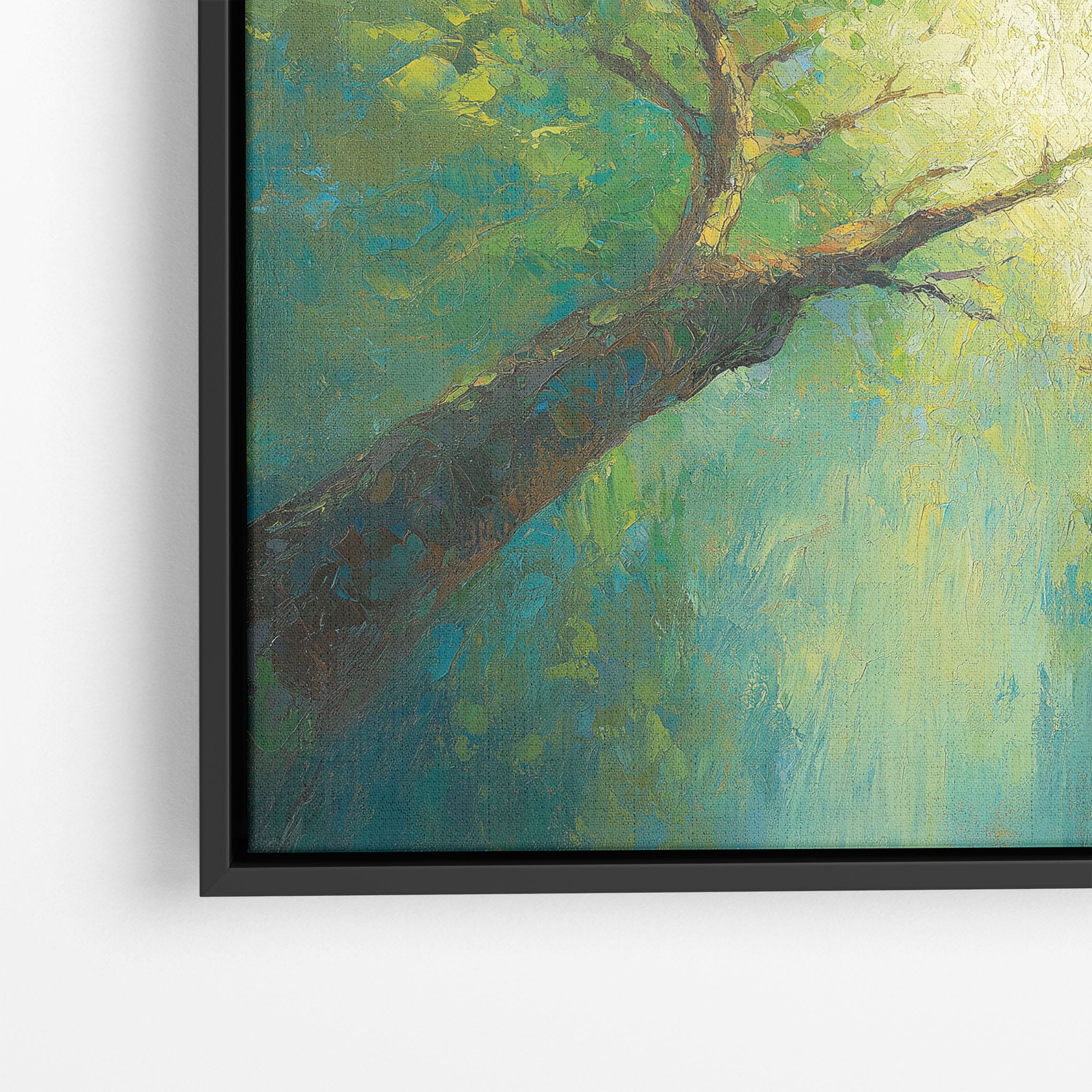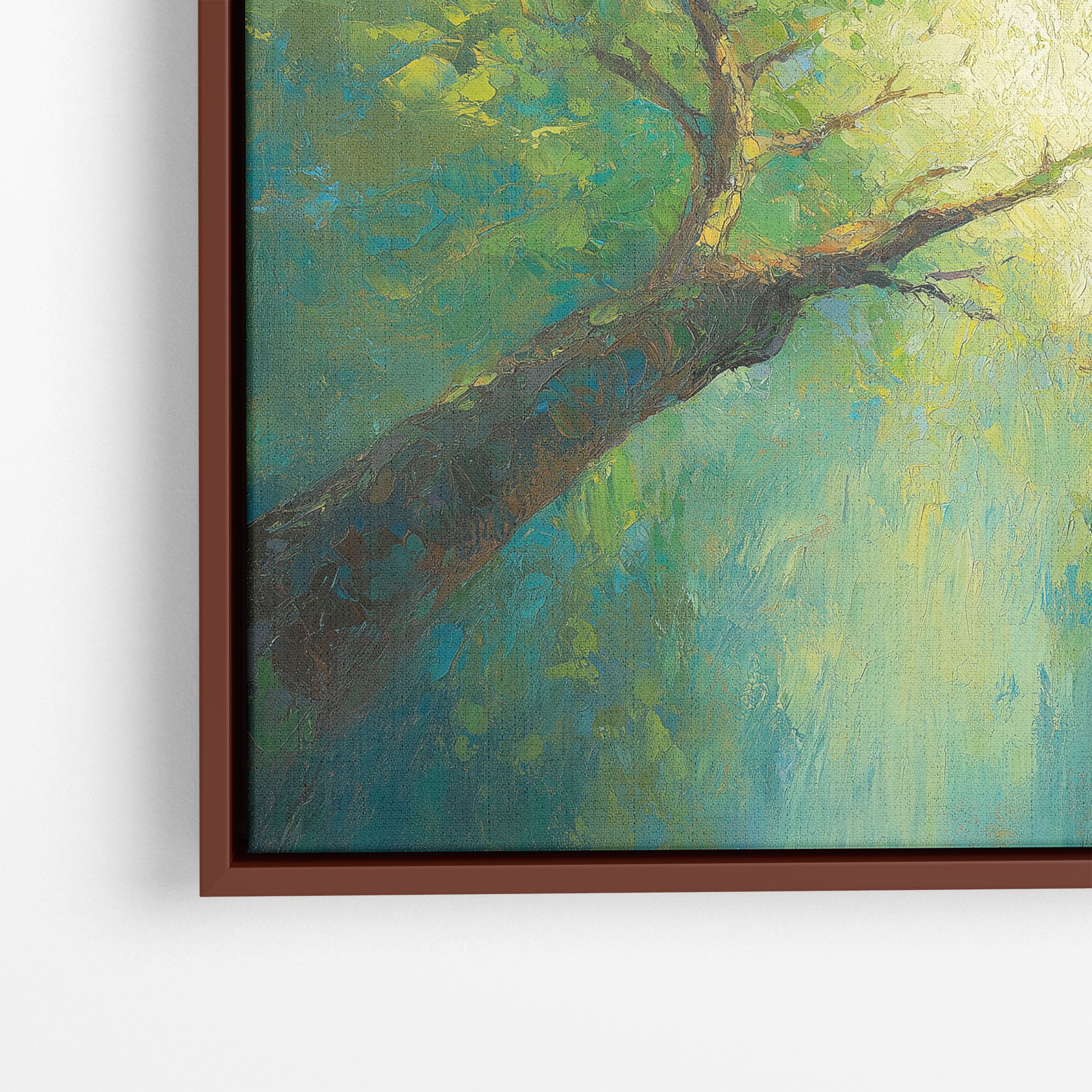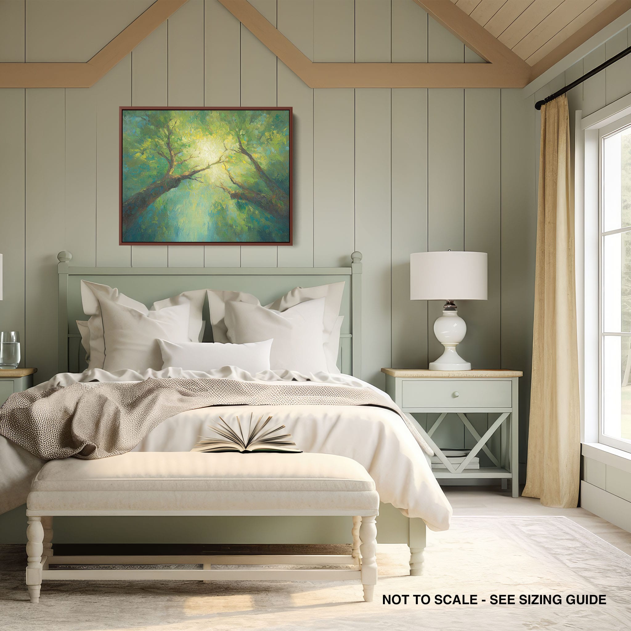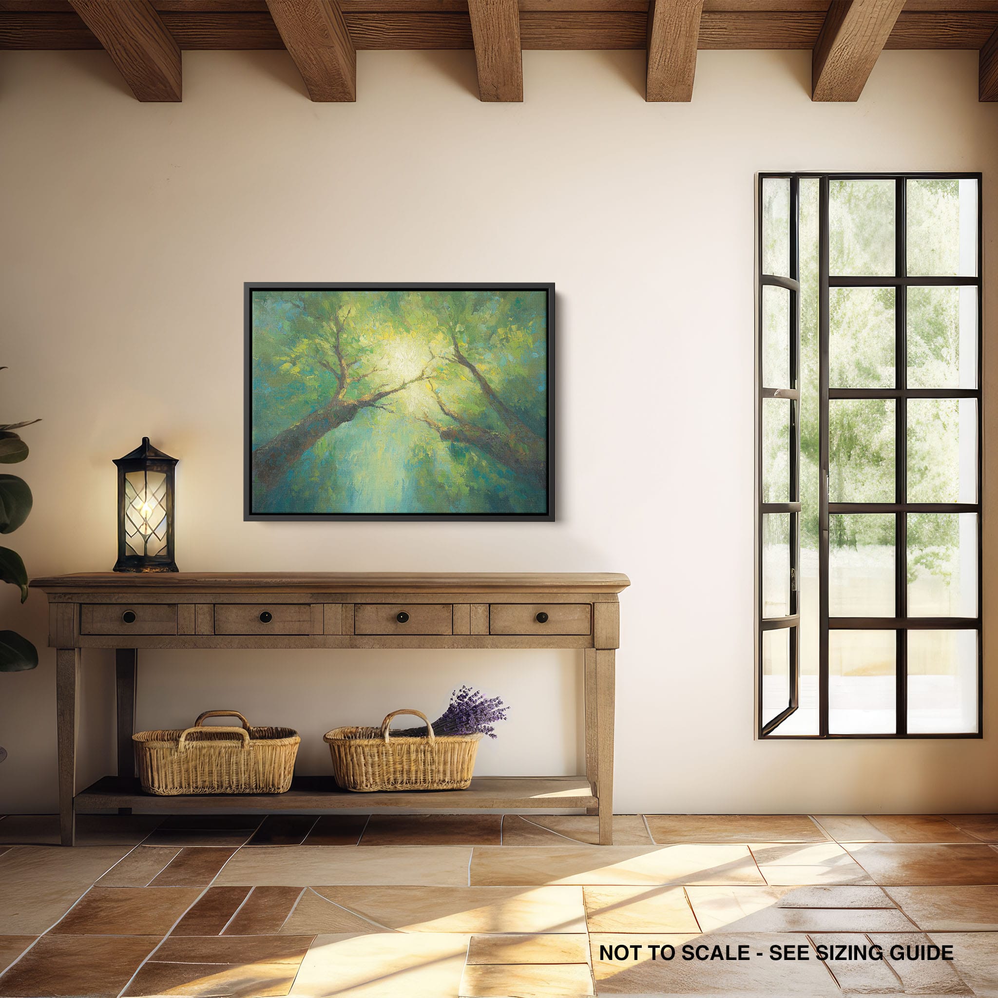 This painting captures a dynamic play of light and shadow through a lush, green landscape, depicted with abstract, thick brushstrokes typical of Impressionist technique. Evoking a mid-morning radiance peeking through richly textured tree canopies, the artwork invites viewers into a serene, verdant world. Perfect for bringing a touch of calm elegance to any living space, this art piece appeals to those who appreciate nature's beauty meticulously rendered through expressive, vibrant hues and discernible forms, enhancing any art collection with a serene yet illustrative quality.