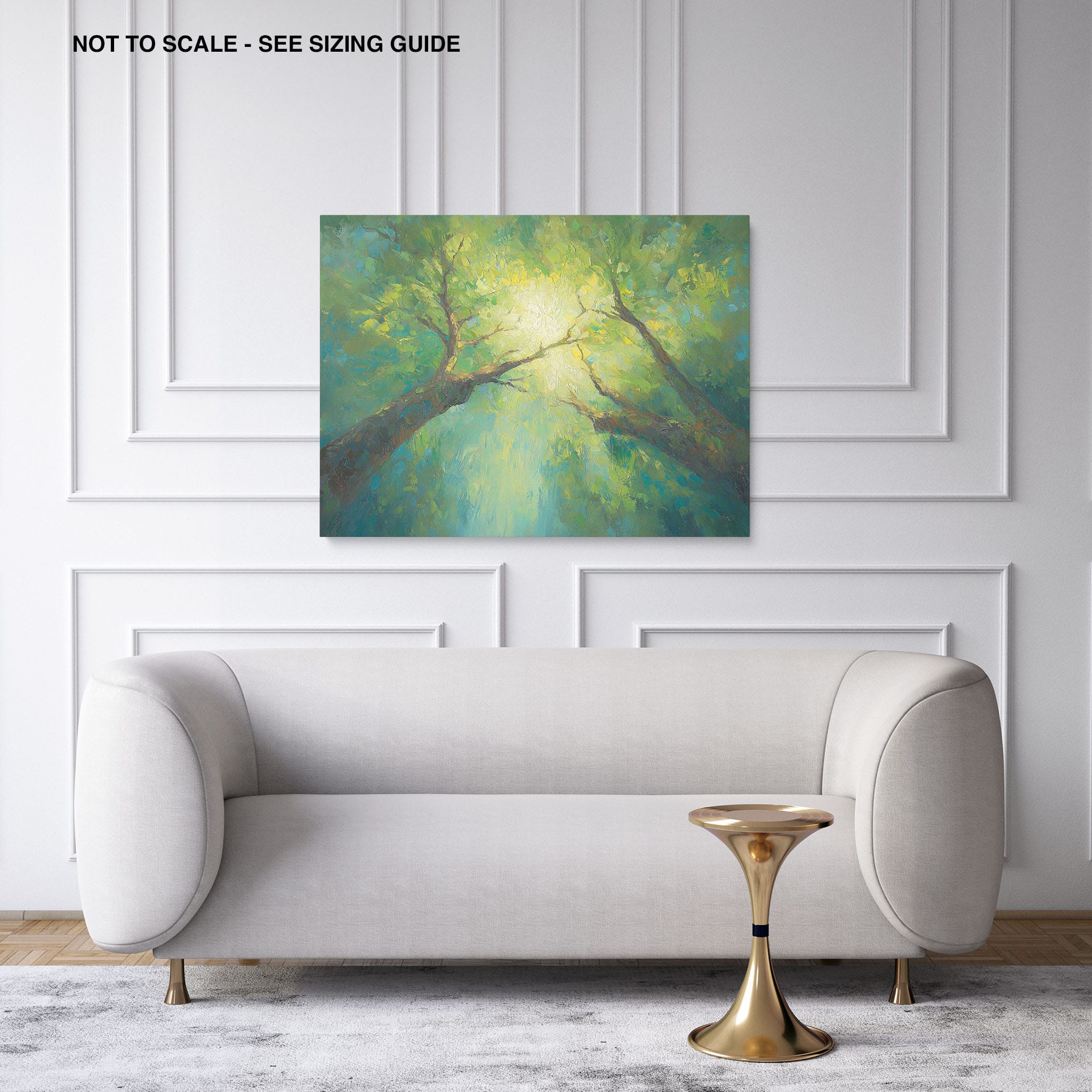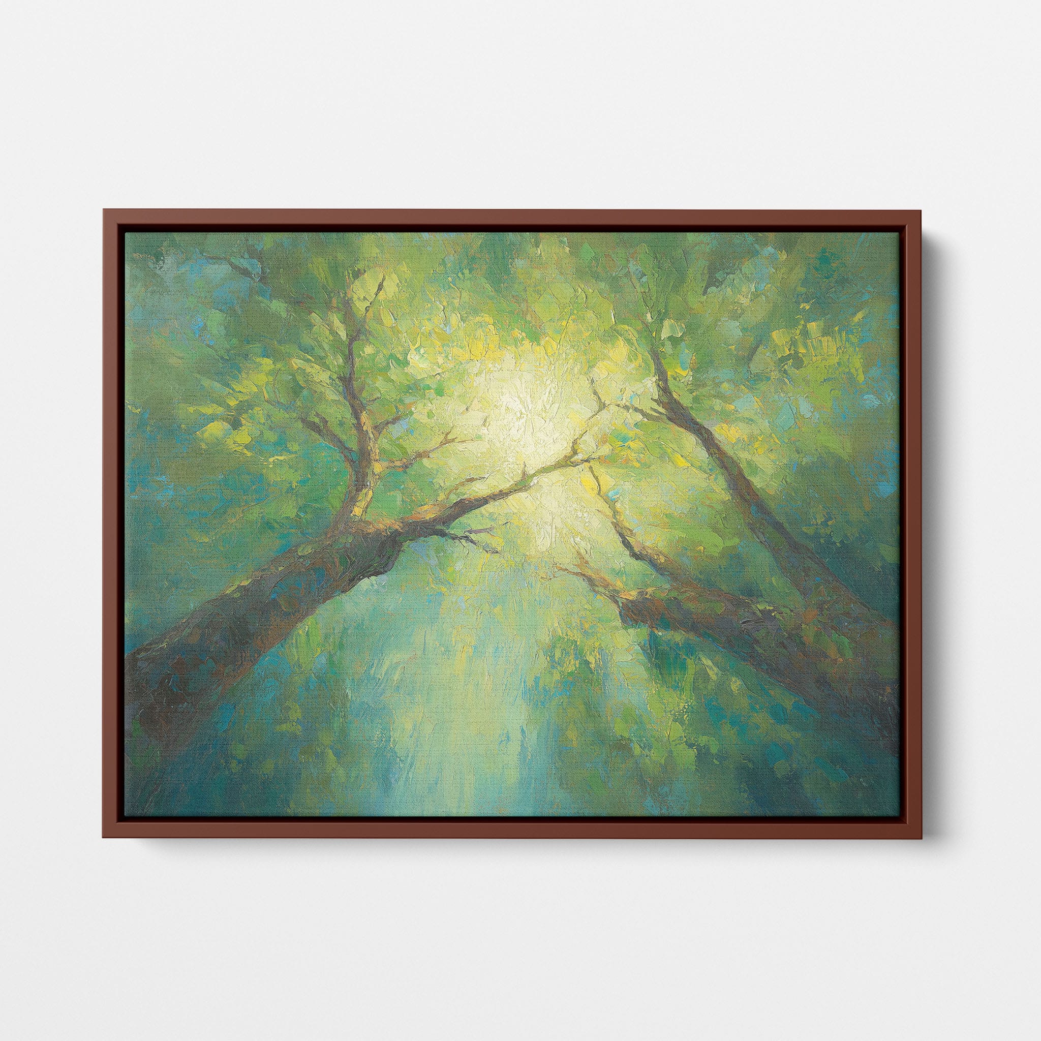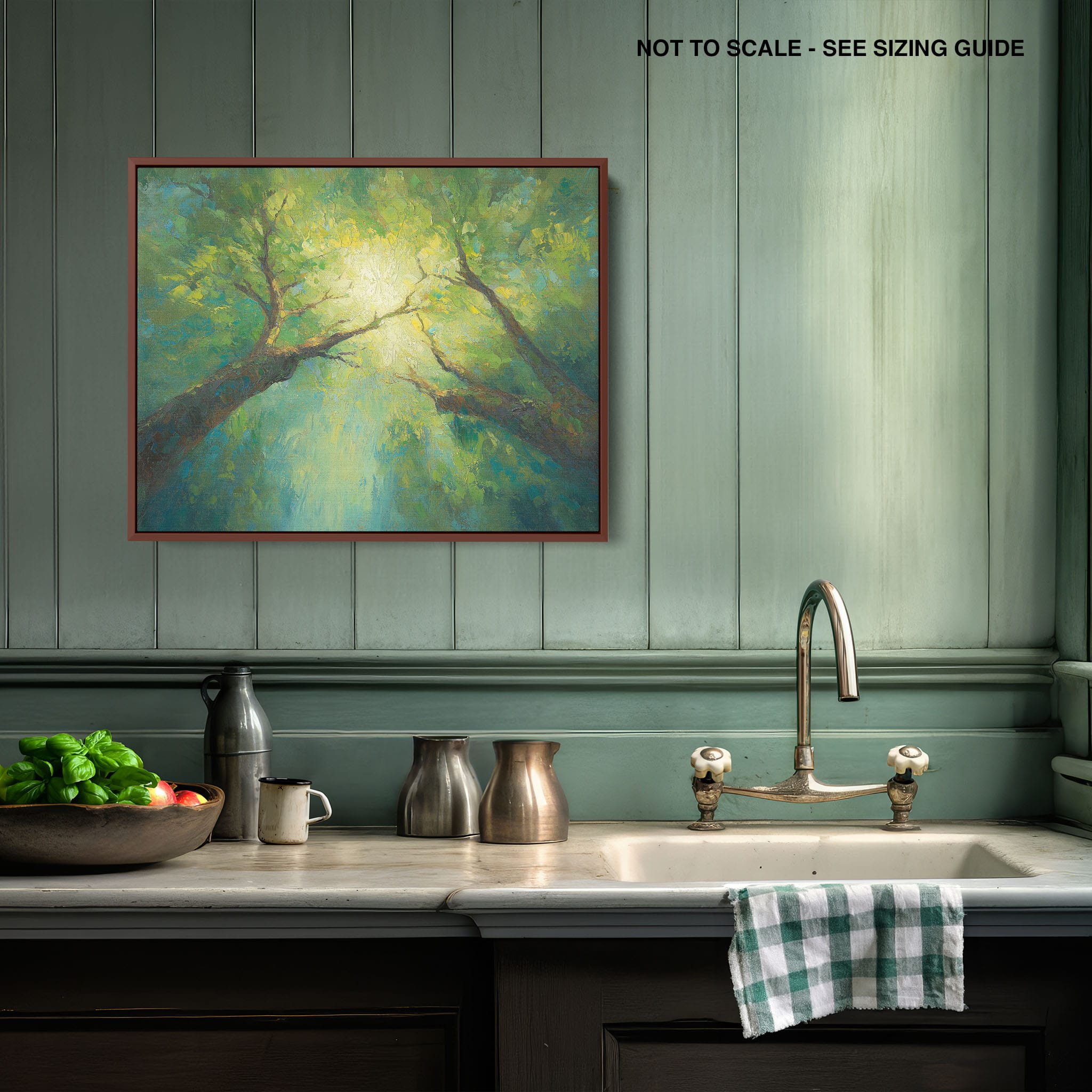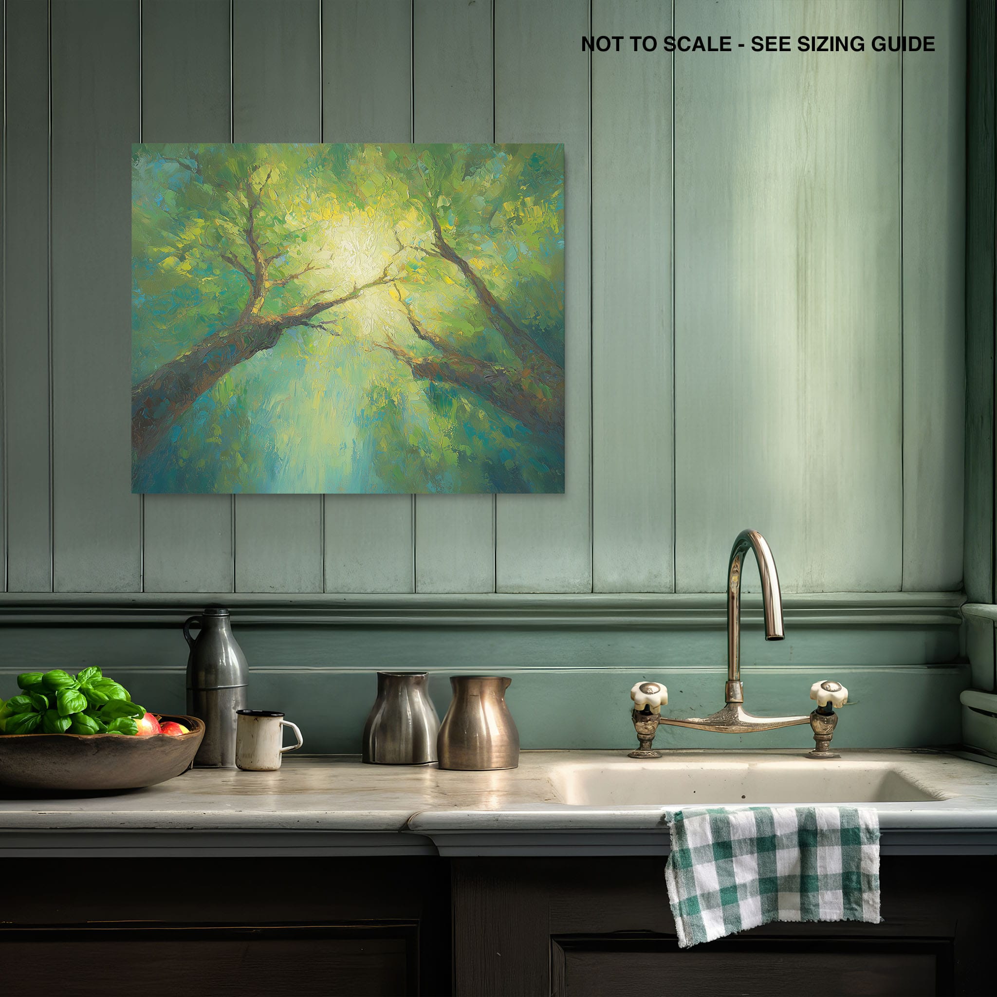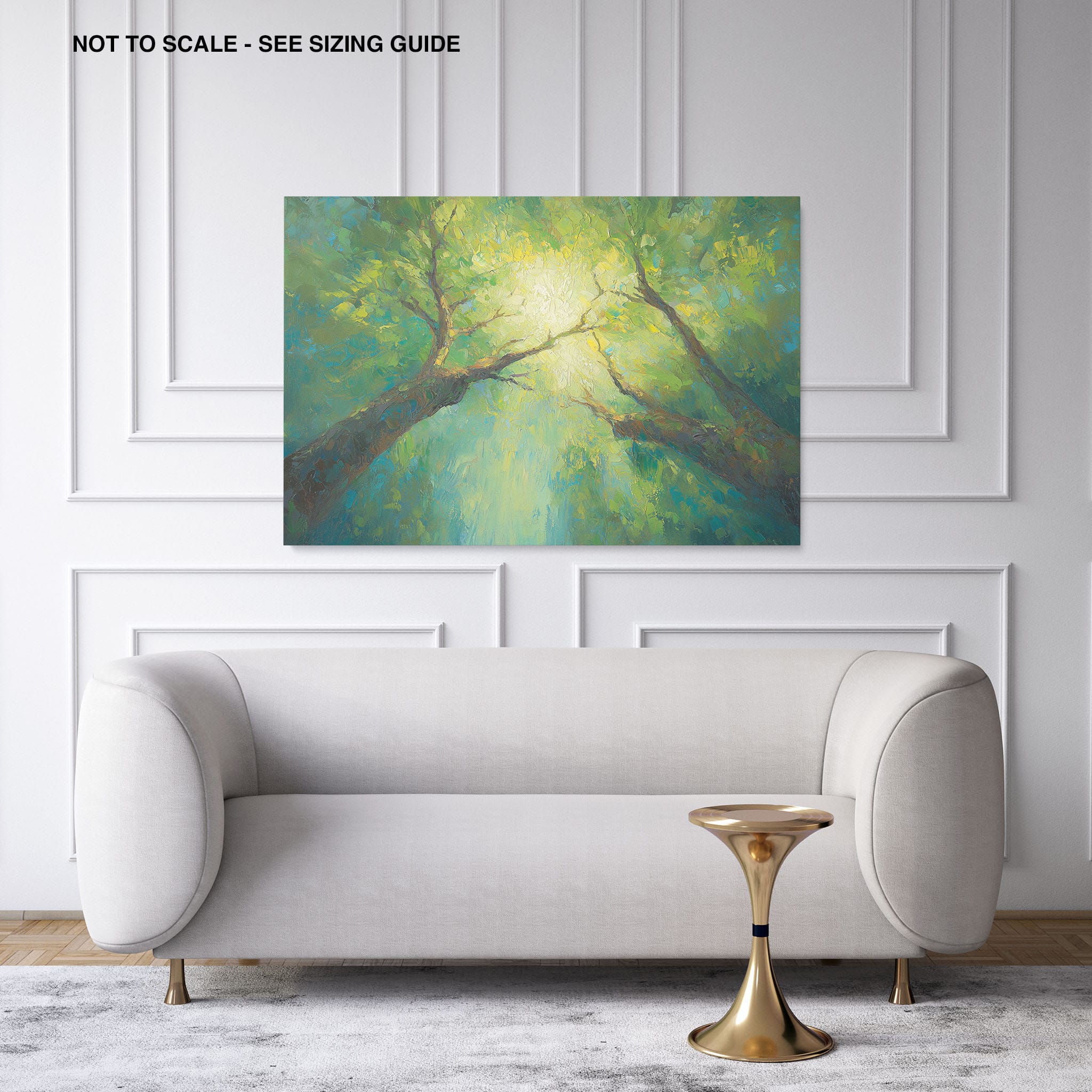 This painting captures a dynamic play of light and shadow through a lush, green landscape, depicted with abstract, thick brushstrokes typical of Impressionist technique. Evoking a mid-morning radiance peeking through richly textured tree canopies, the artwork invites viewers into a serene, verdant world. Perfect for bringing a touch of calm elegance to any living space, this art piece appeals to those who appreciate nature's beauty meticulously rendered through expressive, vibrant hues and discernible forms, enhancing any art collection with a serene yet illustrative quality.