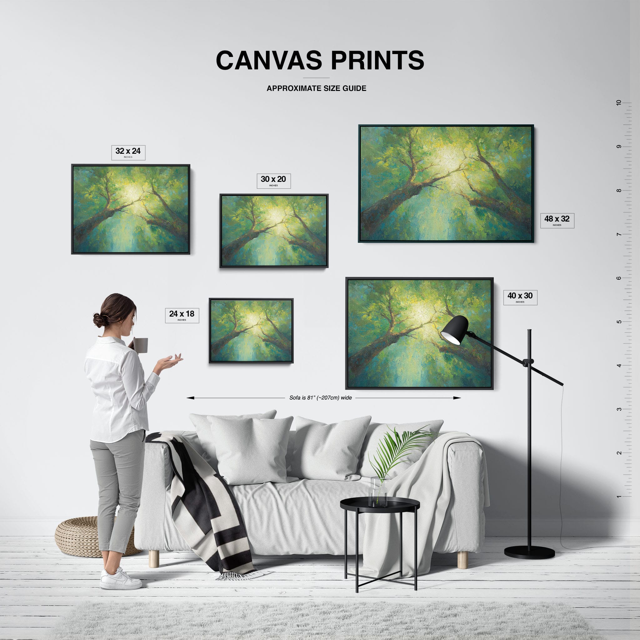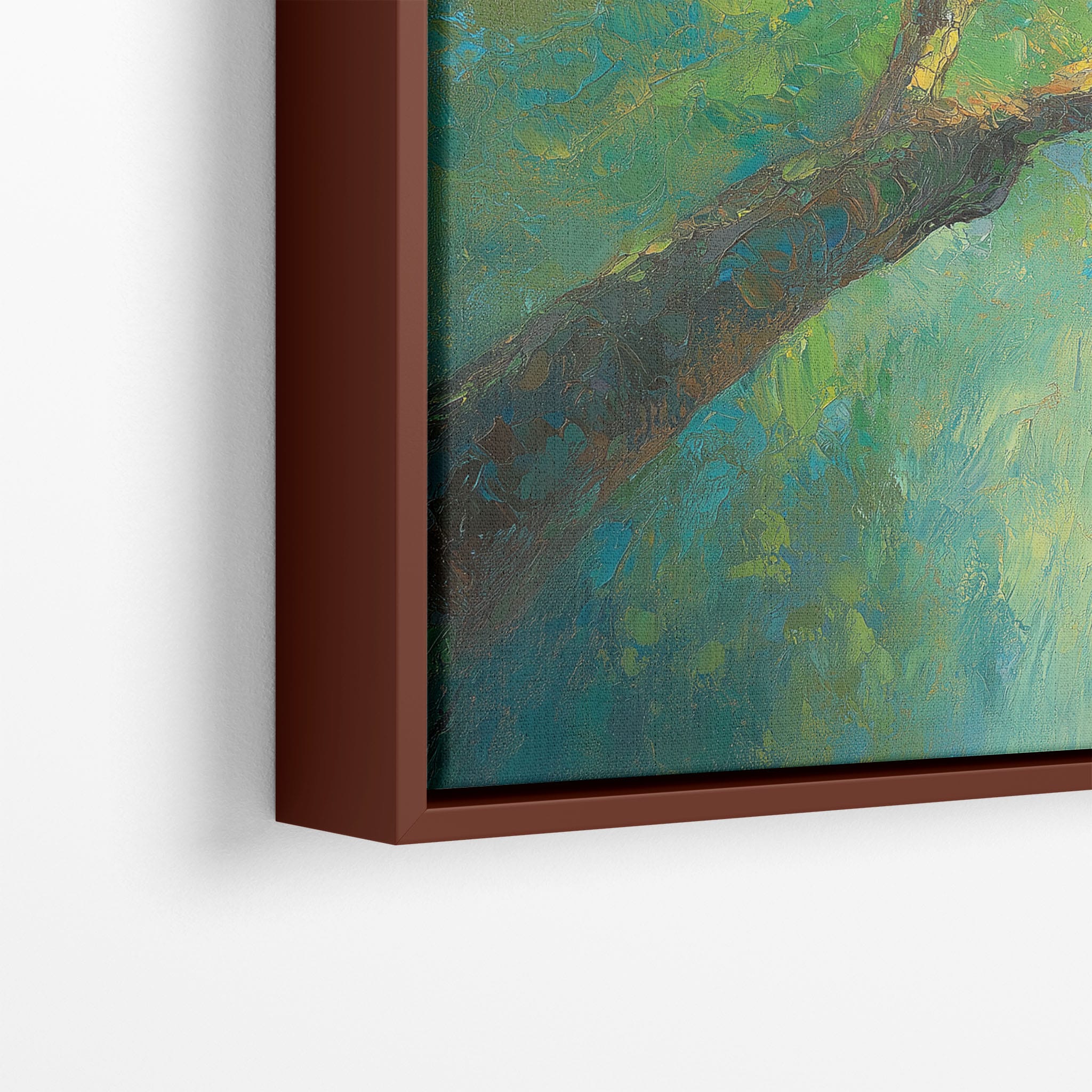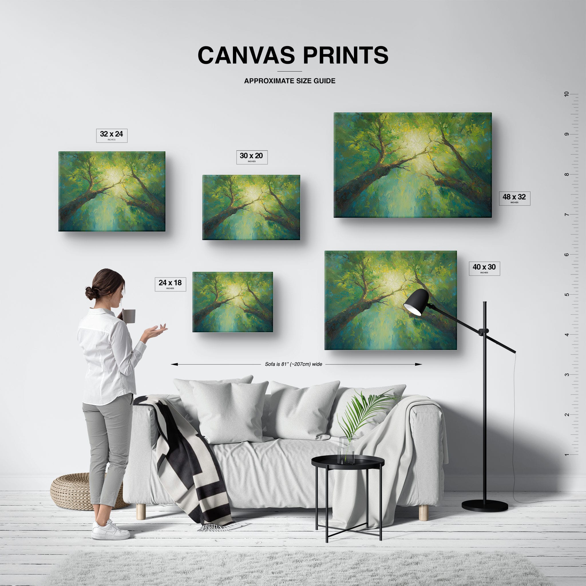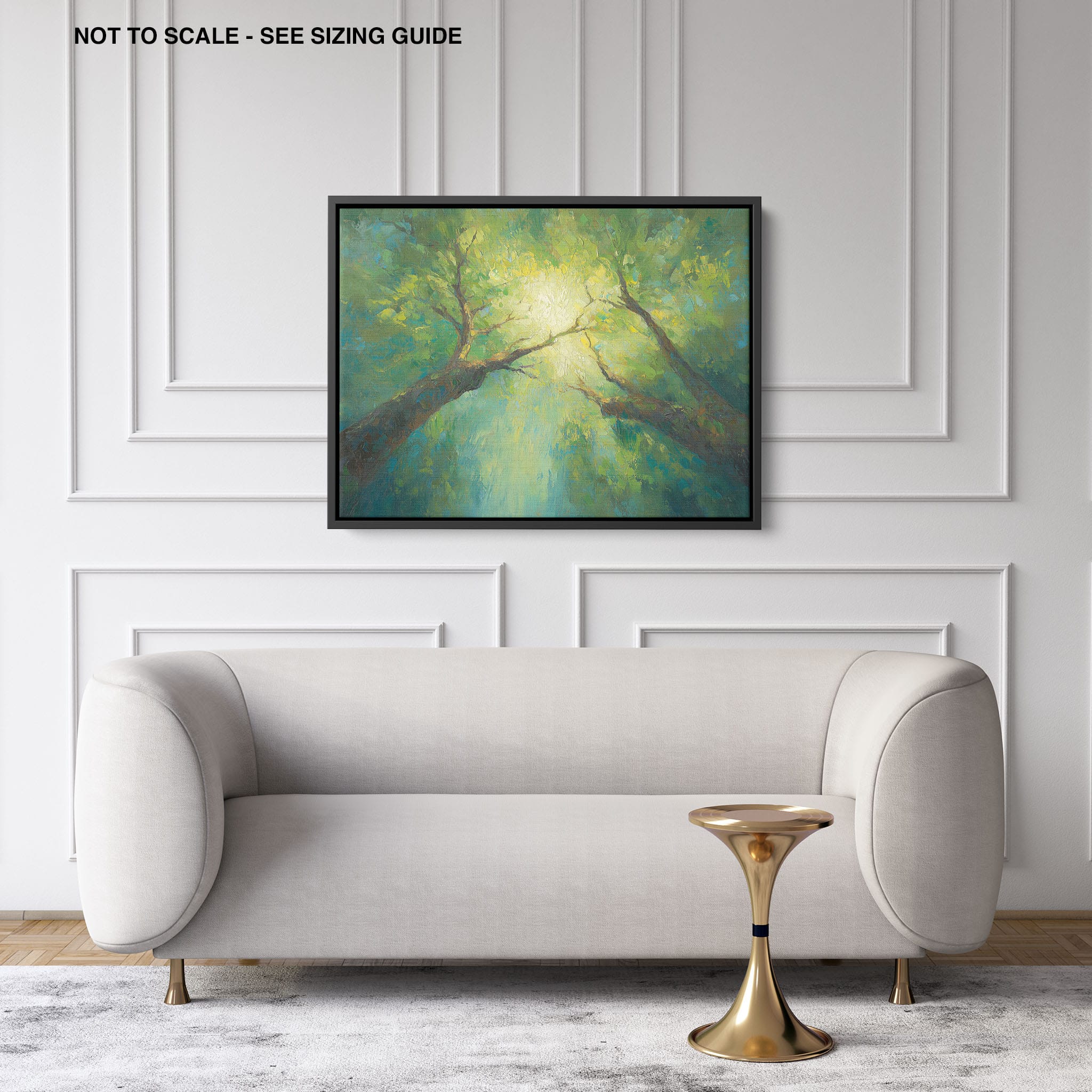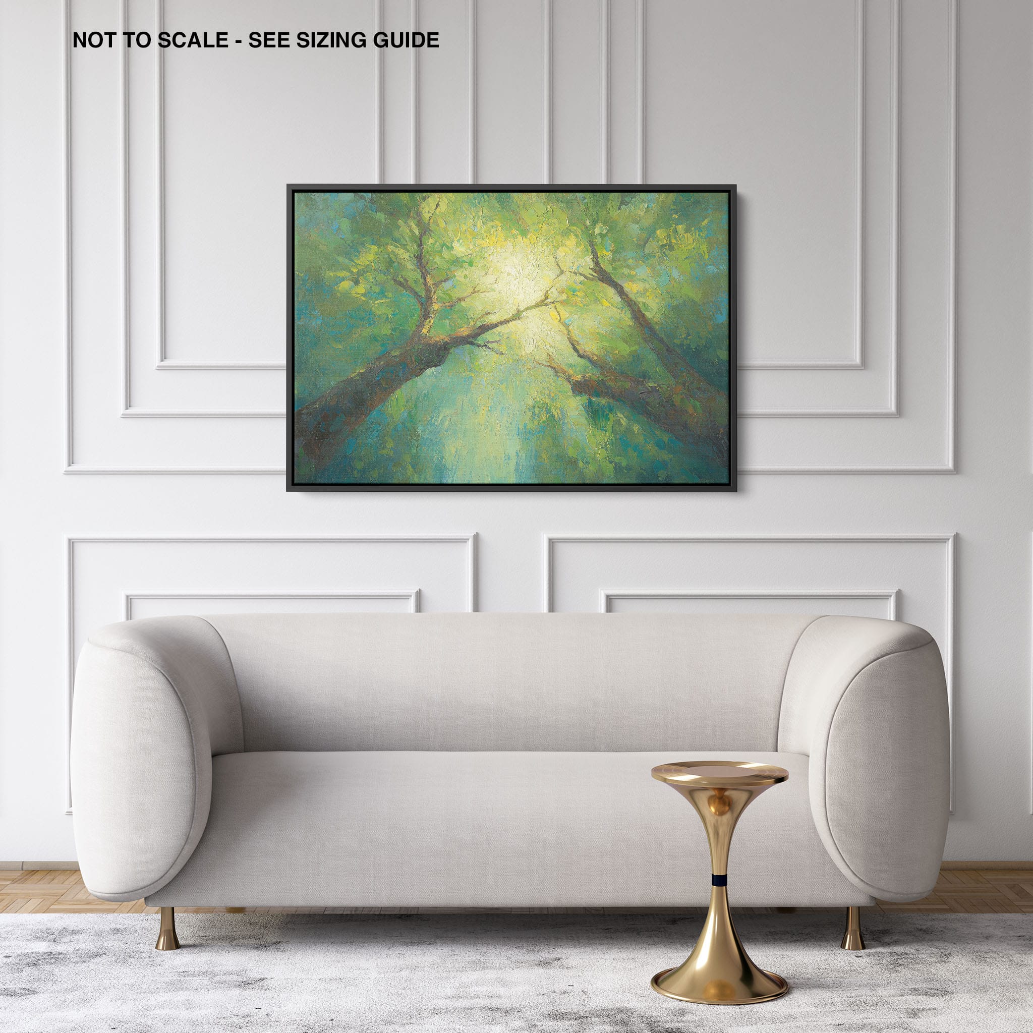 This painting captures a dynamic play of light and shadow through a lush, green landscape, depicted with abstract, thick brushstrokes typical of Impressionist technique. Evoking a mid-morning radiance peeking through richly textured tree canopies, the artwork invites viewers into a serene, verdant world. Perfect for bringing a touch of calm elegance to any living space, this art piece appeals to those who appreciate nature's beauty meticulously rendered through expressive, vibrant hues and discernible forms, enhancing any art collection with a serene yet illustrative quality.